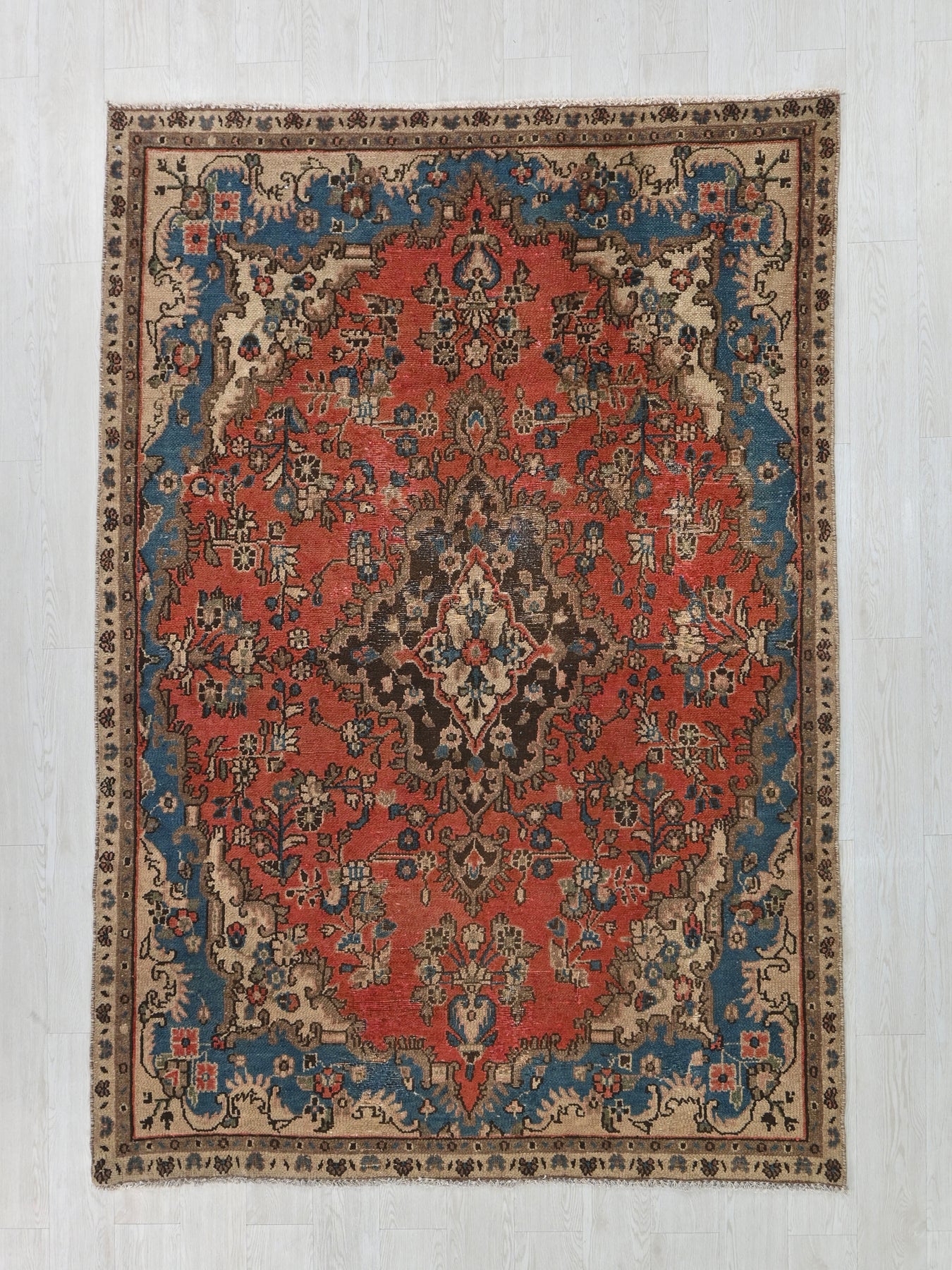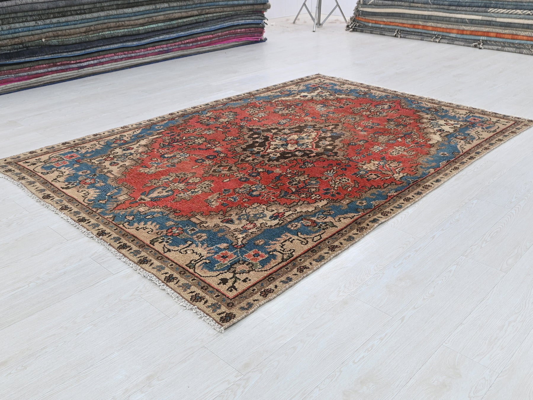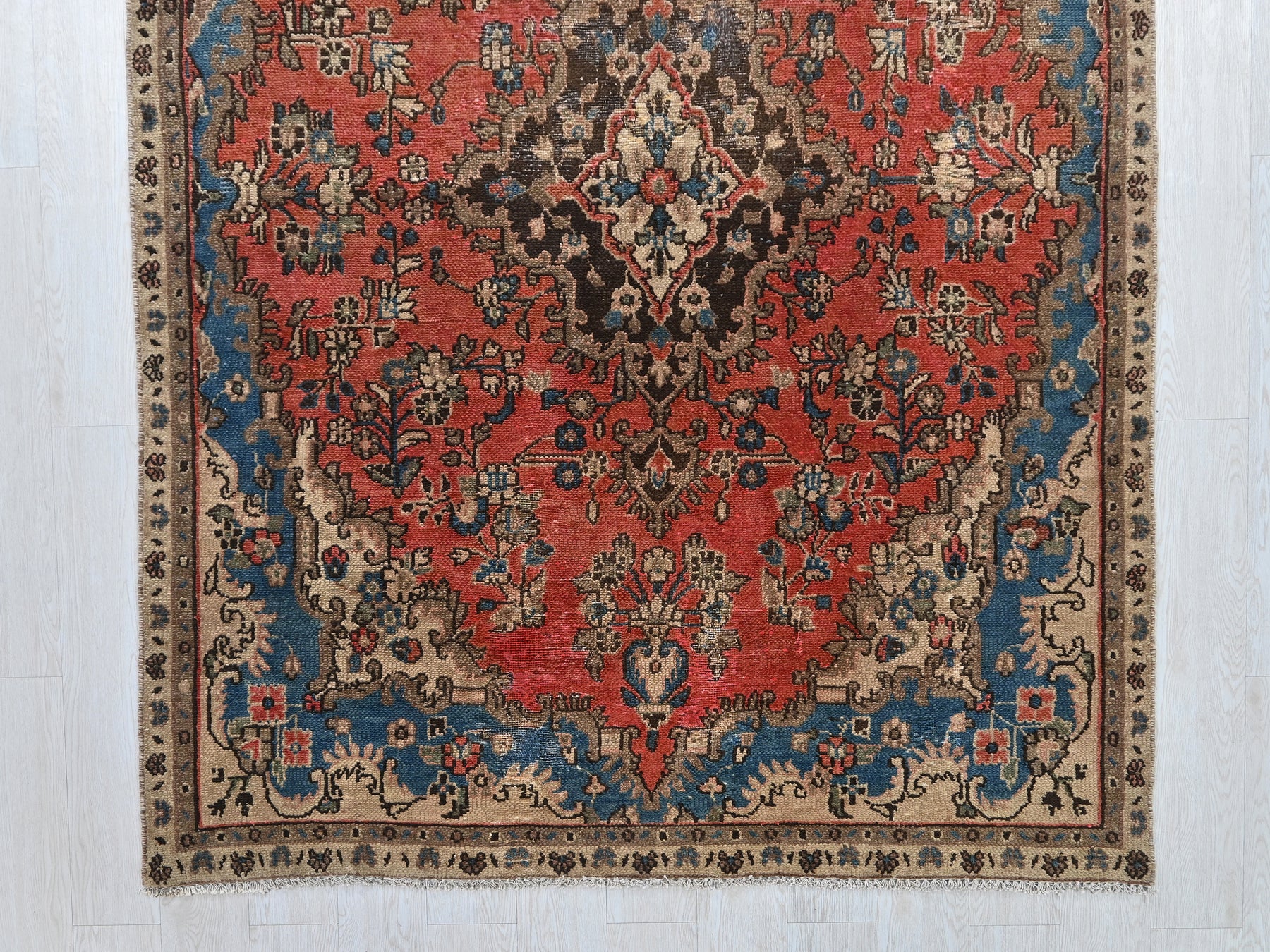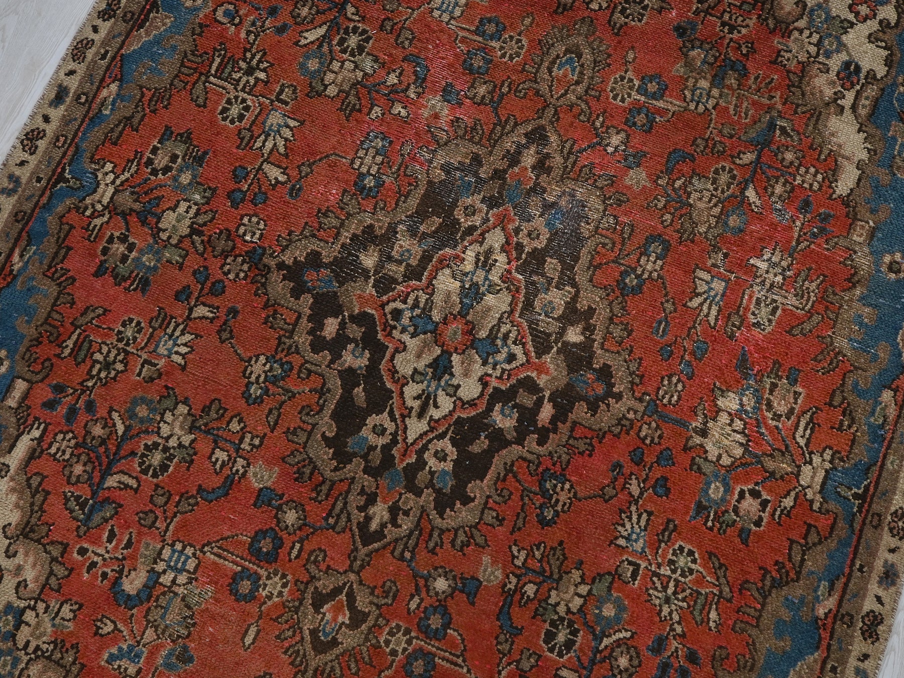 This is a hand-knotted, one-of-a-kind vintage rug. Due to the nature of this piece, there may be slight imperfections in its wear, shape, dimensions, and color. All of our rugs are professionally cleaned and repaired.
