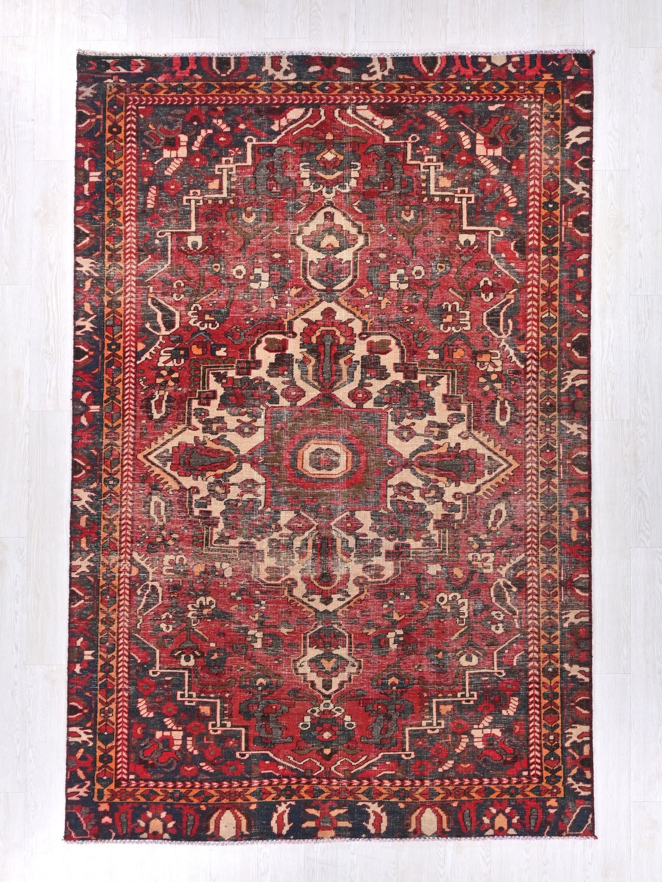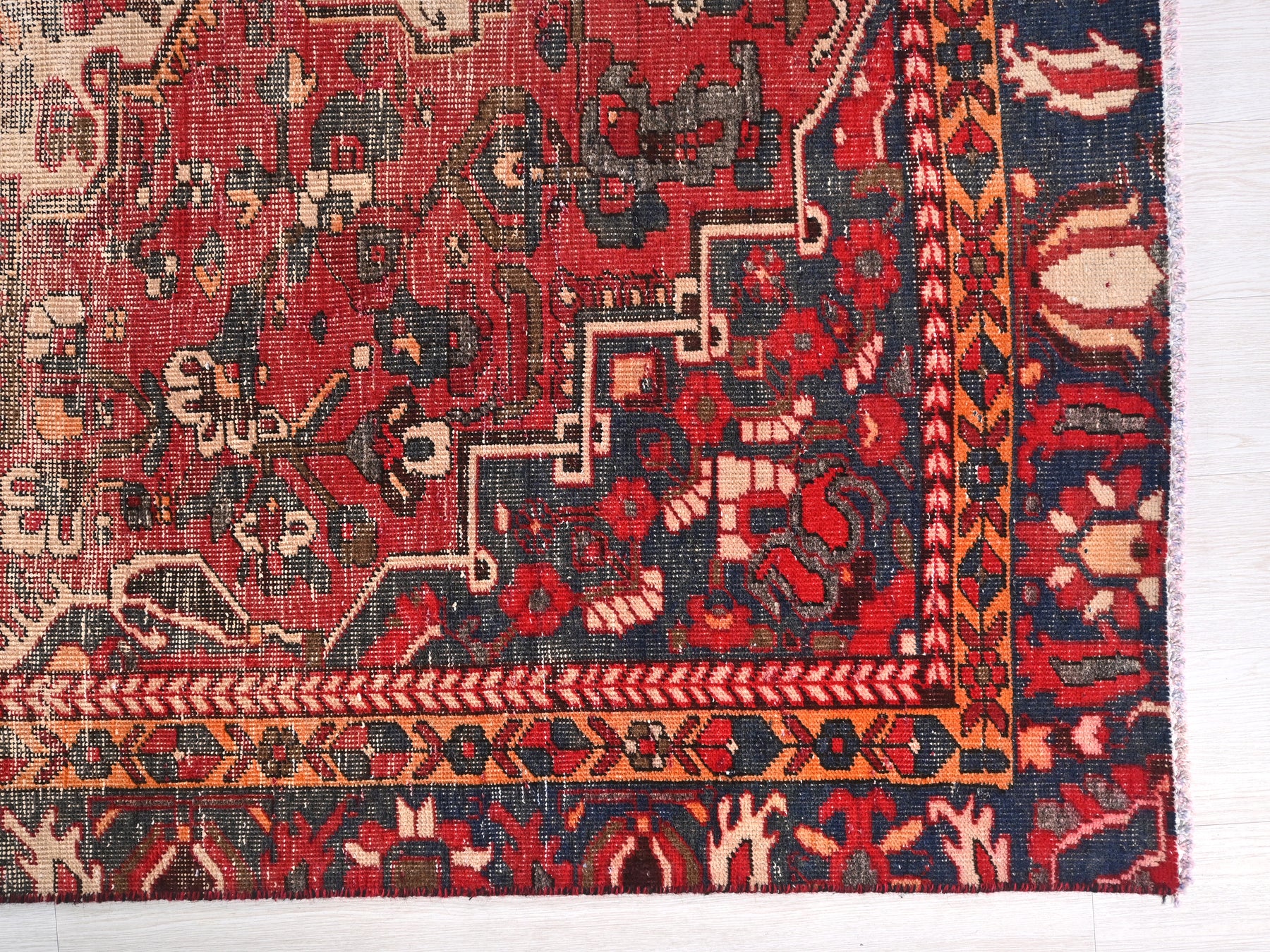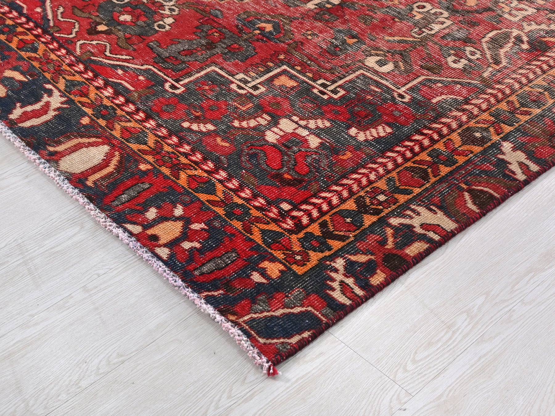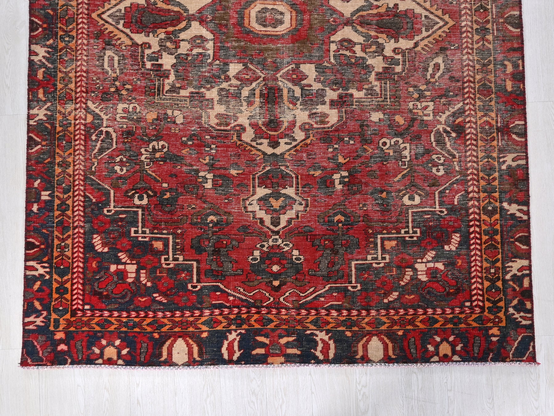 This is a hand-knotted, one-of-a-kind vintage rug. Due to the nature of this piece, there may be slight imperfections in its wear, shape, dimensions, and color. All of our rugs are professionally cleaned and repaired.