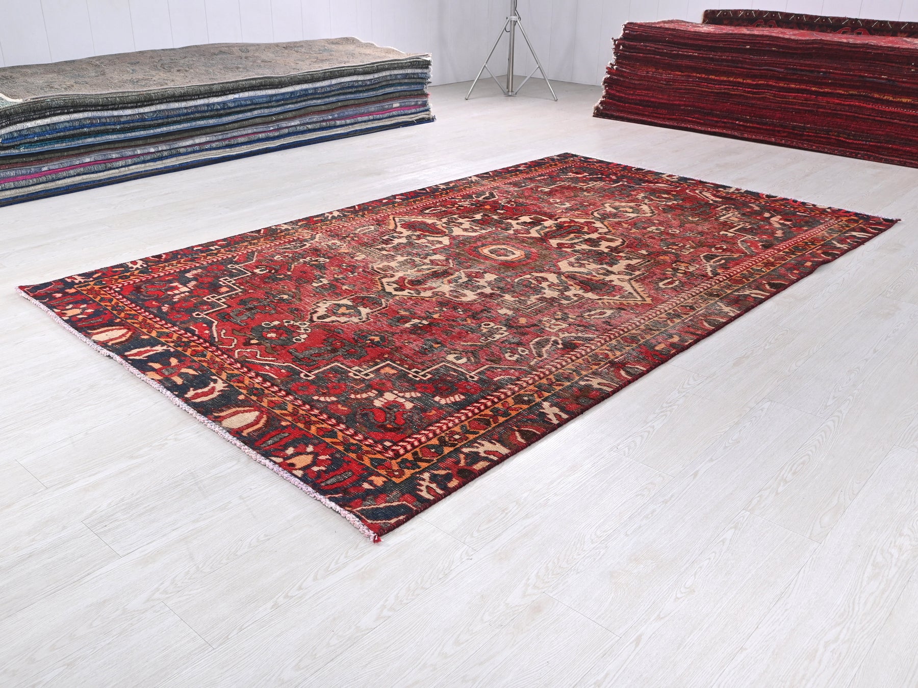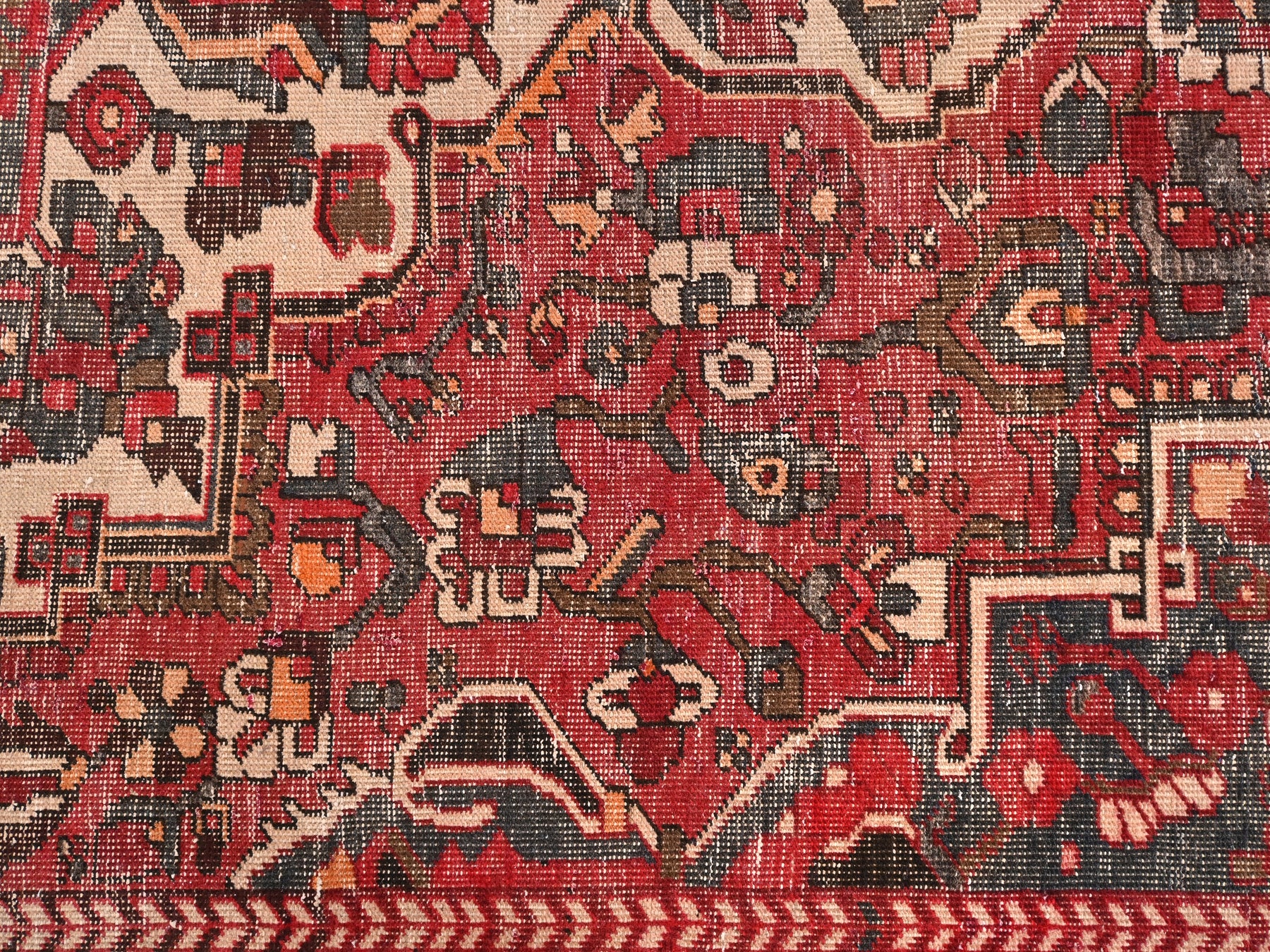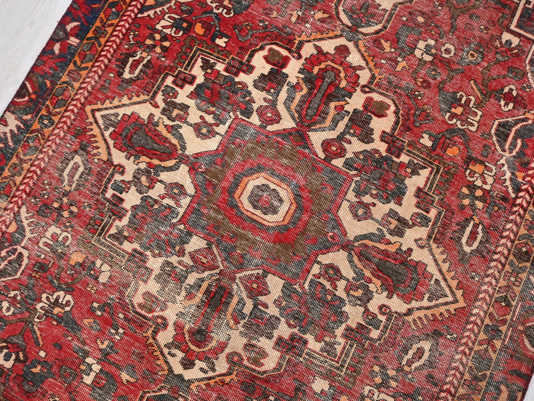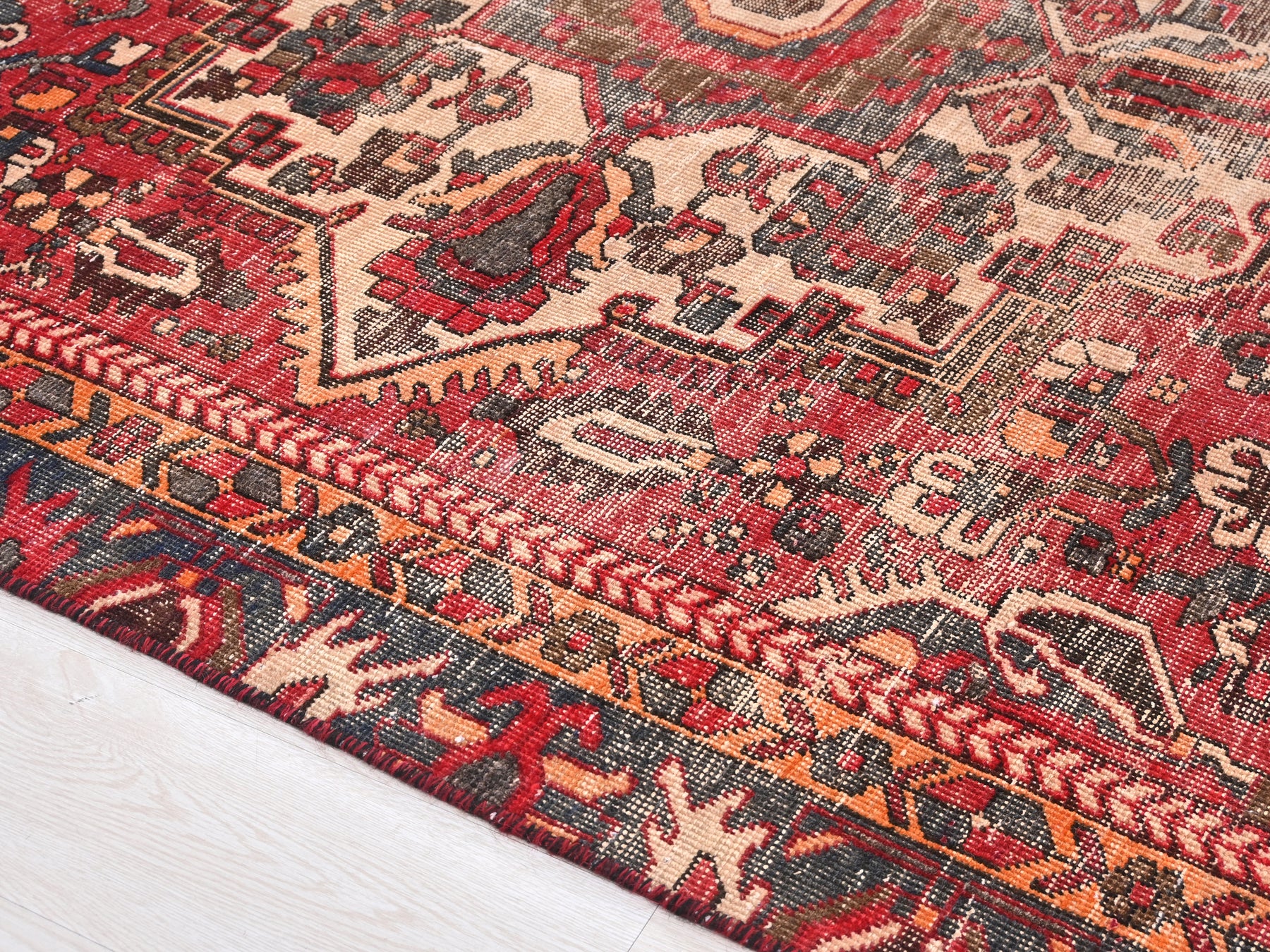 This is a hand-knotted, one-of-a-kind vintage rug. Due to the nature of this piece, there may be slight imperfections in its wear, shape, dimensions, and color. All of our rugs are professionally cleaned and repaired.