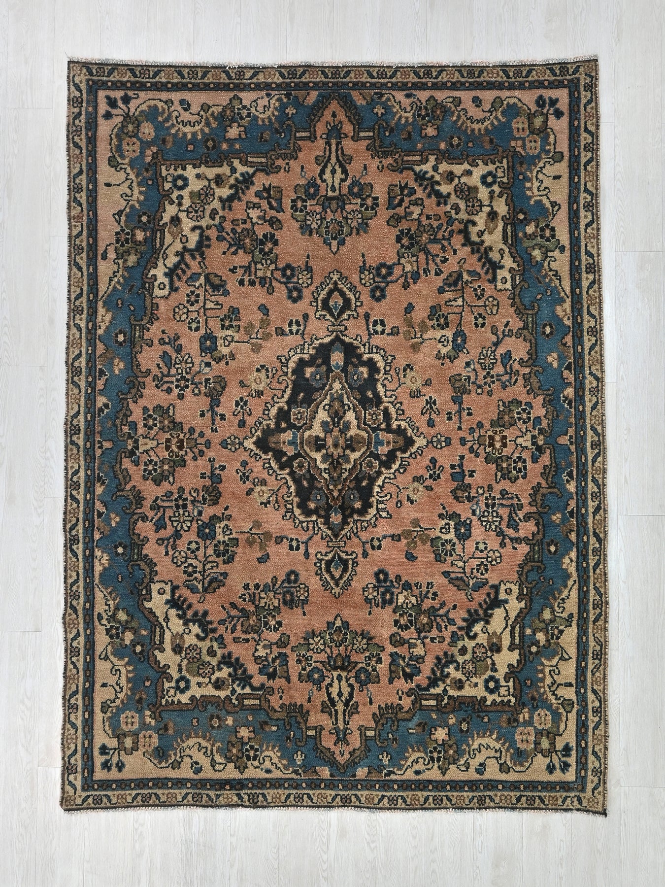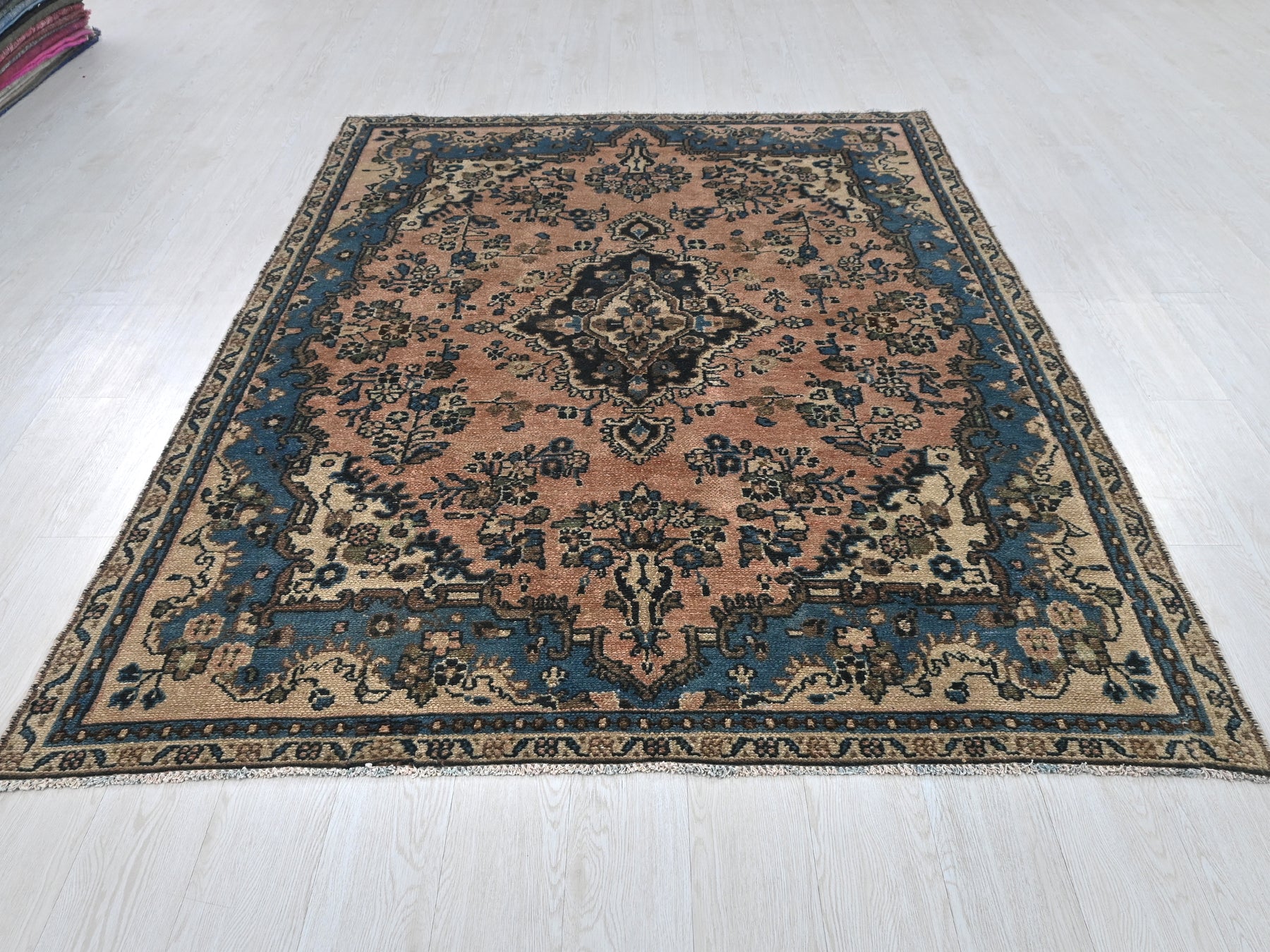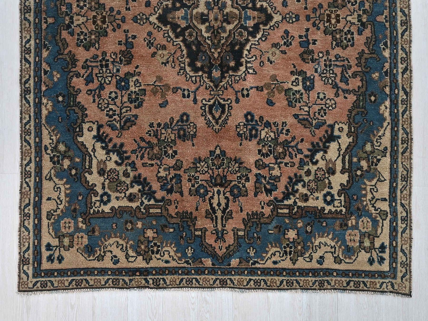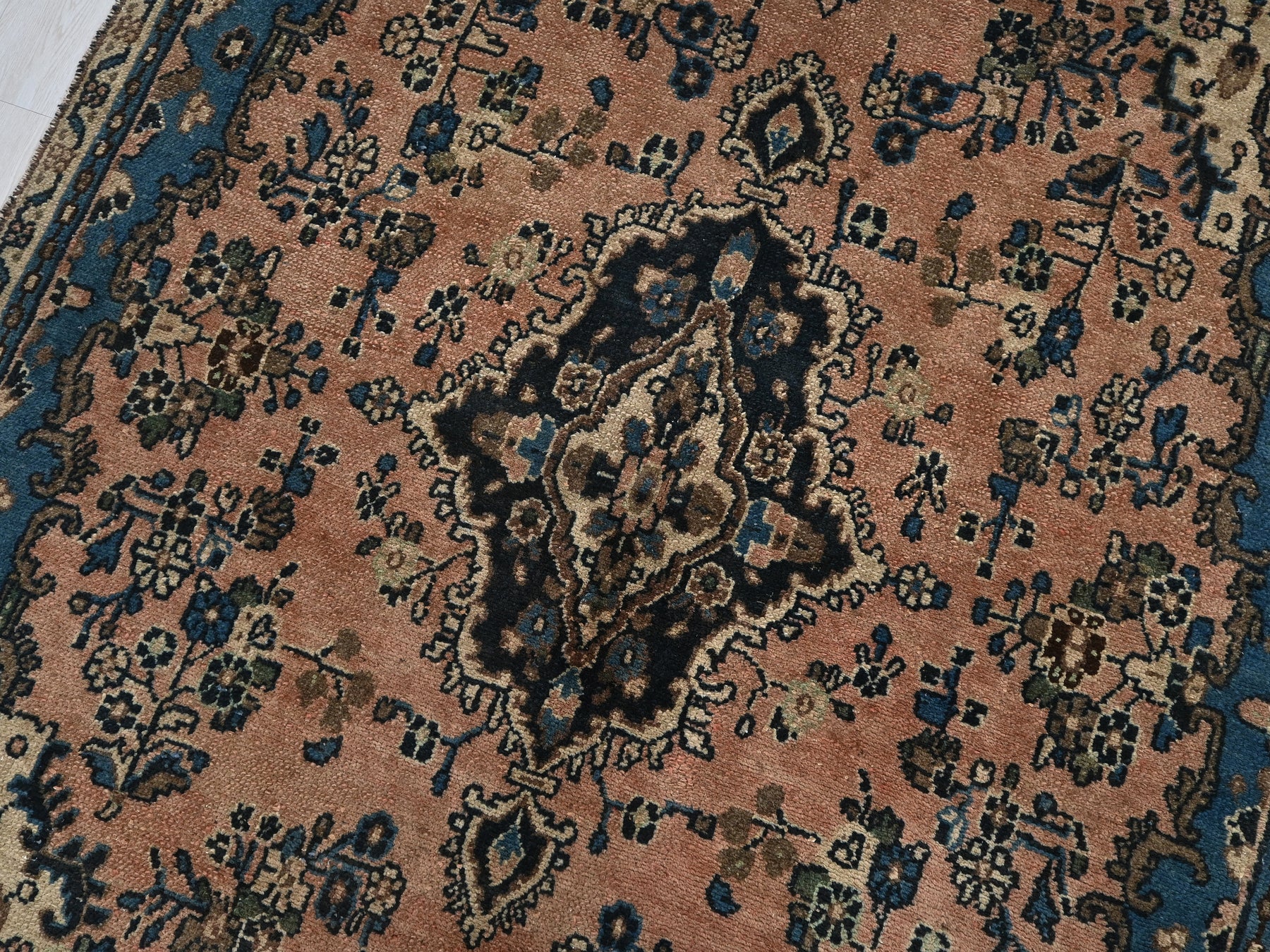This is a hand-knotted, one-of-a-kind vintage rug. Due to the nature of this piece, there may be slight imperfections in its wear, shape, dimensions, and color. All of our rugs are professionally cleaned and repaired.
