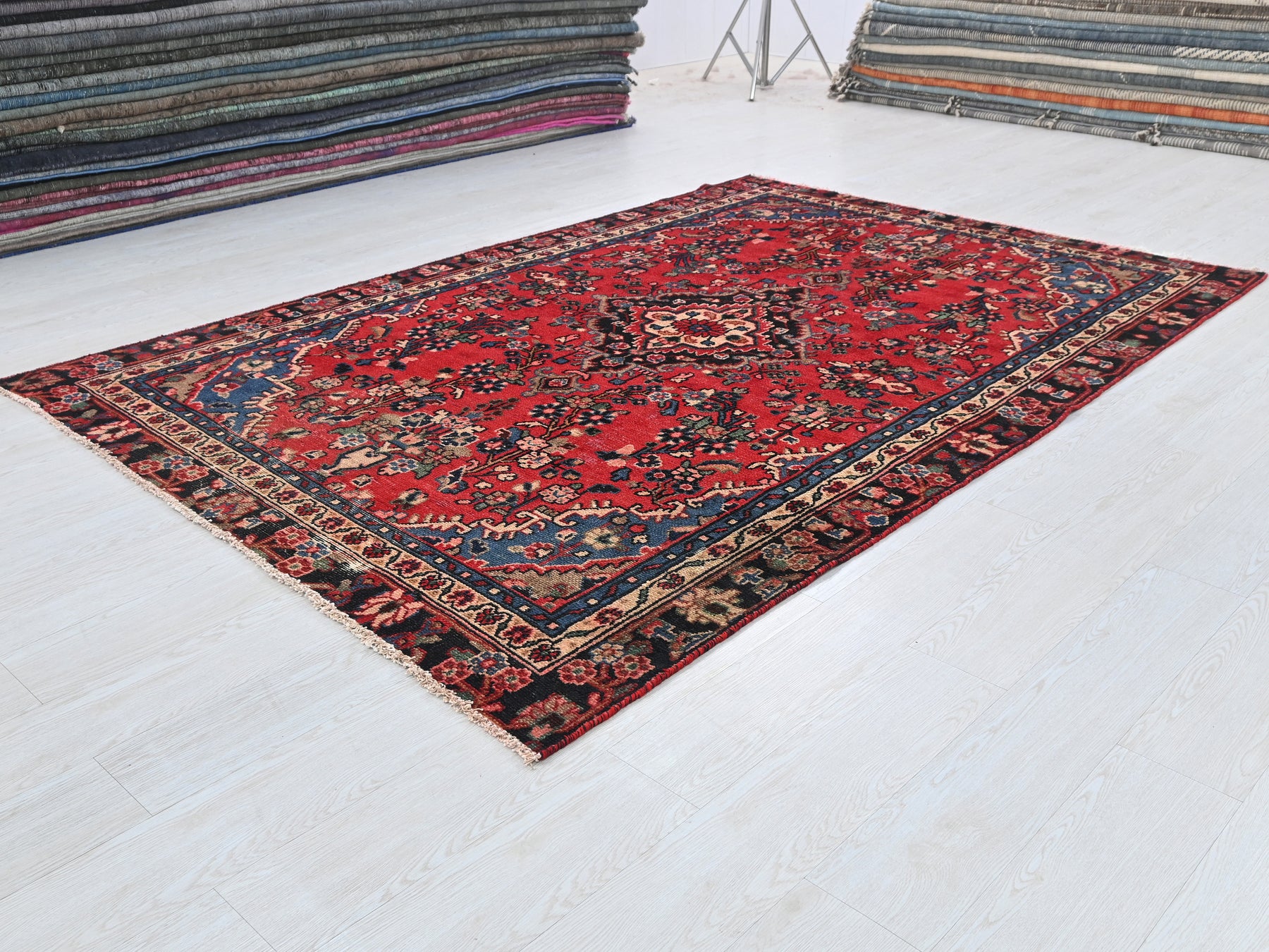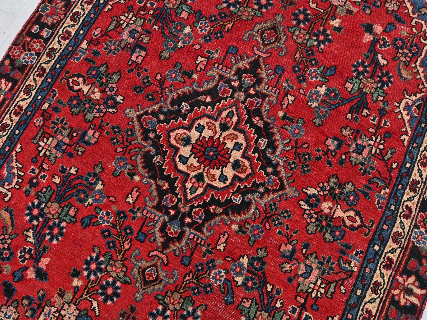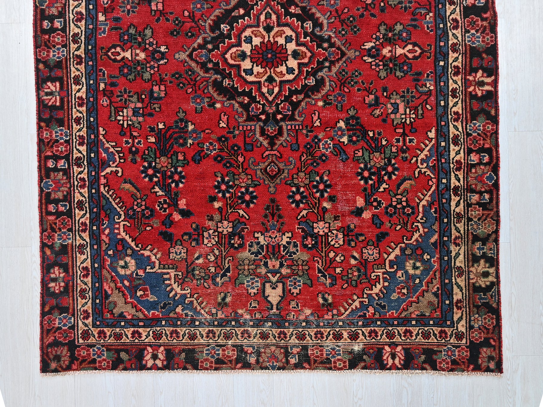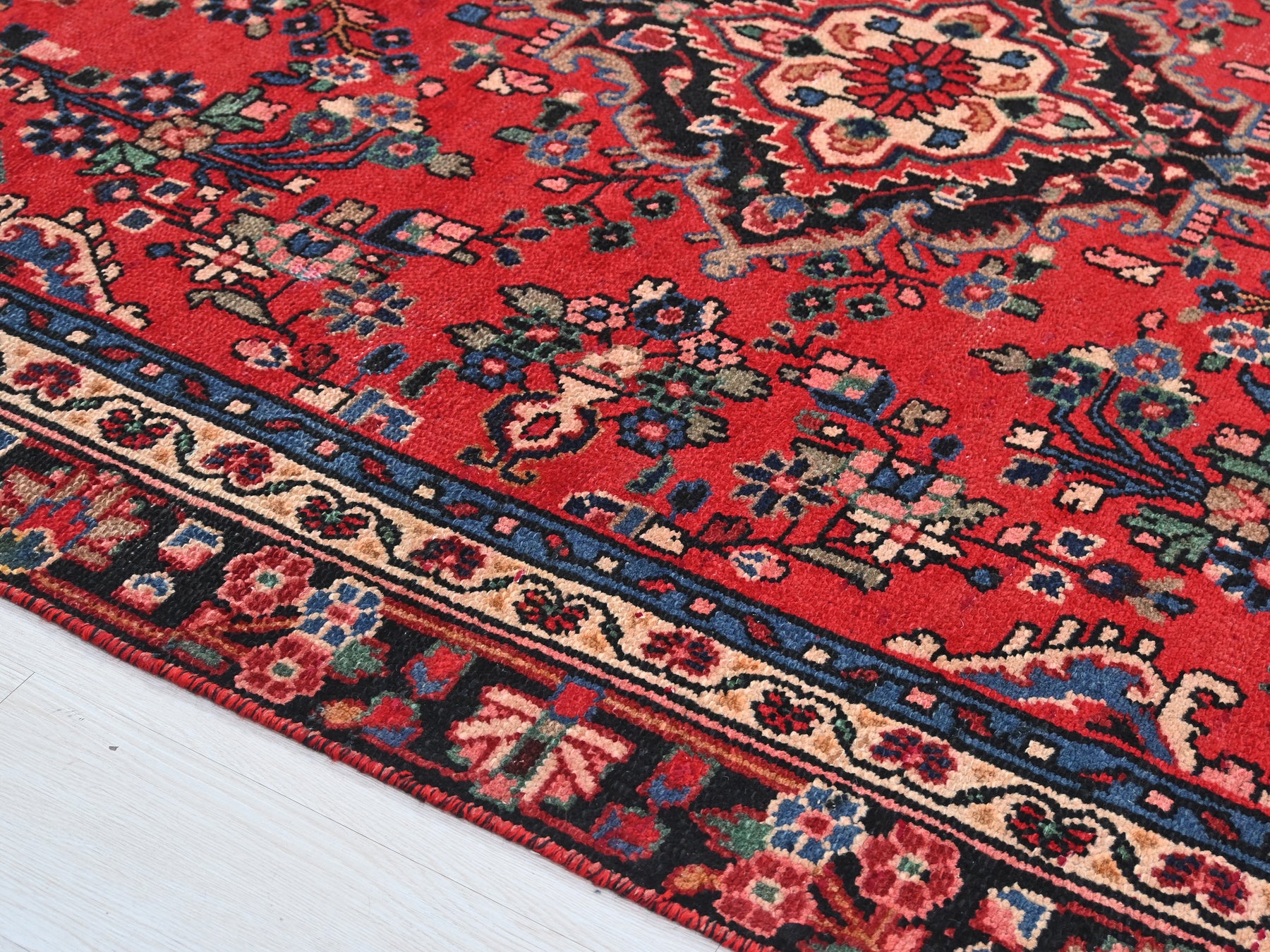 This is a hand-knotted, one-of-a-kind vintage rug. Due to the nature of this piece, there may be slight imperfections in its wear, shape, dimensions, and color. All of our rugs are professionally cleaned and repaired.