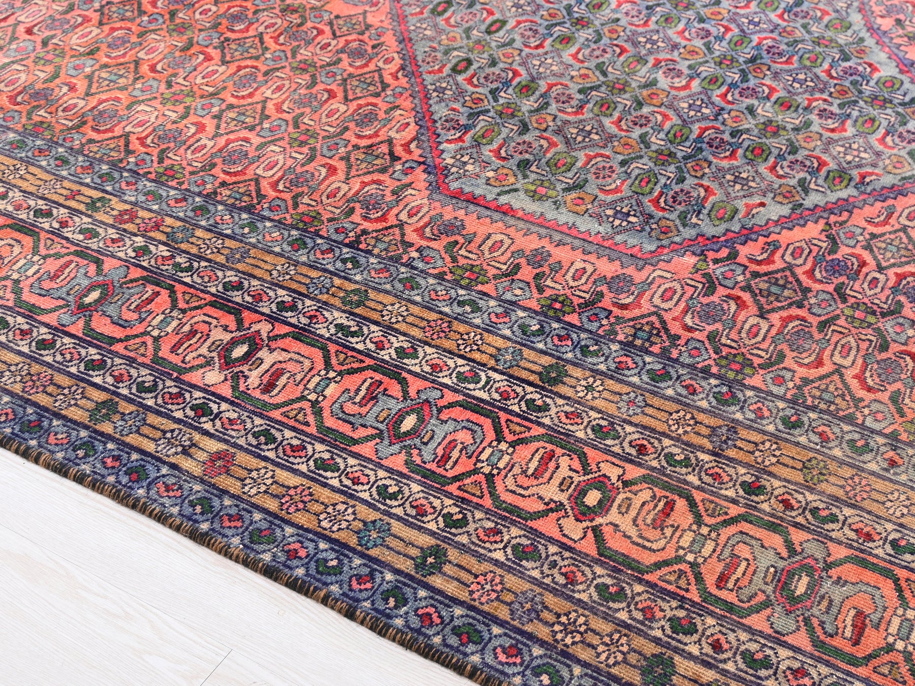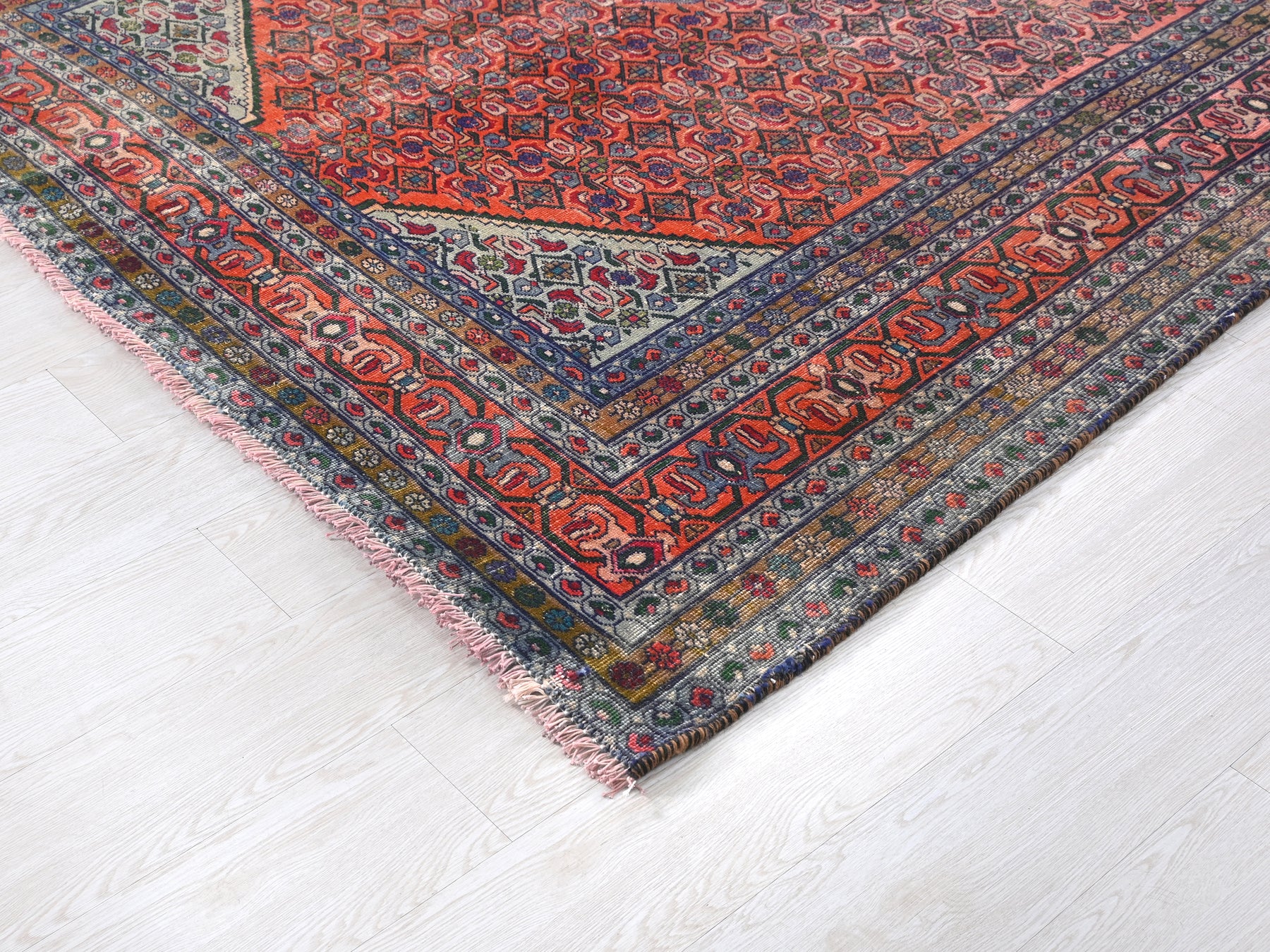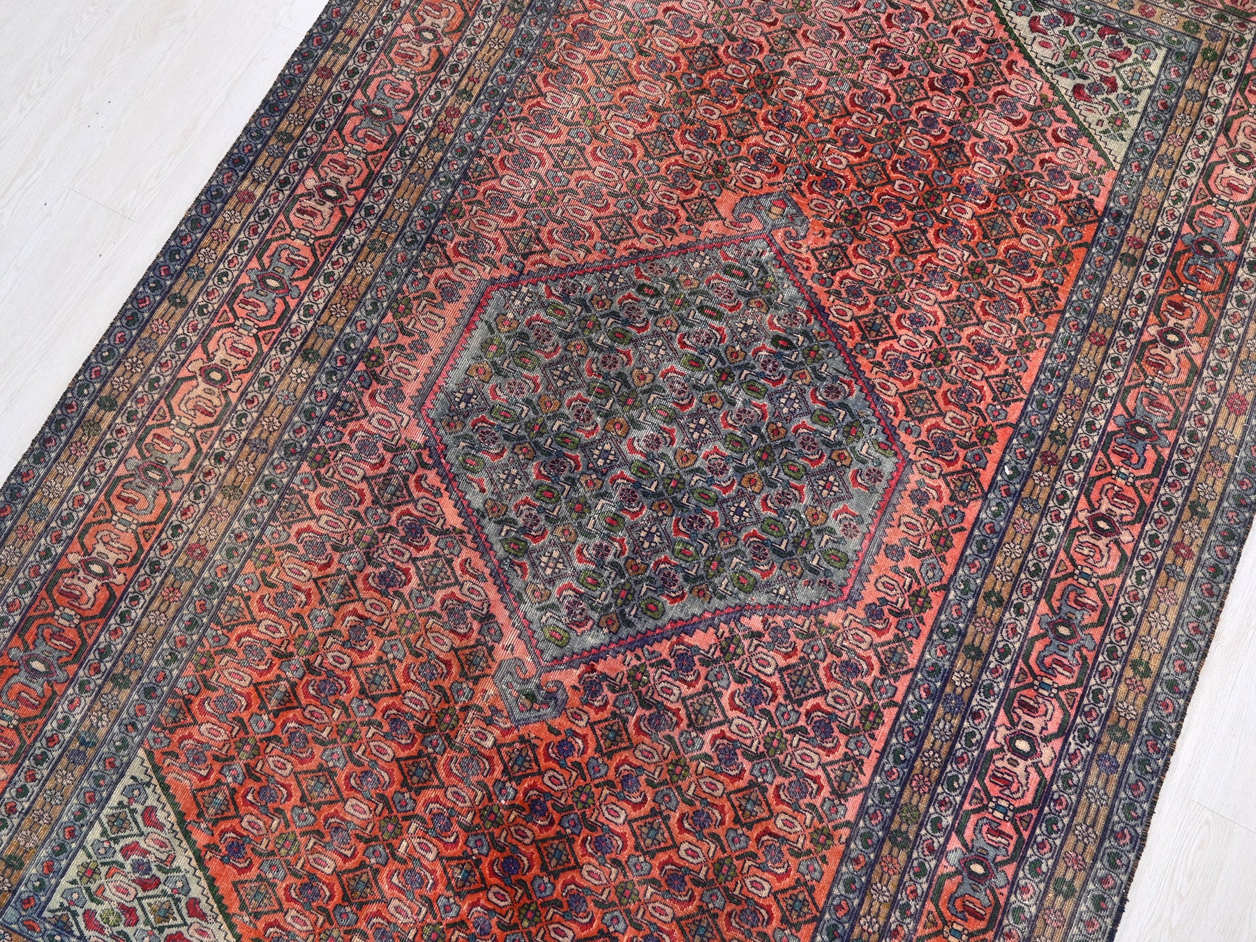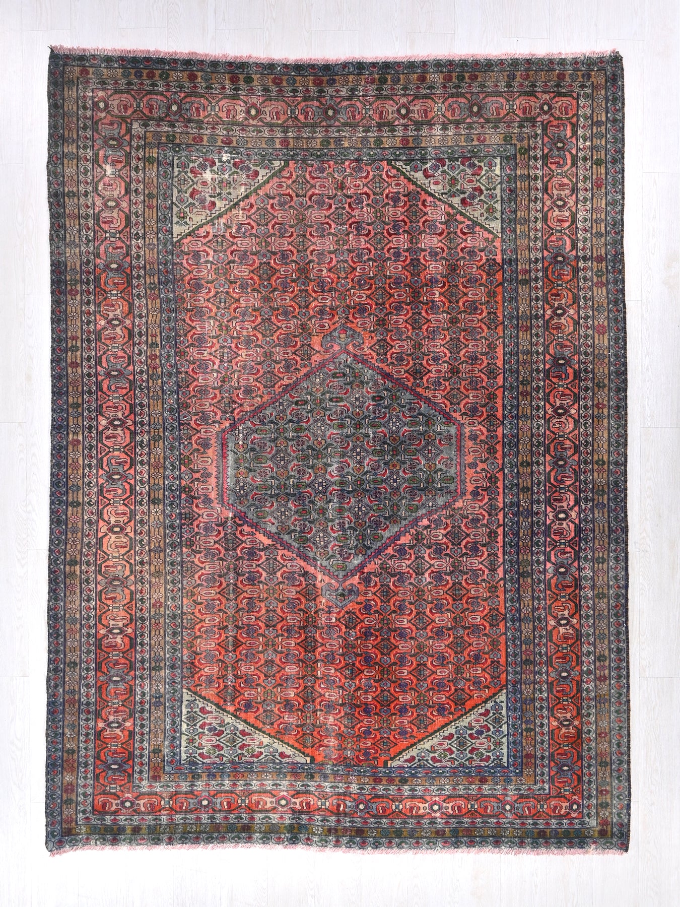 This is a hand-knotted, one-of-a-kind vintage rug. Due to the nature of this piece, there may be slight imperfections in its wear, shape, dimensions, and color. All of our rugs are professionally cleaned and repaired.