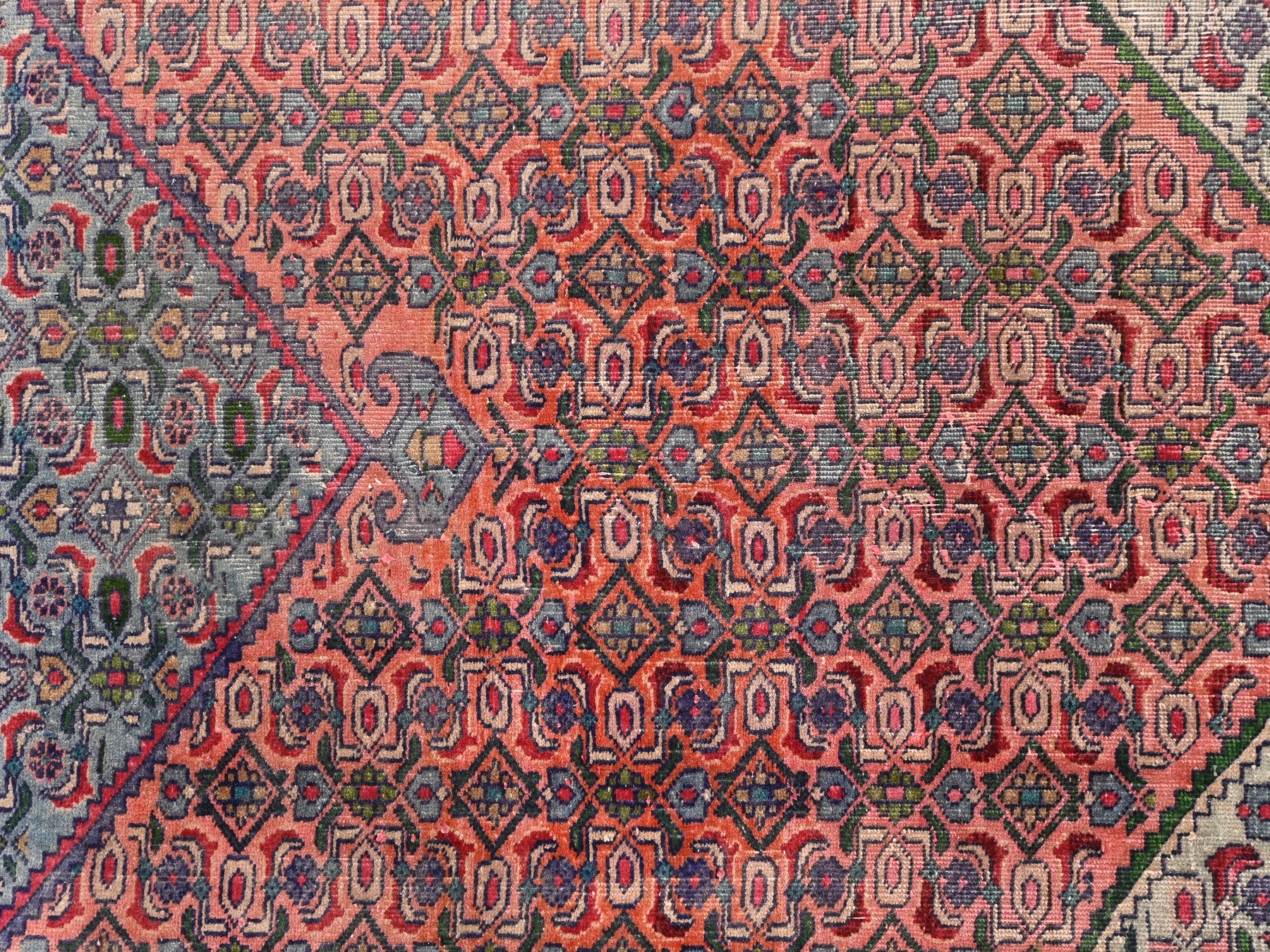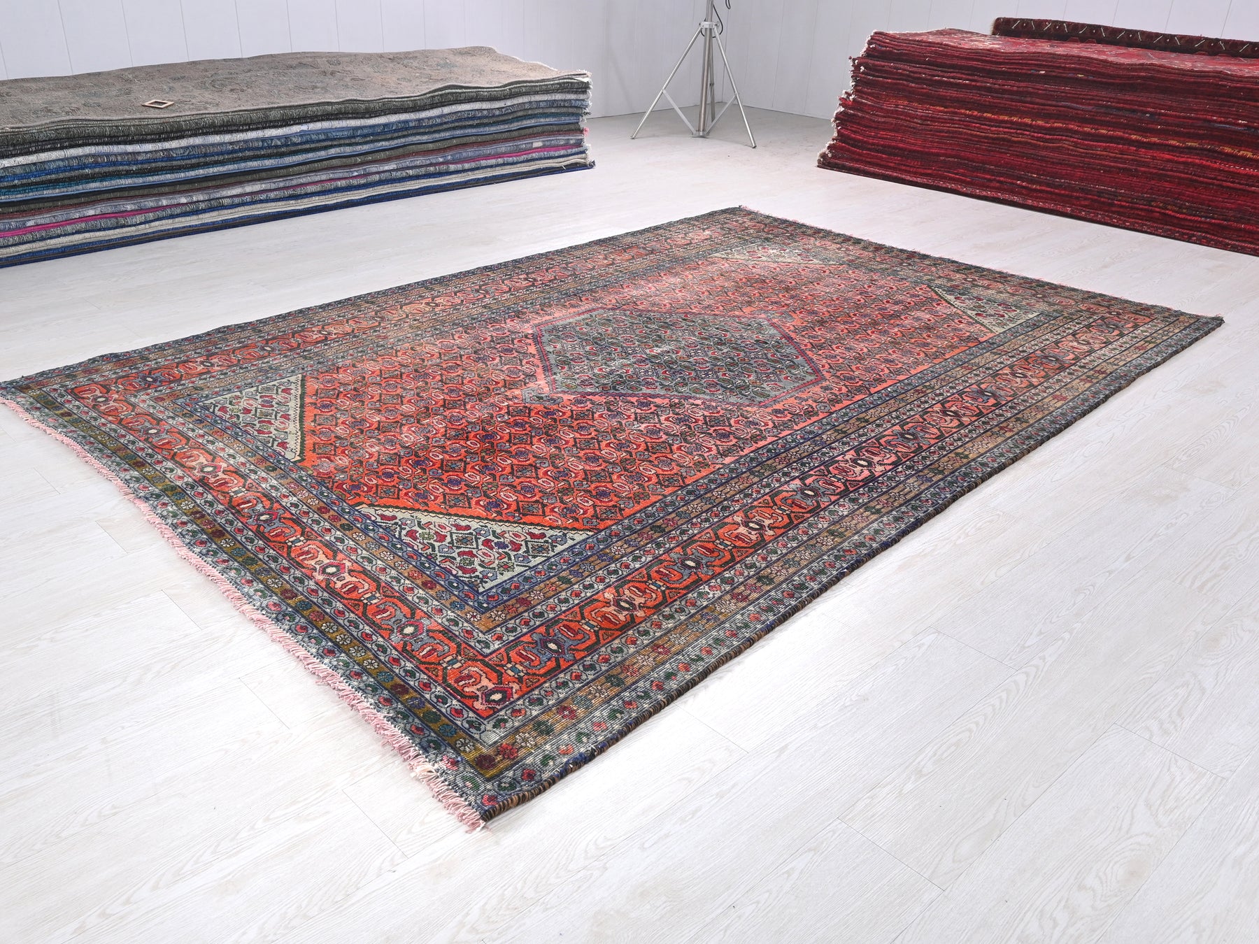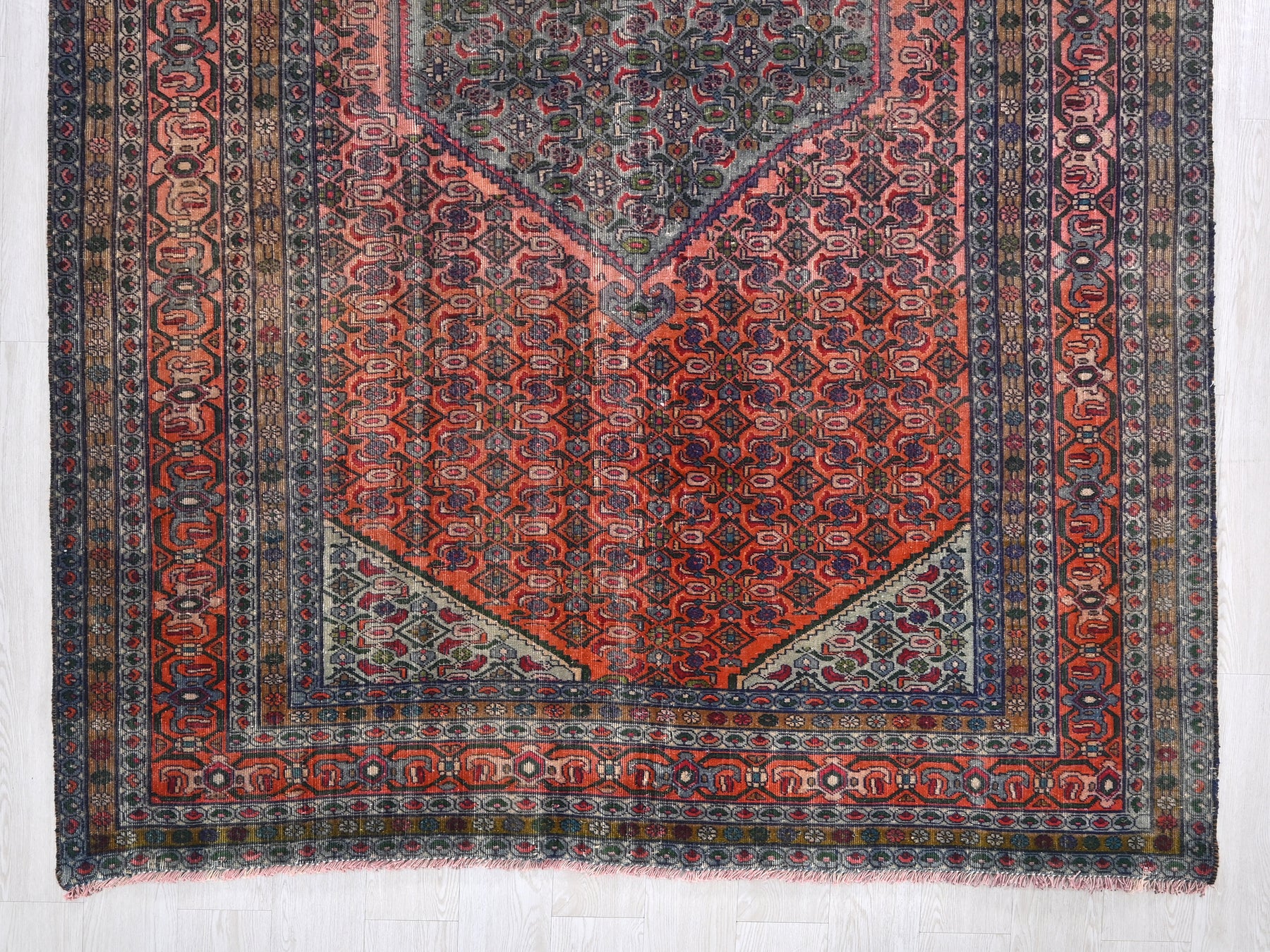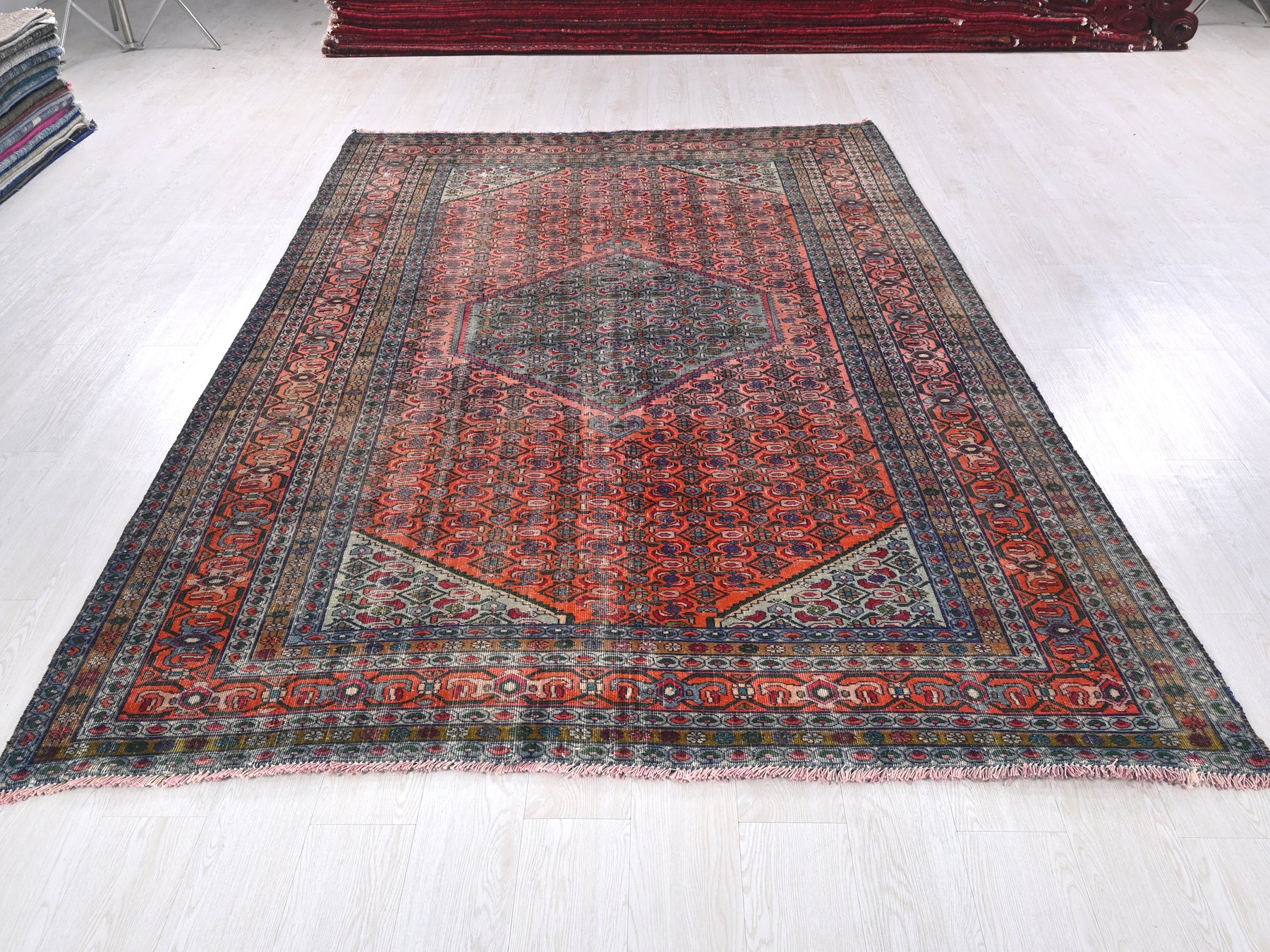 This is a hand-knotted, one-of-a-kind vintage rug. Due to the nature of this piece, there may be slight imperfections in its wear, shape, dimensions, and color. All of our rugs are professionally cleaned and repaired.