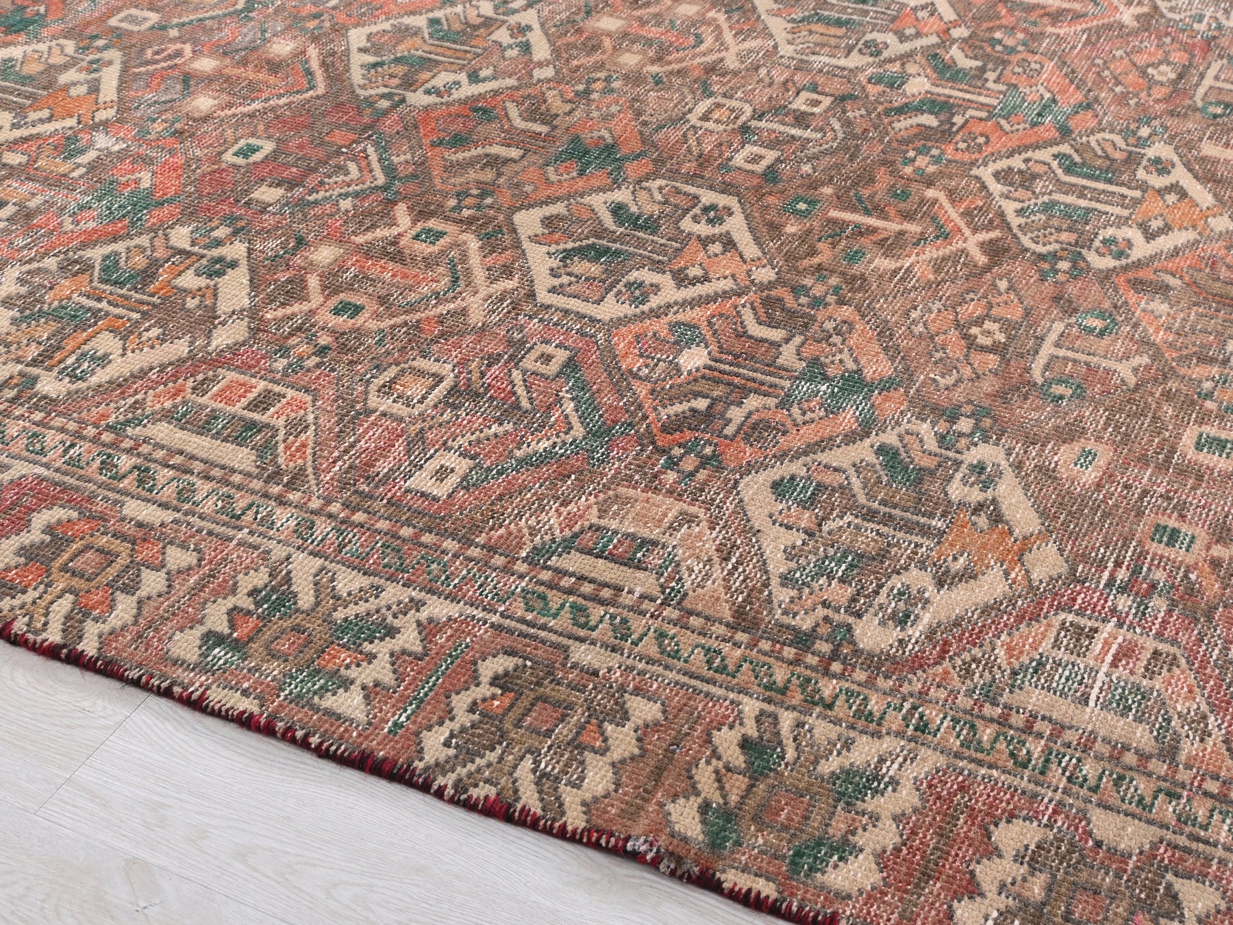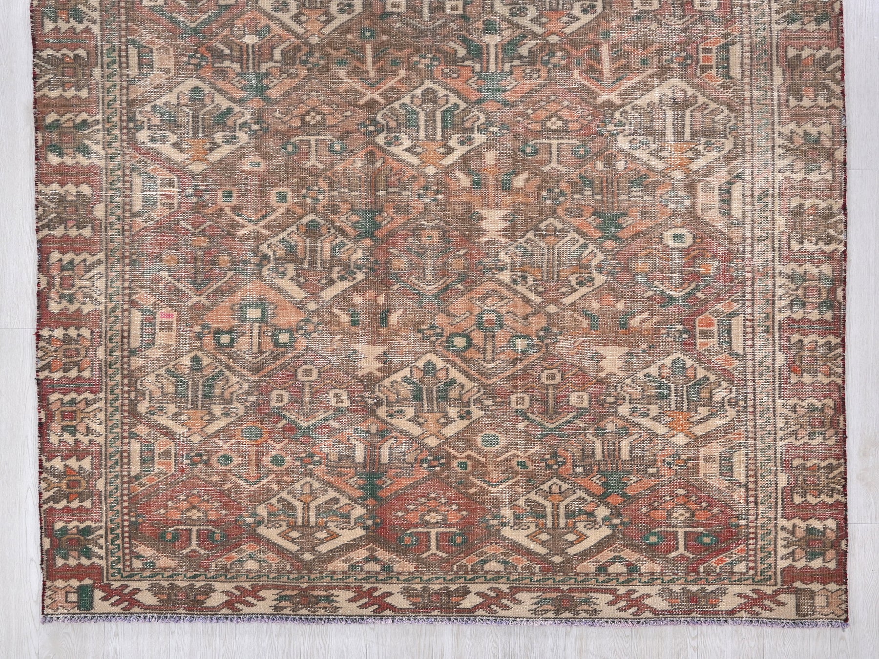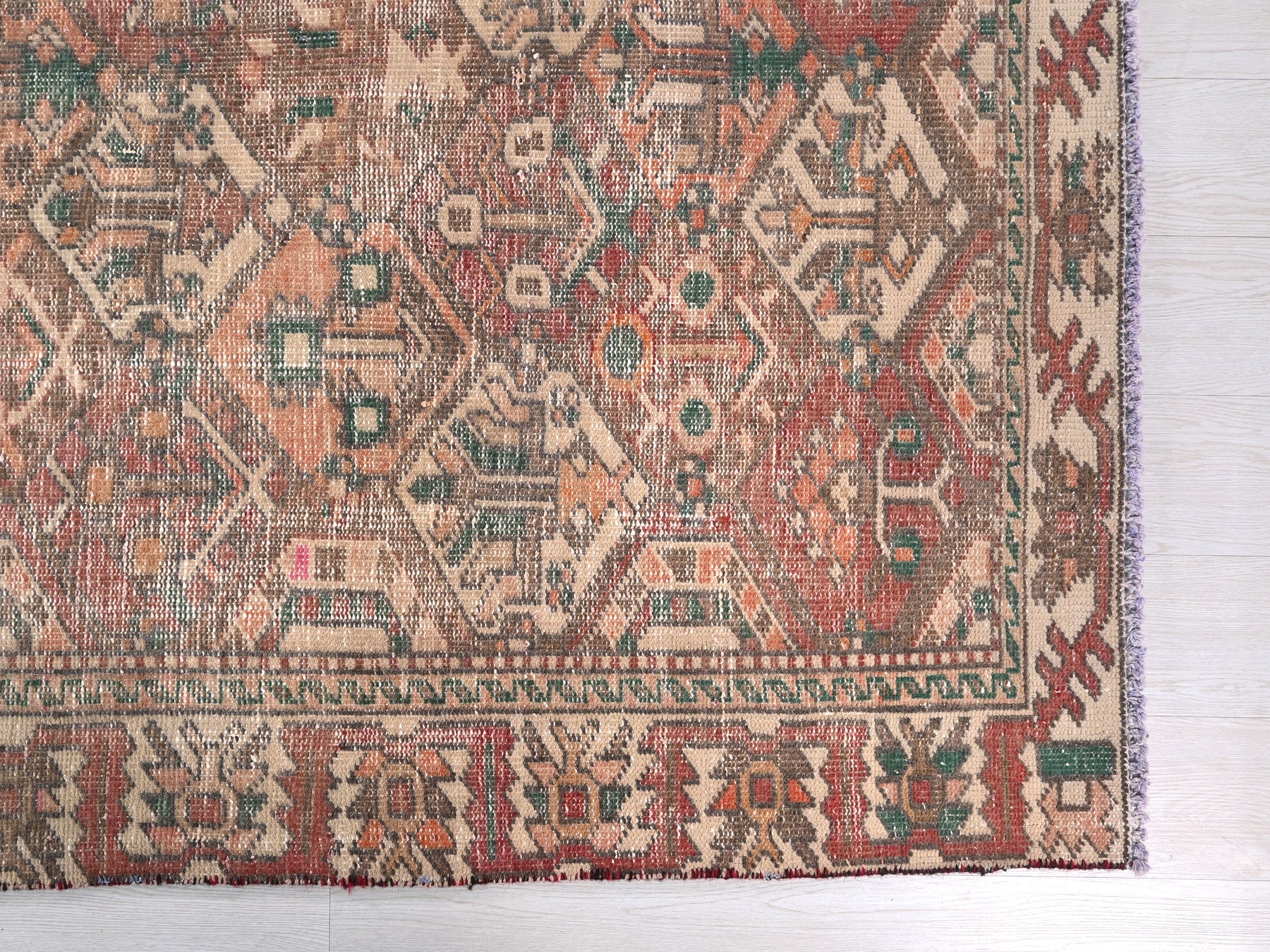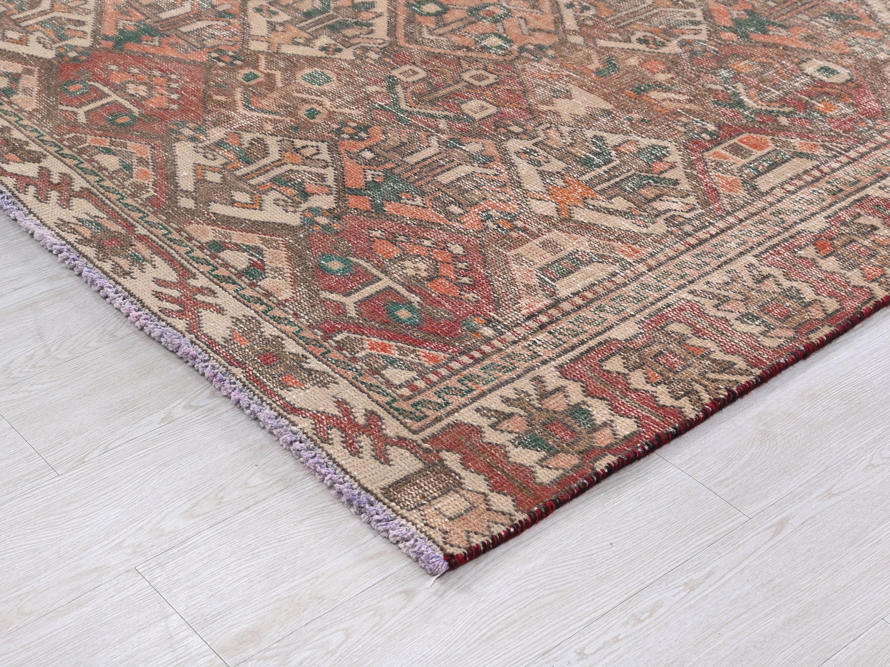 This is a hand-knotted, one-of-a-kind vintage rug. Due to the nature of this piece, there may be slight imperfections in its wear, shape, dimensions, and color. All of our rugs are professionally cleaned and repaired.