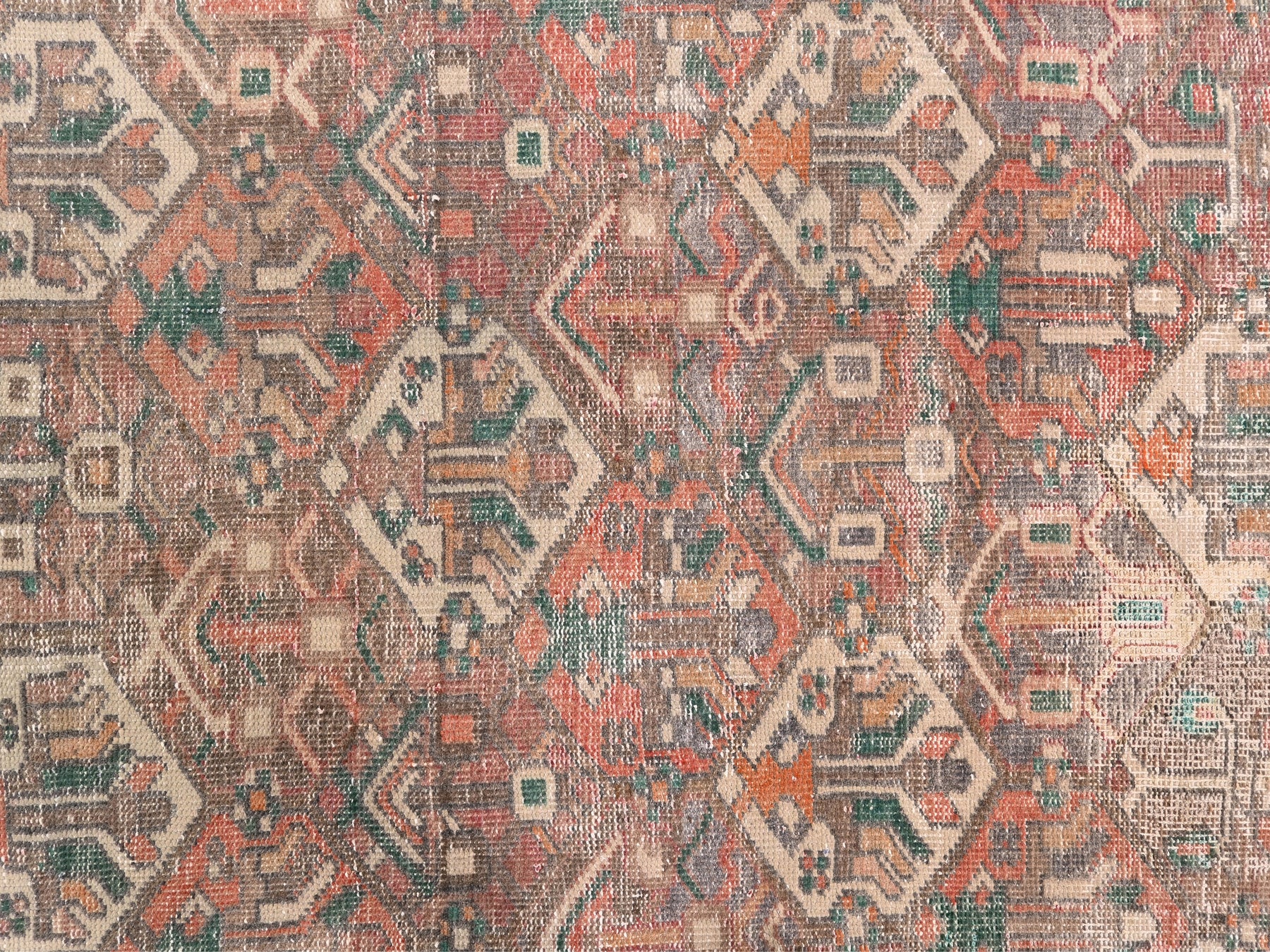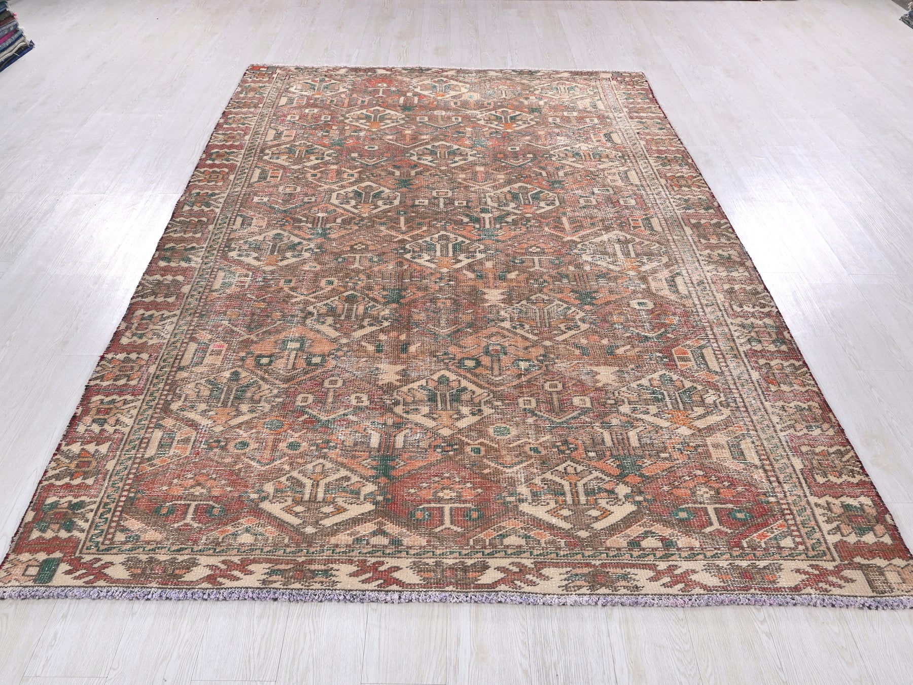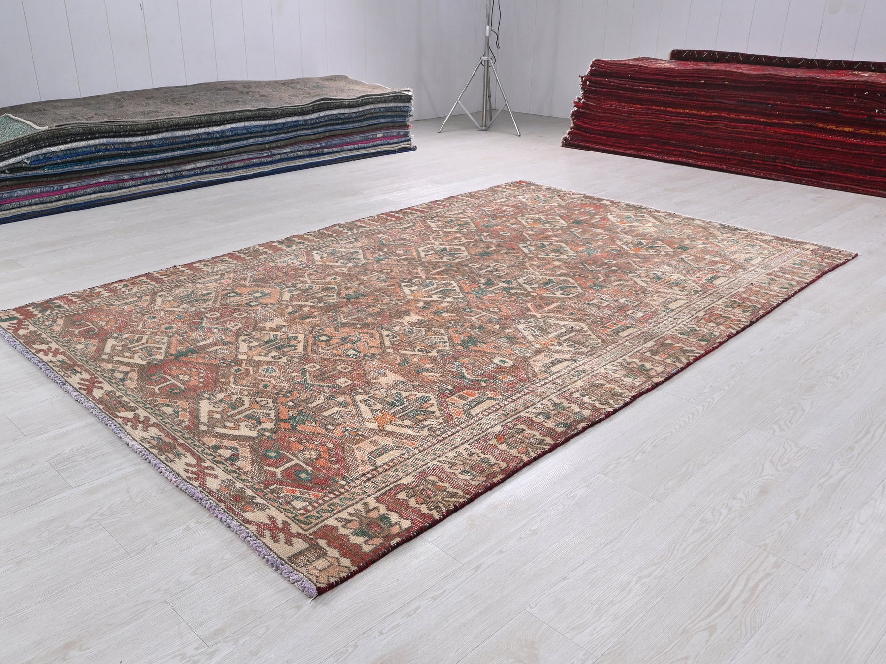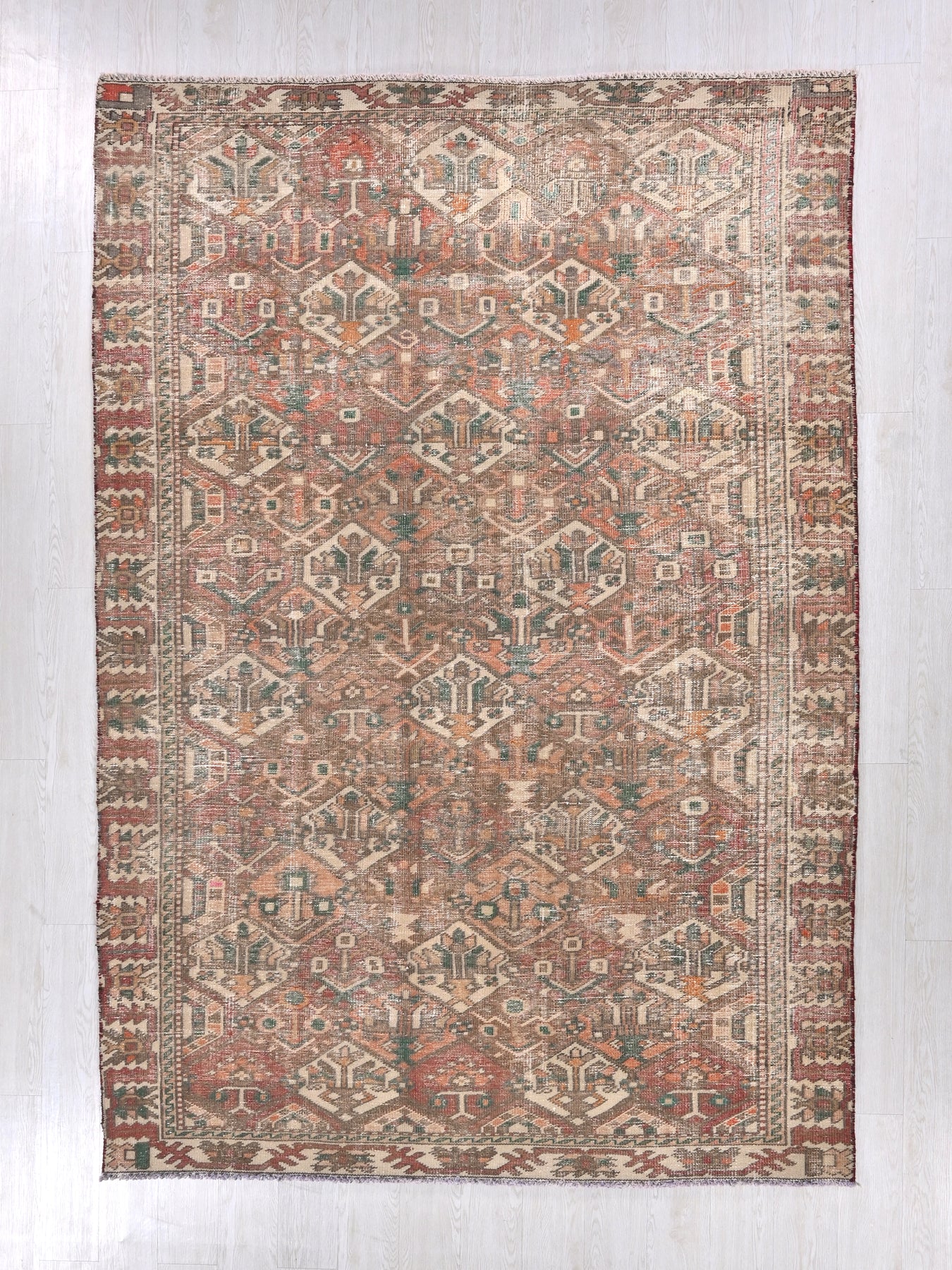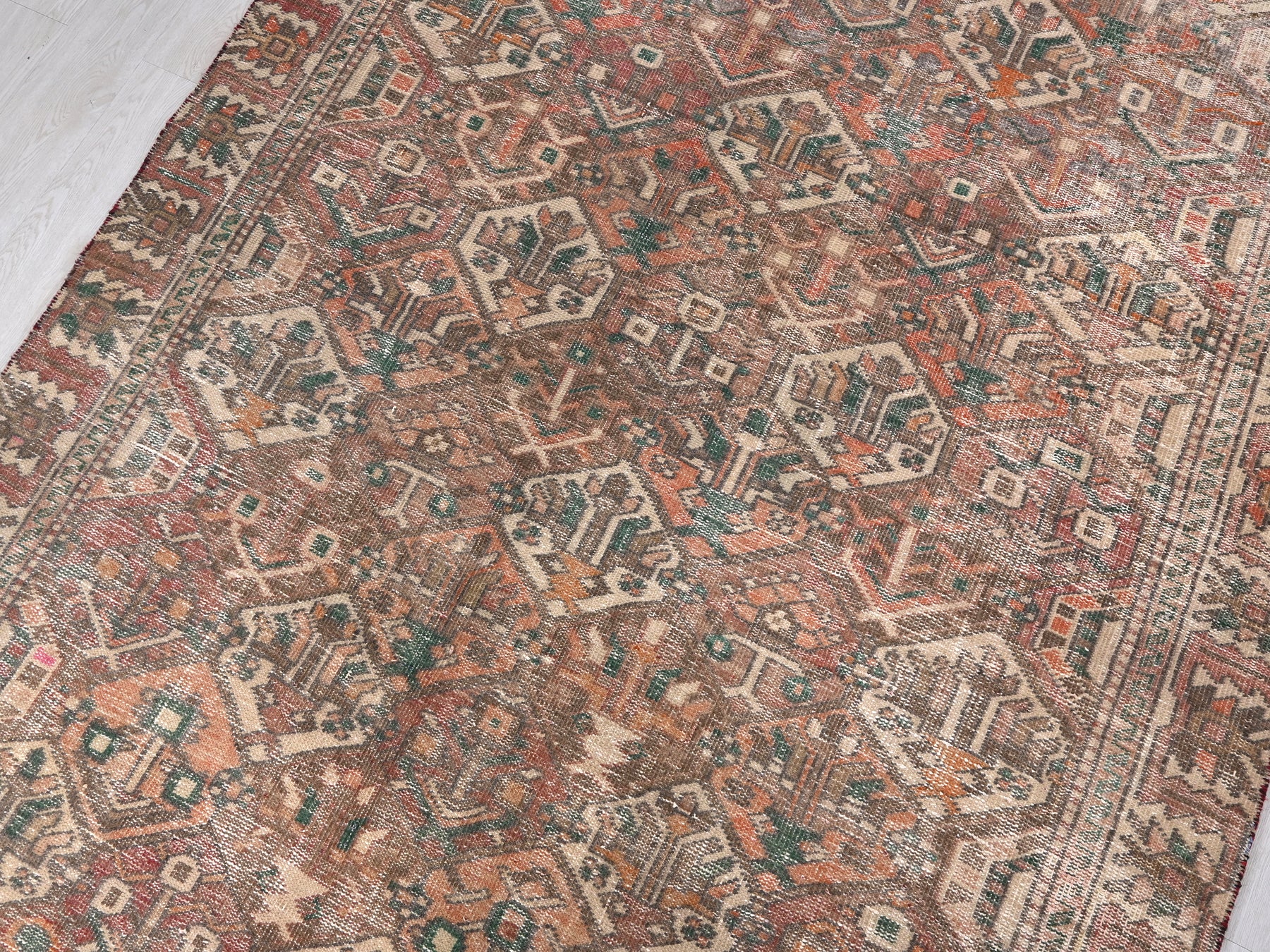 This is a hand-knotted, one-of-a-kind vintage rug. Due to the nature of this piece, there may be slight imperfections in its wear, shape, dimensions, and color. All of our rugs are professionally cleaned and repaired.