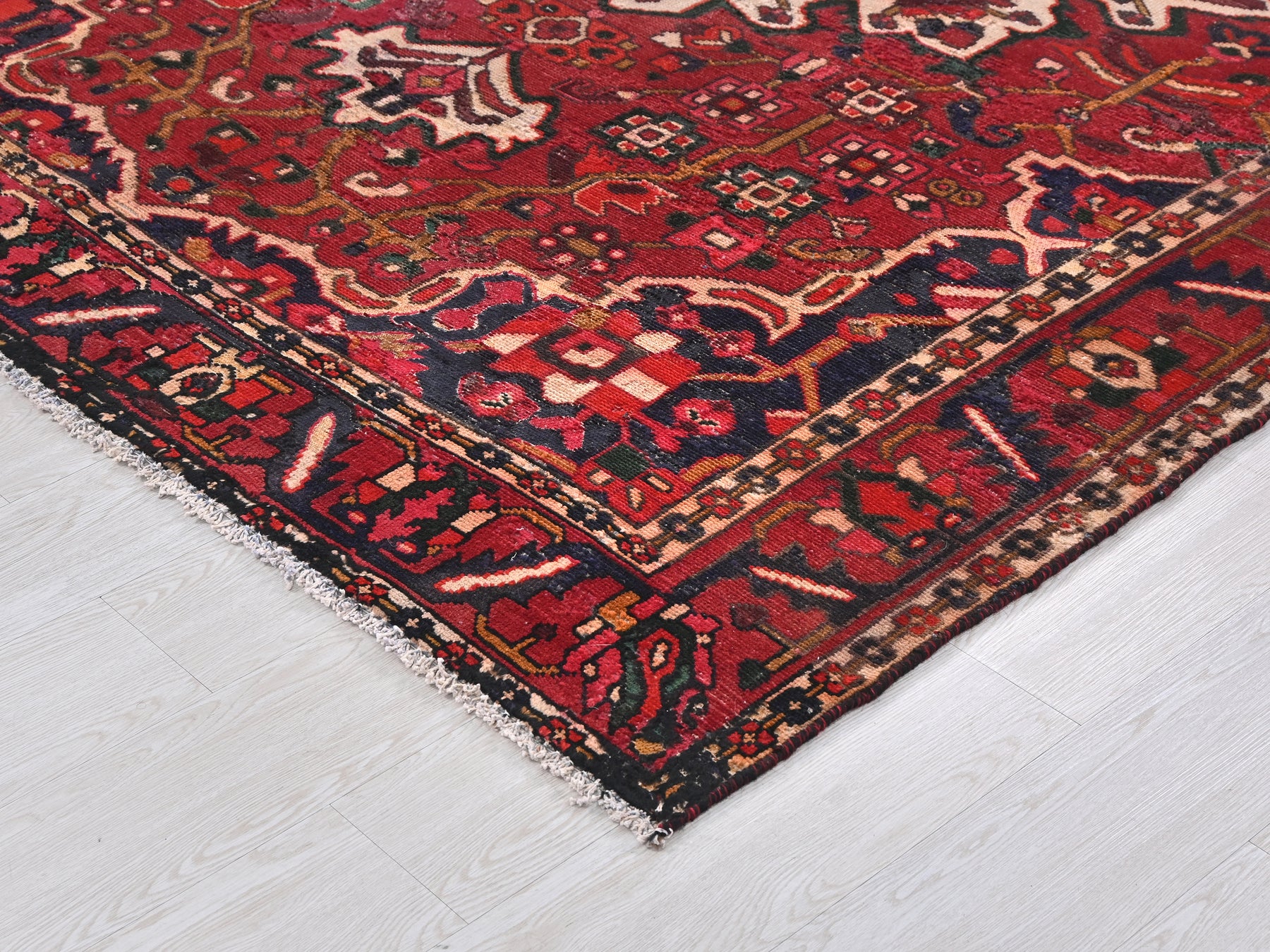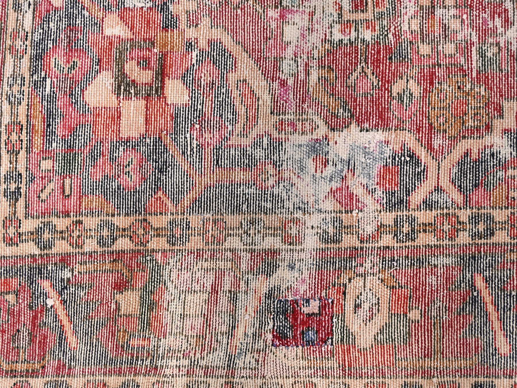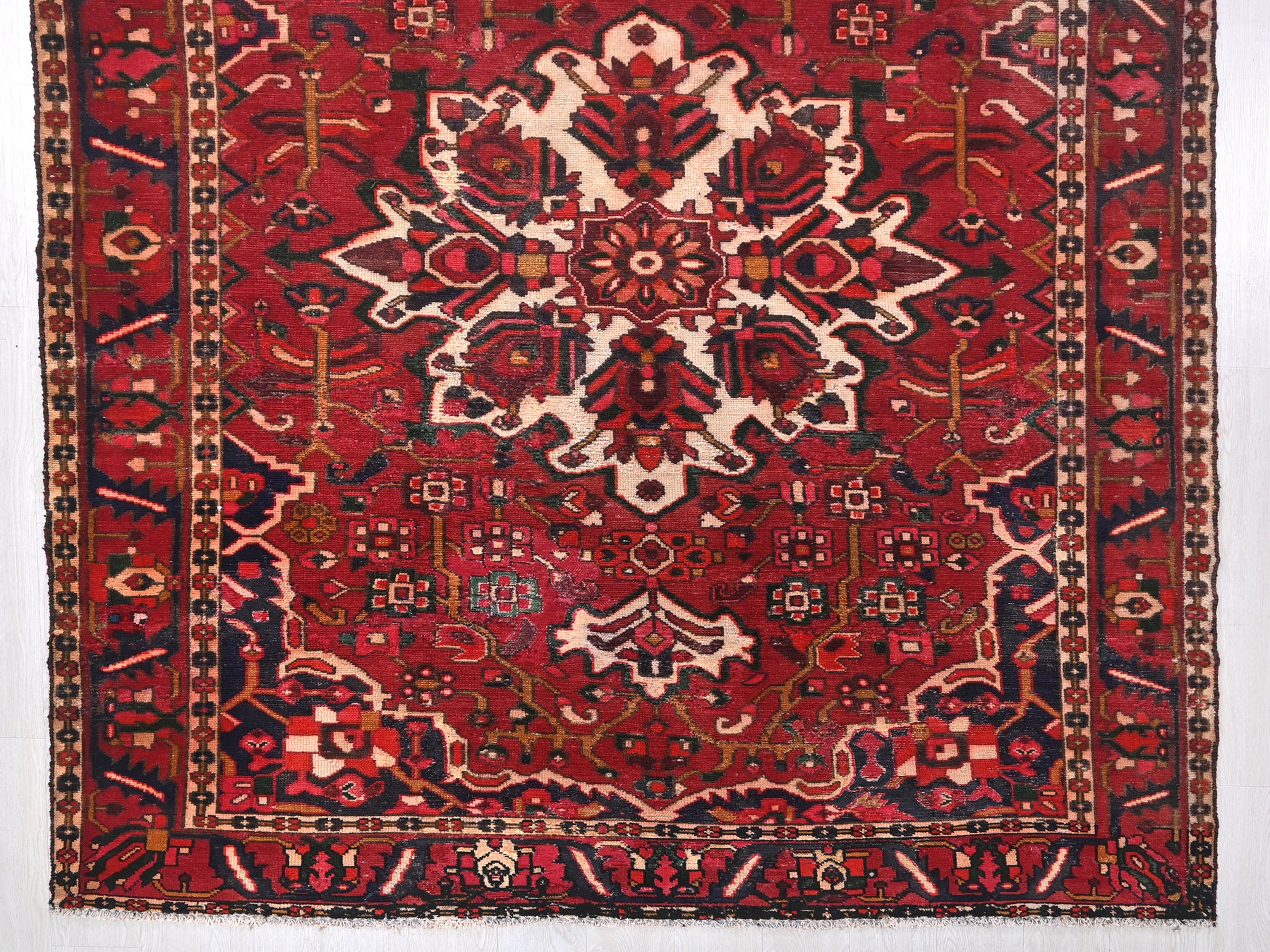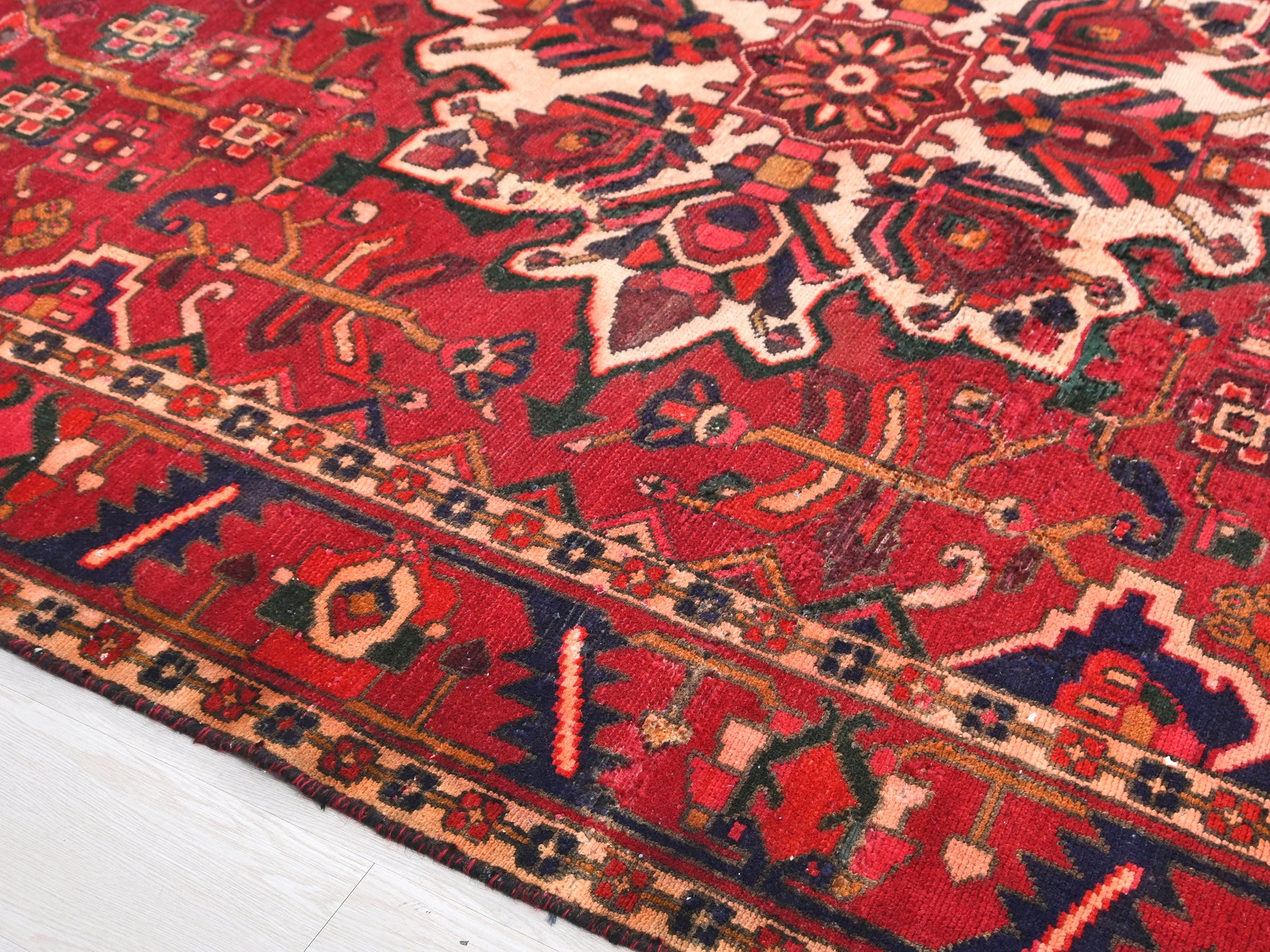 This is a hand-knotted, one-of-a-kind vintage rug. Due to the nature of this piece, there may be slight imperfections in its wear, shape, dimensions, and color. All of our rugs are professionally cleaned and repaired.