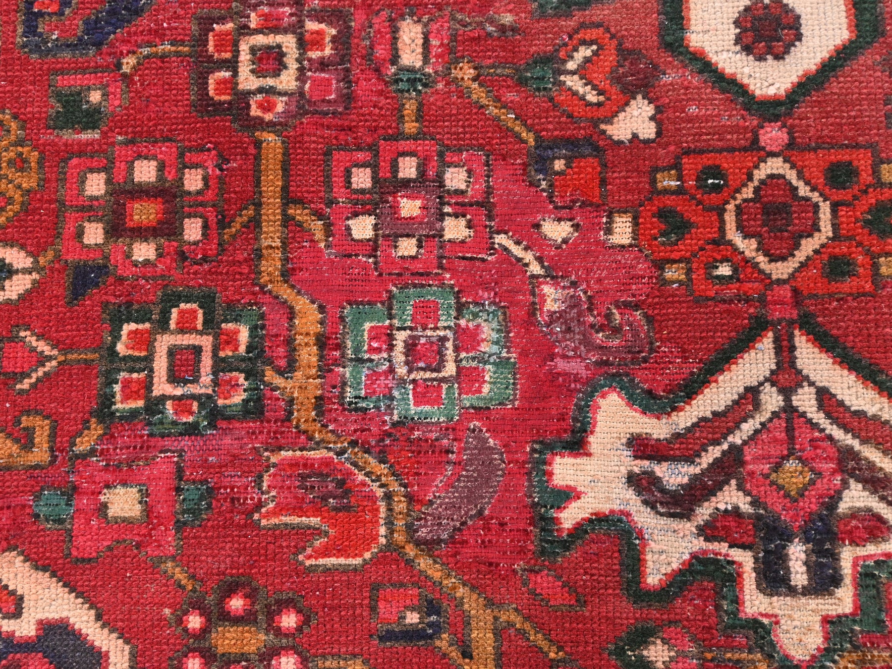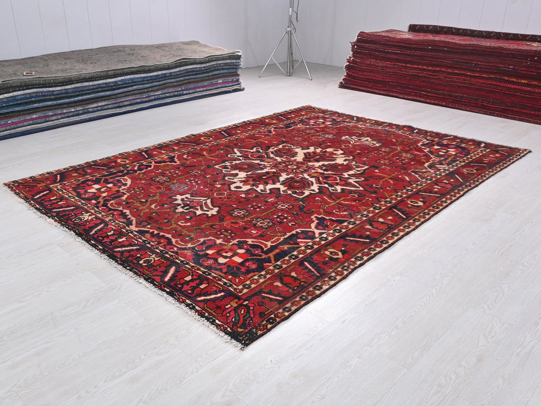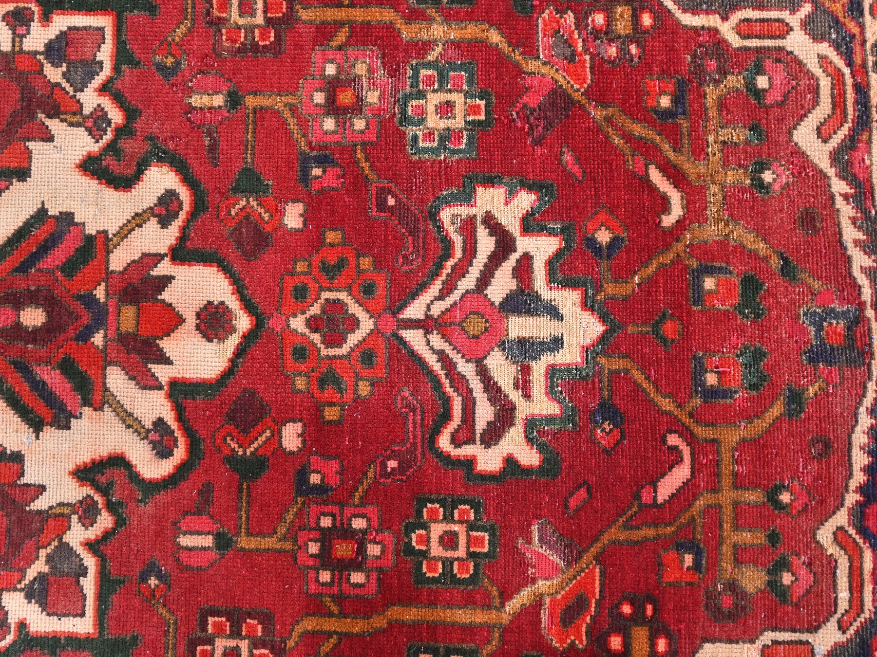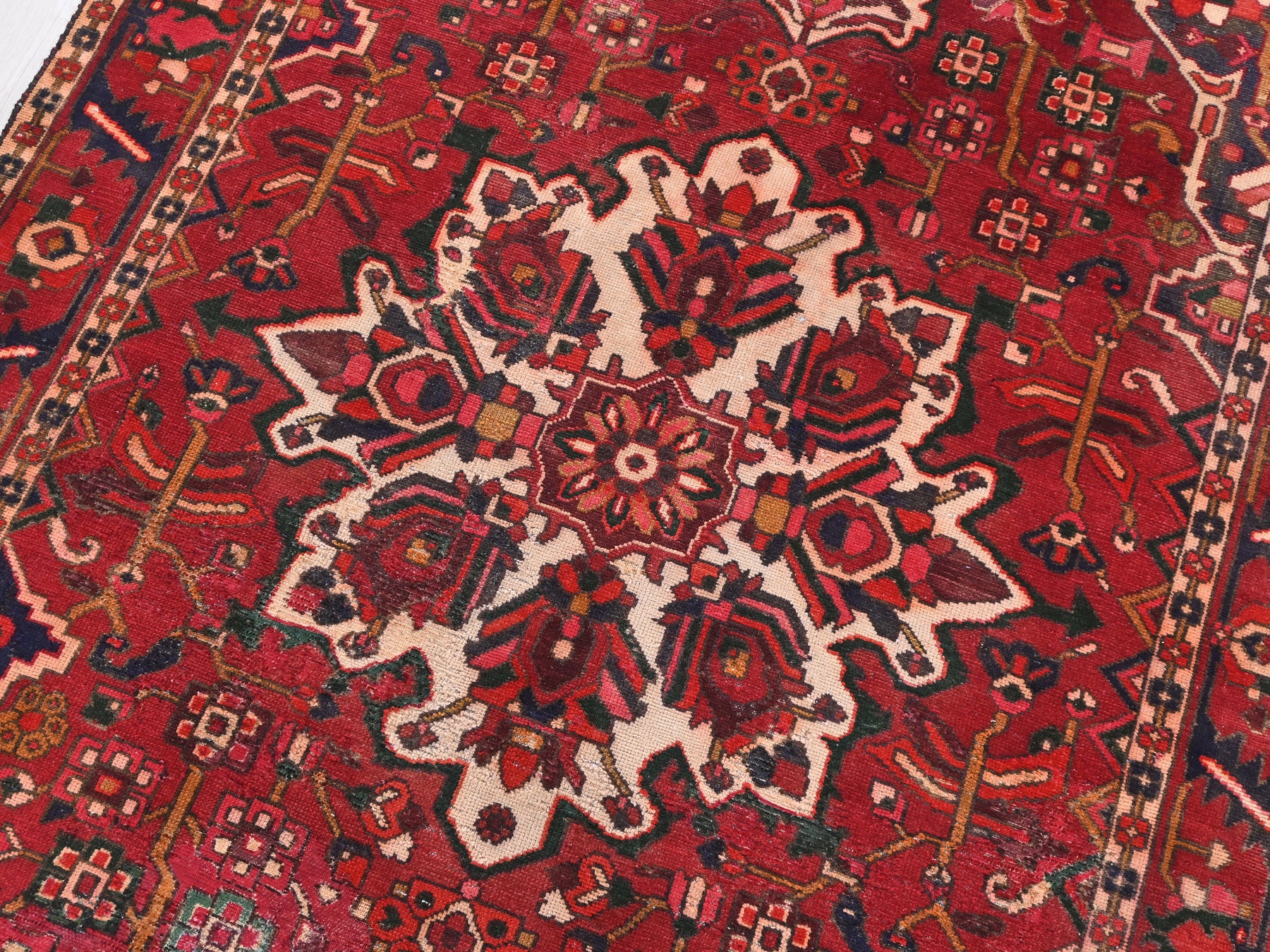 This is a hand-knotted, one-of-a-kind vintage rug. Due to the nature of this piece, there may be slight imperfections in its wear, shape, dimensions, and color. All of our rugs are professionally cleaned and repaired.