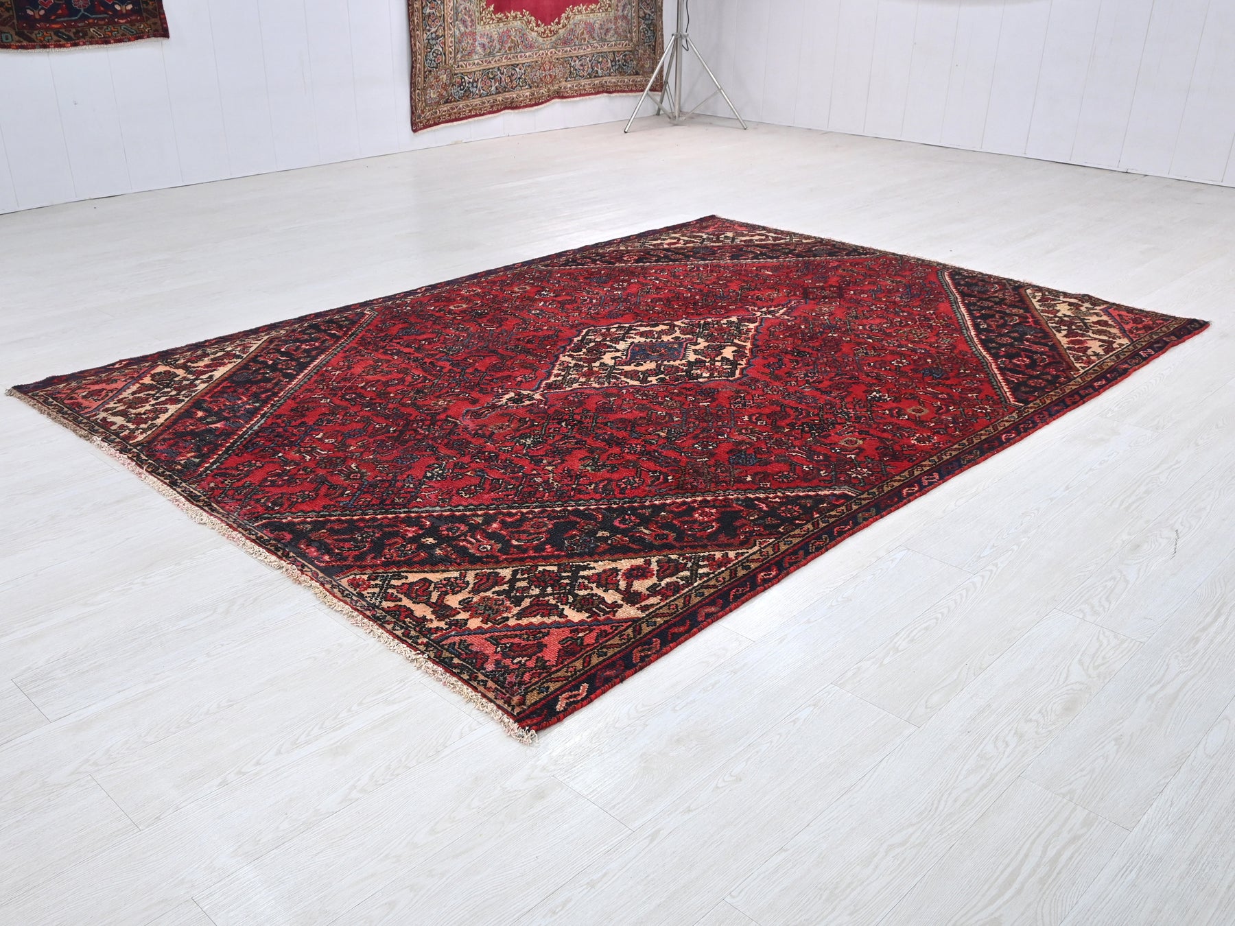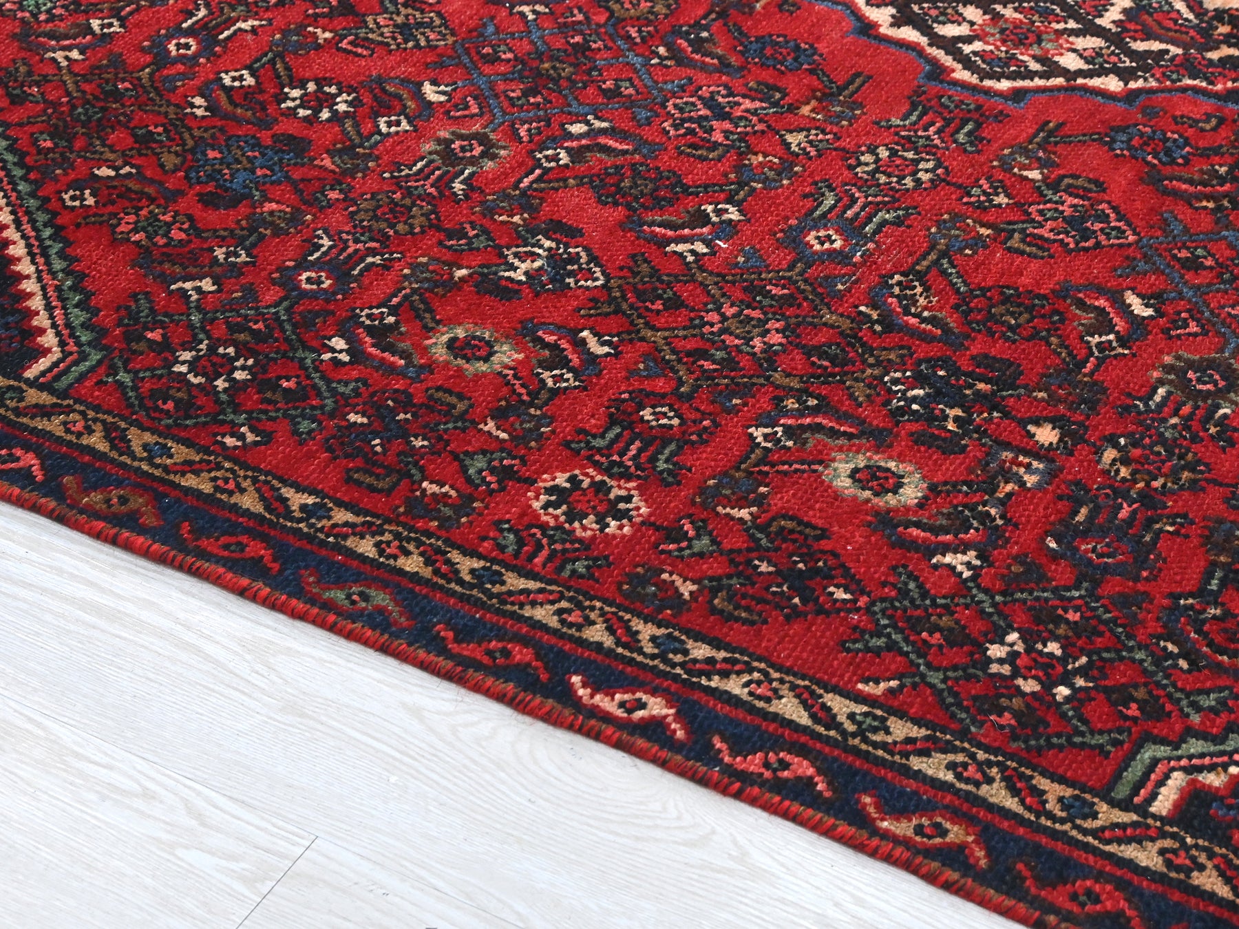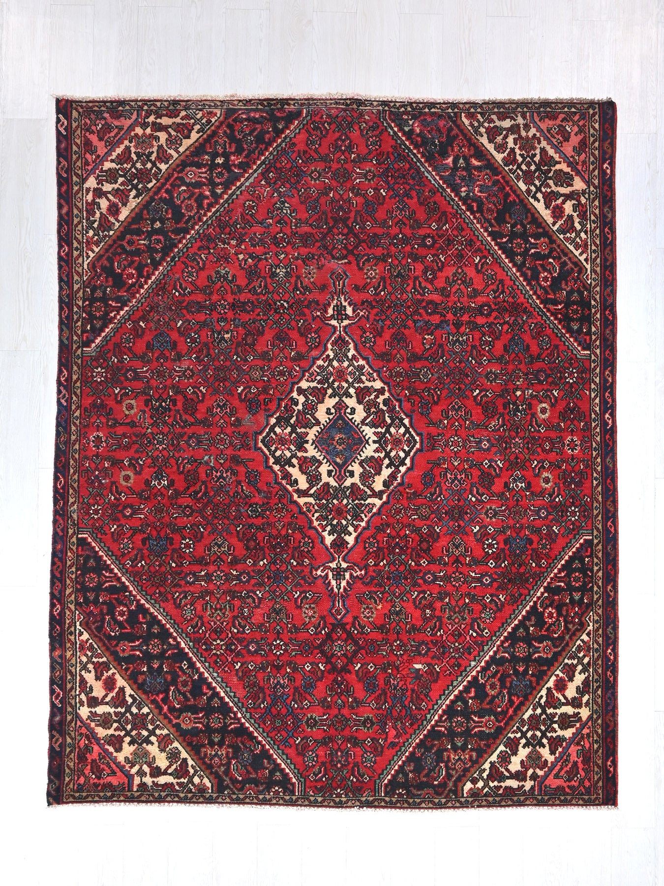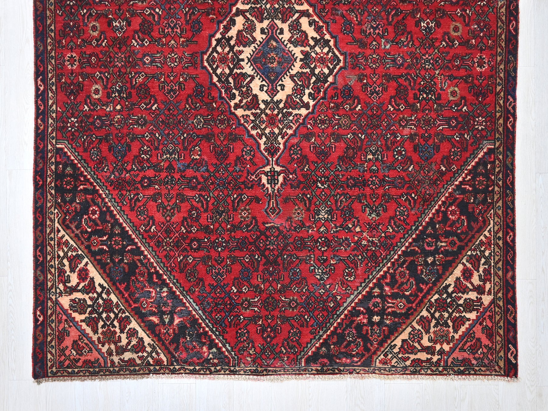 This is a hand-knotted, one-of-a-kind vintage rug. Due to the nature of this piece, there may be slight imperfections in its wear, shape, dimensions, and color. All of our rugs are professionally cleaned and repaired.