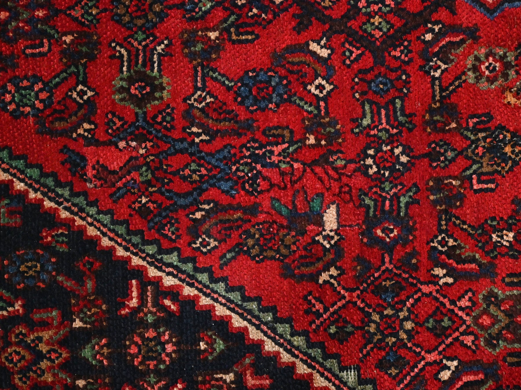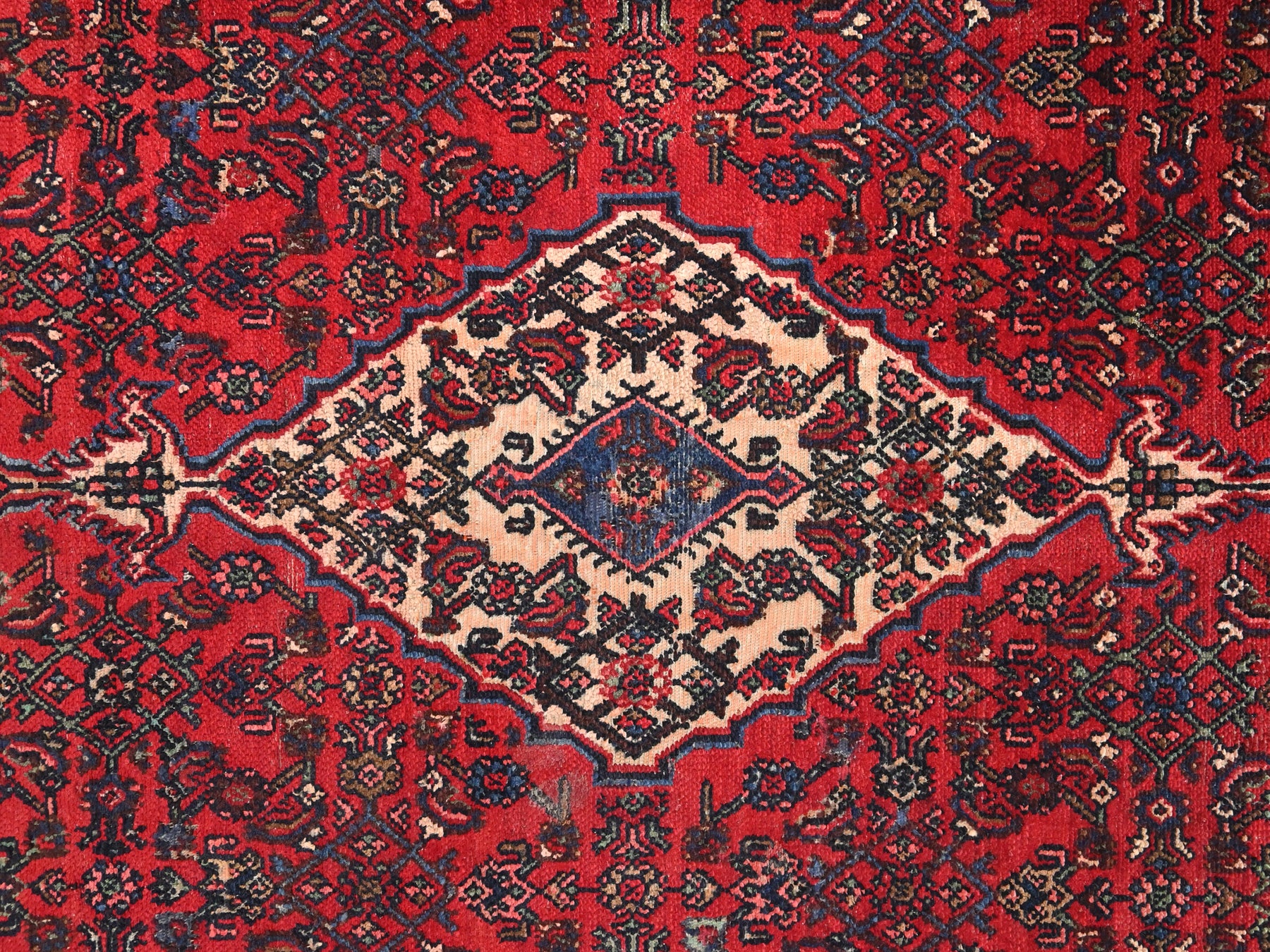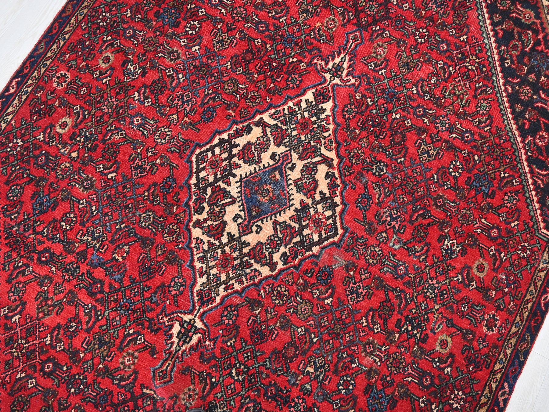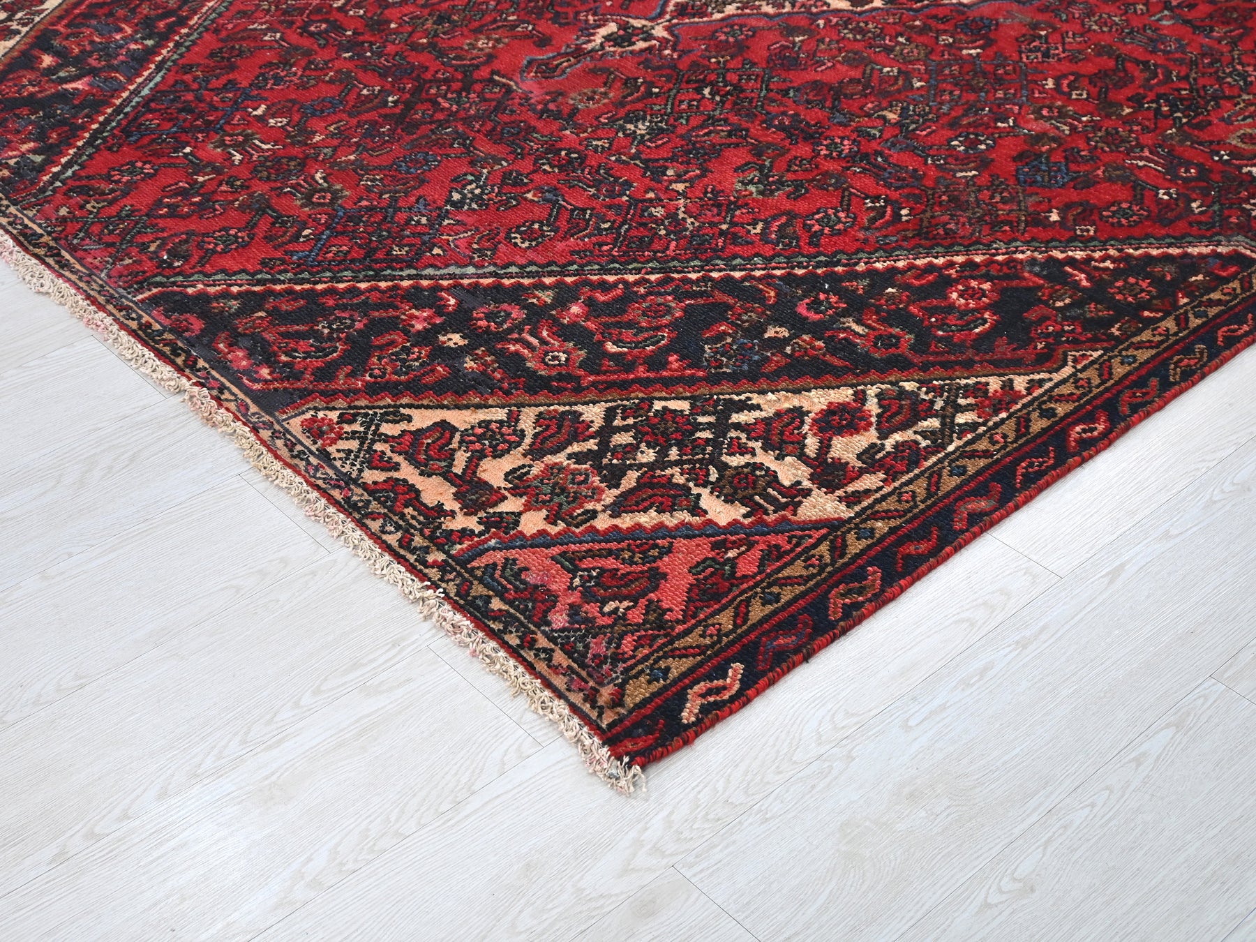 This is a hand-knotted, one-of-a-kind vintage rug. Due to the nature of this piece, there may be slight imperfections in its wear, shape, dimensions, and color. All of our rugs are professionally cleaned and repaired.