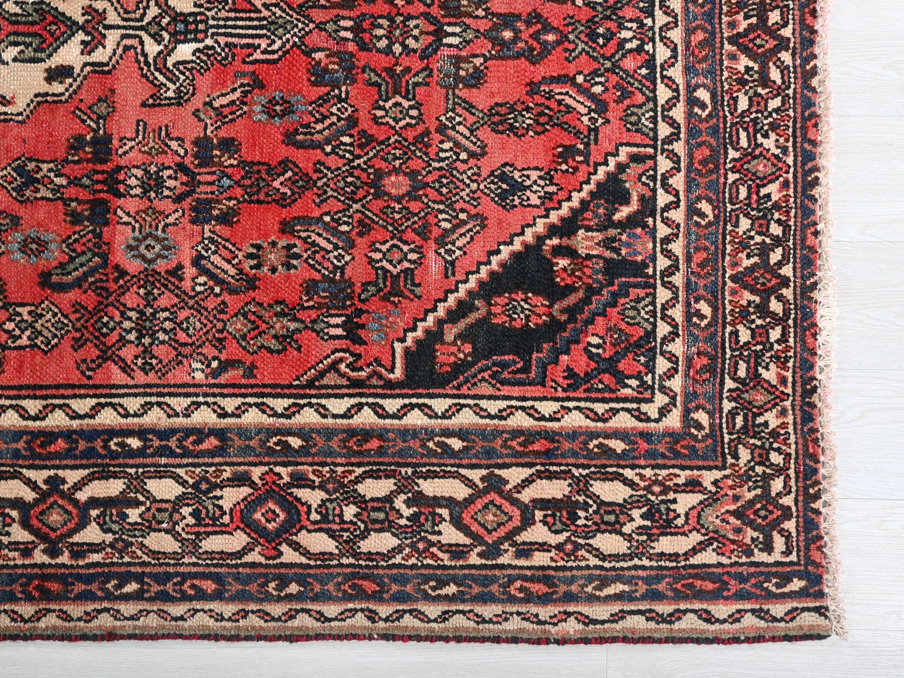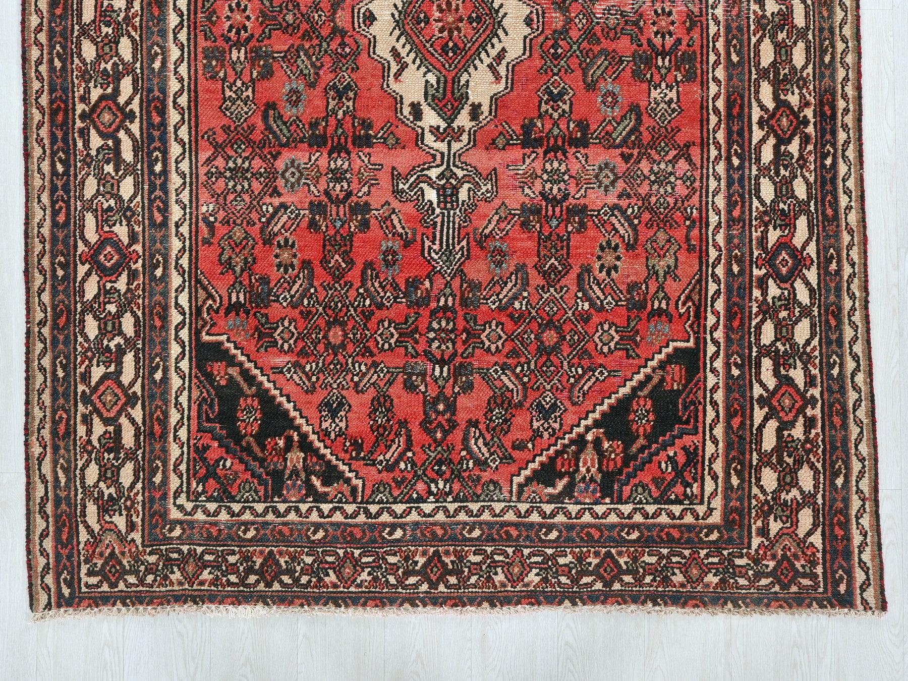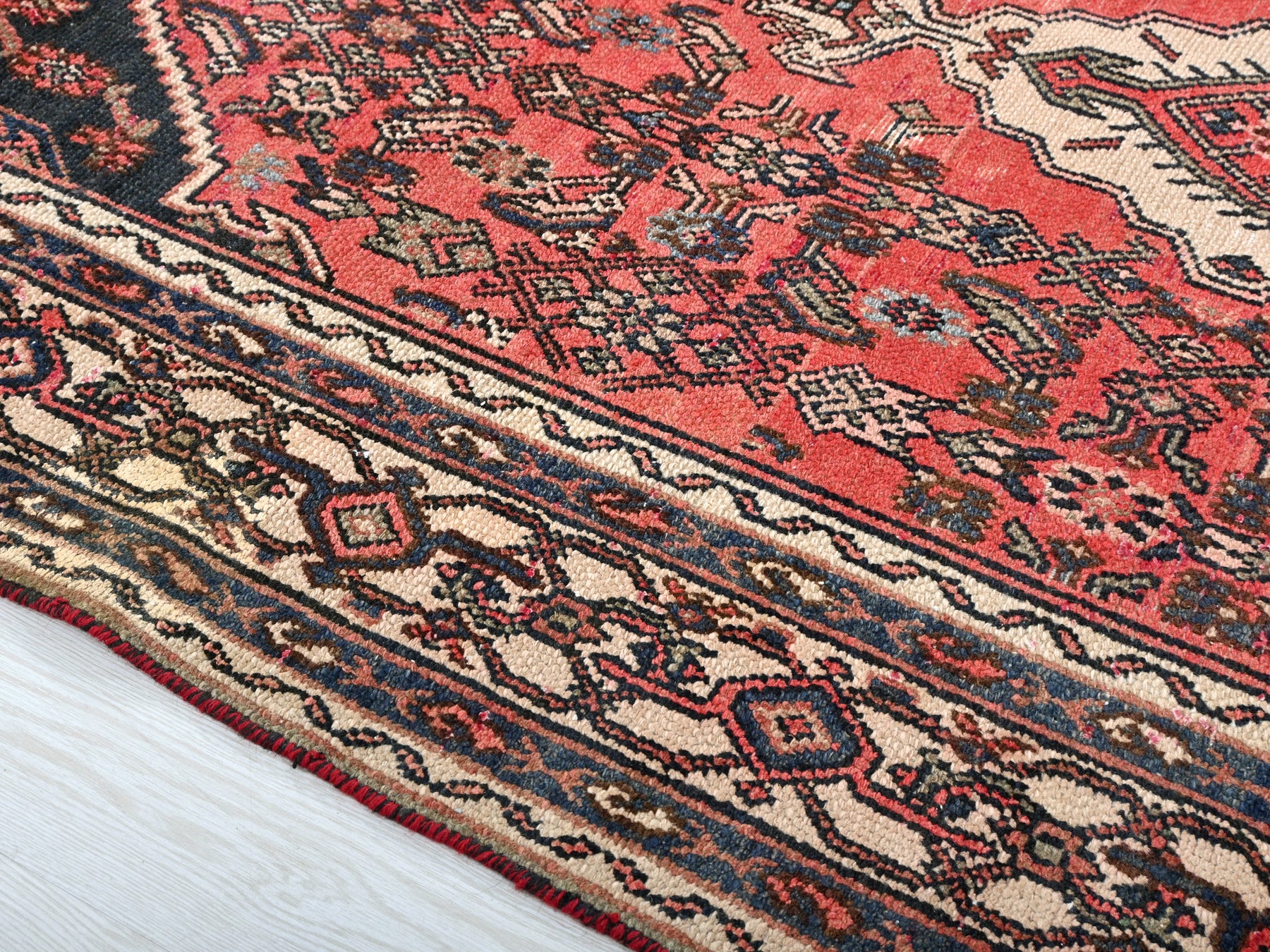 This is a hand-knotted, one-of-a-kind vintage rug. Due to the nature of this piece, there may be slight imperfections in its wear, shape, dimensions, and color. All of our rugs are professionally cleaned and repaired.