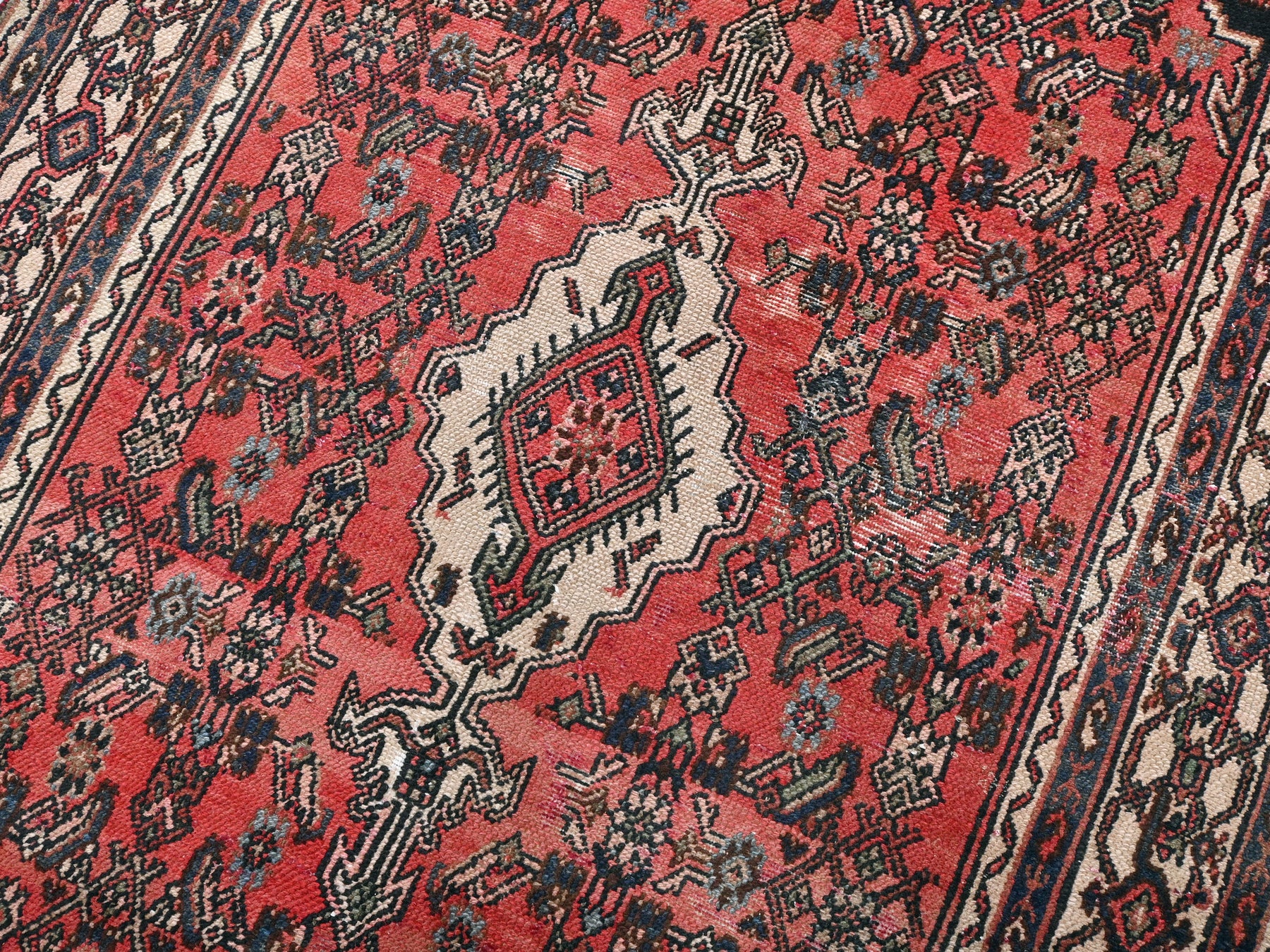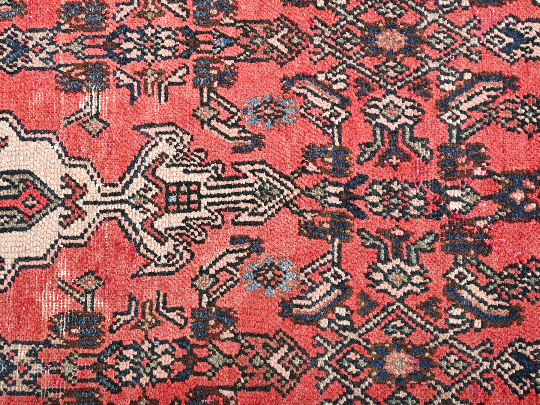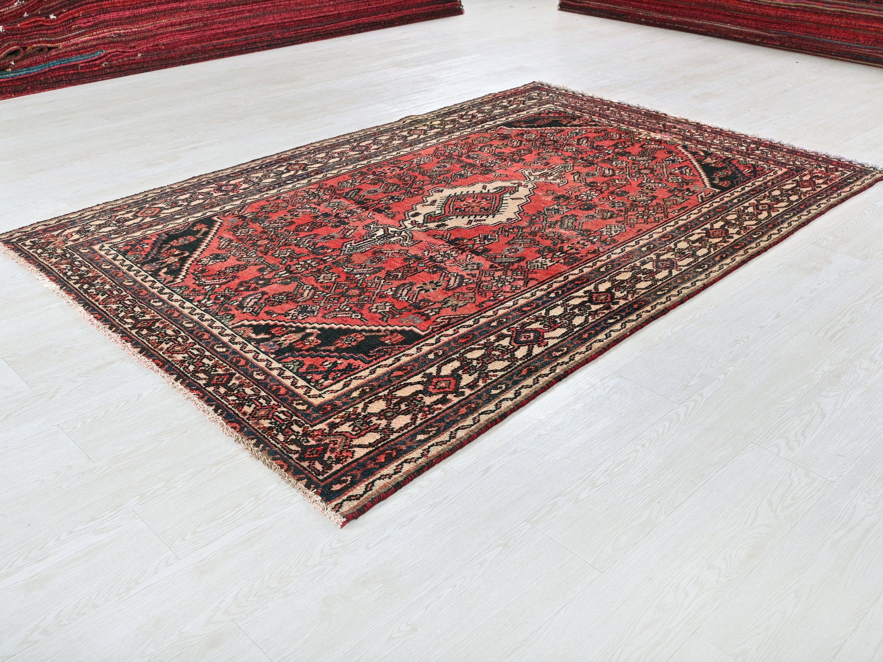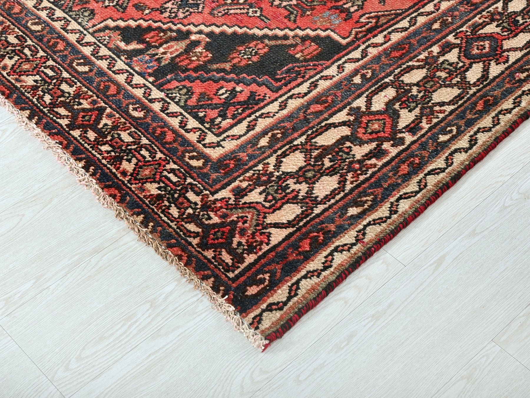 This is a hand-knotted, one-of-a-kind vintage rug. Due to the nature of this piece, there may be slight imperfections in its wear, shape, dimensions, and color. All of our rugs are professionally cleaned and repaired.