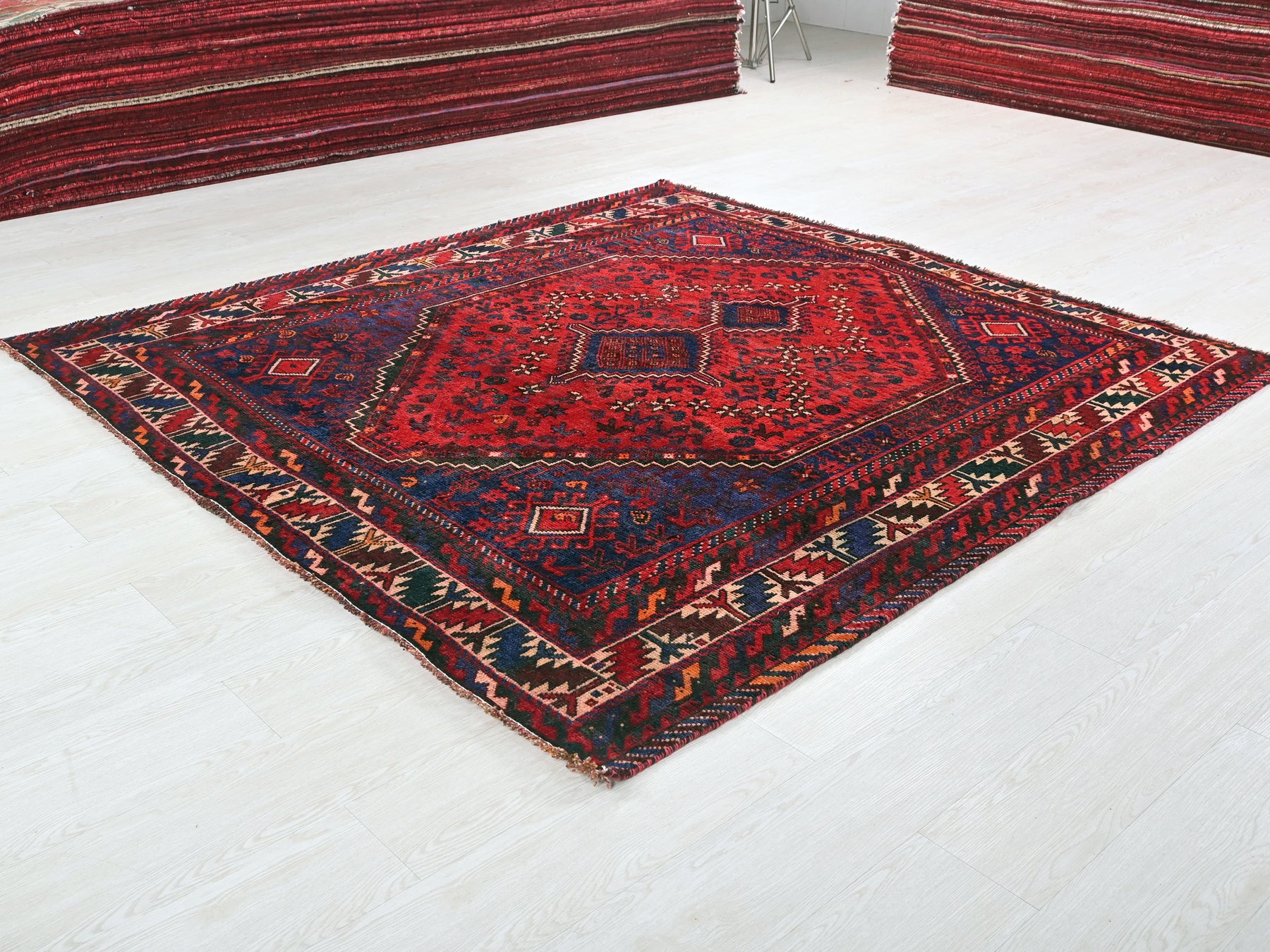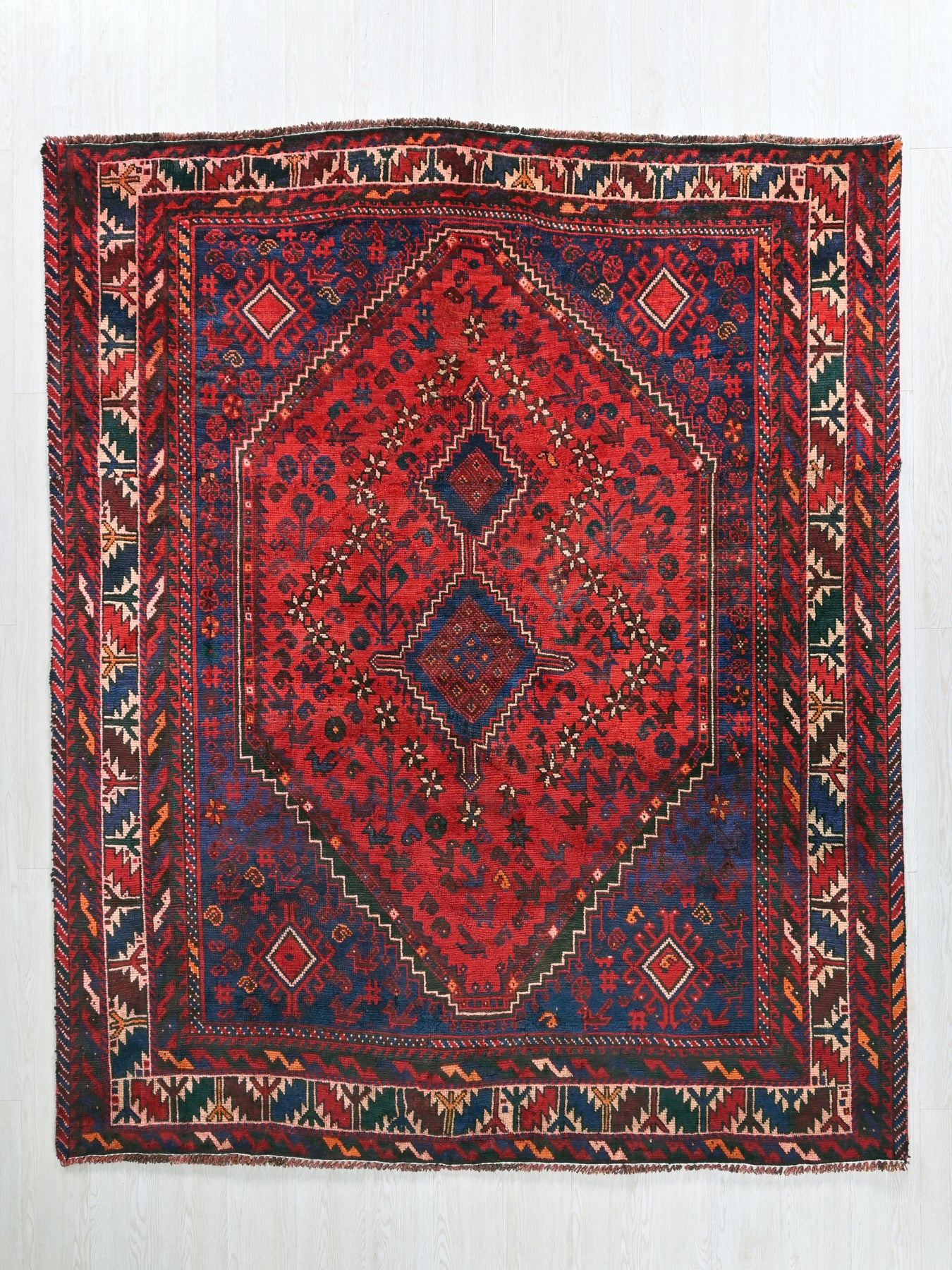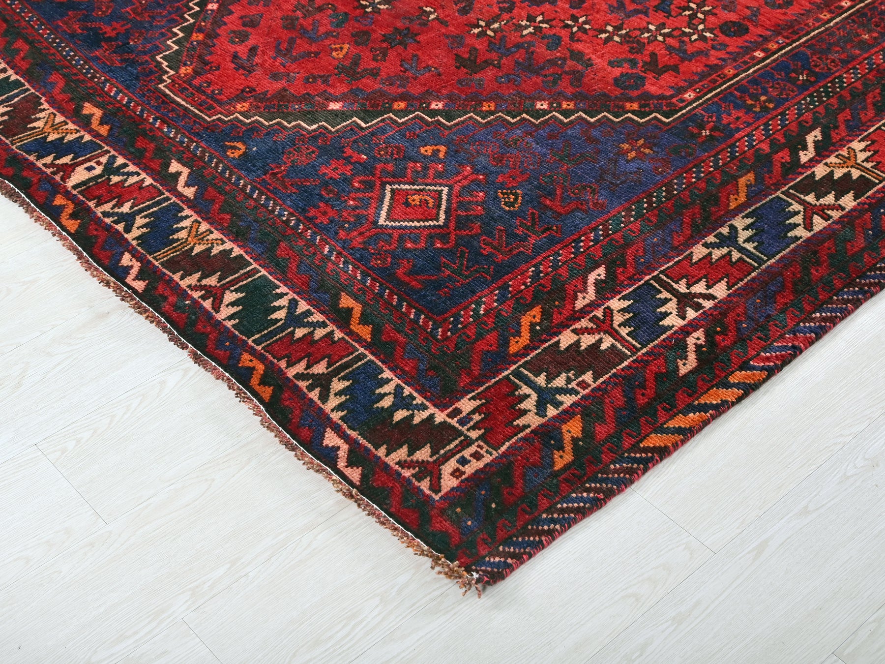 This is a hand-knotted, one-of-a-kind vintage rug. Due to the nature of this piece, there may be slight imperfections in its wear, shape, dimensions, and color. All of our rugs are professionally cleaned and repaired.