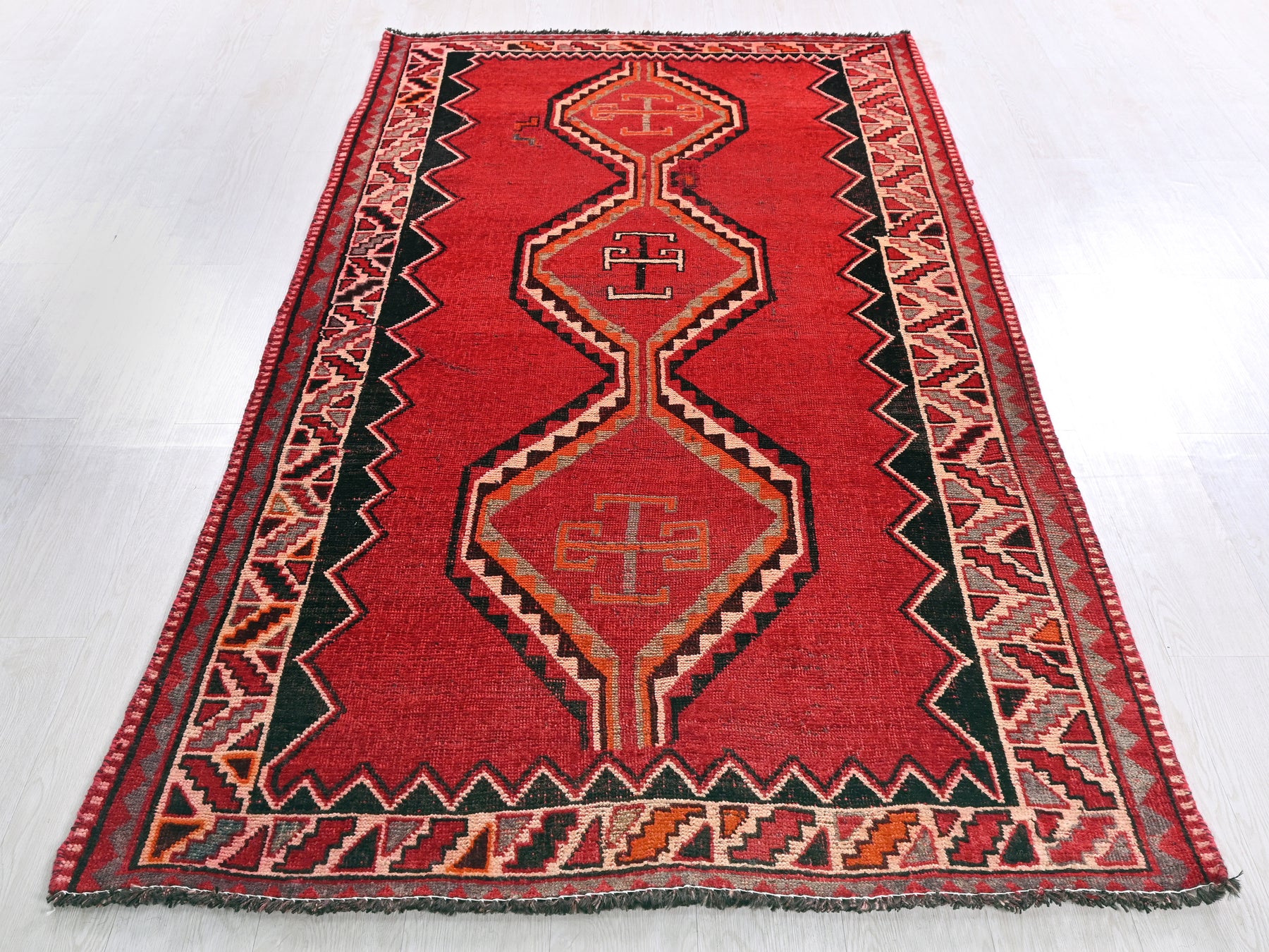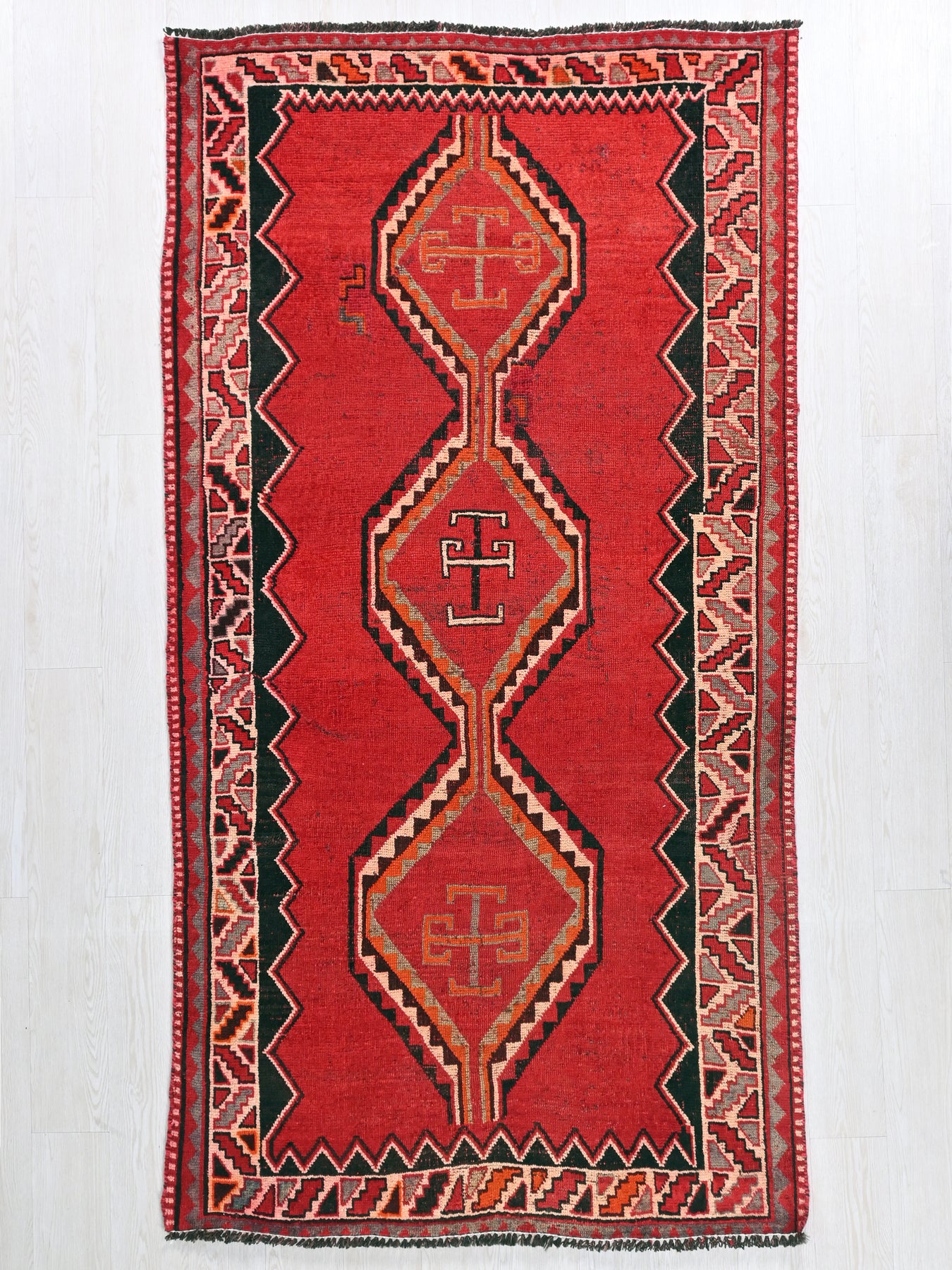 This is a hand-knotted, one-of-a-kind vintage rug. Due to the nature of this piece, there may be slight imperfections in its wear, shape, dimensions, and color. All of our rugs are professionally cleaned and repaired.