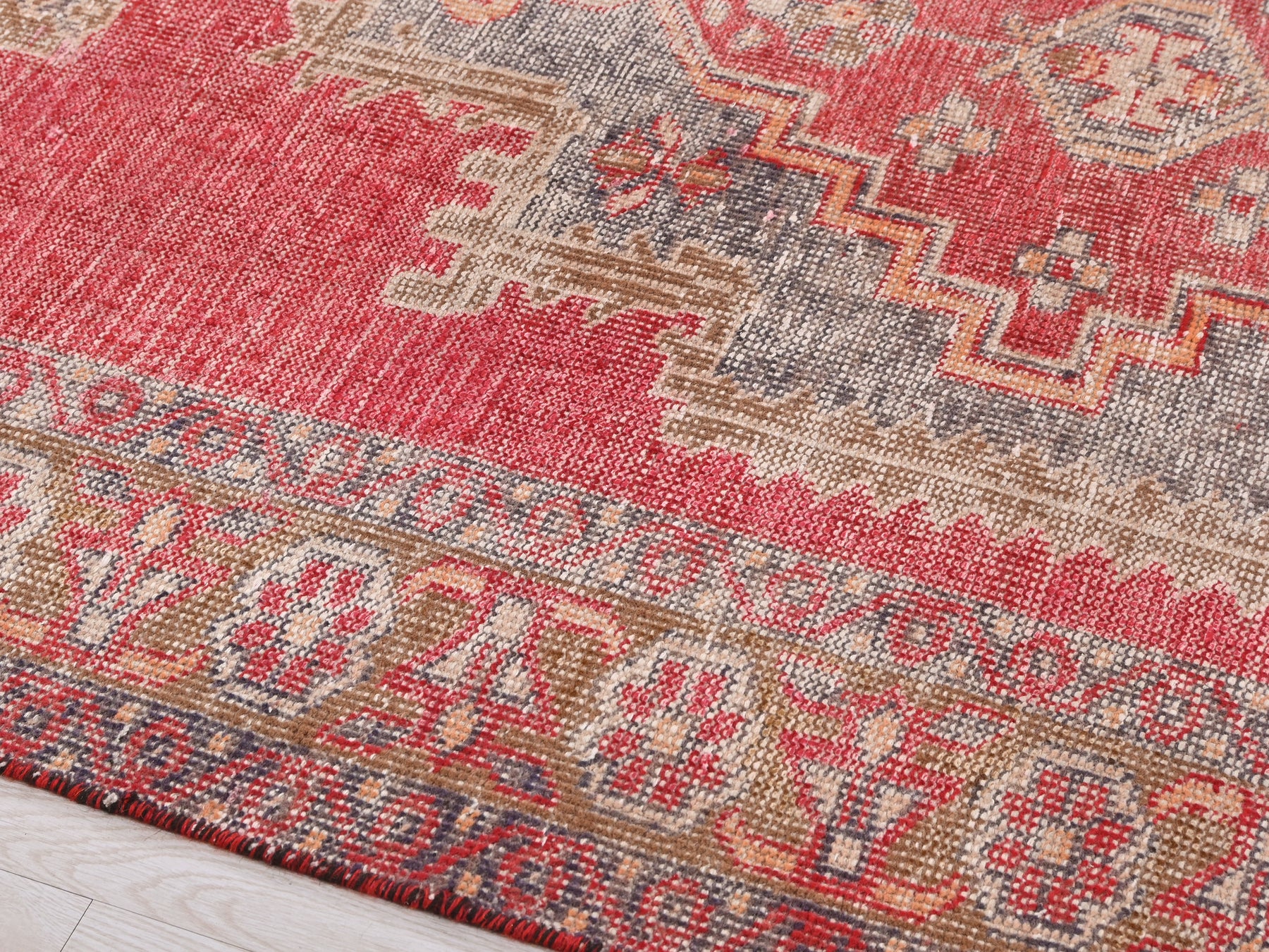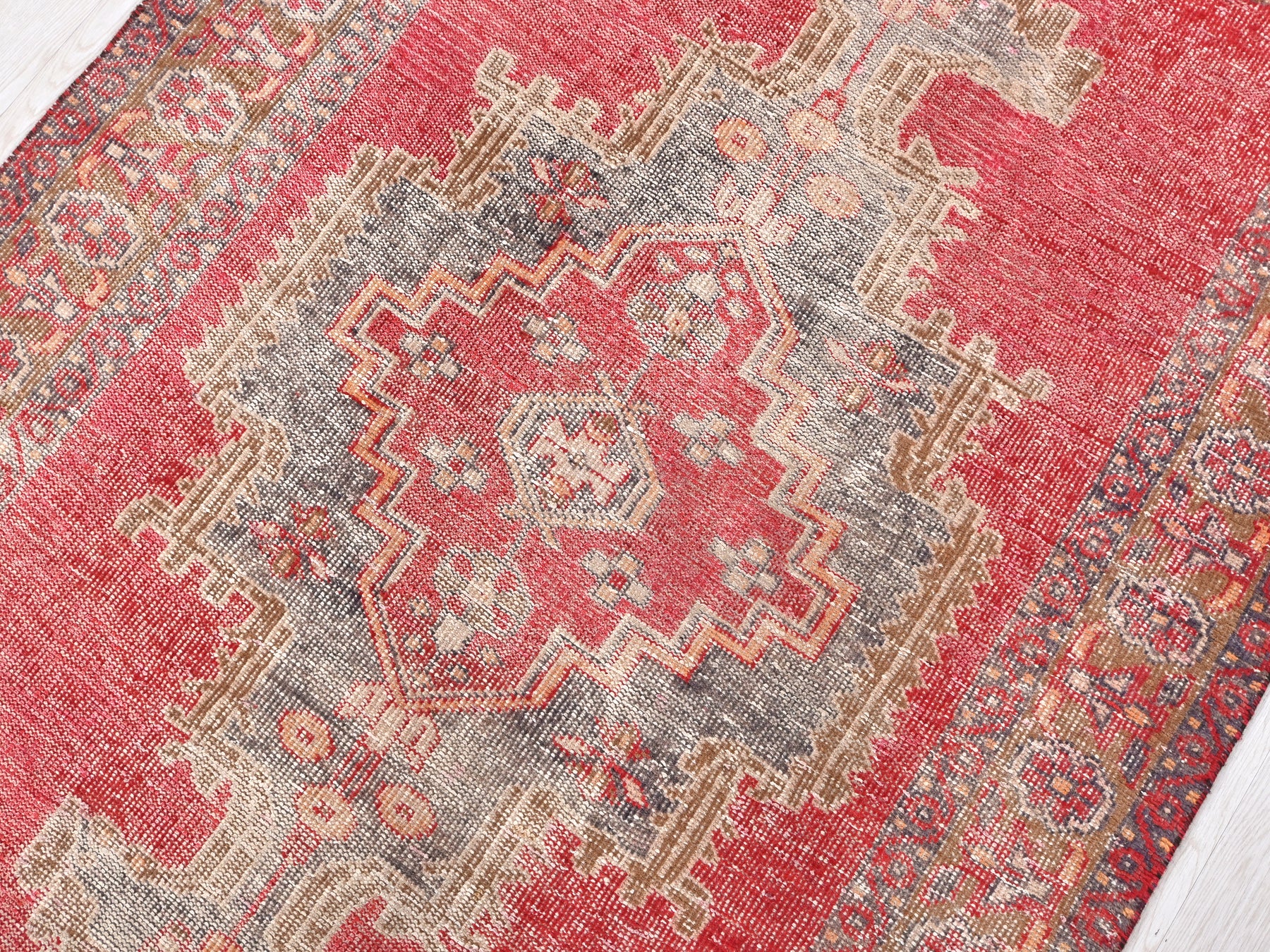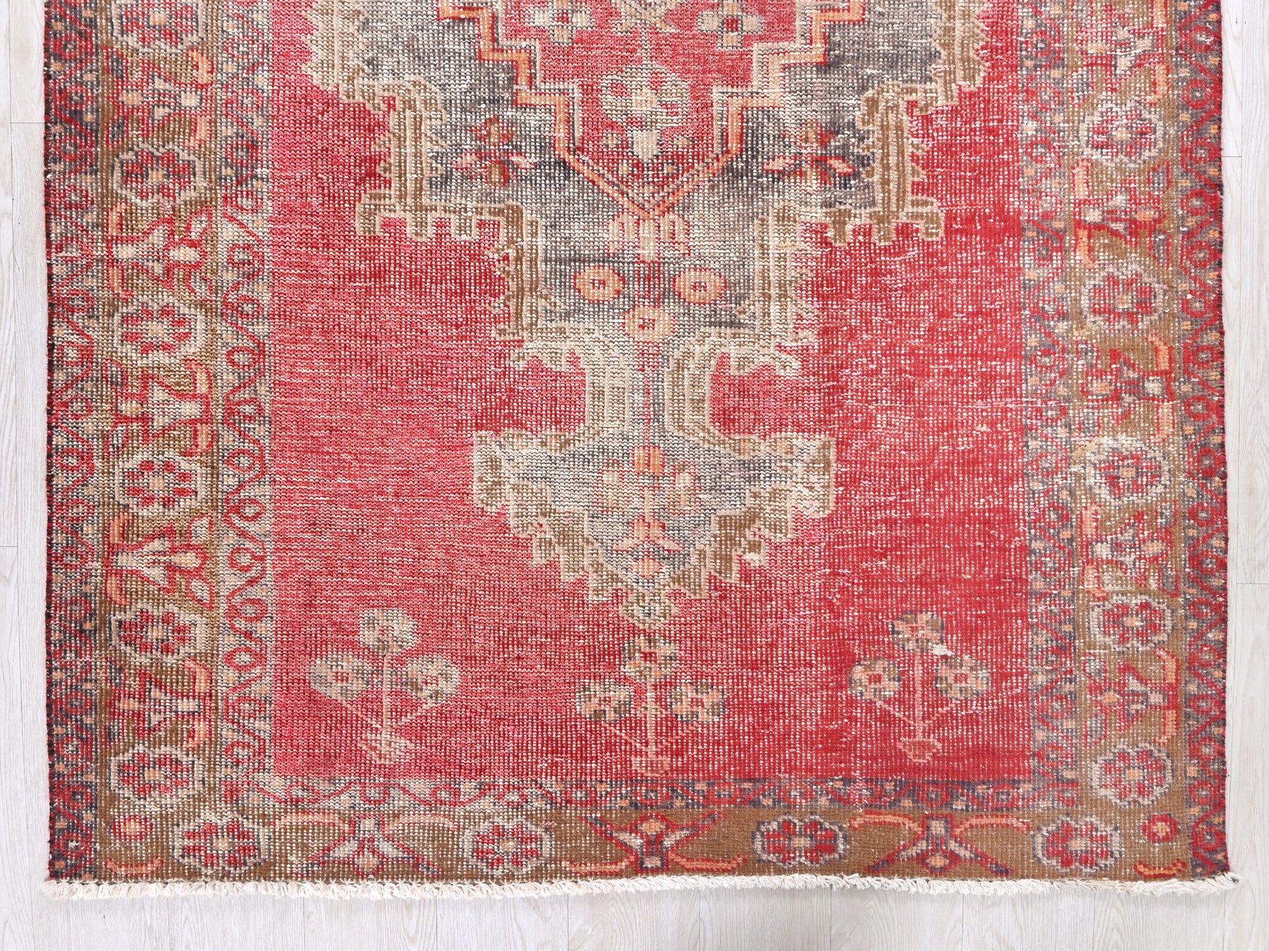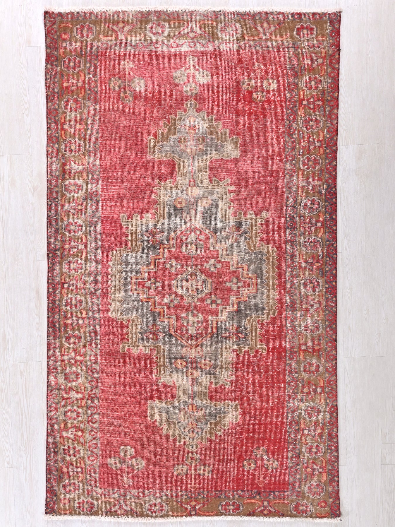 This is a hand-knotted, one-of-a-kind vintage rug. Due to the nature of this piece, there may be slight imperfections in its wear, shape, dimensions, and color. All of our rugs are professionally cleaned and repaired.