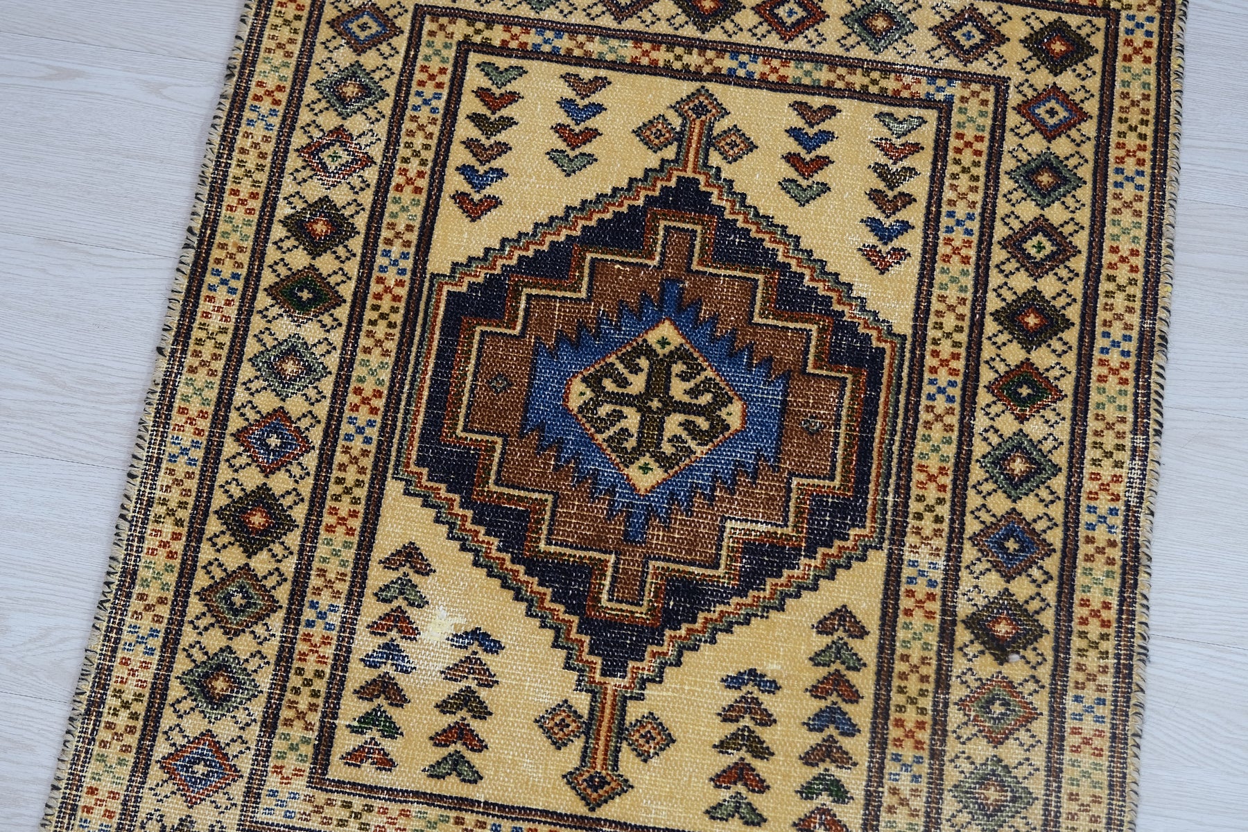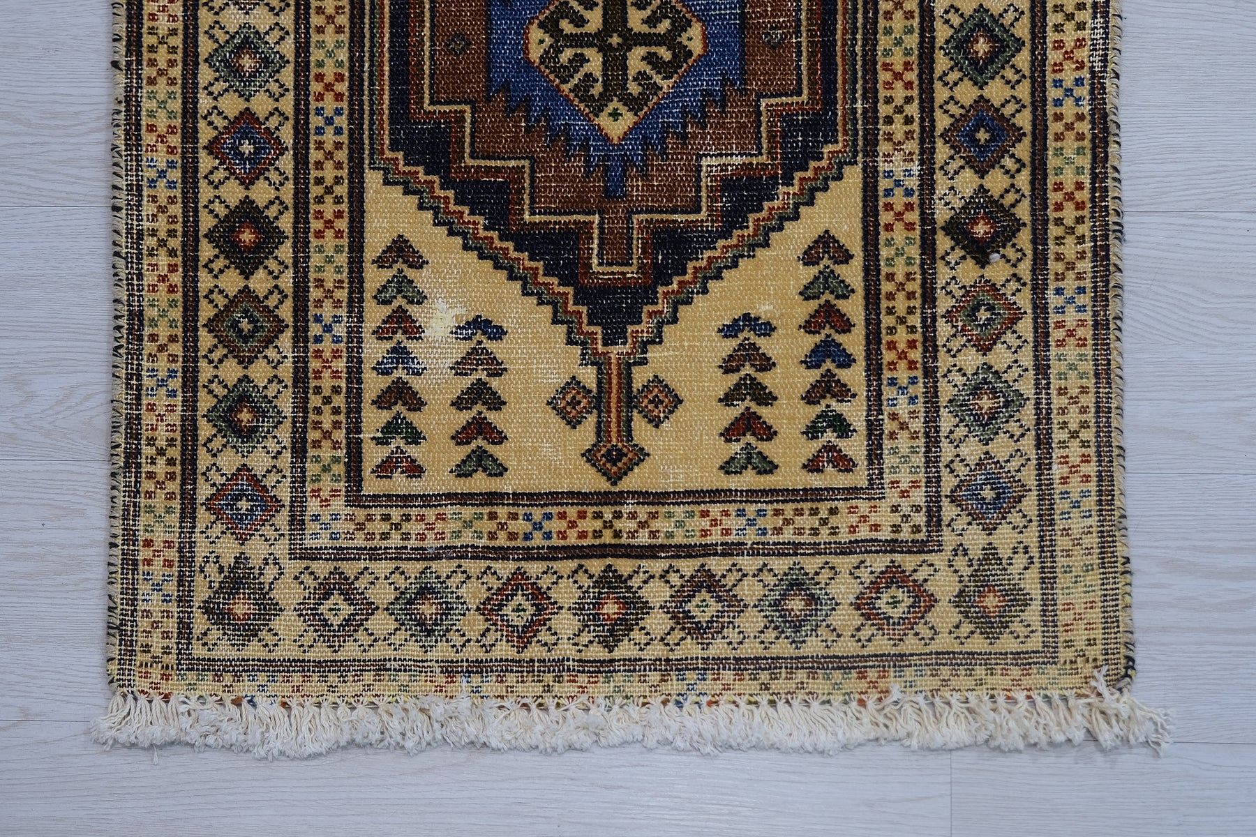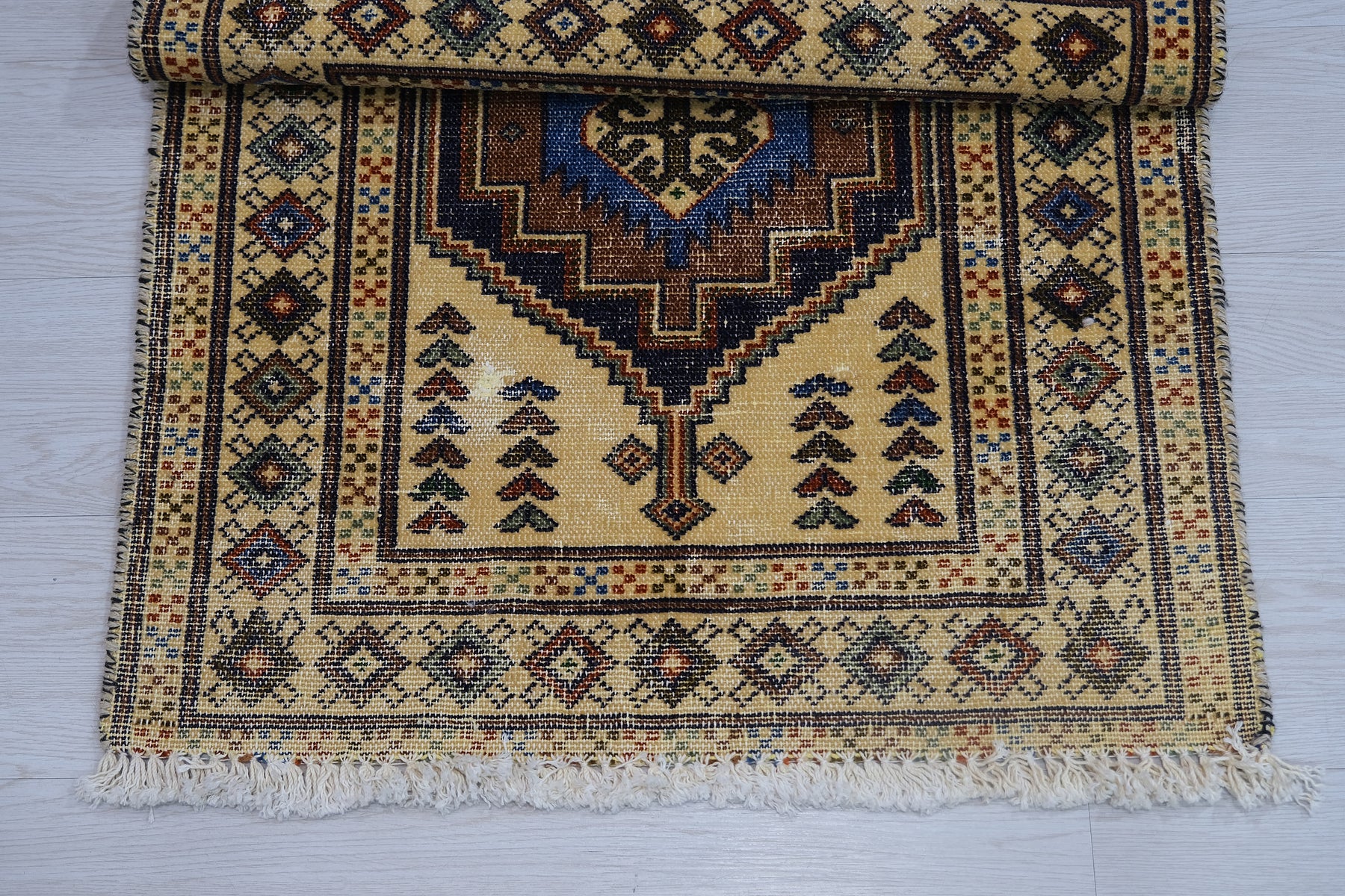 This is a hand-knotted, one-of-a-kind vintage rug. Due to the nature of this piece, there may be slight imperfections in its wear, shape, dimensions, and color. All of our rugs are professionally cleaned and repaired.