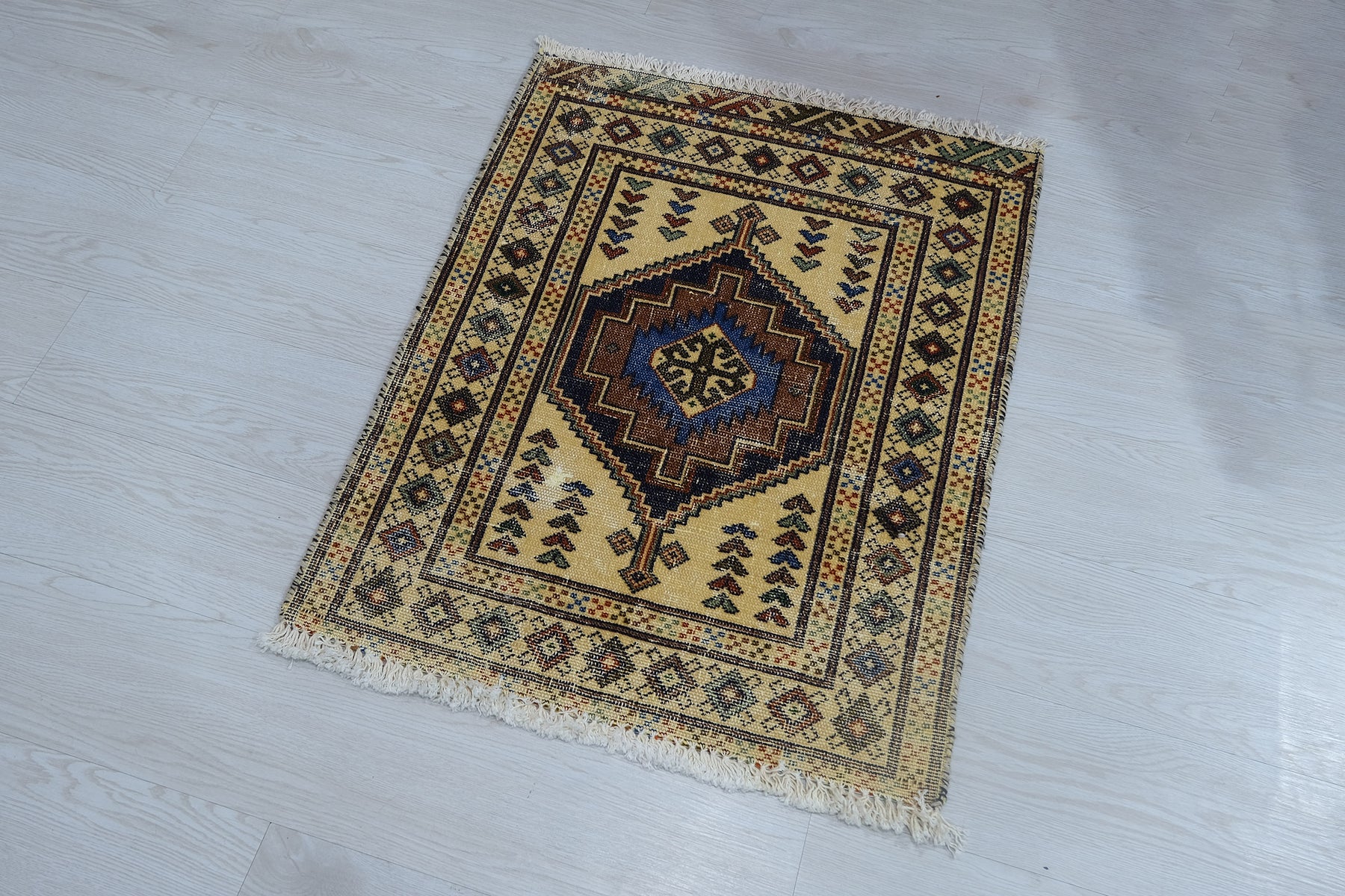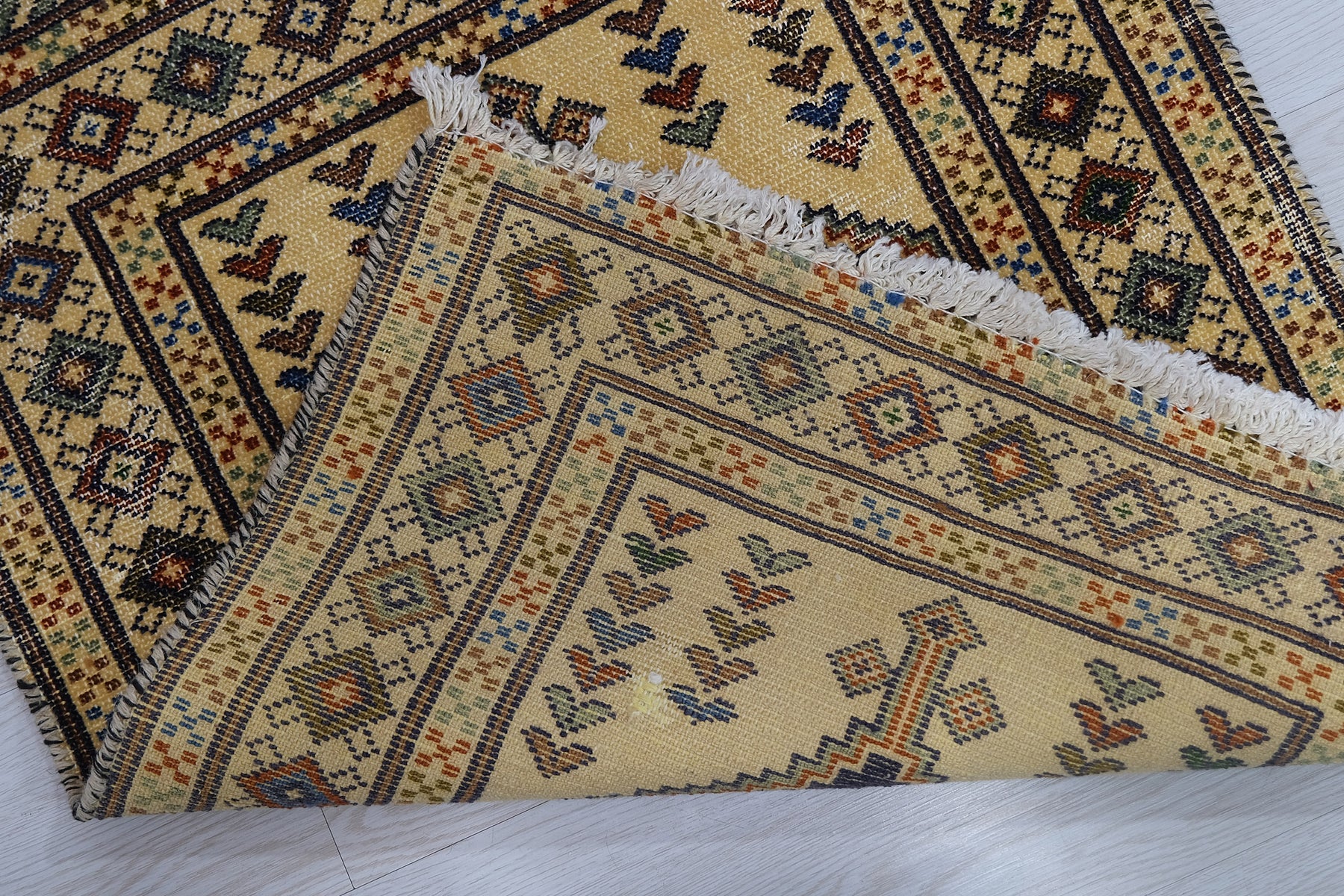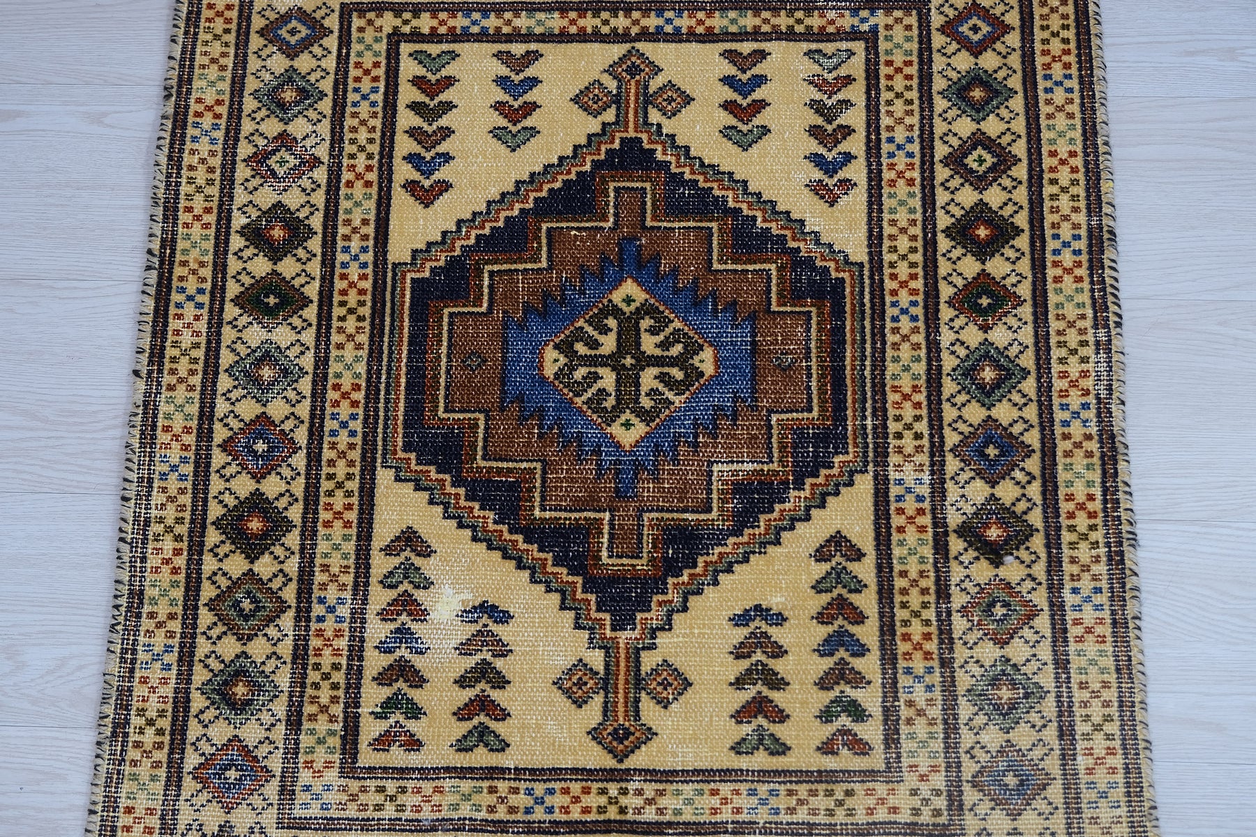 This is a hand-knotted, one-of-a-kind vintage rug. Due to the nature of this piece, there may be slight imperfections in its wear, shape, dimensions, and color. All of our rugs are professionally cleaned and repaired.