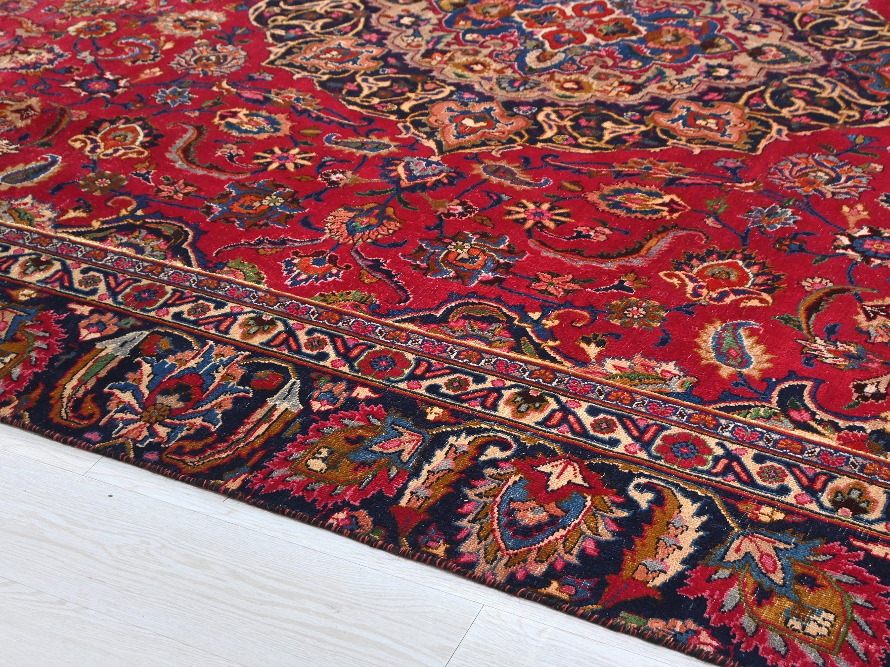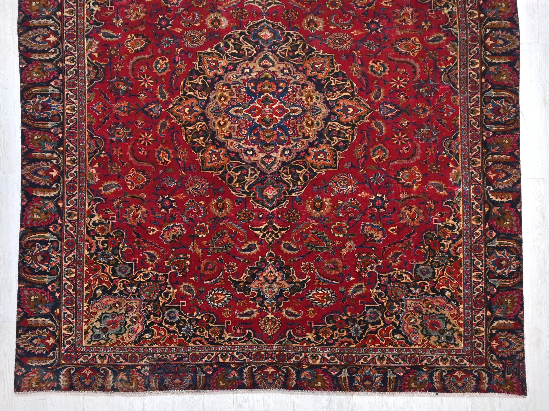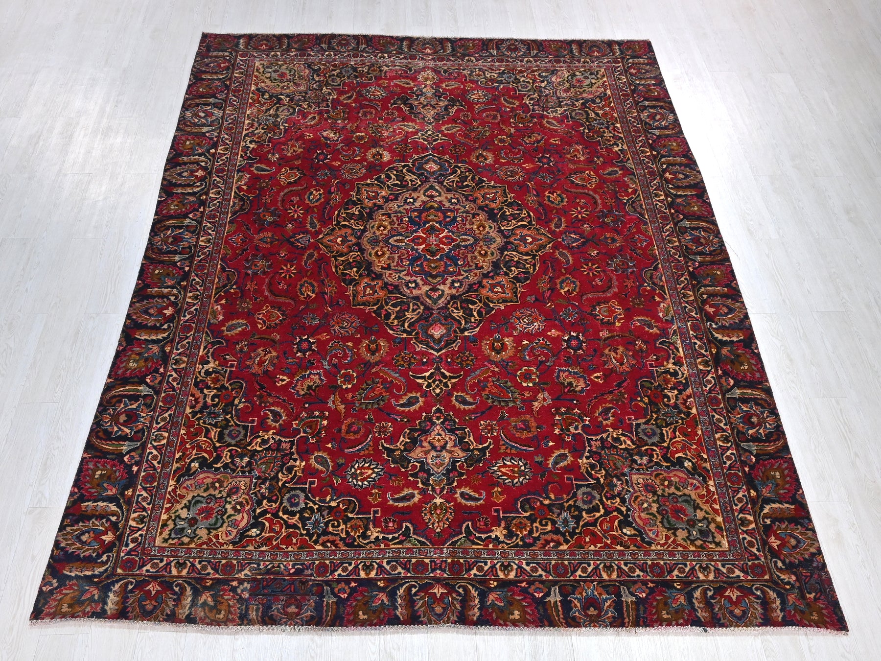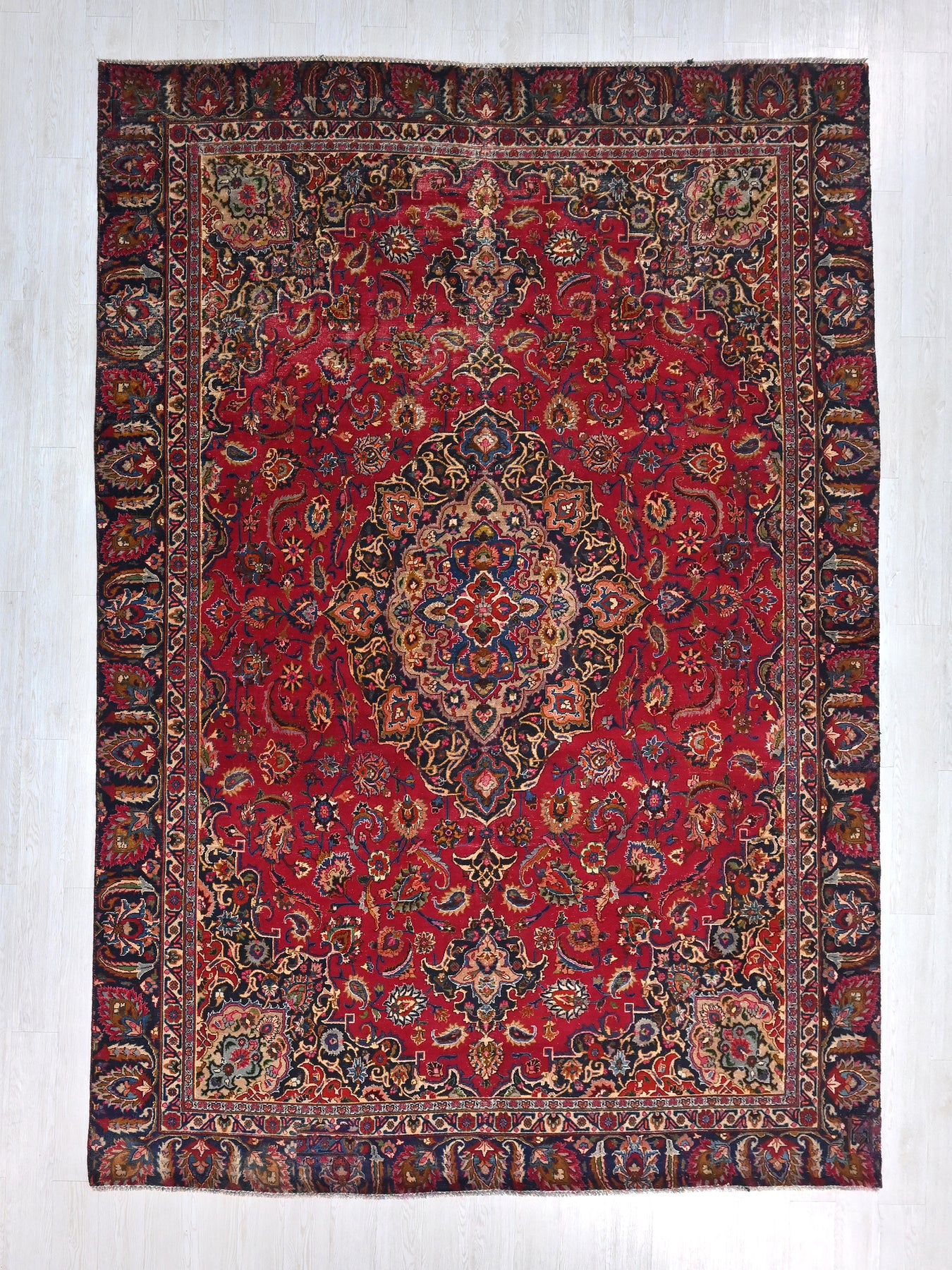 This is a hand-knotted, one-of-a-kind vintage rug. Due to the nature of this piece, there may be slight imperfections in its wear, shape, dimensions, and color. All of our rugs are professionally cleaned and repaired.