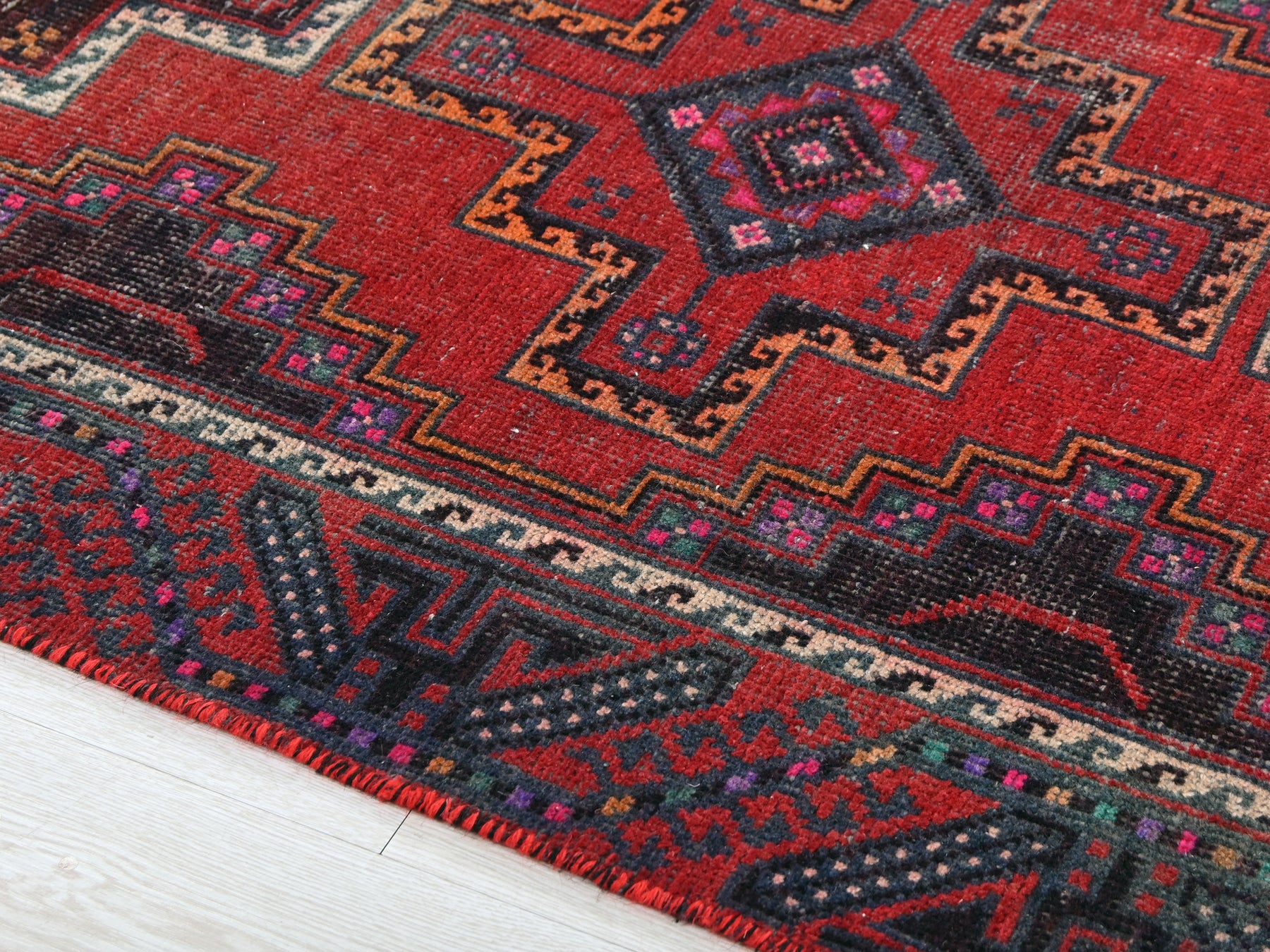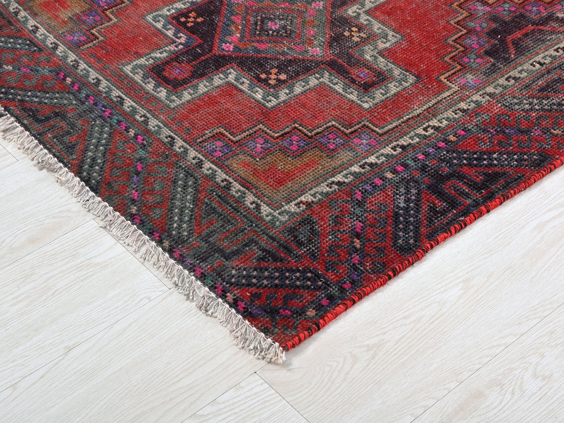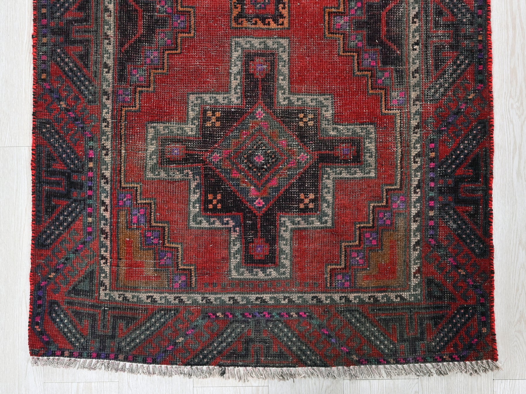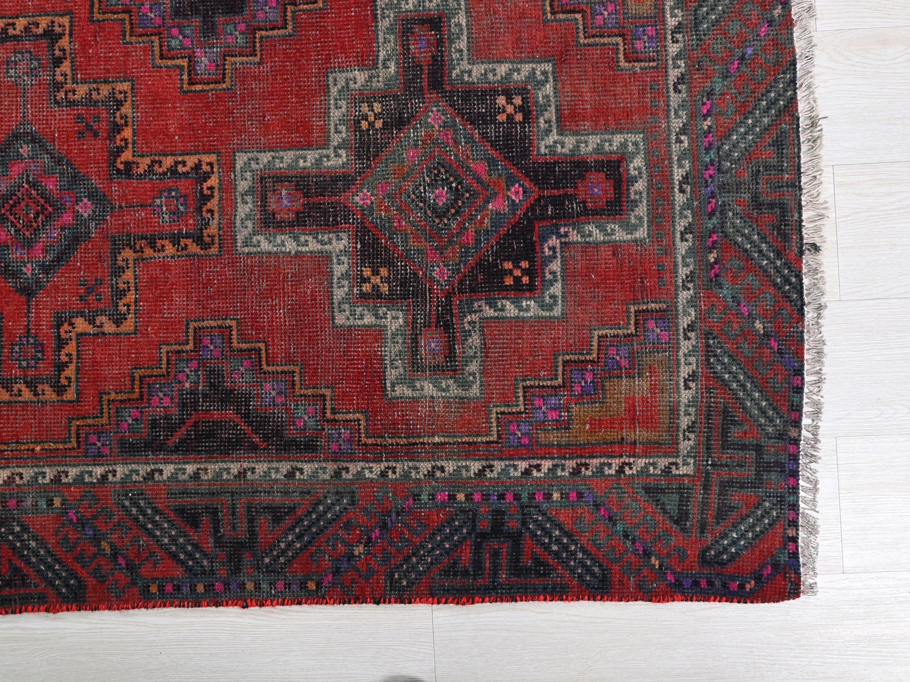 This is a hand-knotted, one-of-a-kind vintage rug. Due to the nature of this piece, there may be slight imperfections in its wear, shape, dimensions, and color. All of our rugs are professionally cleaned and repaired.