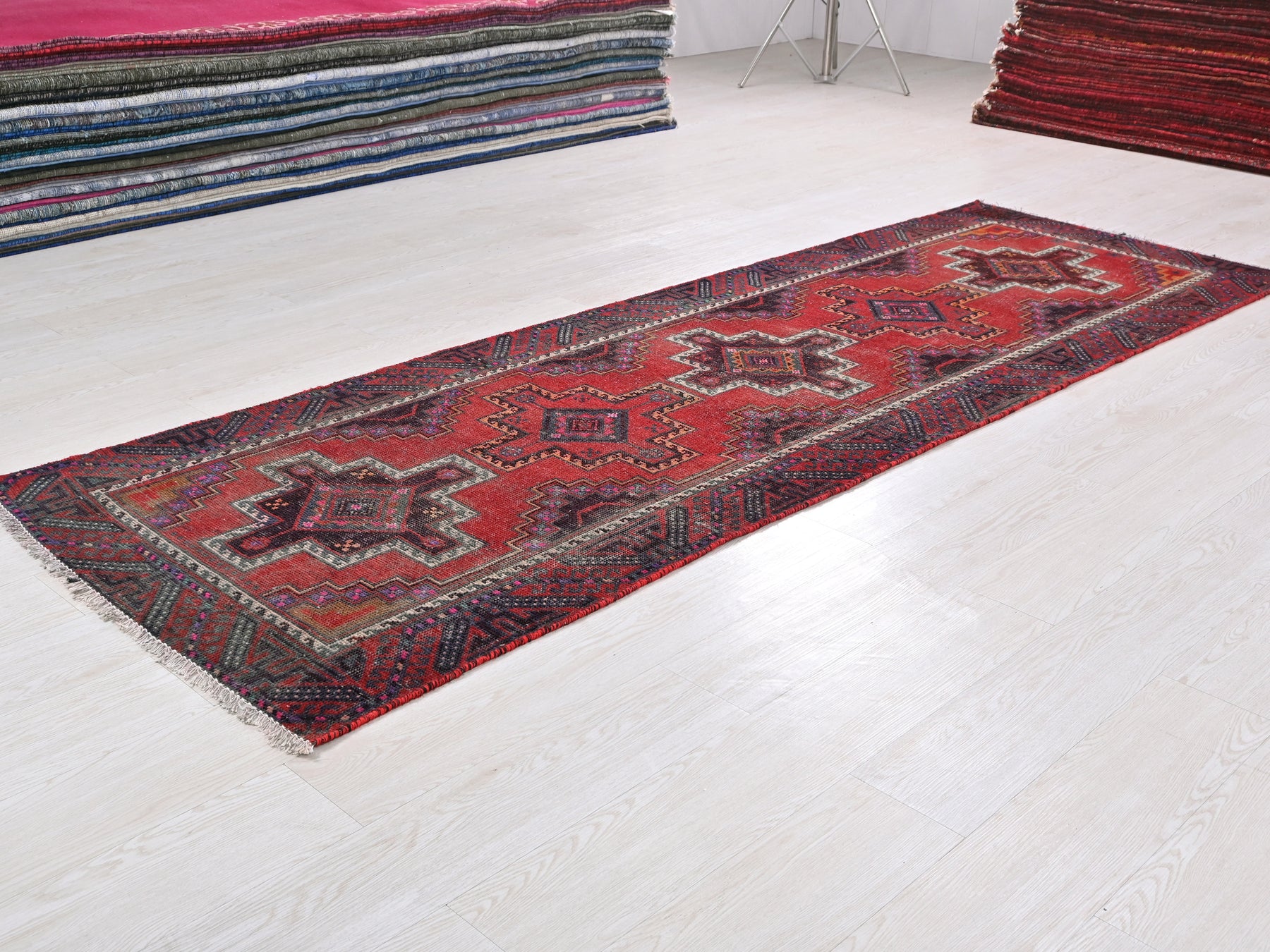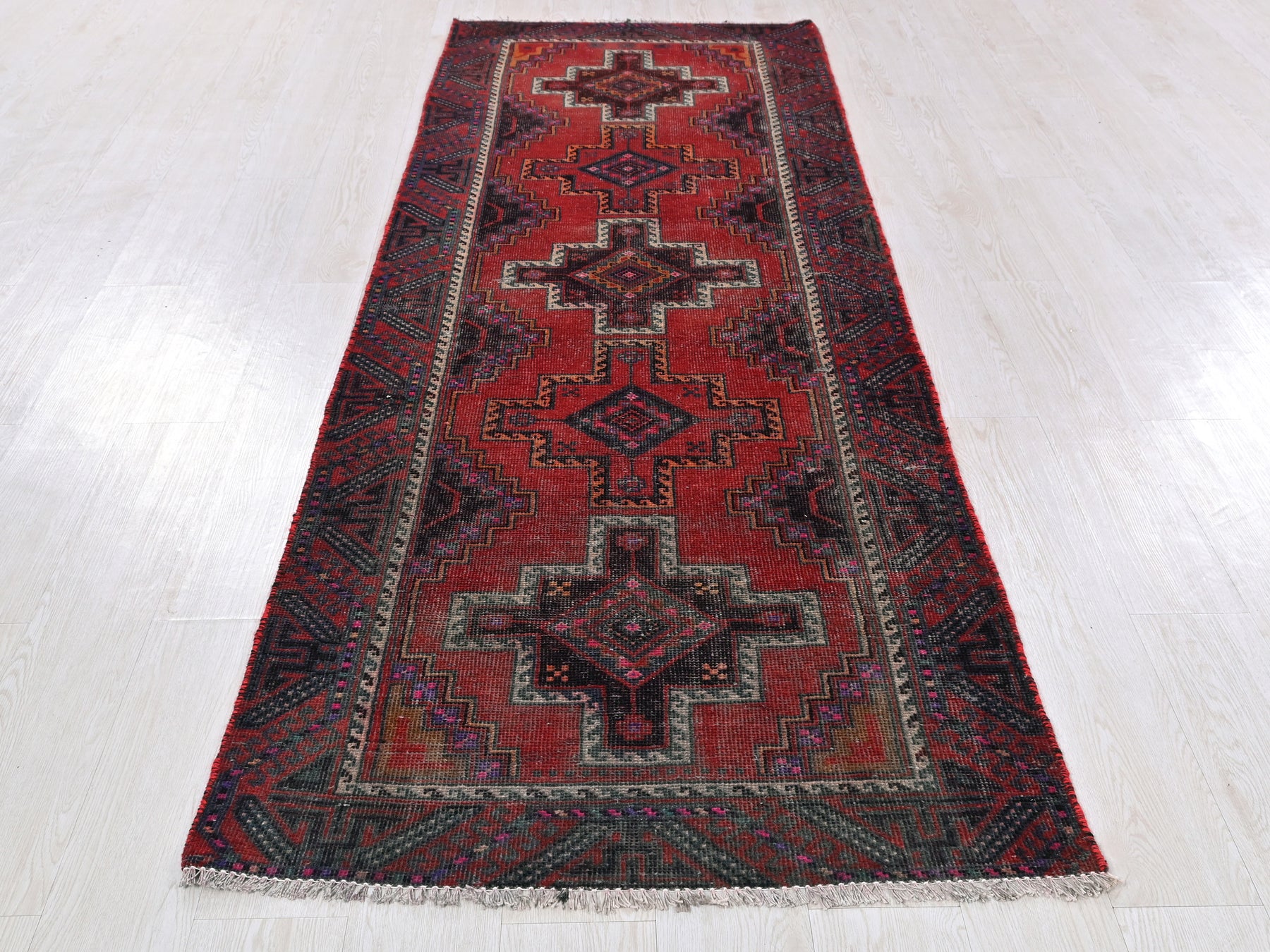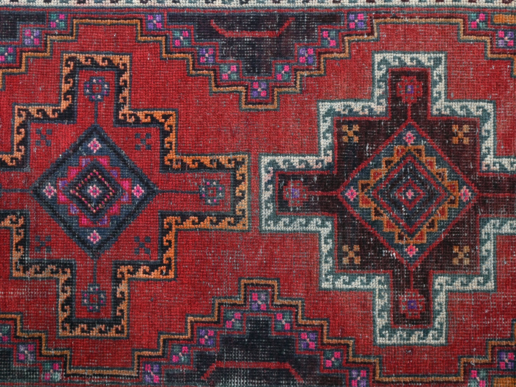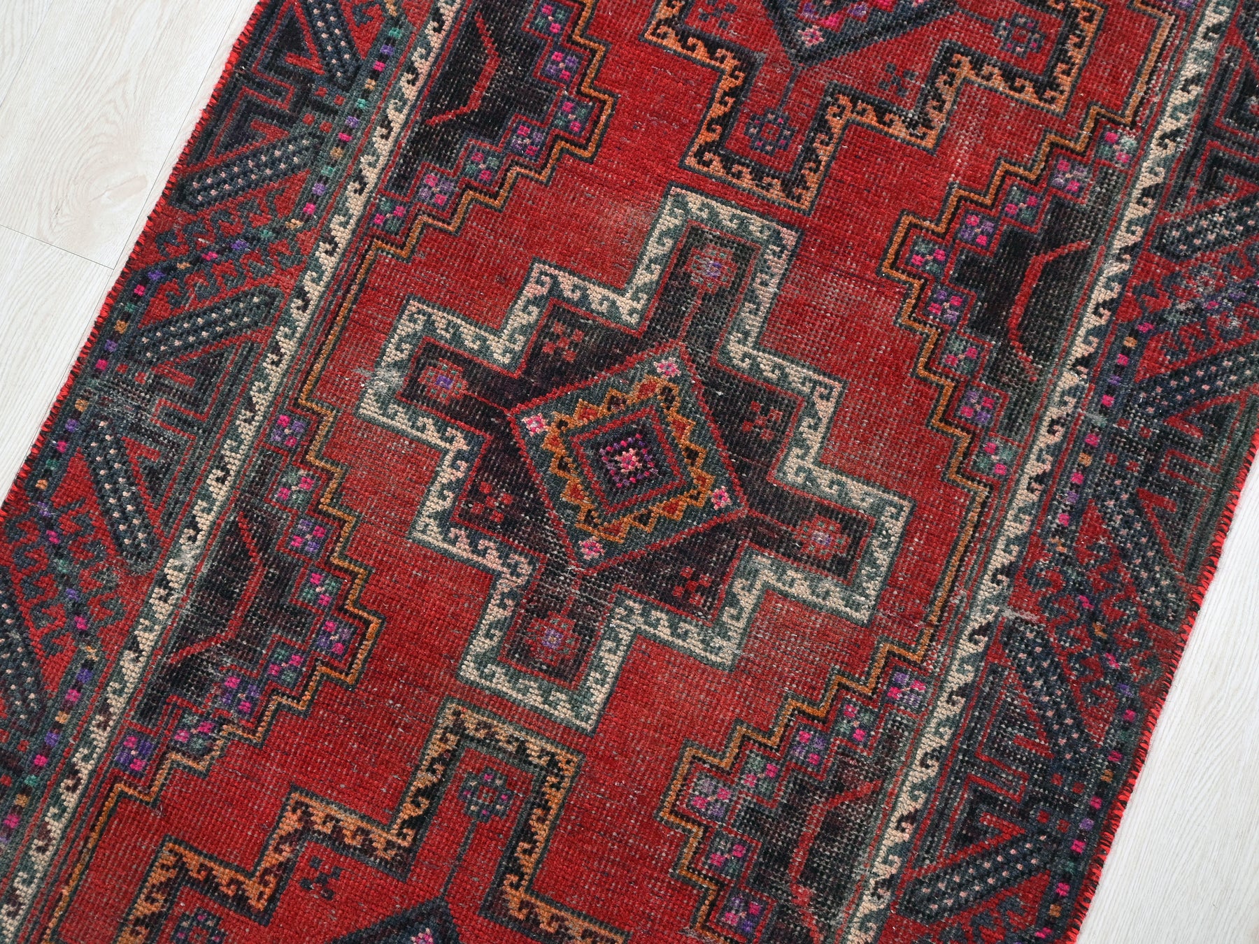 This is a hand-knotted, one-of-a-kind vintage rug. Due to the nature of this piece, there may be slight imperfections in its wear, shape, dimensions, and color. All of our rugs are professionally cleaned and repaired.