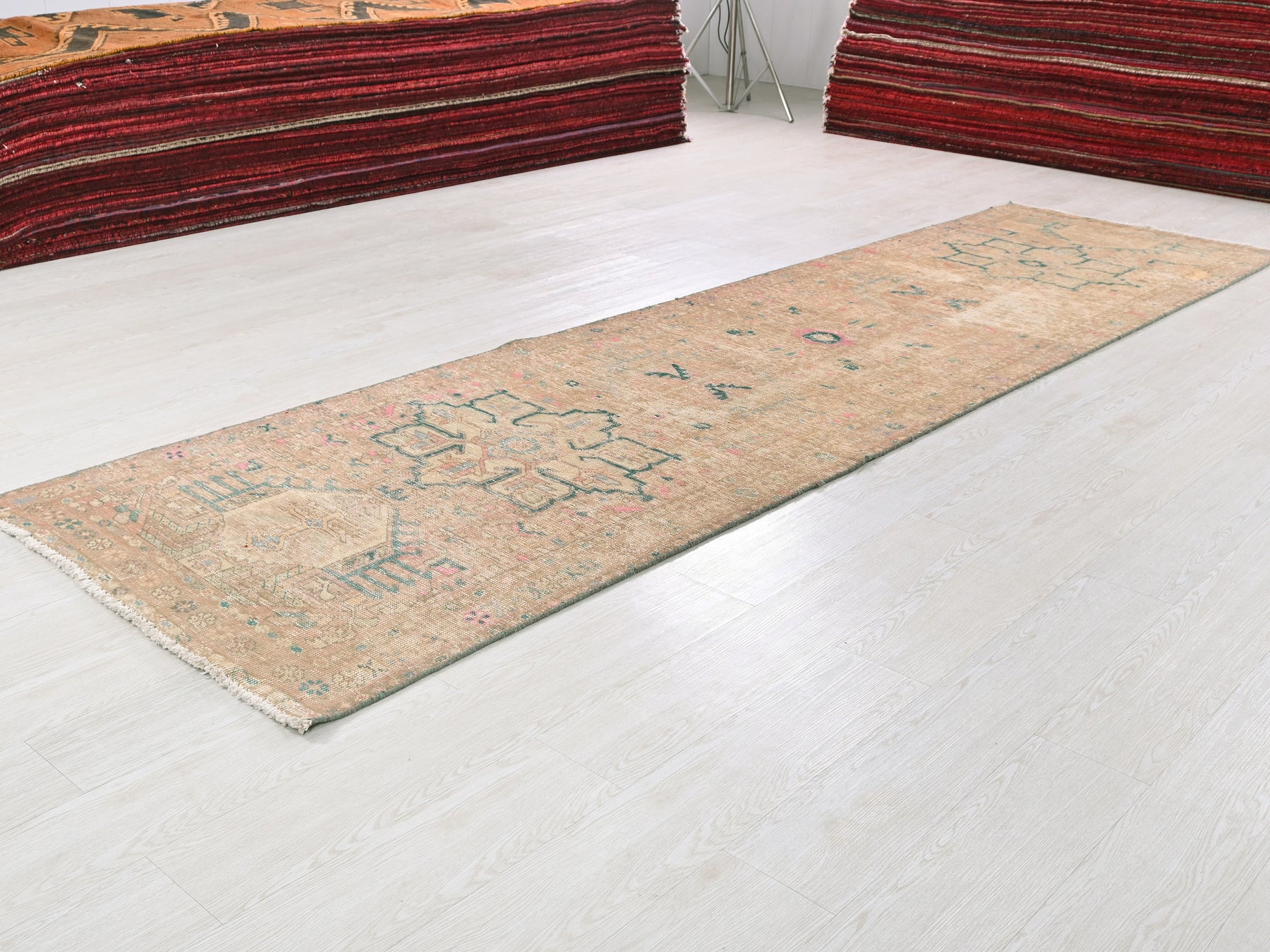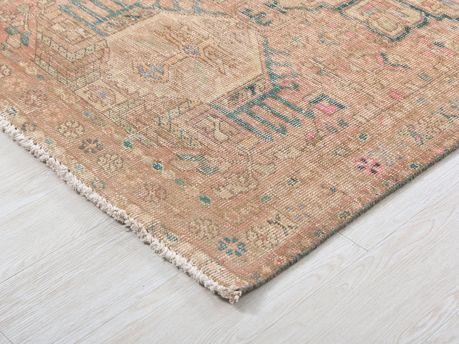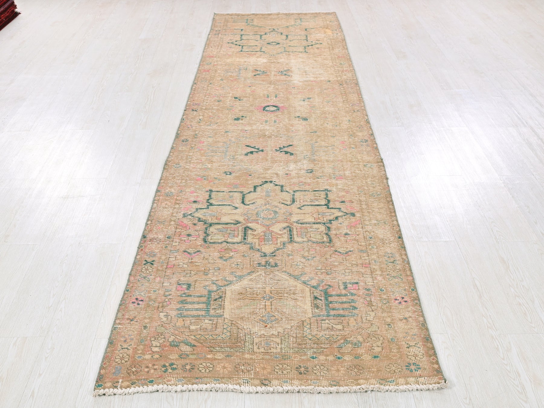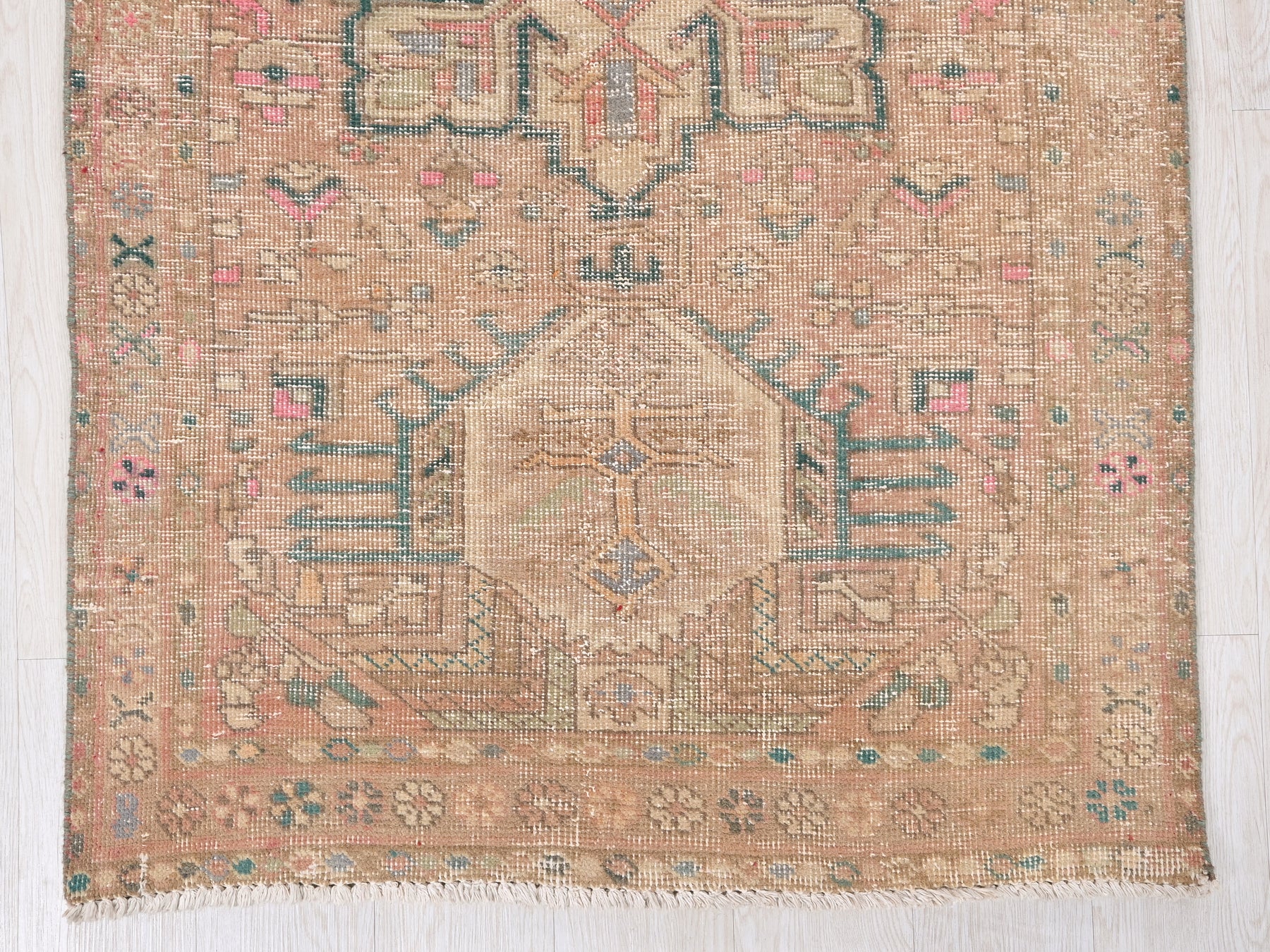 This is a hand-knotted, one-of-a-kind vintage rug. Due to the nature of this piece, there may be slight imperfections in its wear, shape, dimensions, and color. All of our rugs are professionally cleaned and repaired.