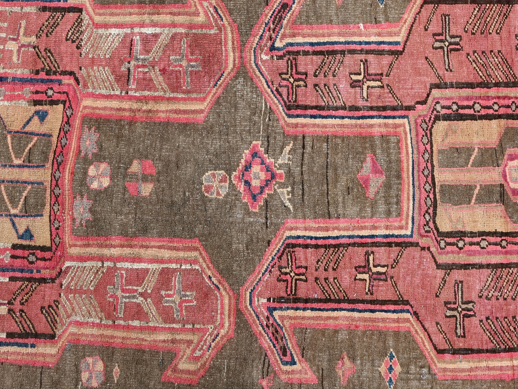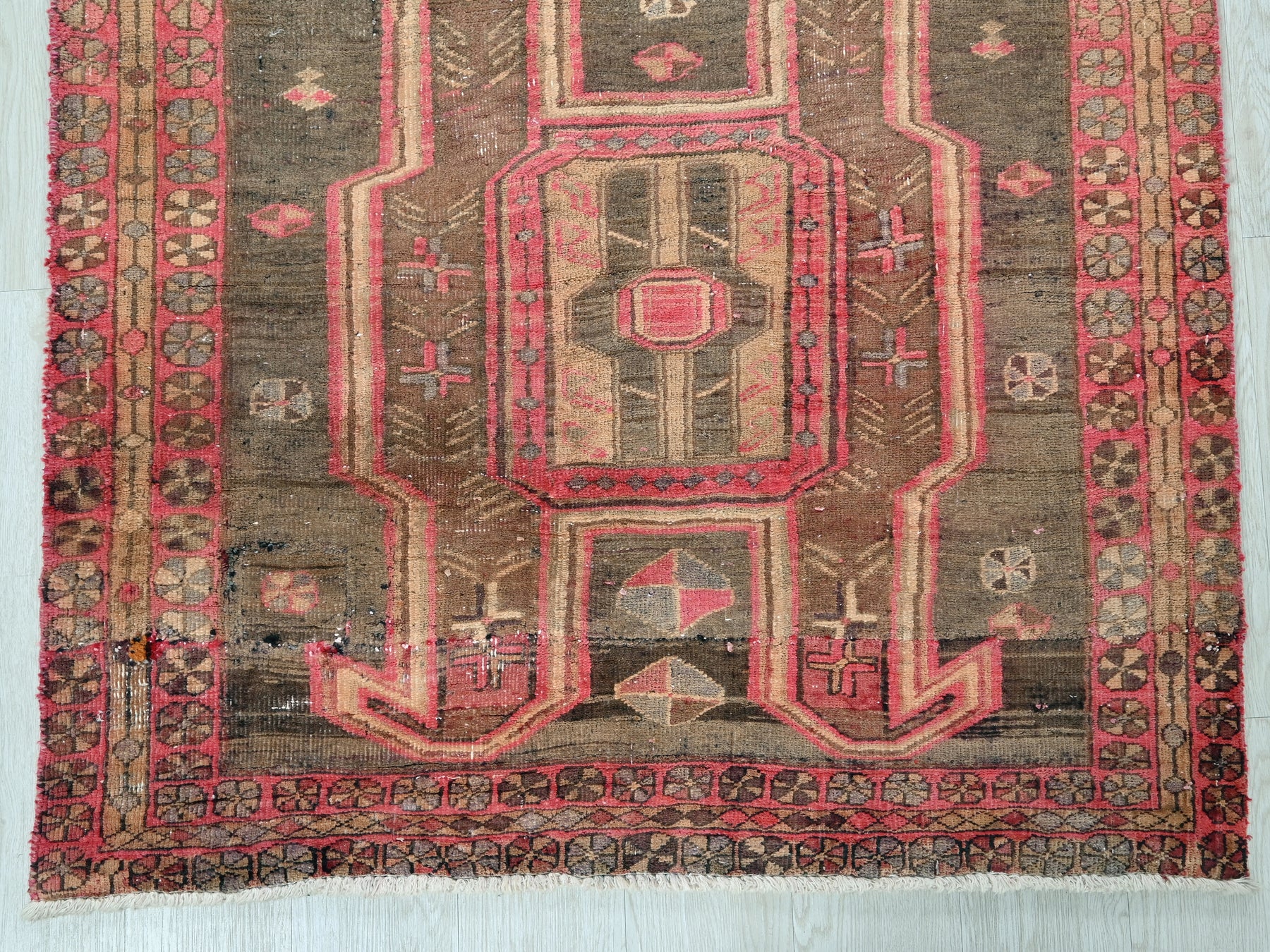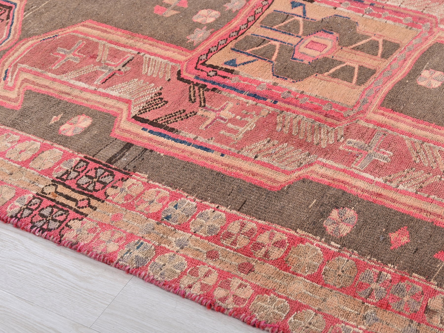 This is a hand-knotted, one-of-a-kind vintage rug. Due to the nature of this piece, there may be slight imperfections in its wear, shape, dimensions, and color. All of our rugs are professionally cleaned and repaired.