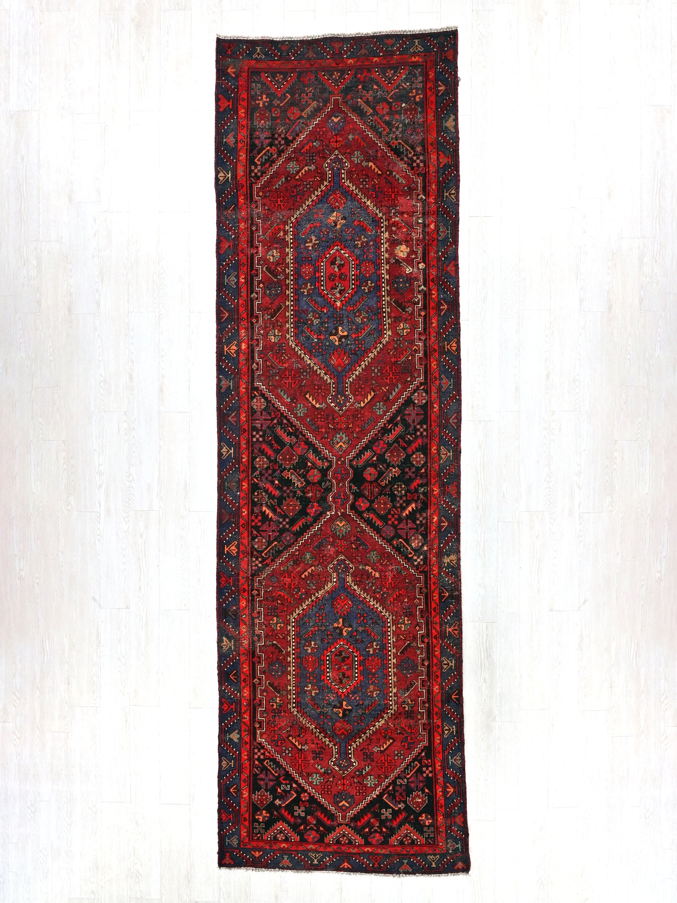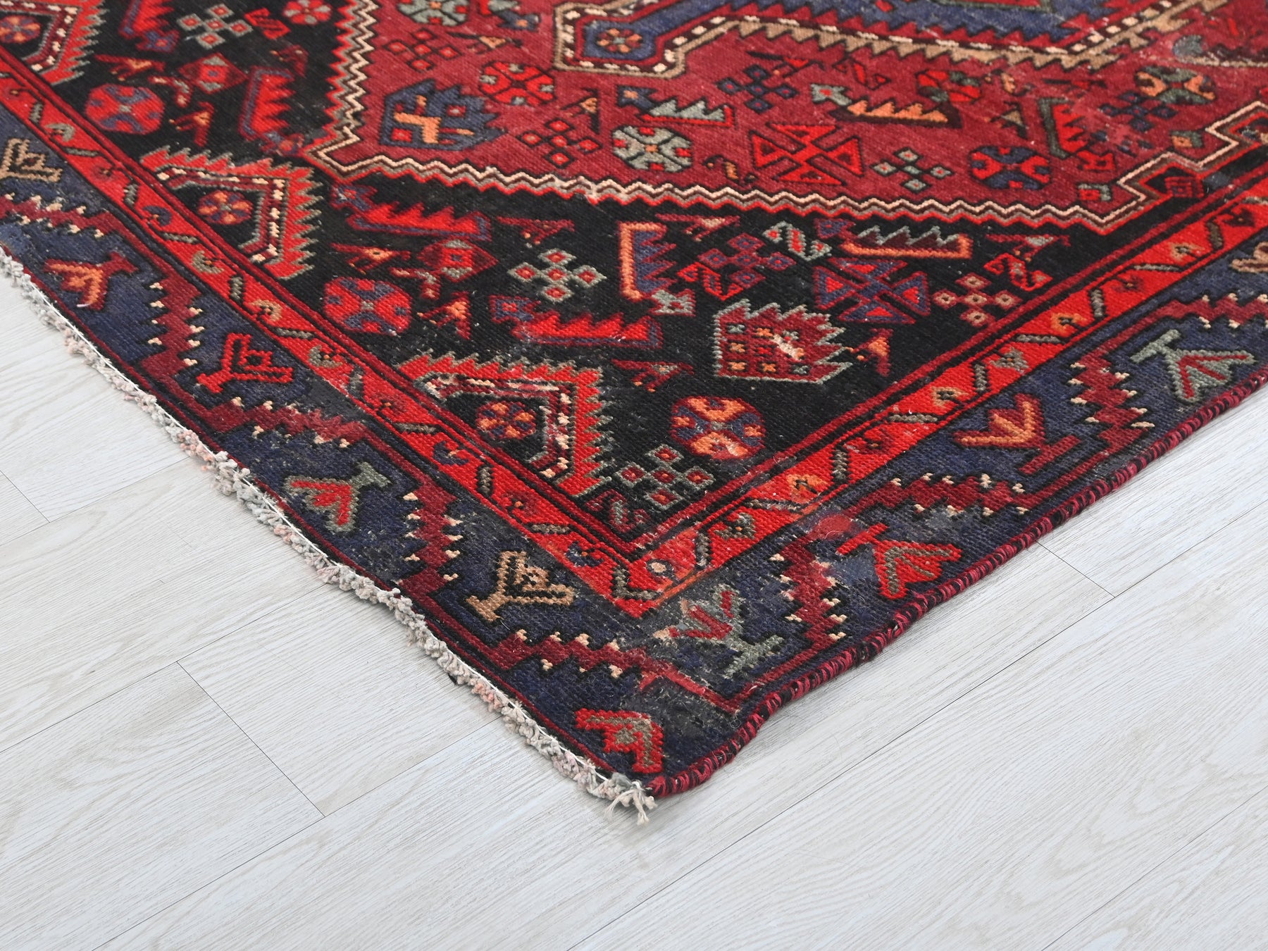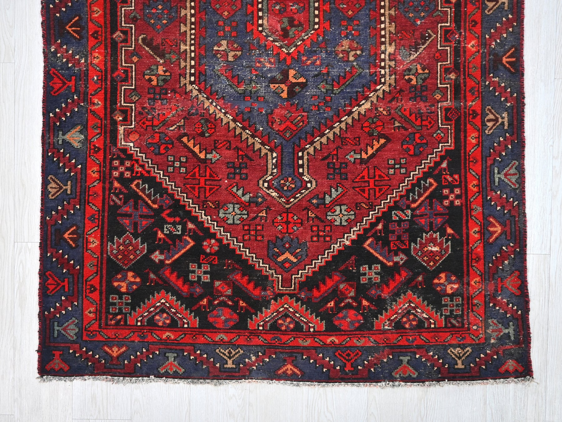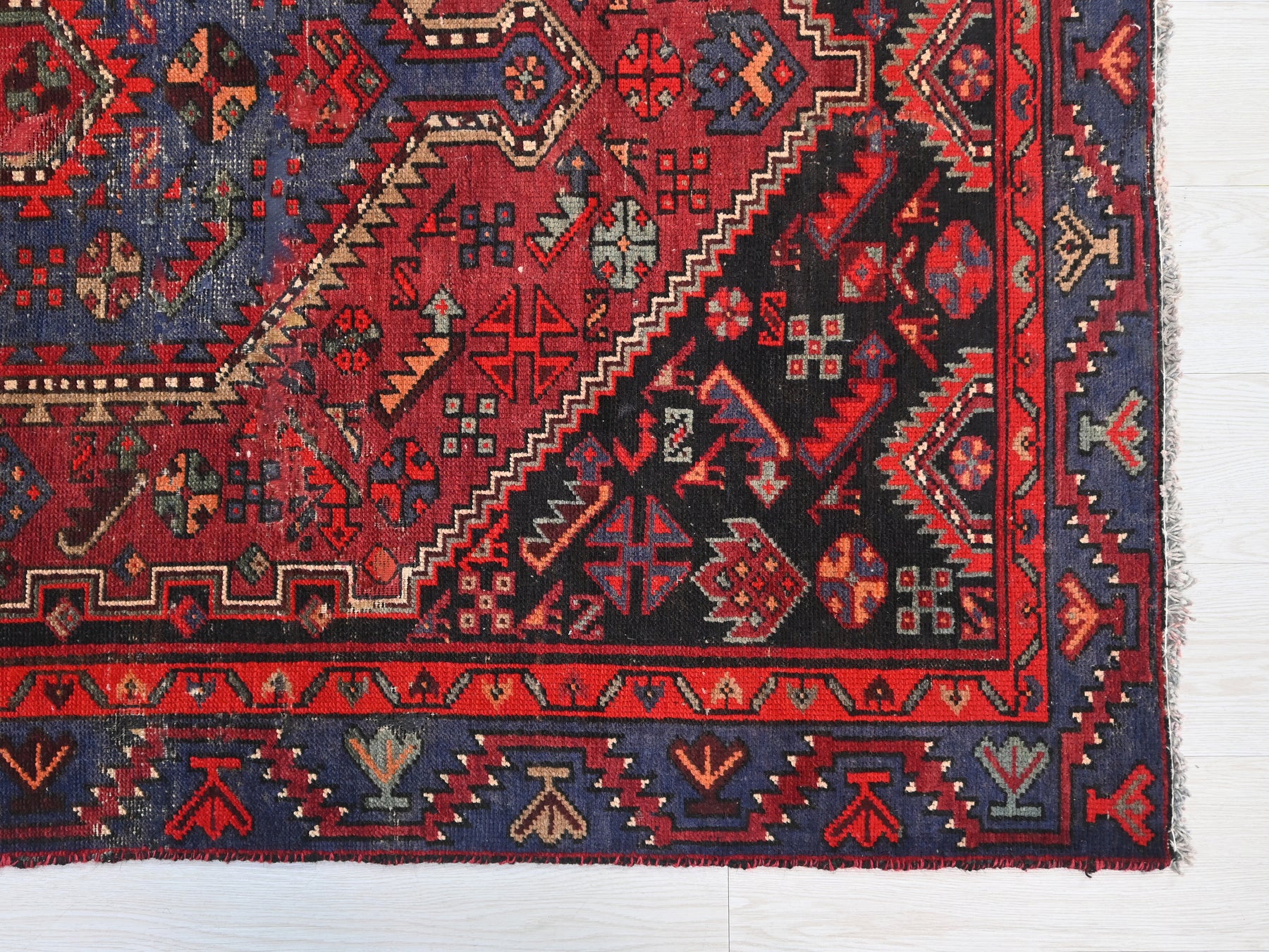 This is a hand-knotted, one-of-a-kind vintage rug. Due to the nature of this piece, there may be slight imperfections in its wear, shape, dimensions, and color. All of our rugs are professionally cleaned and repaired.