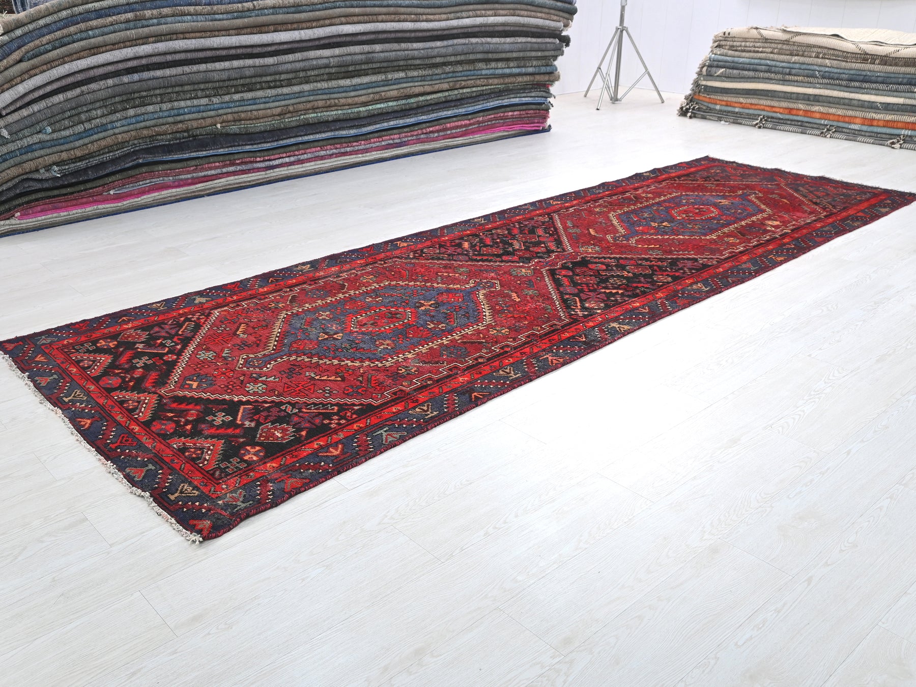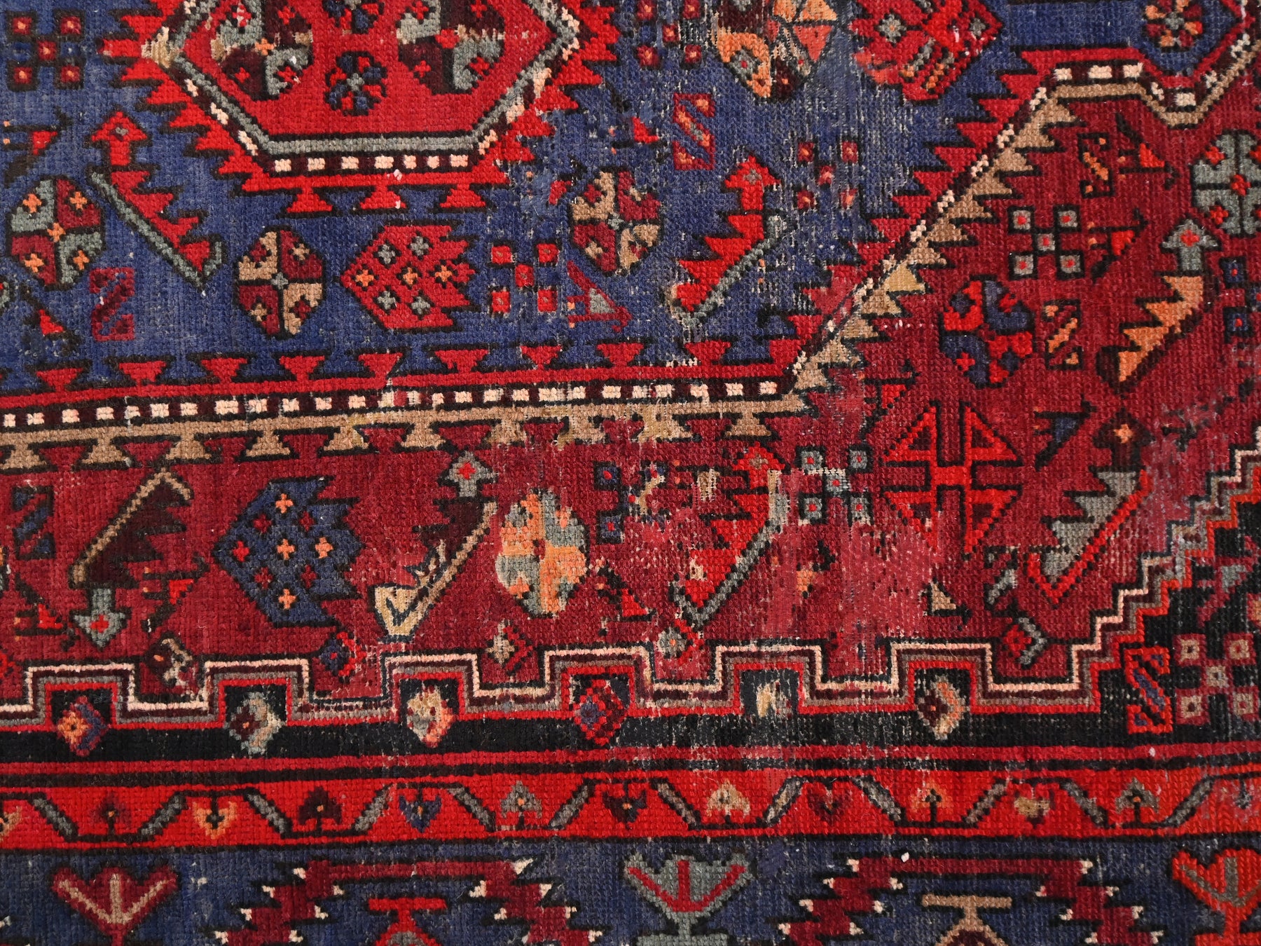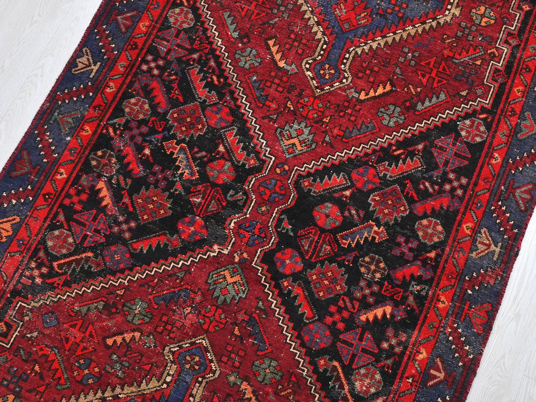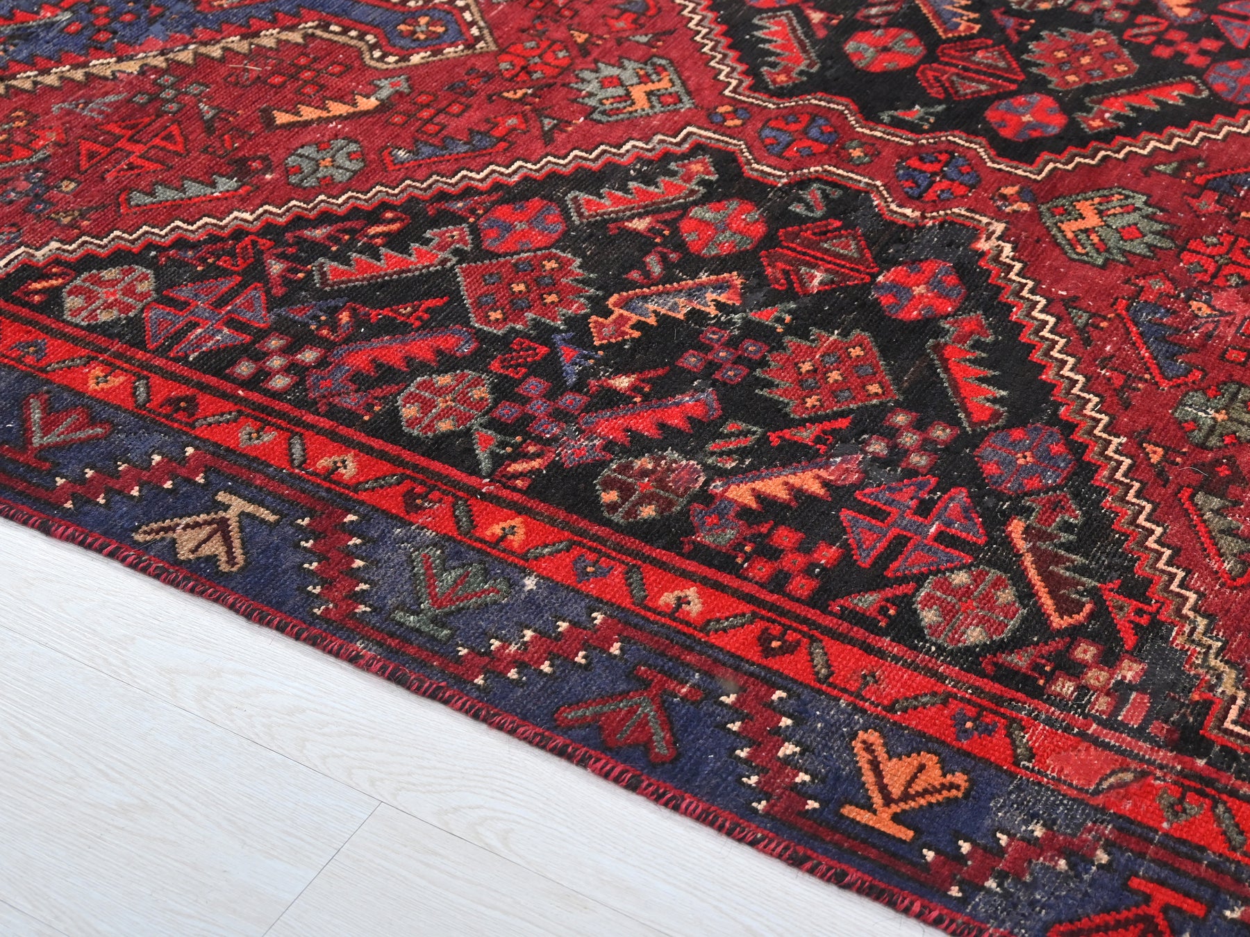 This is a hand-knotted, one-of-a-kind vintage rug. Due to the nature of this piece, there may be slight imperfections in its wear, shape, dimensions, and color. All of our rugs are professionally cleaned and repaired.
