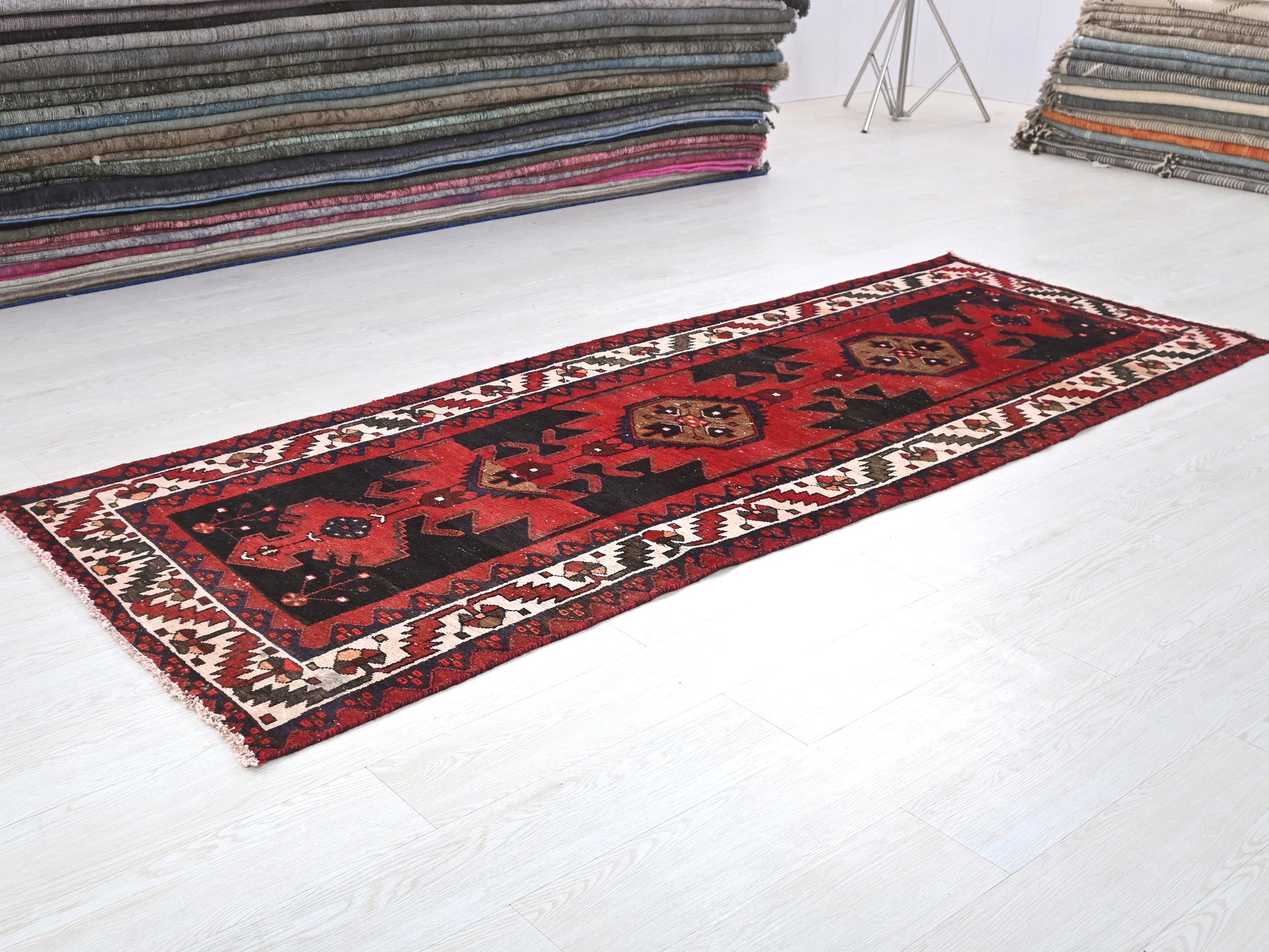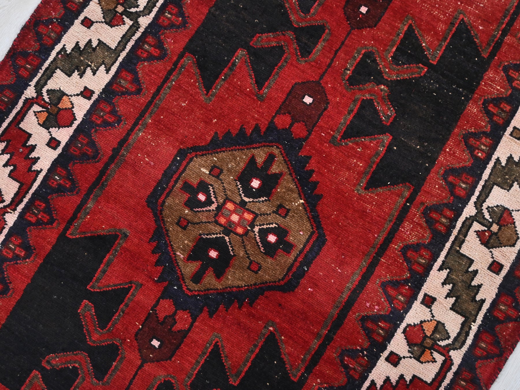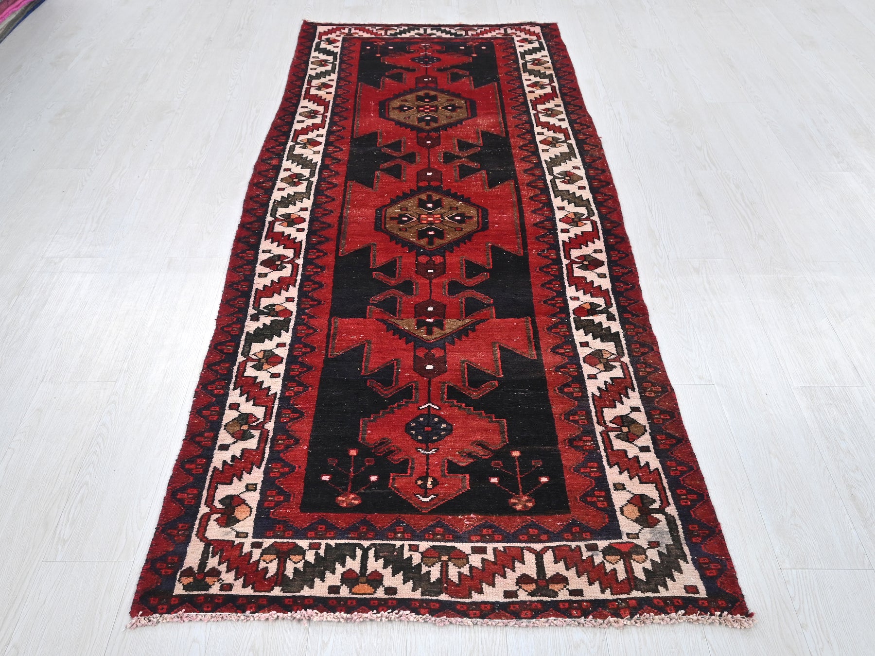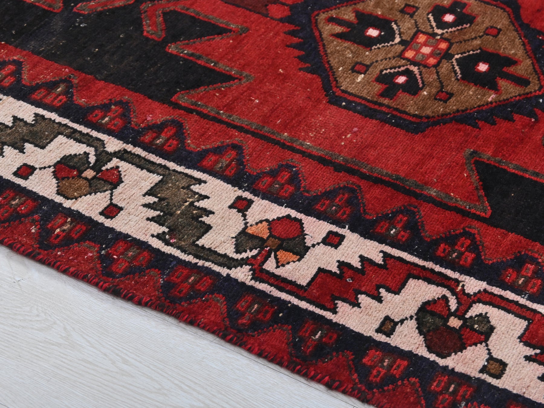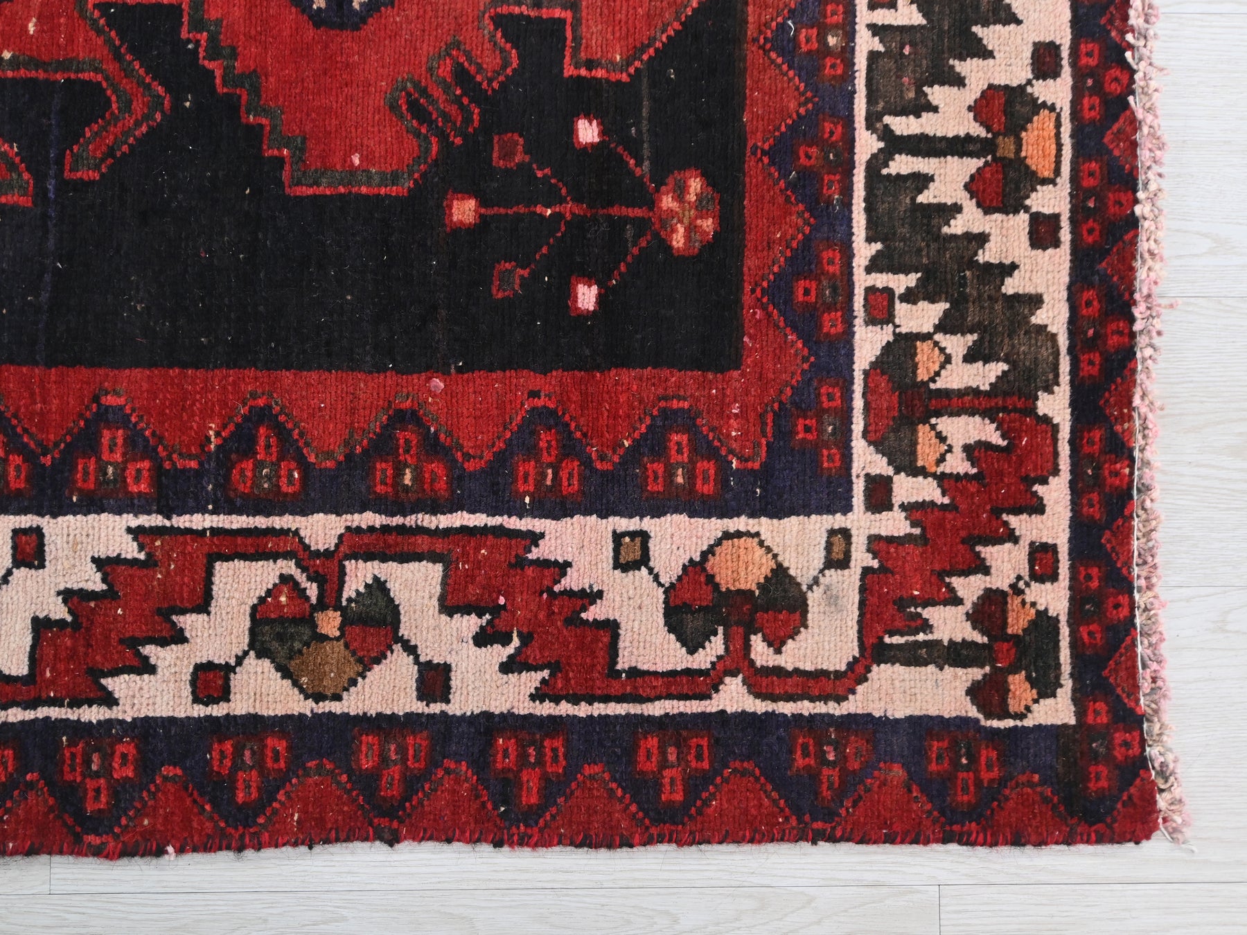This is a hand-knotted, one-of-a-kind vintage rug. Due to the nature of this piece, there may be slight imperfections in its wear, shape, dimensions, and color. All of our rugs are professionally cleaned and repaired.
