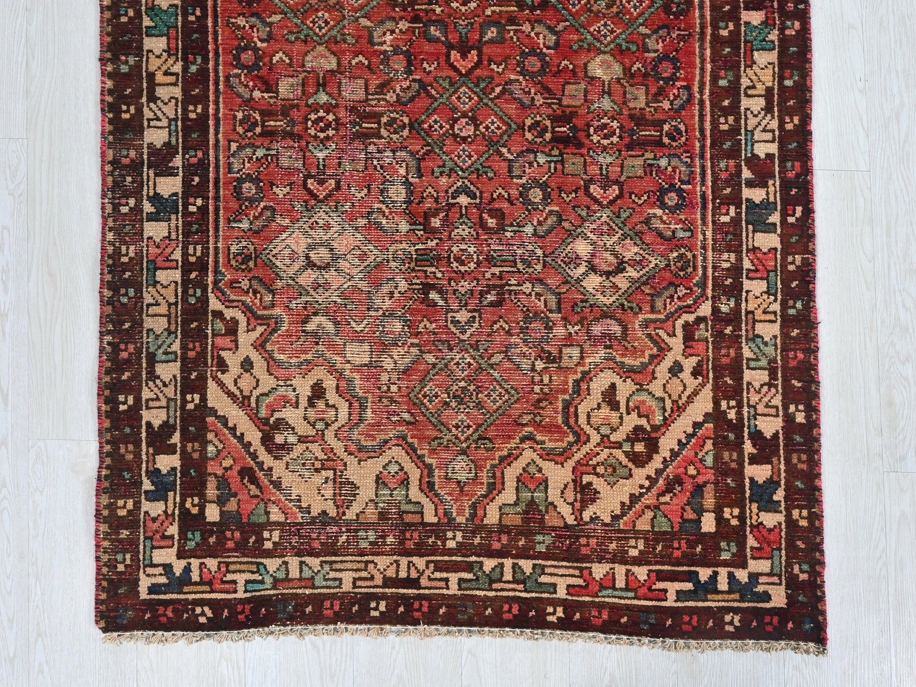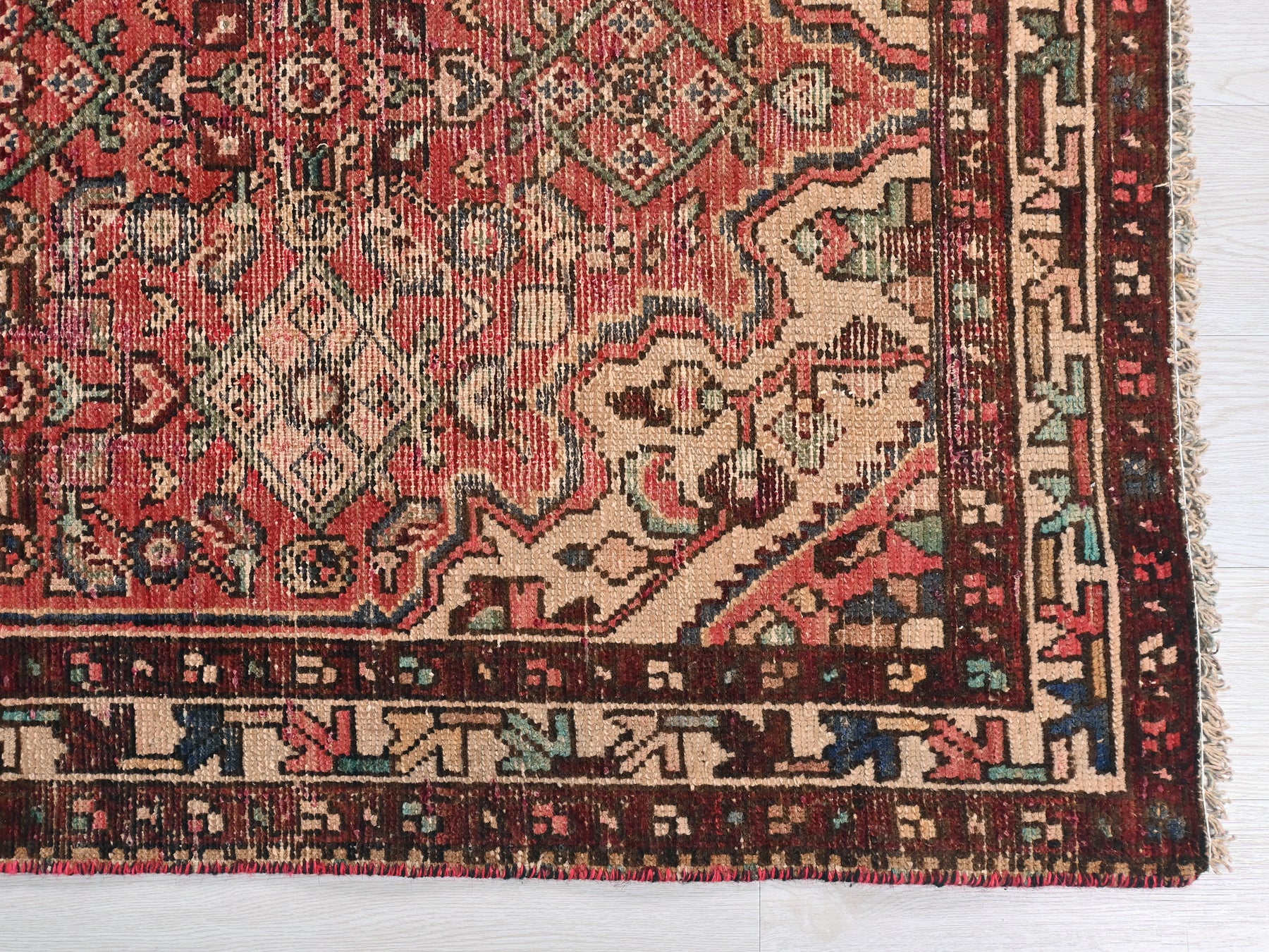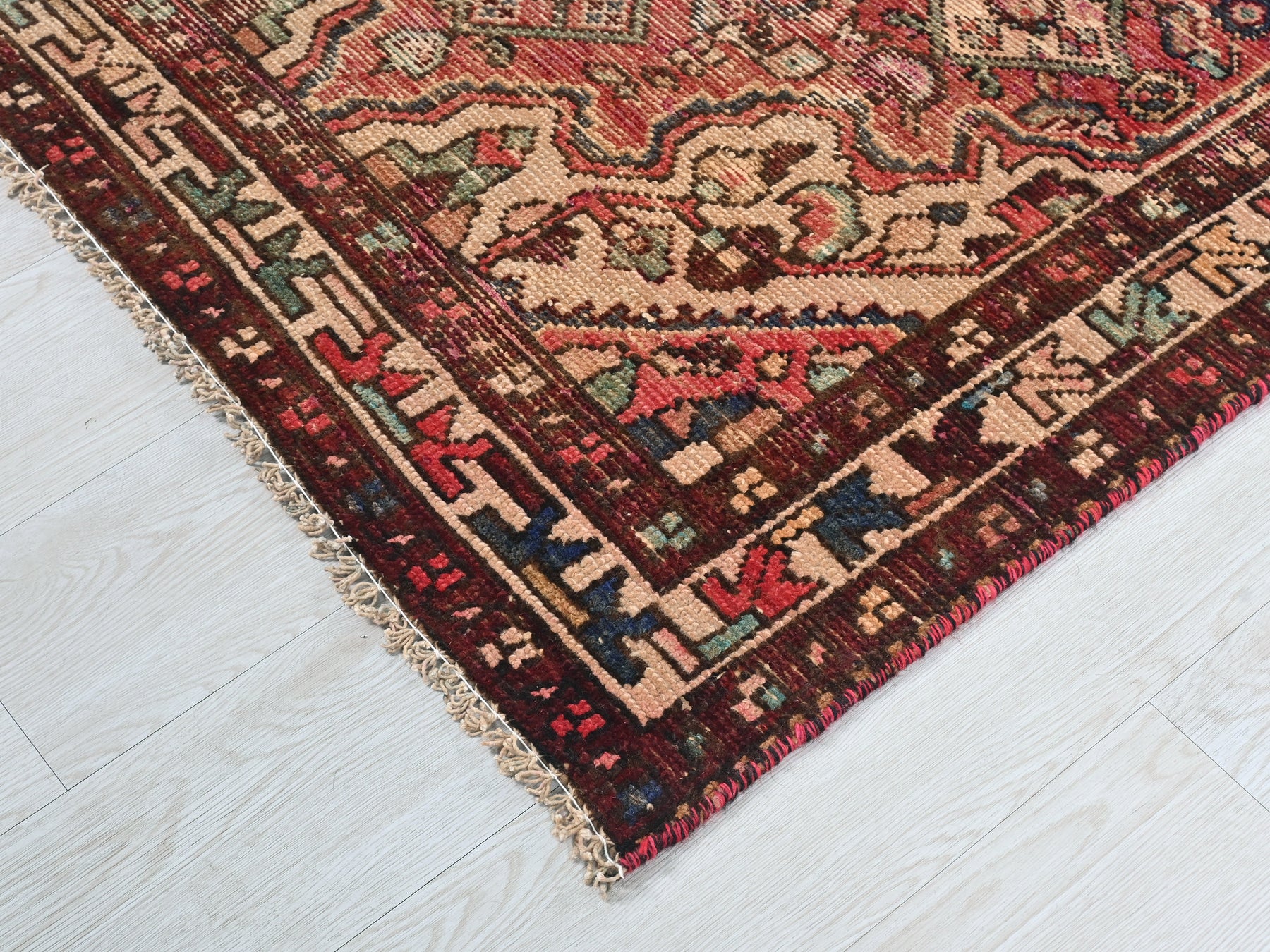 This is a hand-knotted, one-of-a-kind vintage rug. Due to the nature of this piece, there may be slight imperfections in its wear, shape, dimensions, and color. All of our rugs are professionally cleaned and repaired.