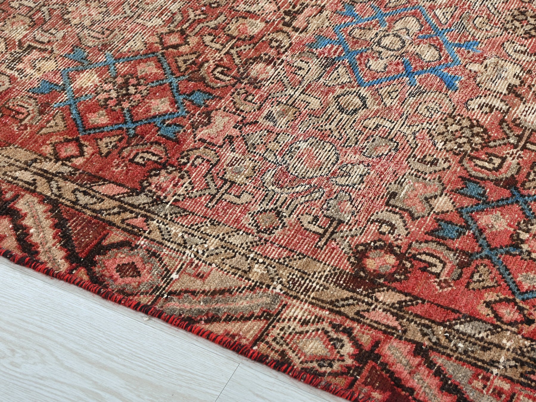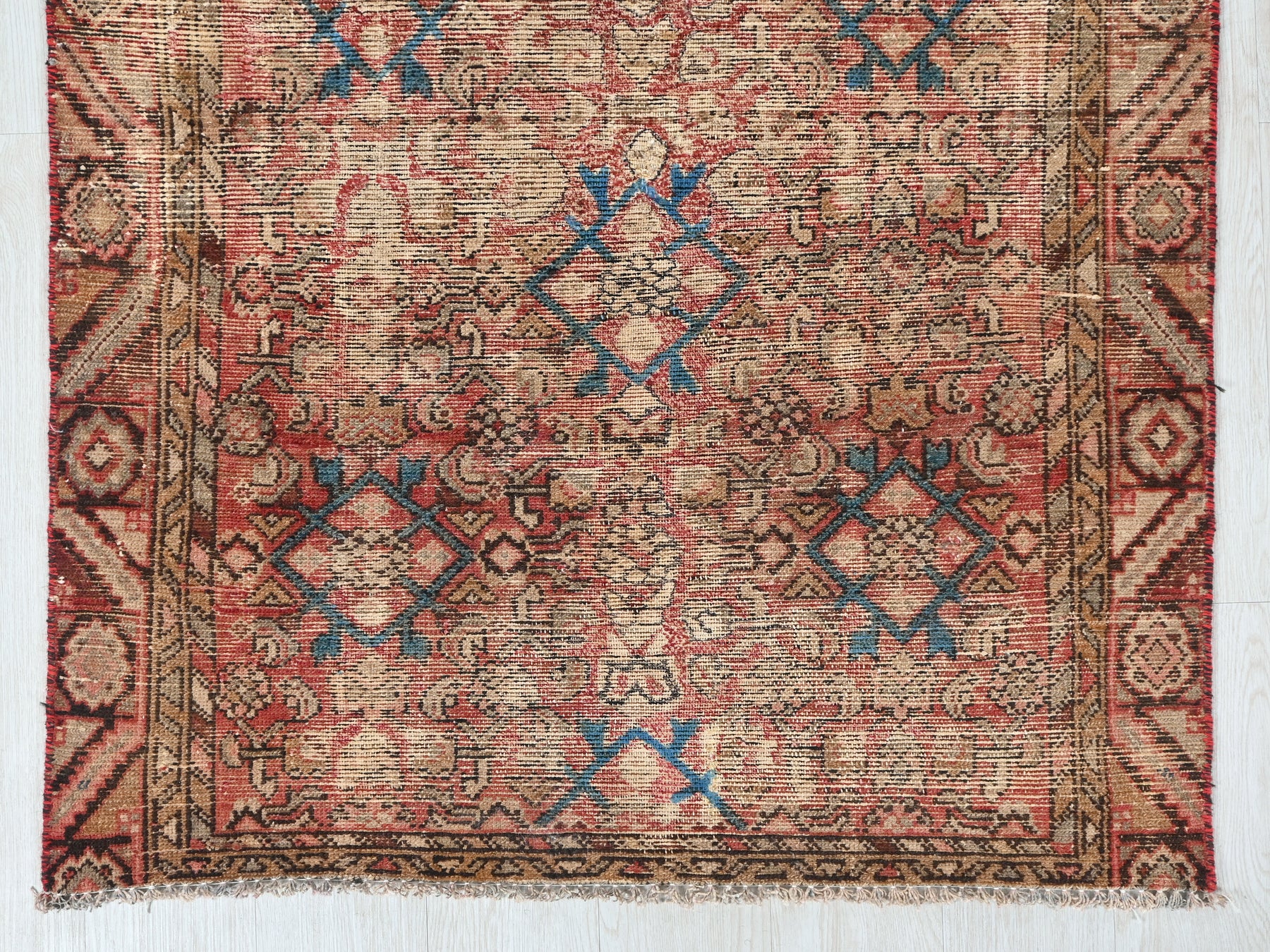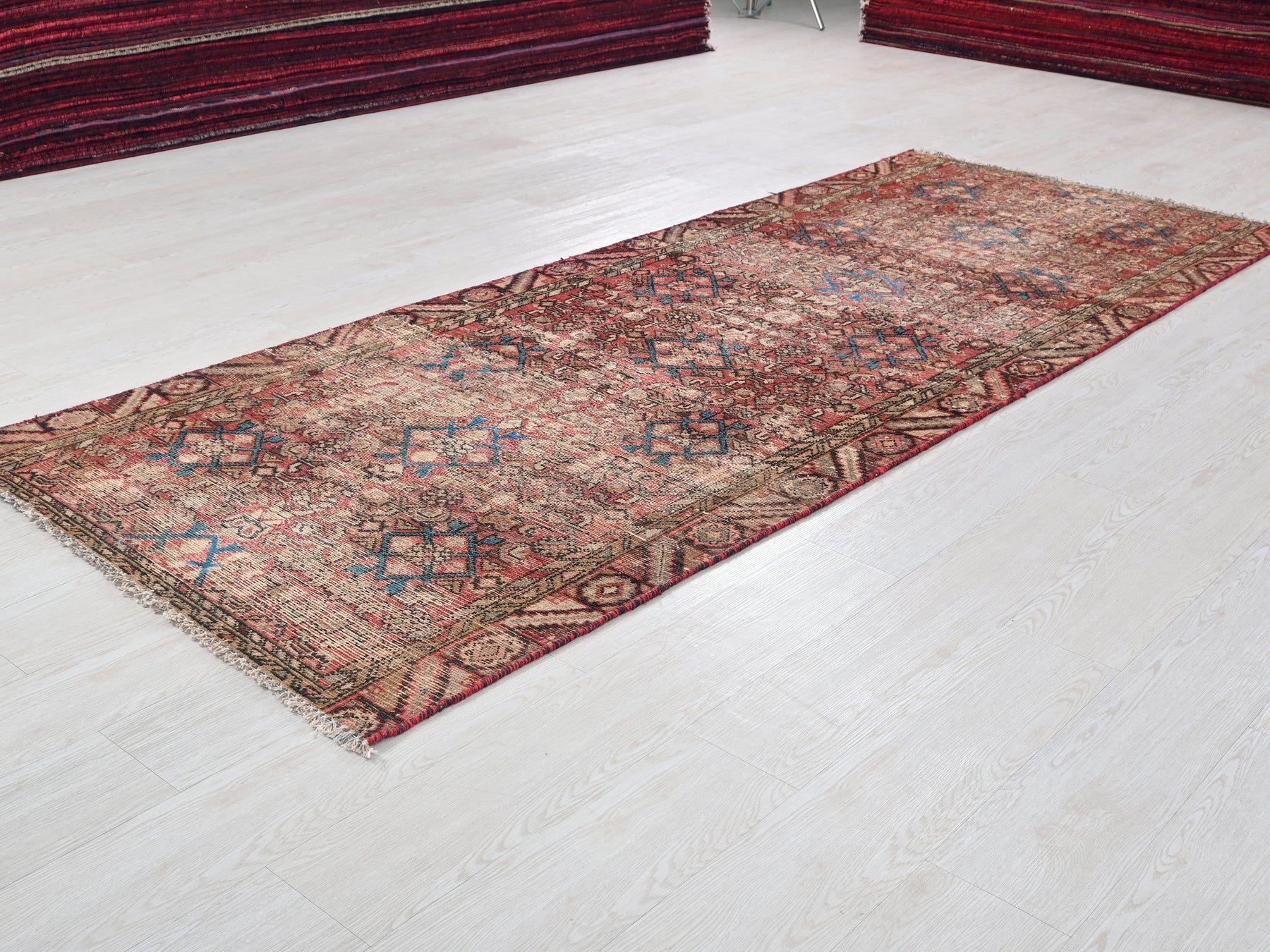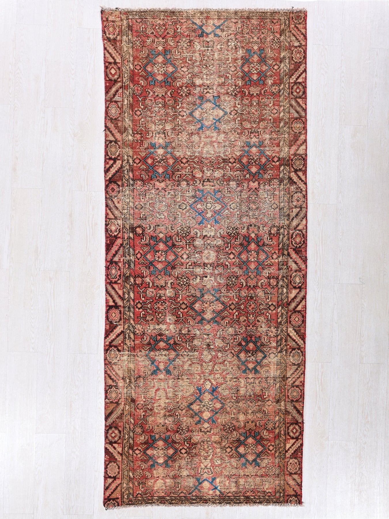 This is a hand-knotted, one-of-a-kind vintage rug. Due to the nature of this piece, there may be slight imperfections in its wear, shape, dimensions, and color. All of our rugs are professionally cleaned and repaired.