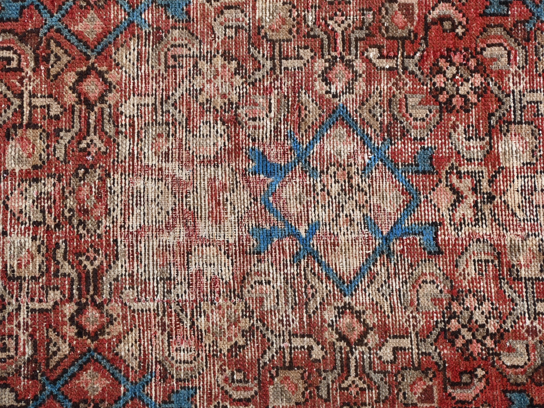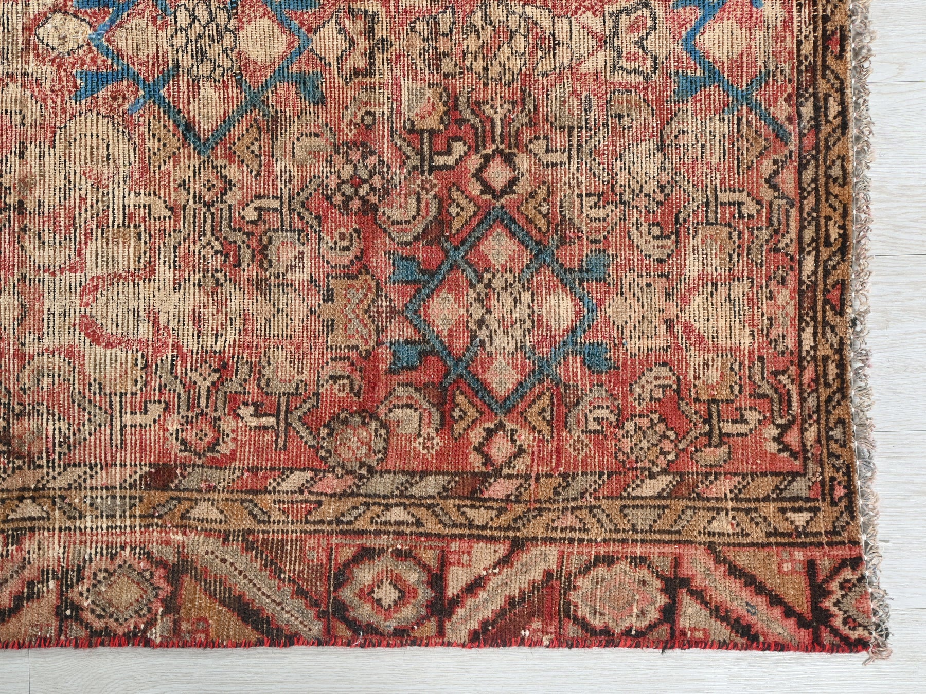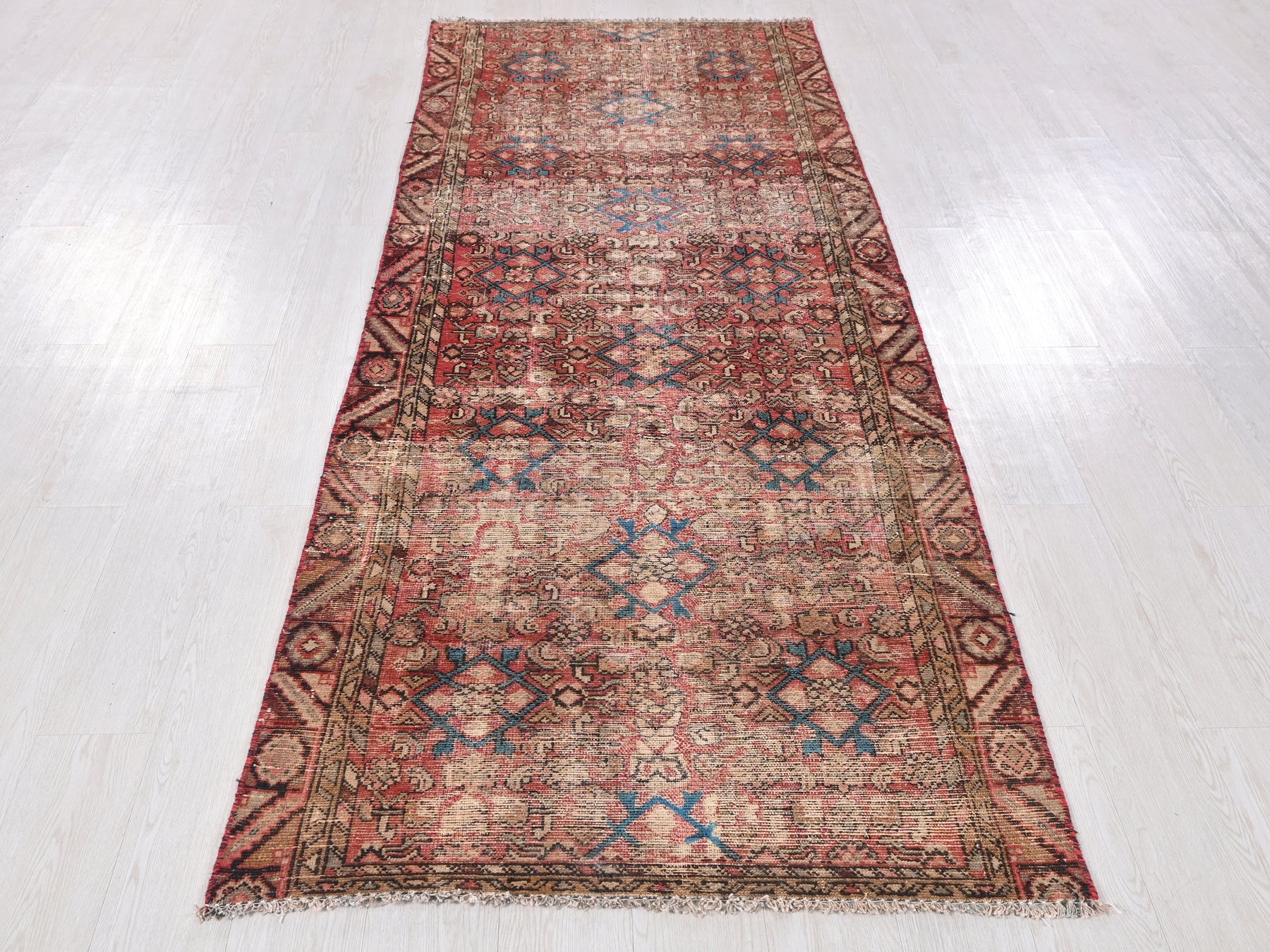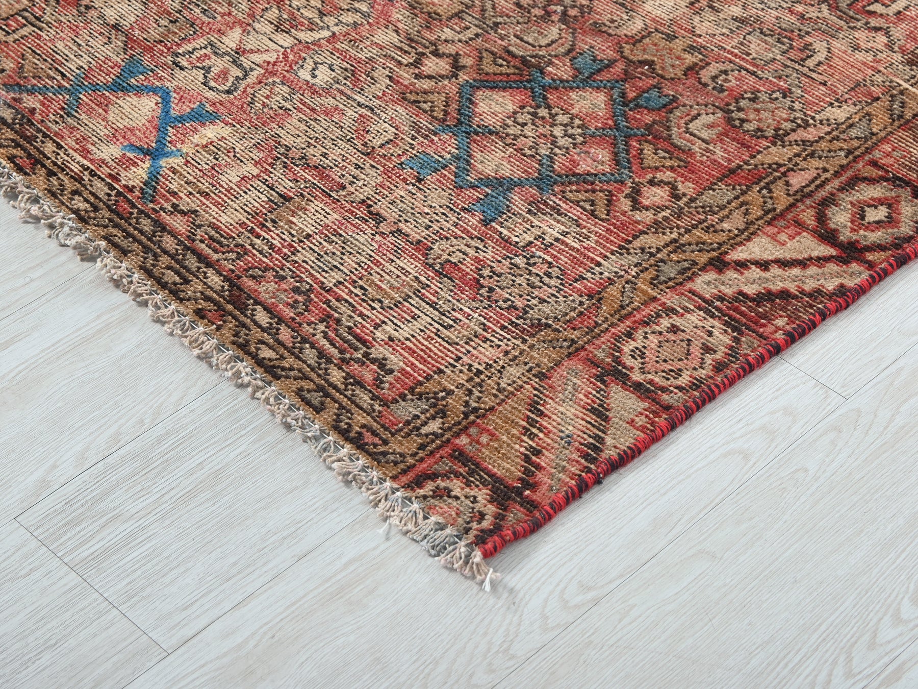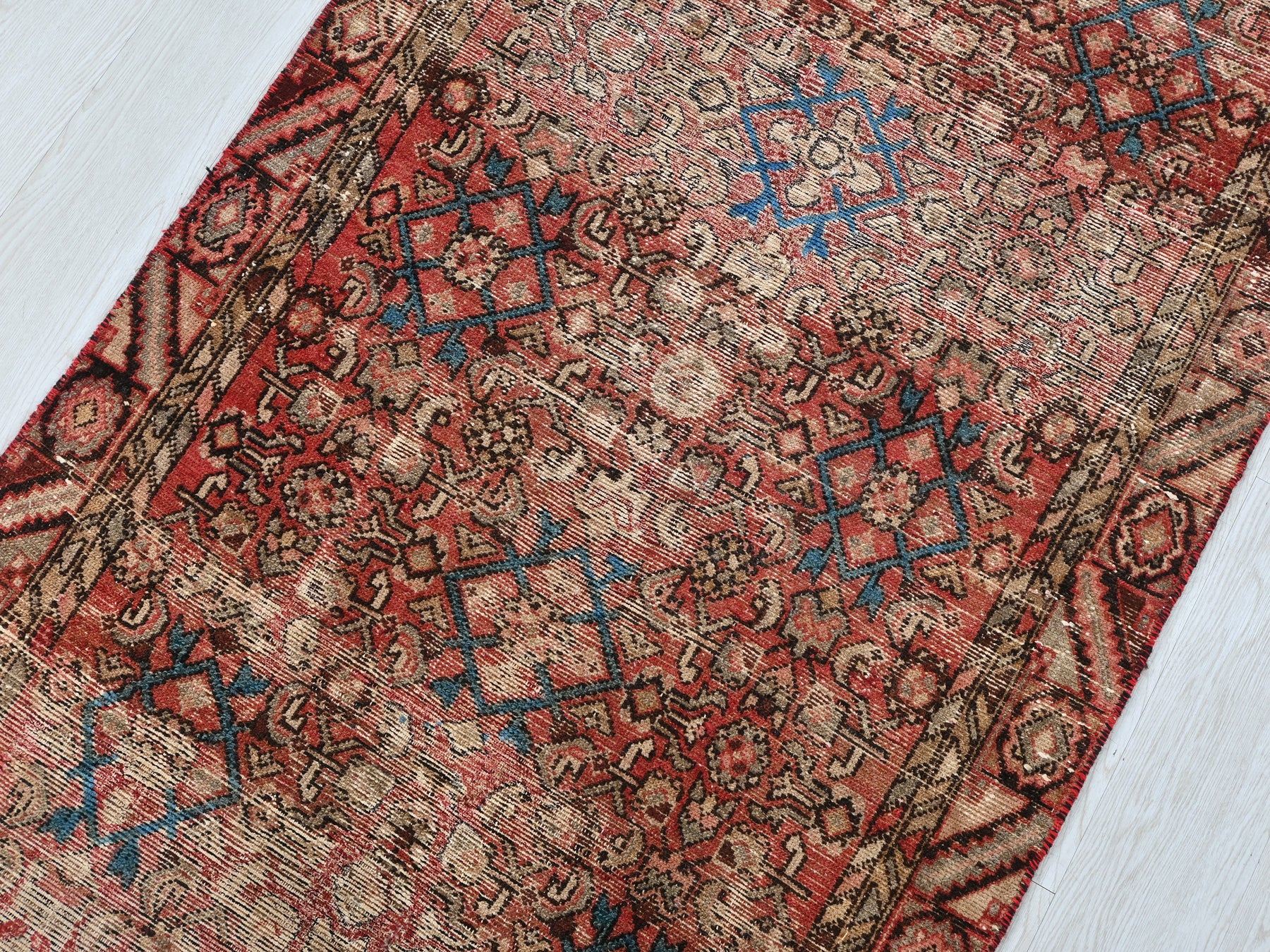 This is a hand-knotted, one-of-a-kind vintage rug. Due to the nature of this piece, there may be slight imperfections in its wear, shape, dimensions, and color. All of our rugs are professionally cleaned and repaired.