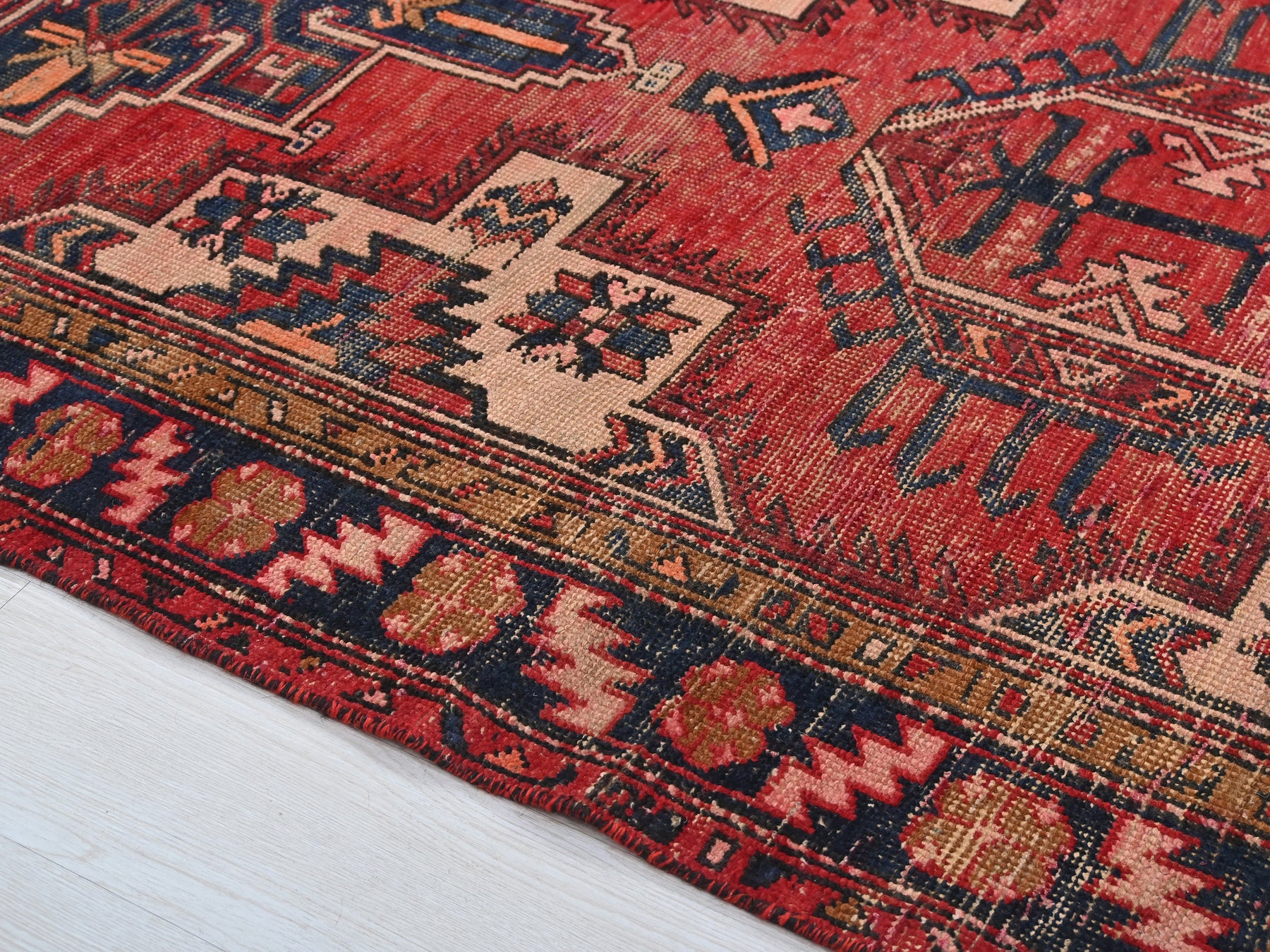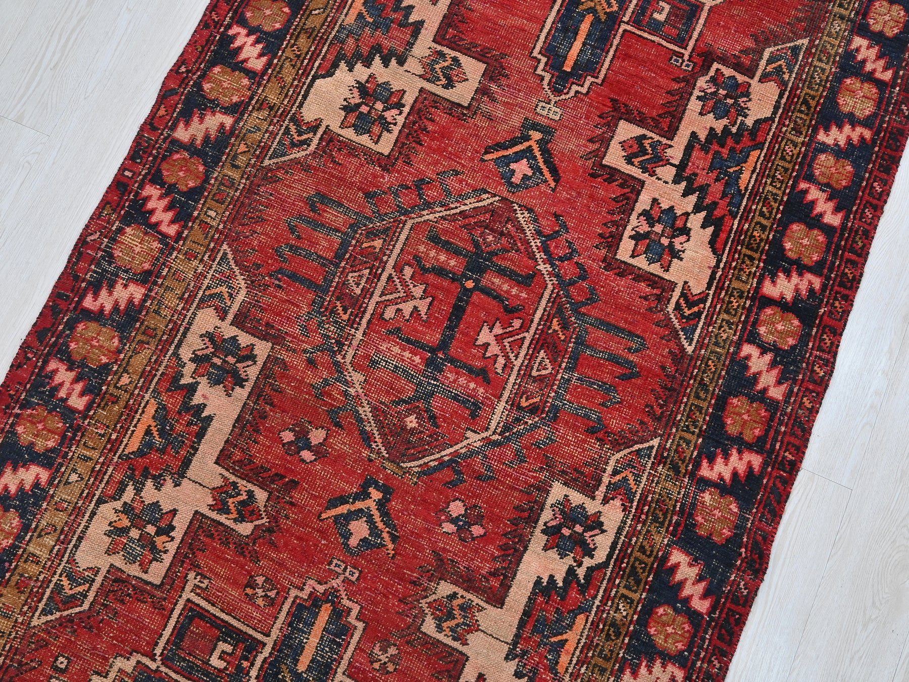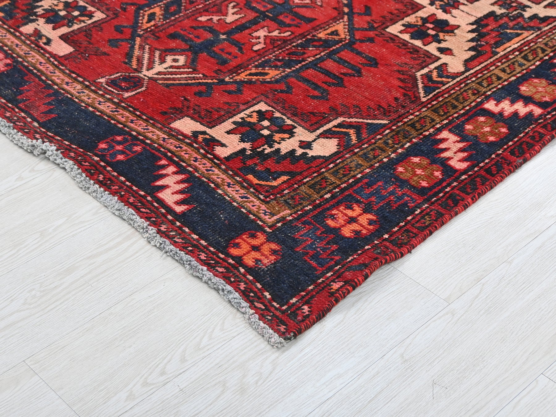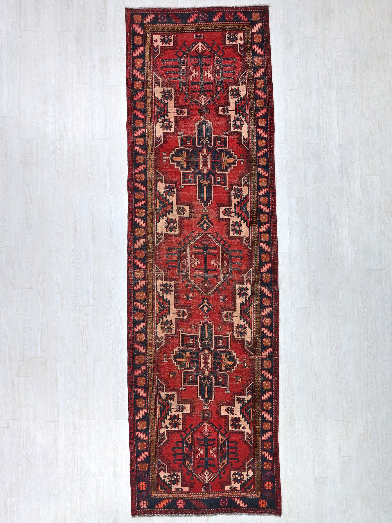 This is a hand-knotted, one-of-a-kind vintage rug. Due to the nature of this piece, there may be slight imperfections in its wear, shape, dimensions, and color. All of our rugs are professionally cleaned and repaired.