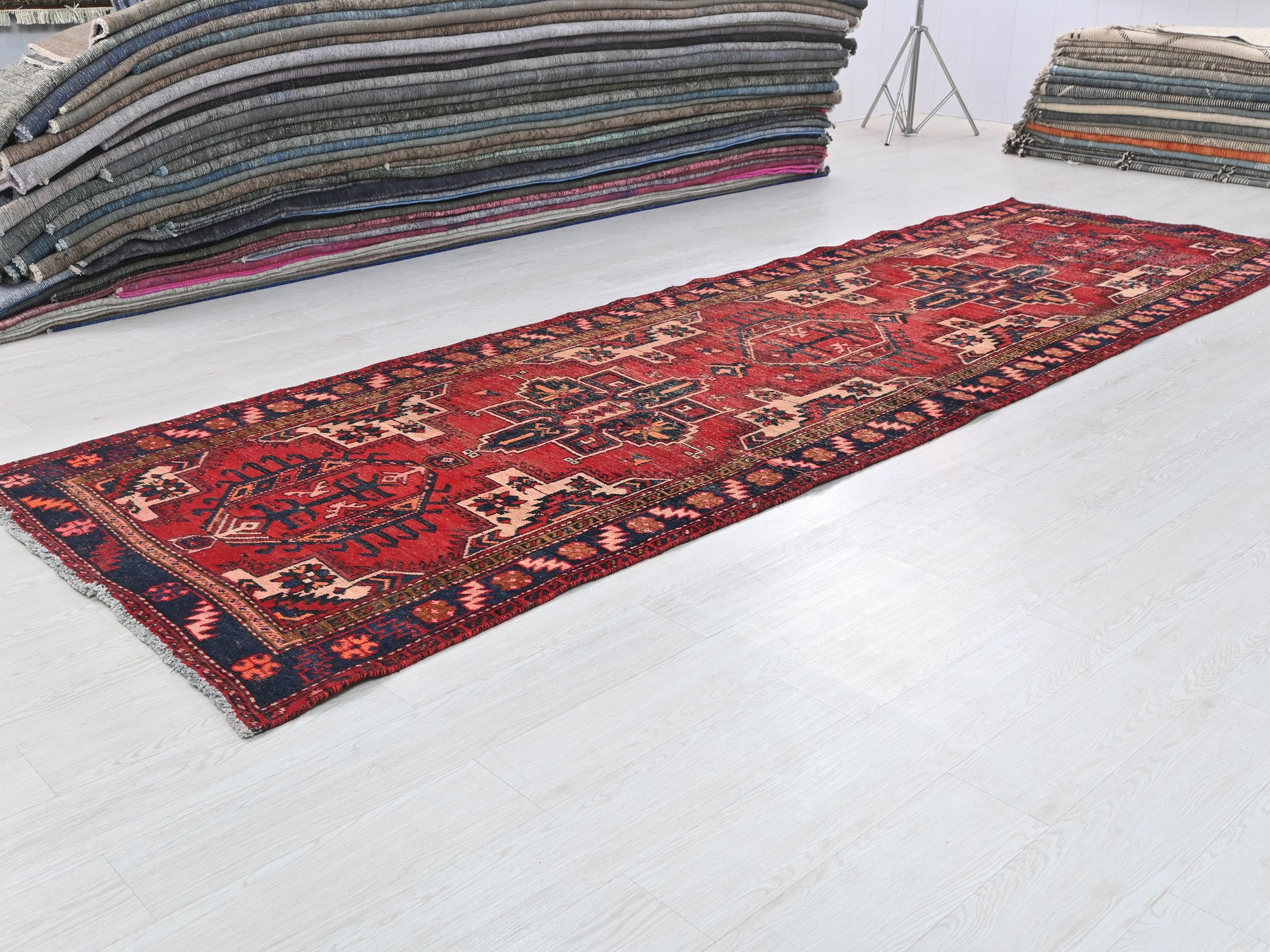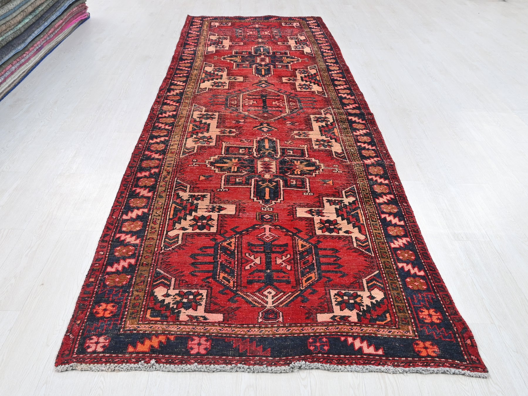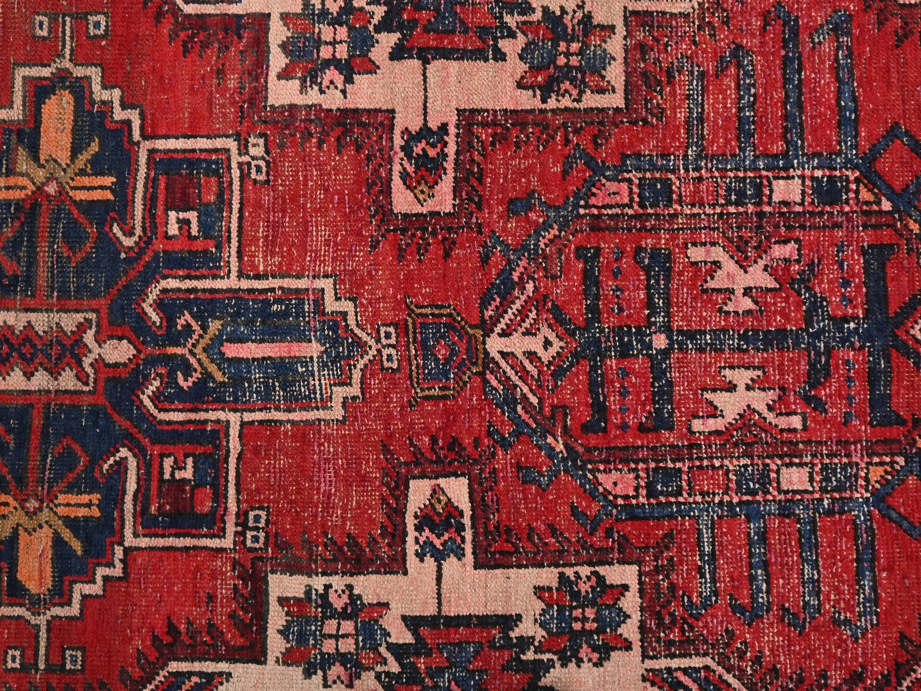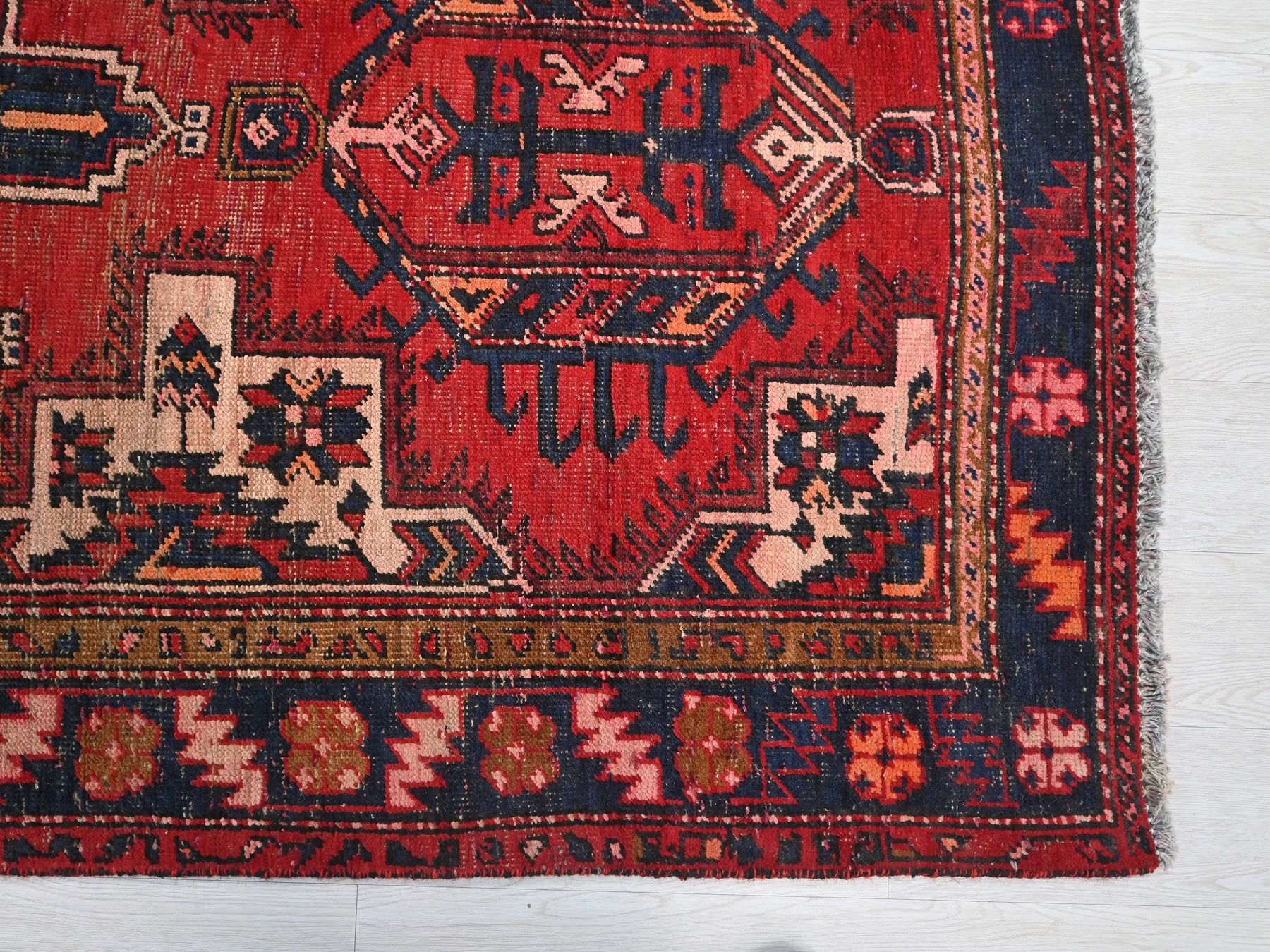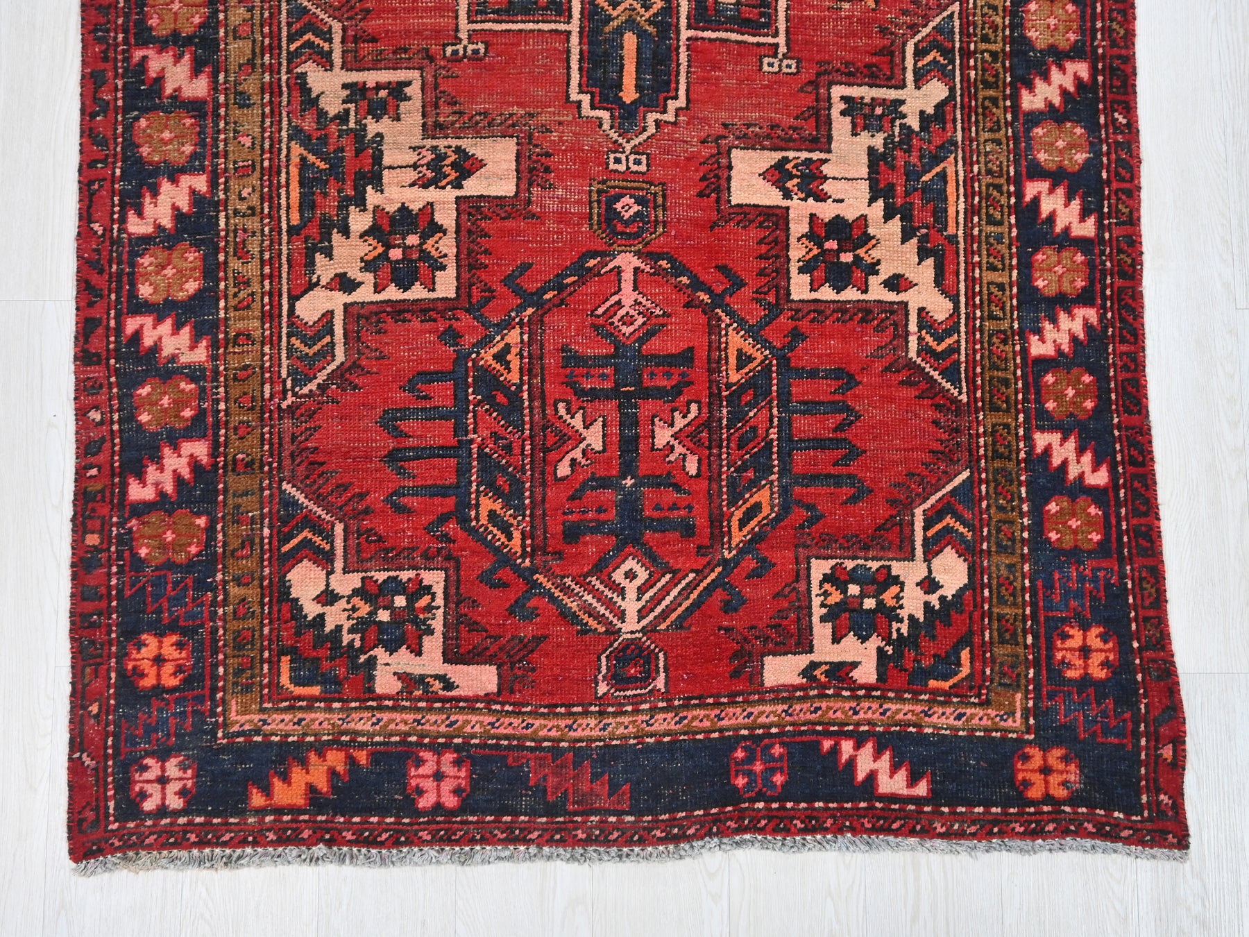 This is a hand-knotted, one-of-a-kind vintage rug. Due to the nature of this piece, there may be slight imperfections in its wear, shape, dimensions, and color. All of our rugs are professionally cleaned and repaired.