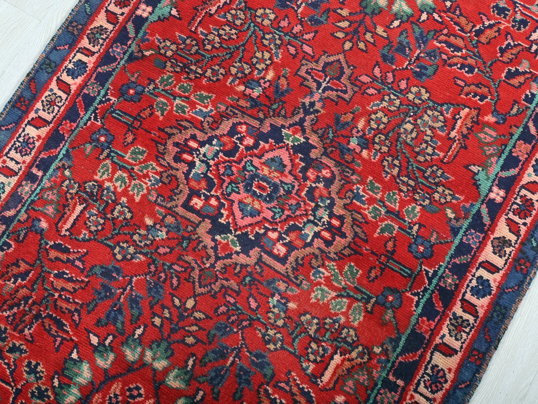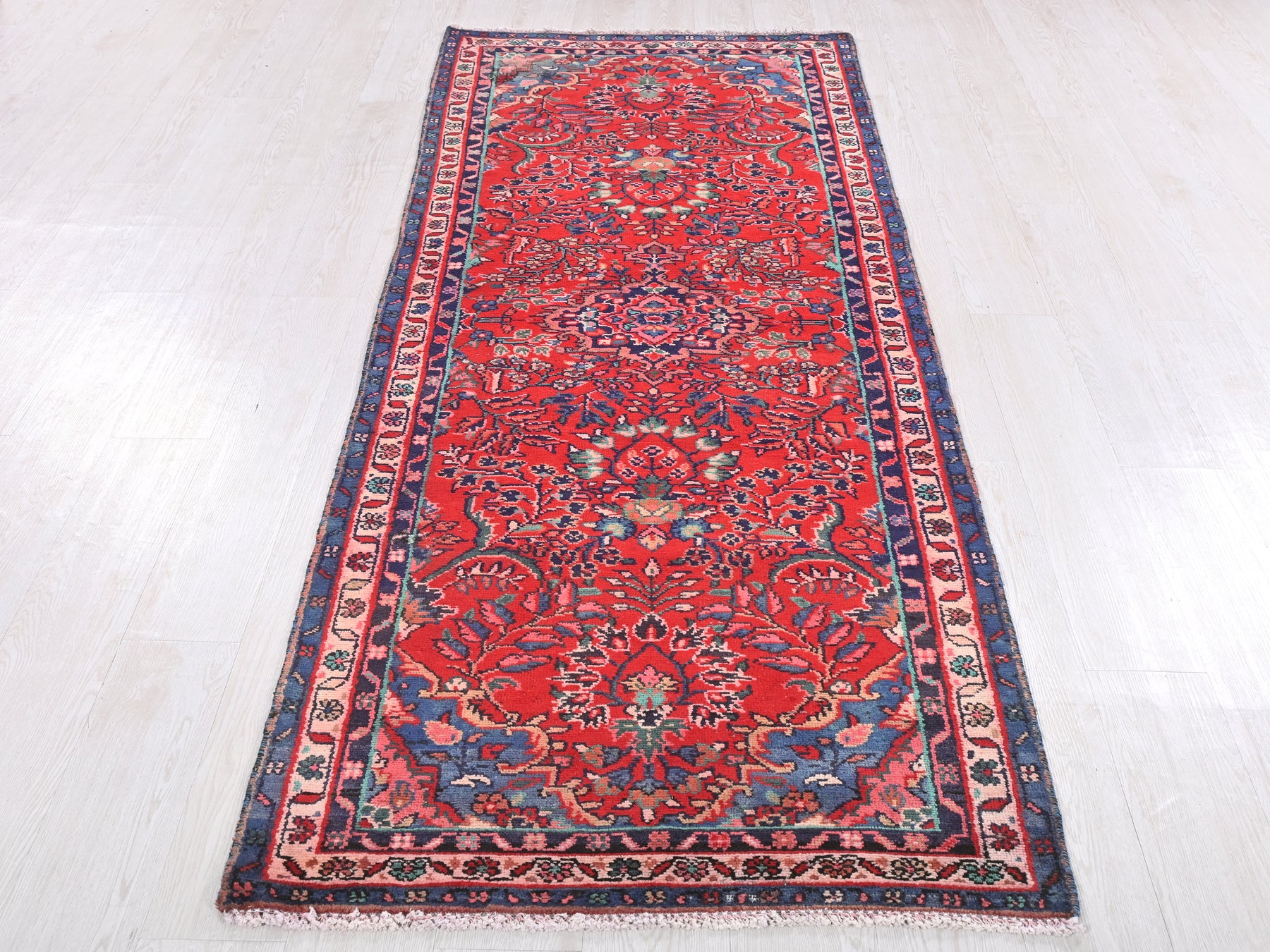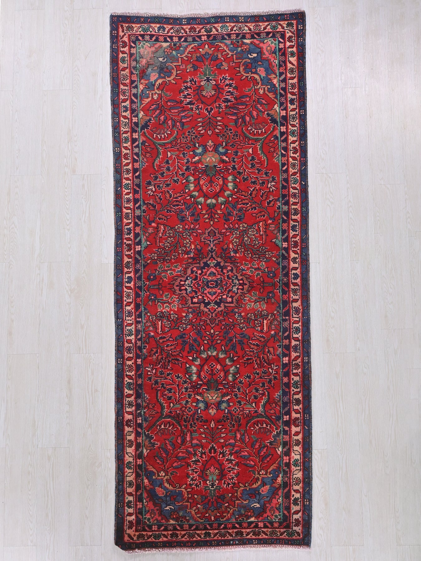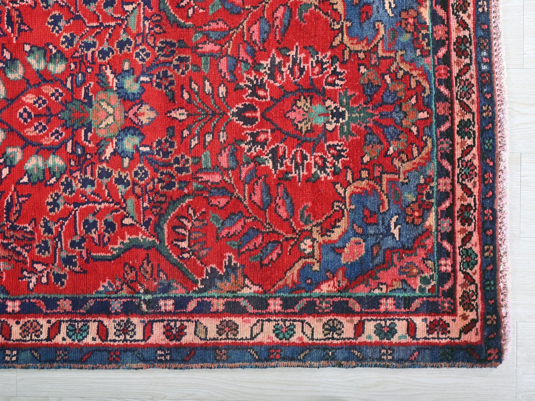 This is a hand-knotted, one-of-a-kind vintage rug. Due to the nature of this piece, there may be slight imperfections in its wear, shape, dimensions, and color. All of our rugs are professionally cleaned and repaired.