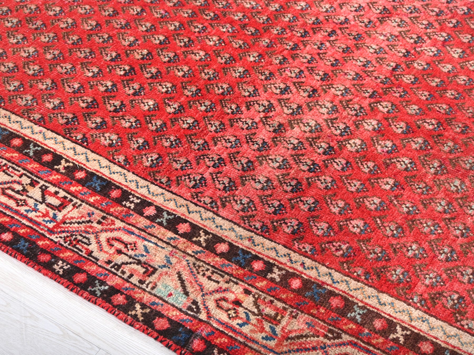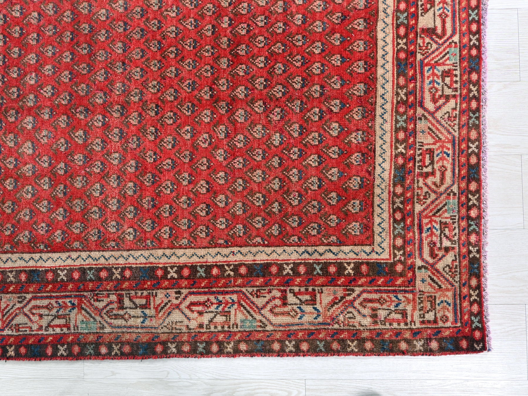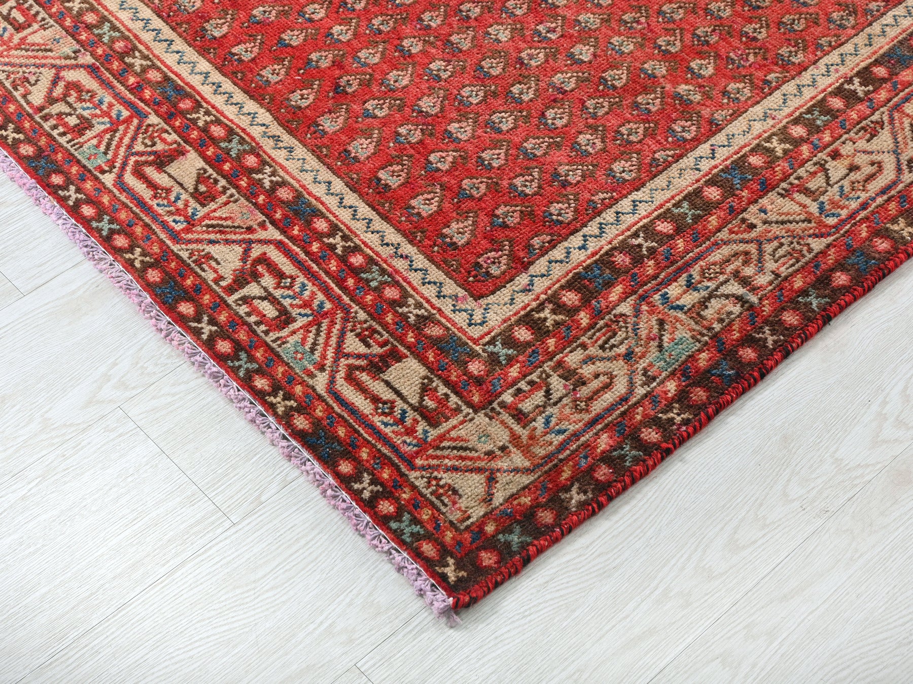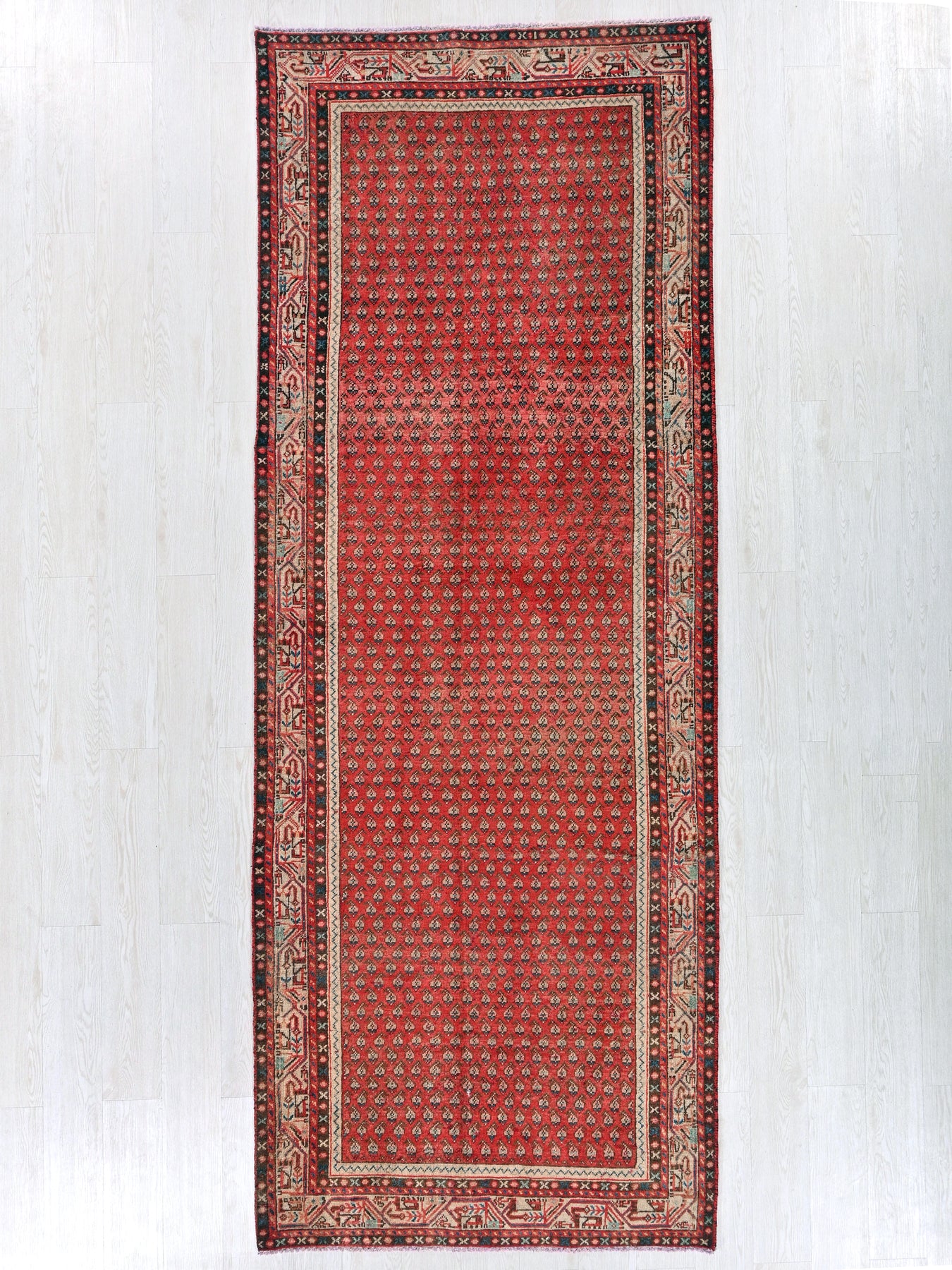 This is a hand-knotted, one-of-a-kind vintage rug. Due to the nature of this piece, there may be slight imperfections in its wear, shape, dimensions, and color. All of our rugs are professionally cleaned and repaired.