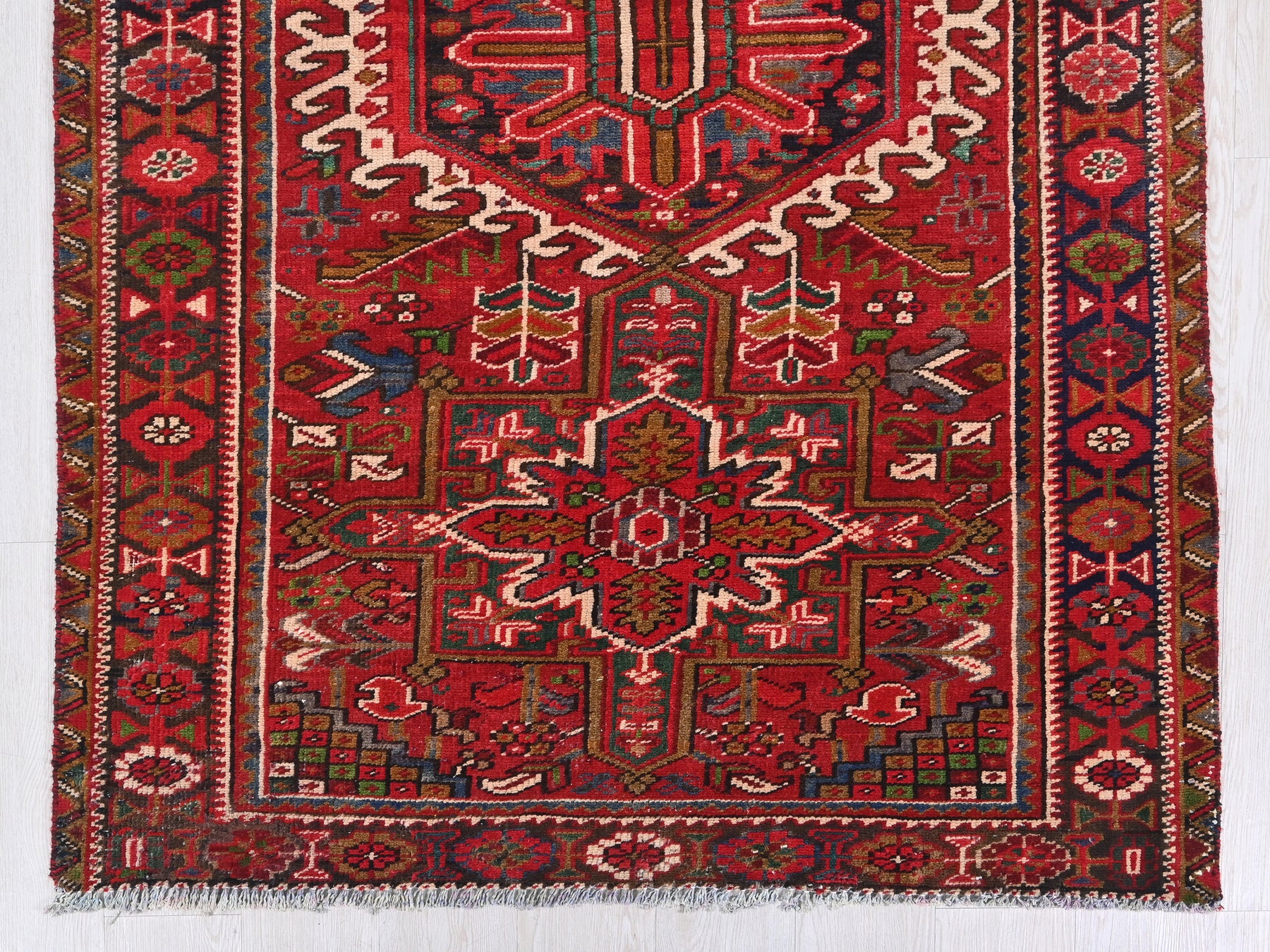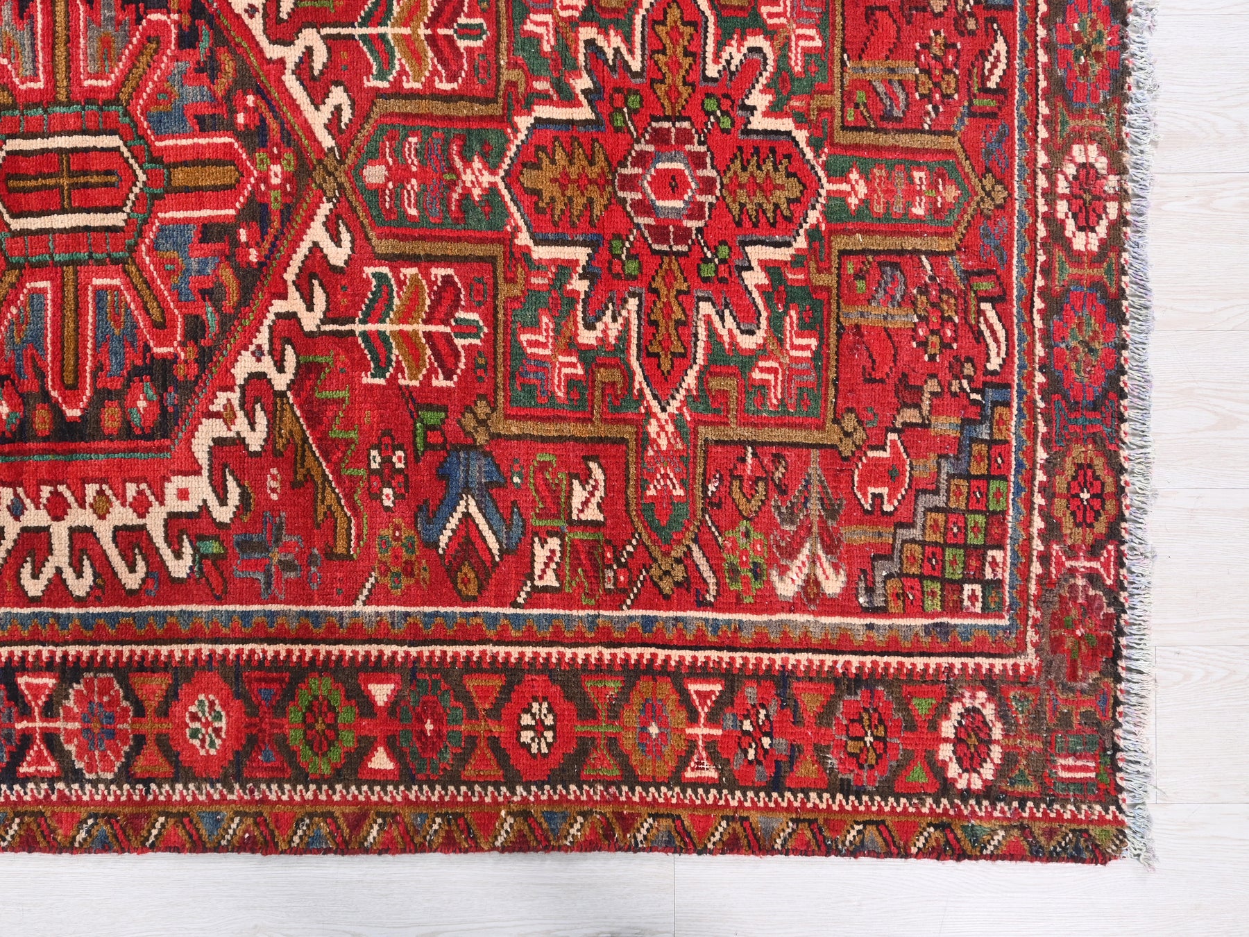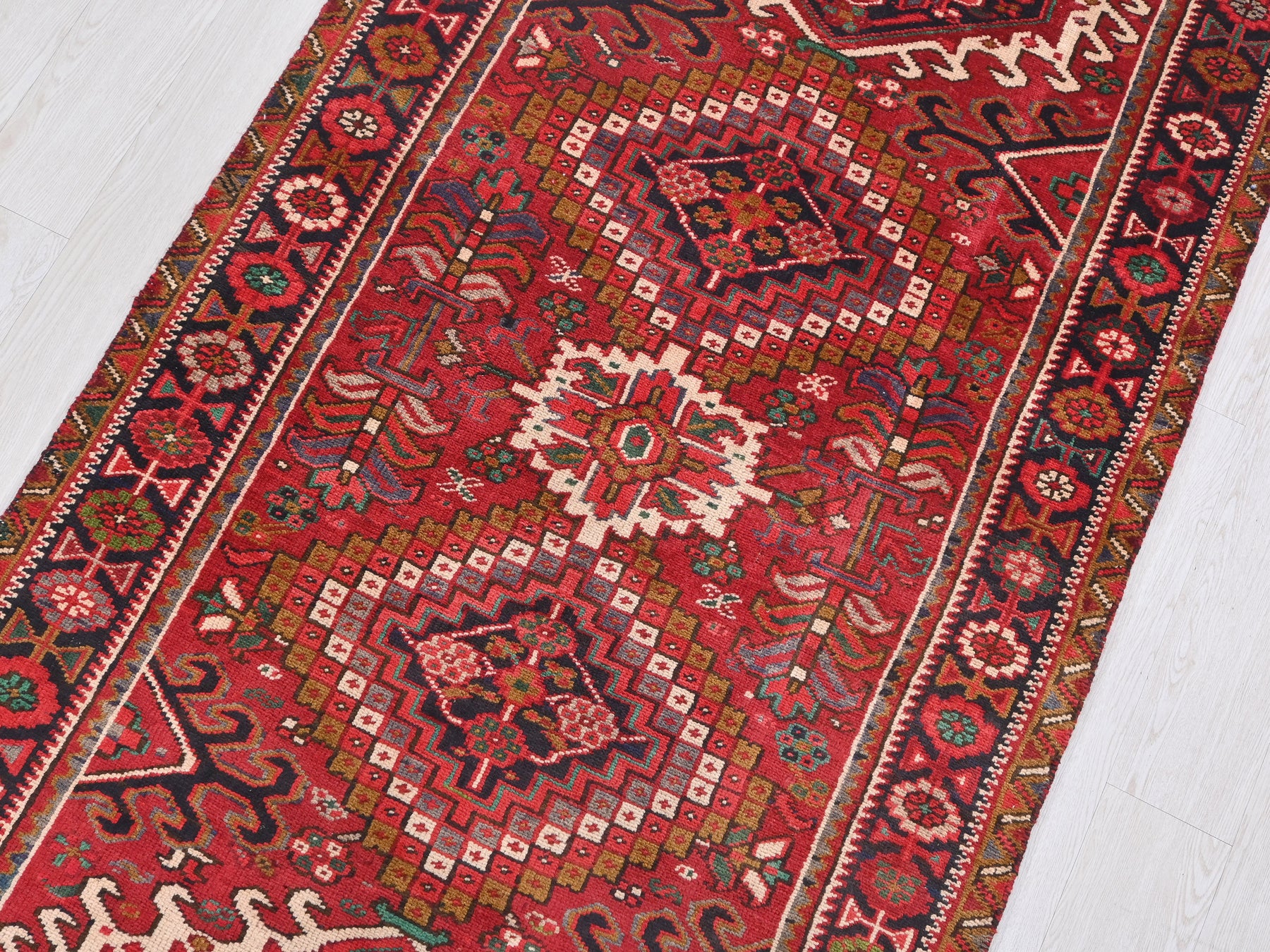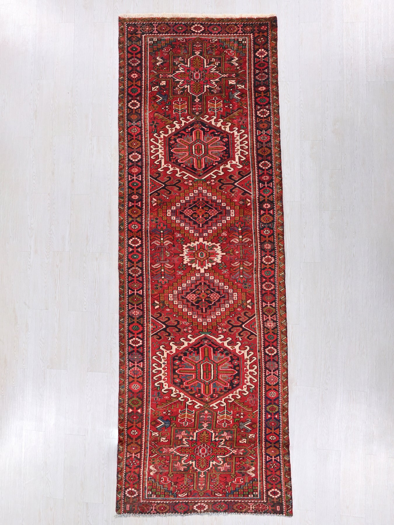 This is a hand-knotted, one-of-a-kind vintage rug. Due to the nature of this piece, there may be slight imperfections in its wear, shape, dimensions, and color. All of our rugs are professionally cleaned and repaired.