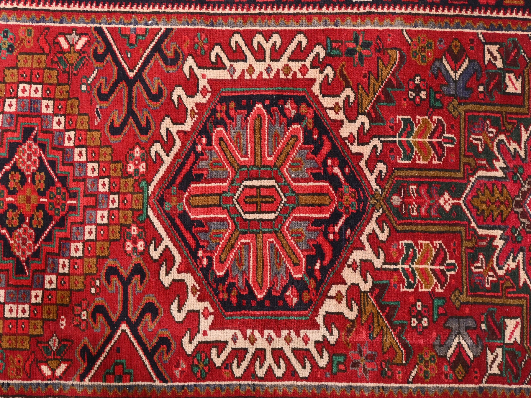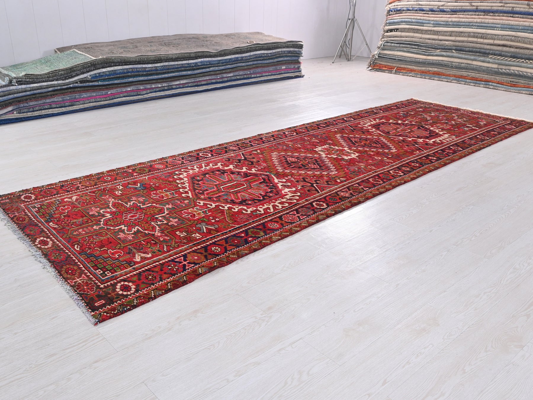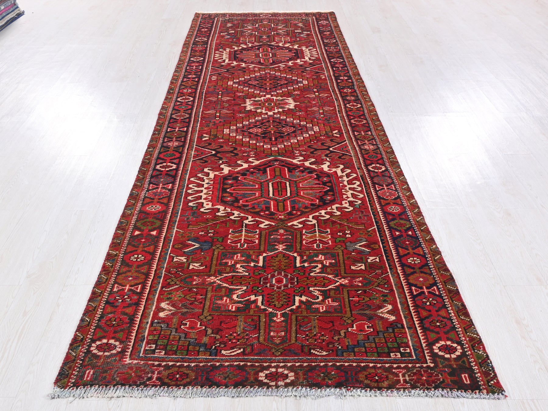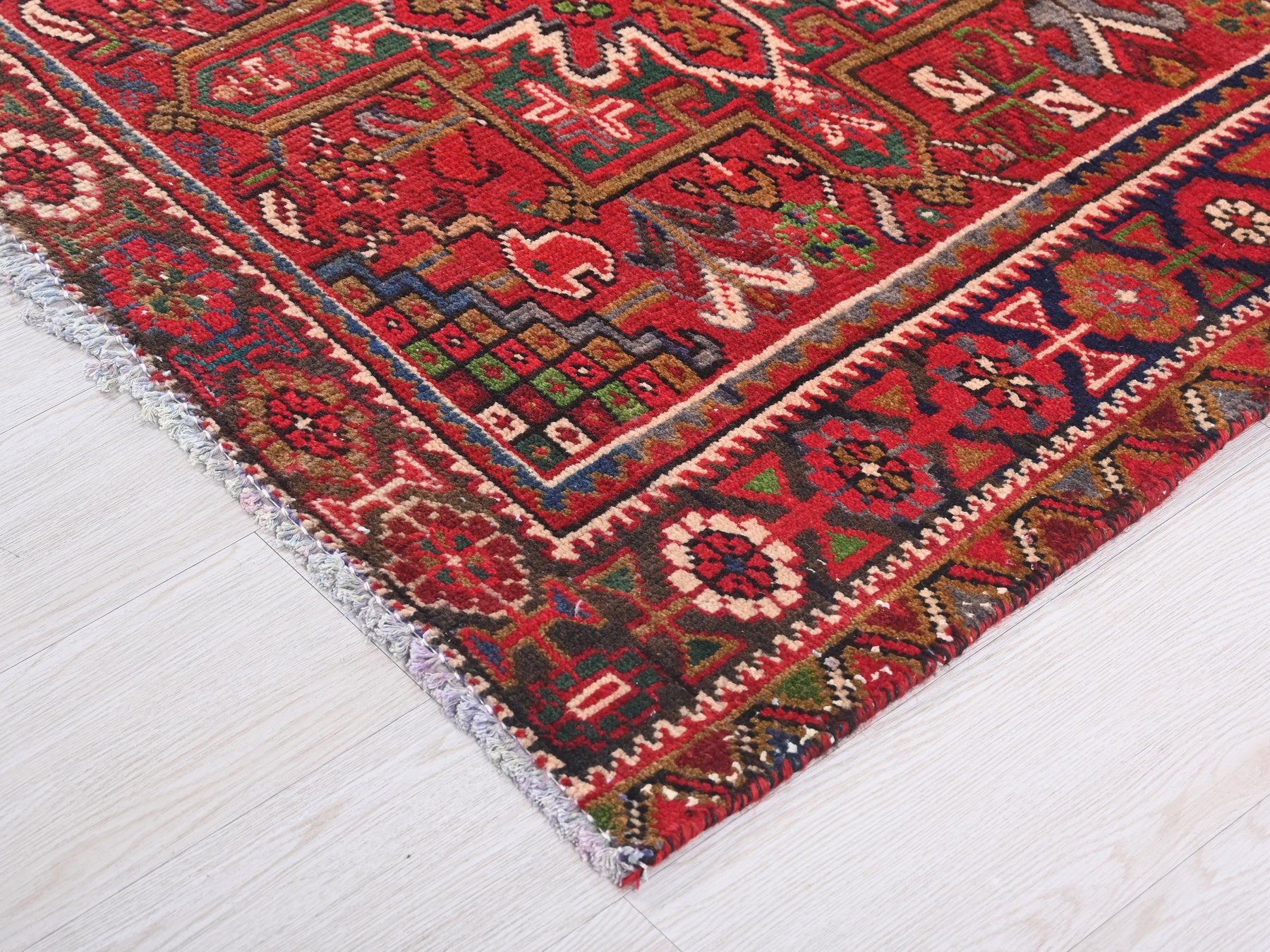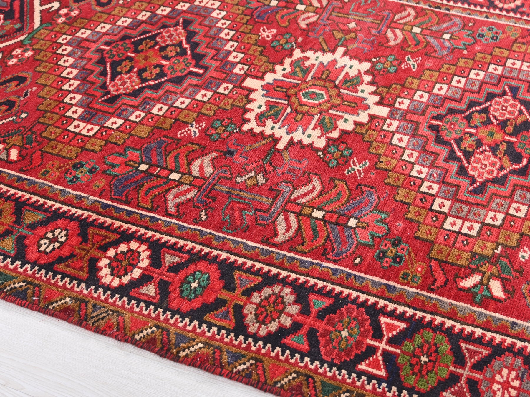 This is a hand-knotted, one-of-a-kind vintage rug. Due to the nature of this piece, there may be slight imperfections in its wear, shape, dimensions, and color. All of our rugs are professionally cleaned and repaired.