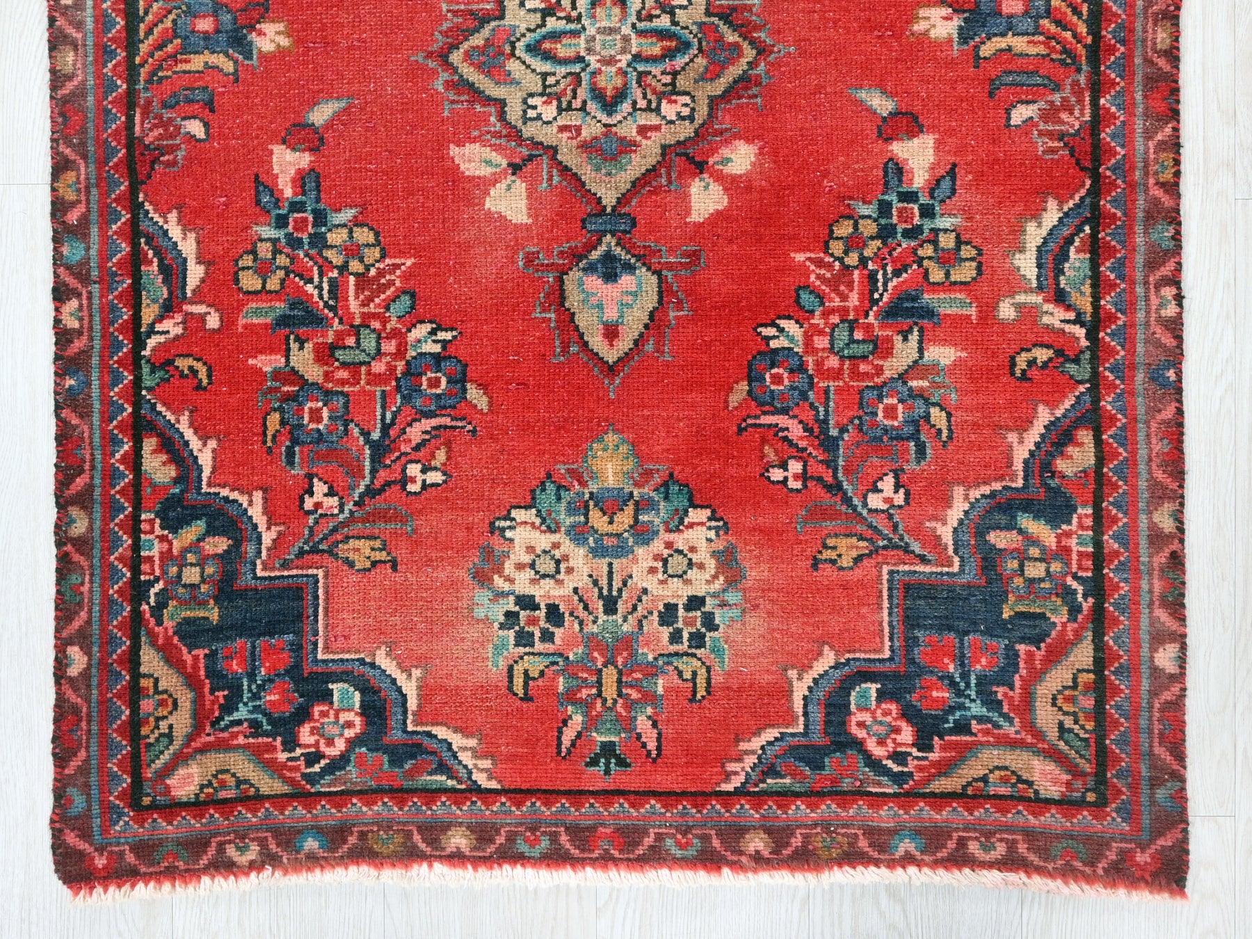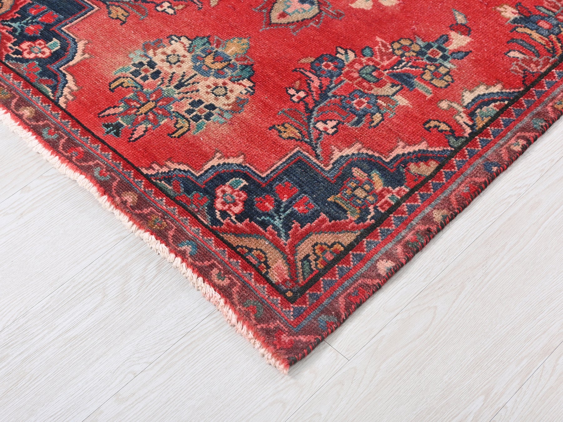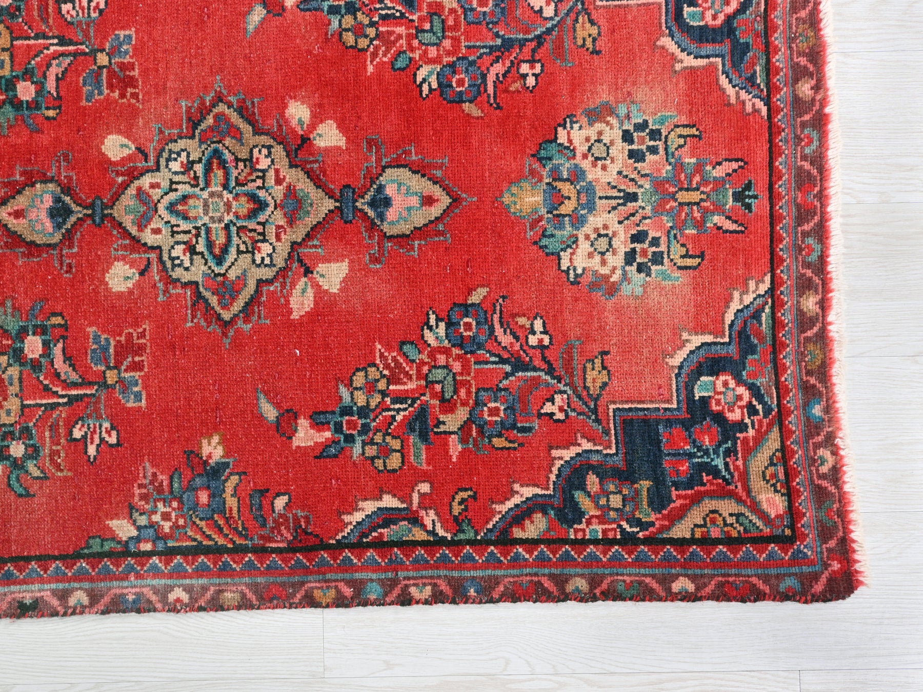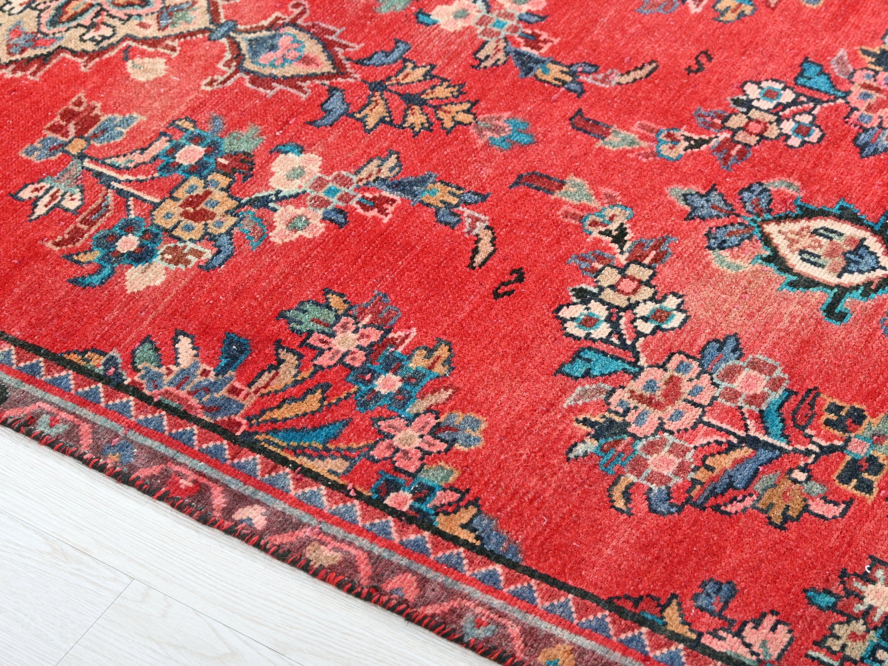 This is a hand-knotted, one-of-a-kind vintage rug. Due to the nature of this piece, there may be slight imperfections in its wear, shape, dimensions, and color. All of our rugs are professionally cleaned and repaired.