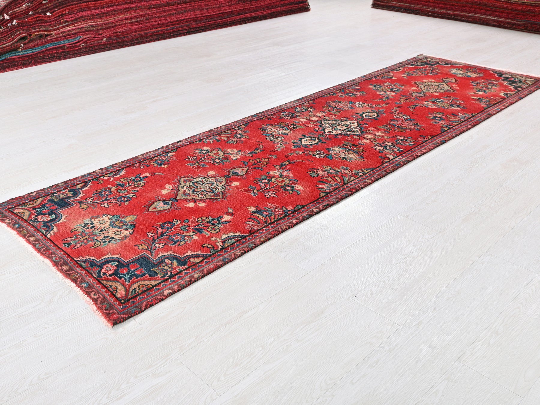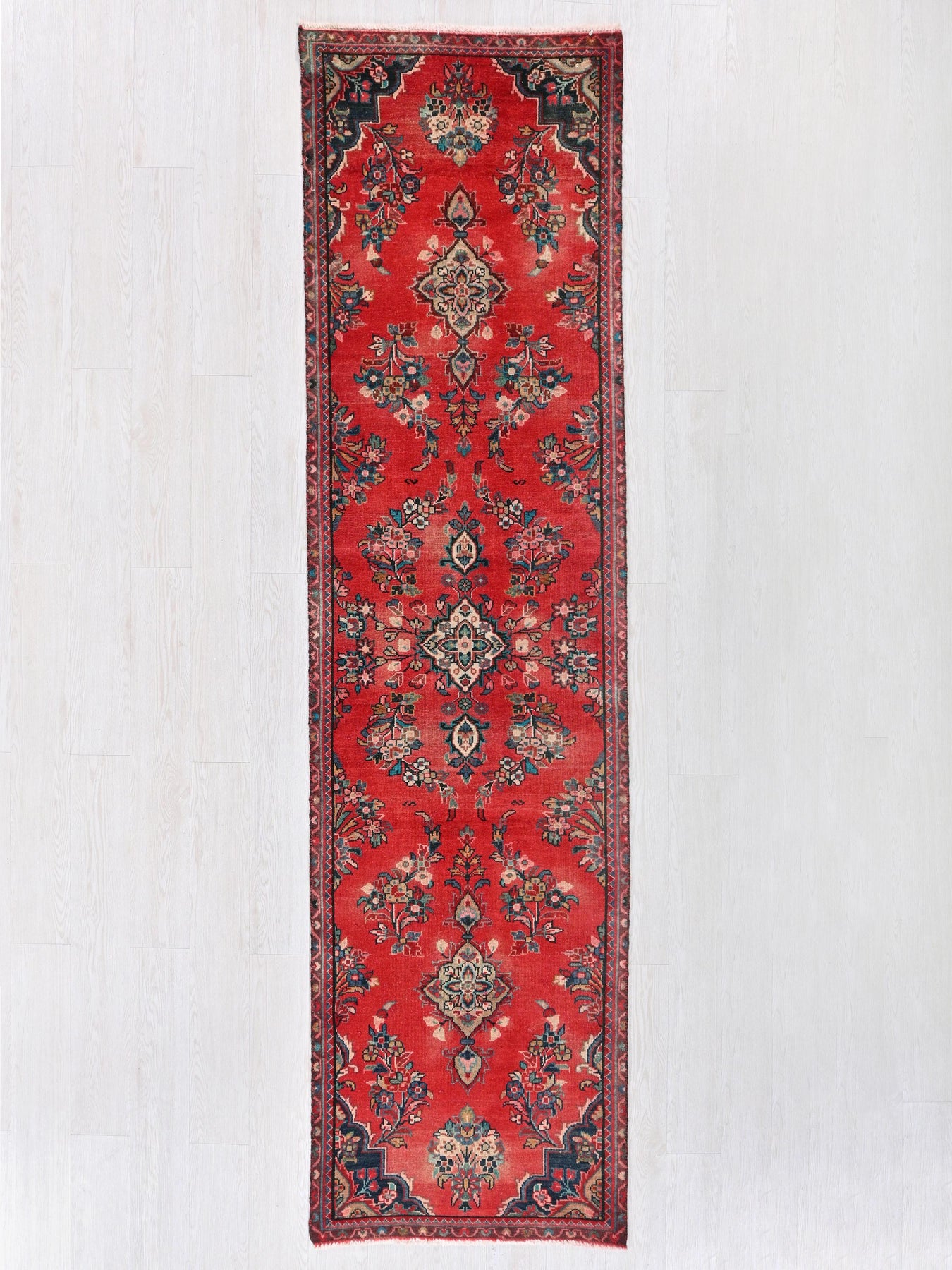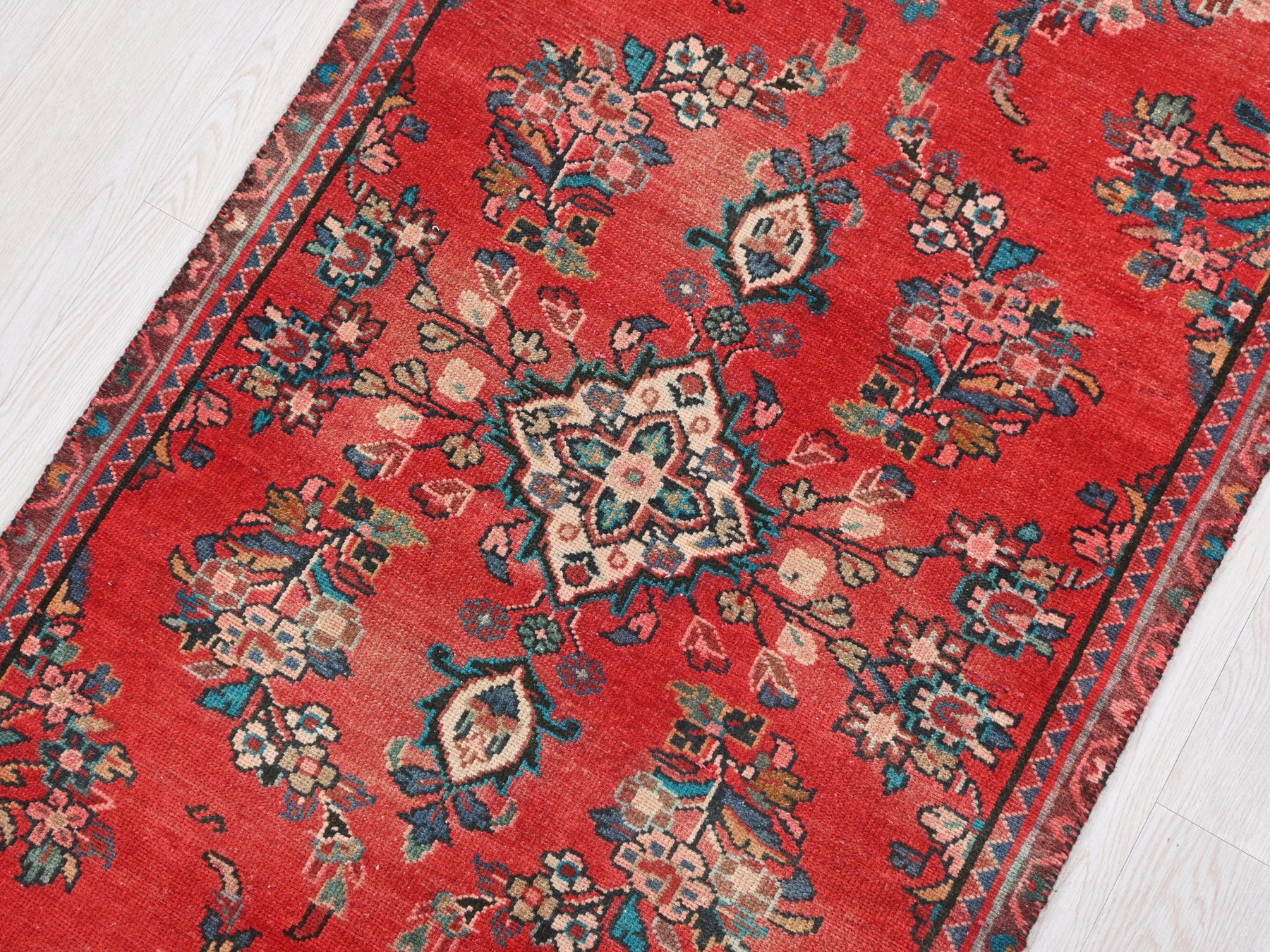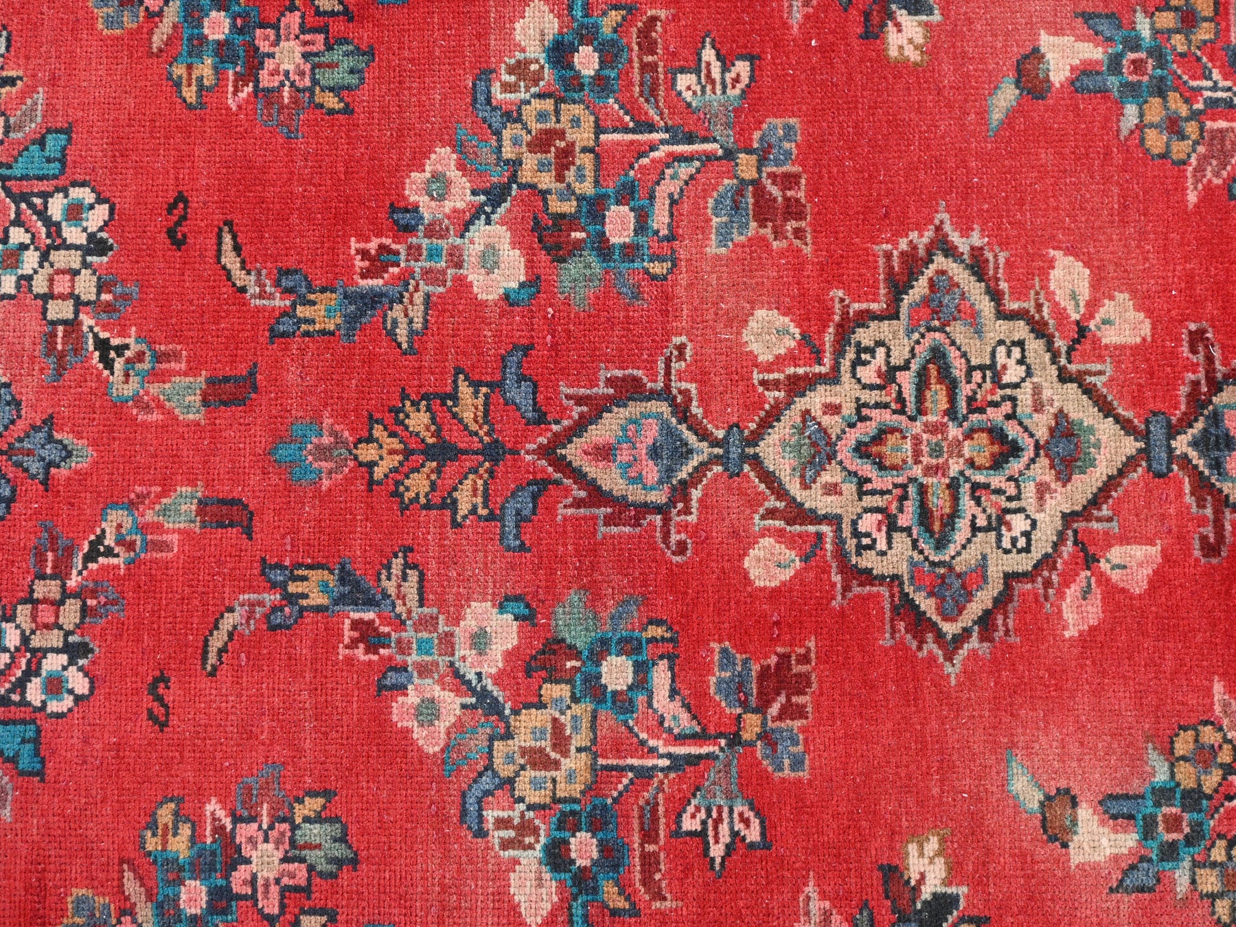 This is a hand-knotted, one-of-a-kind vintage rug. Due to the nature of this piece, there may be slight imperfections in its wear, shape, dimensions, and color. All of our rugs are professionally cleaned and repaired.