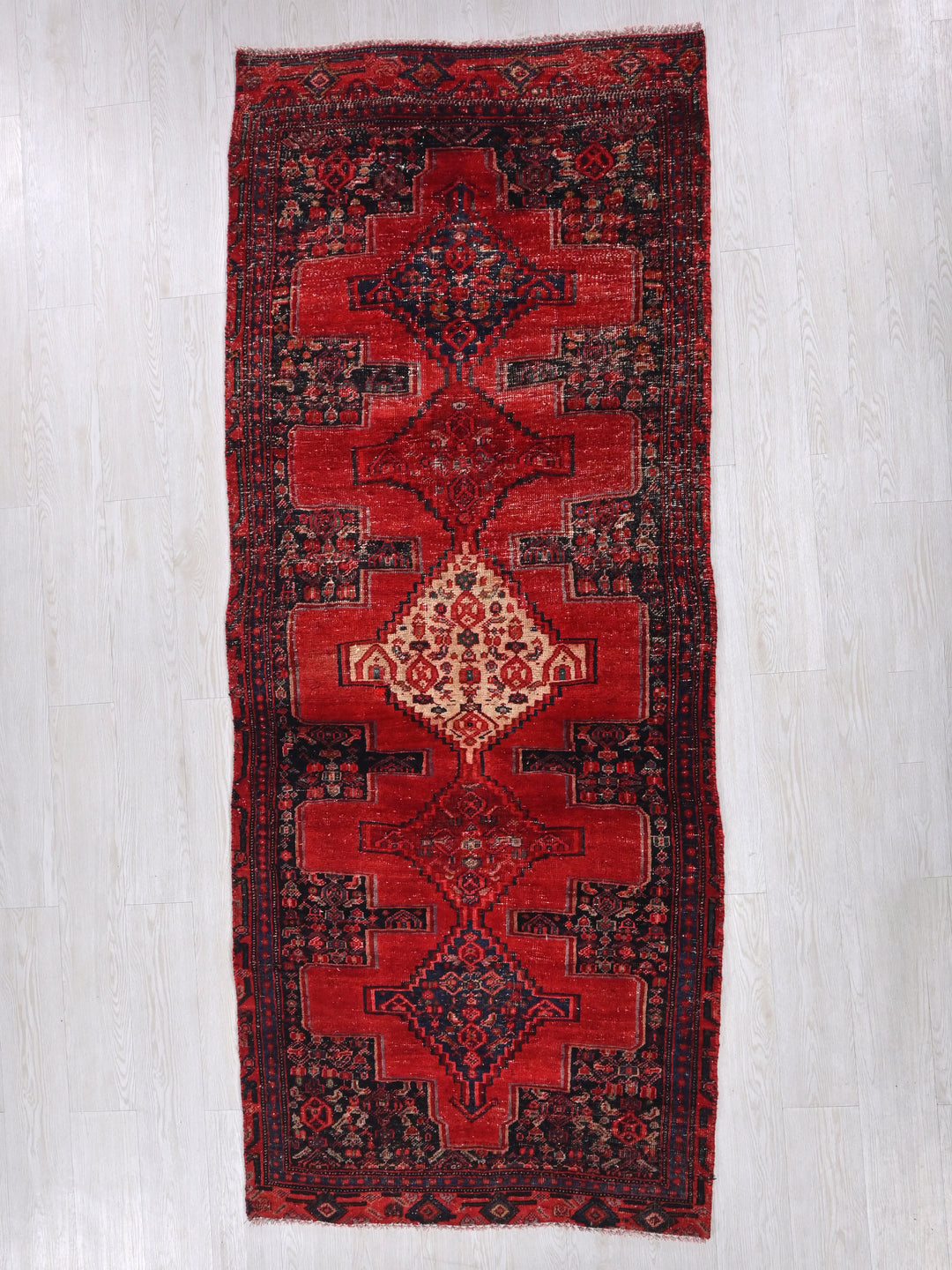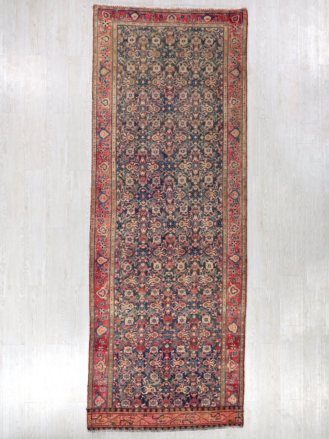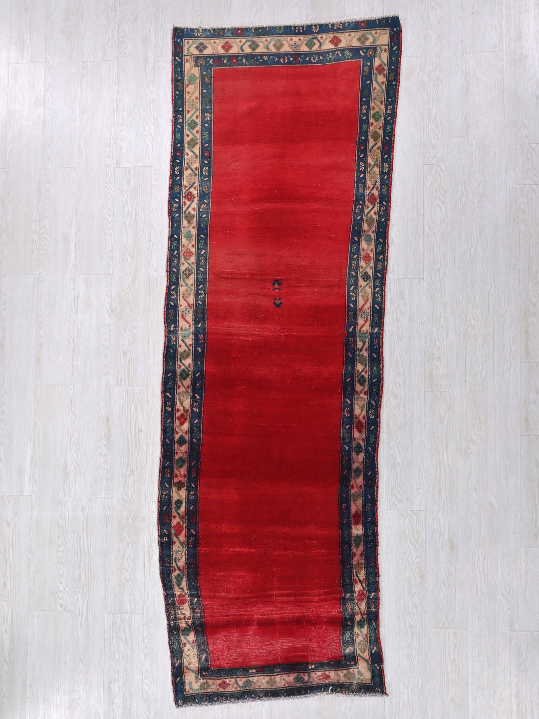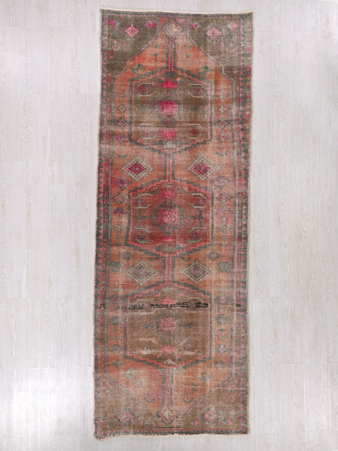 Vintage, hand‑knotted, repaired/restored wear