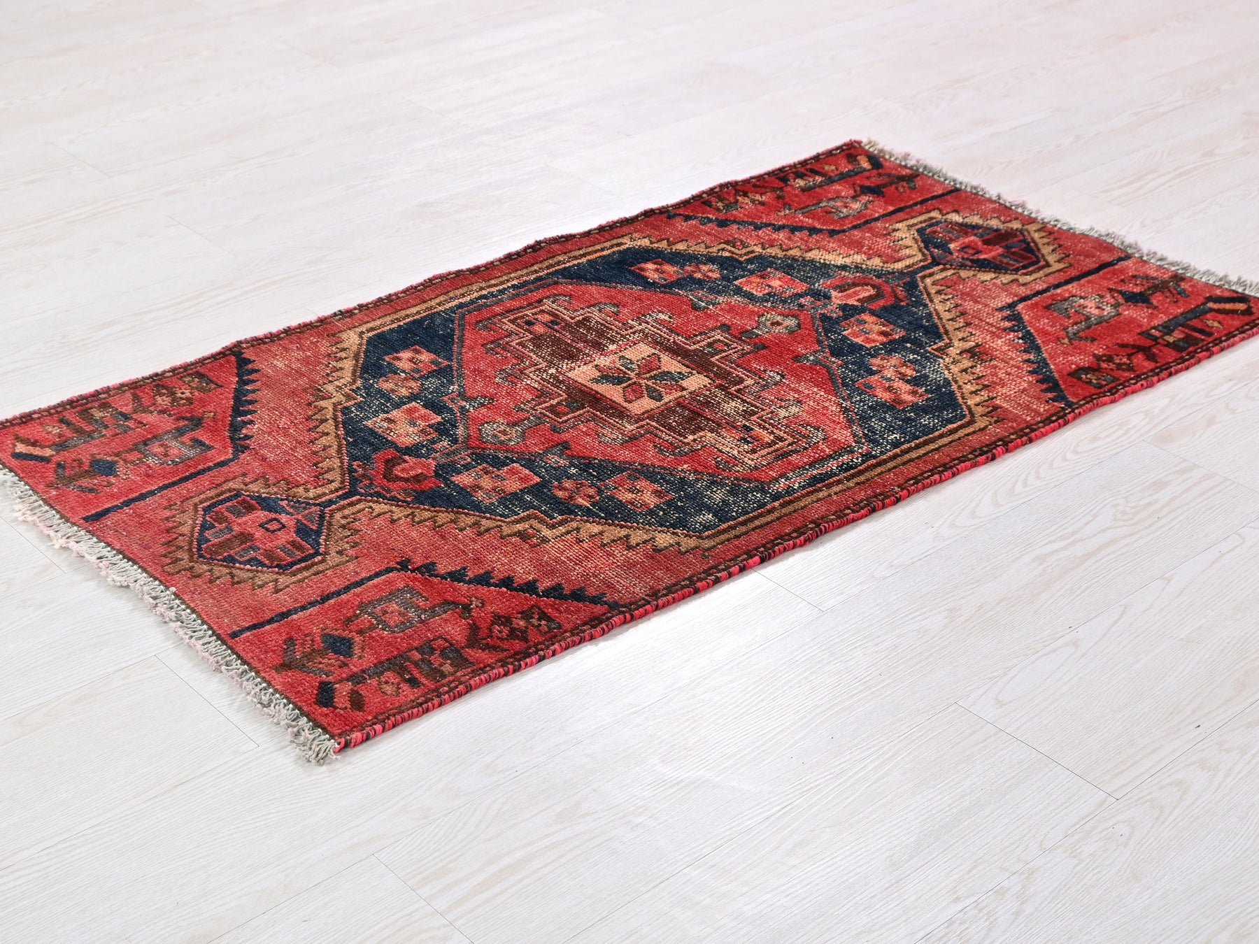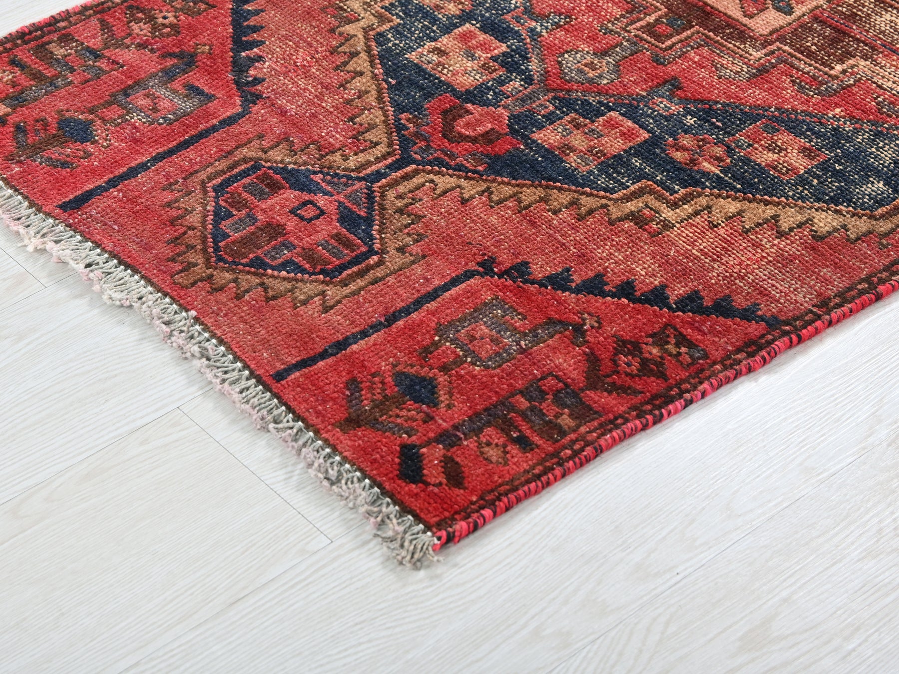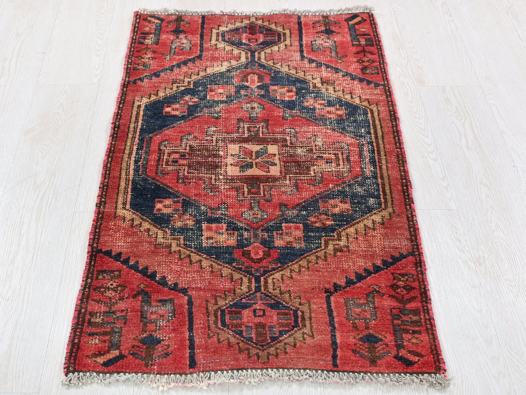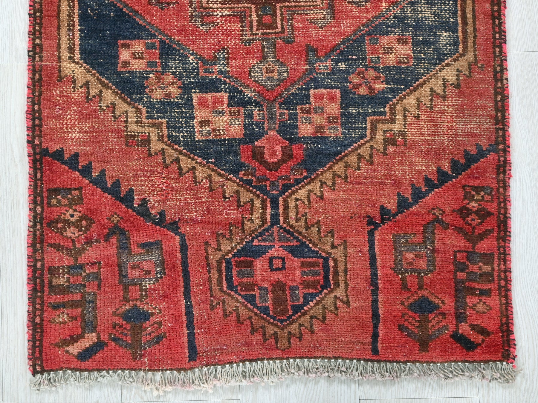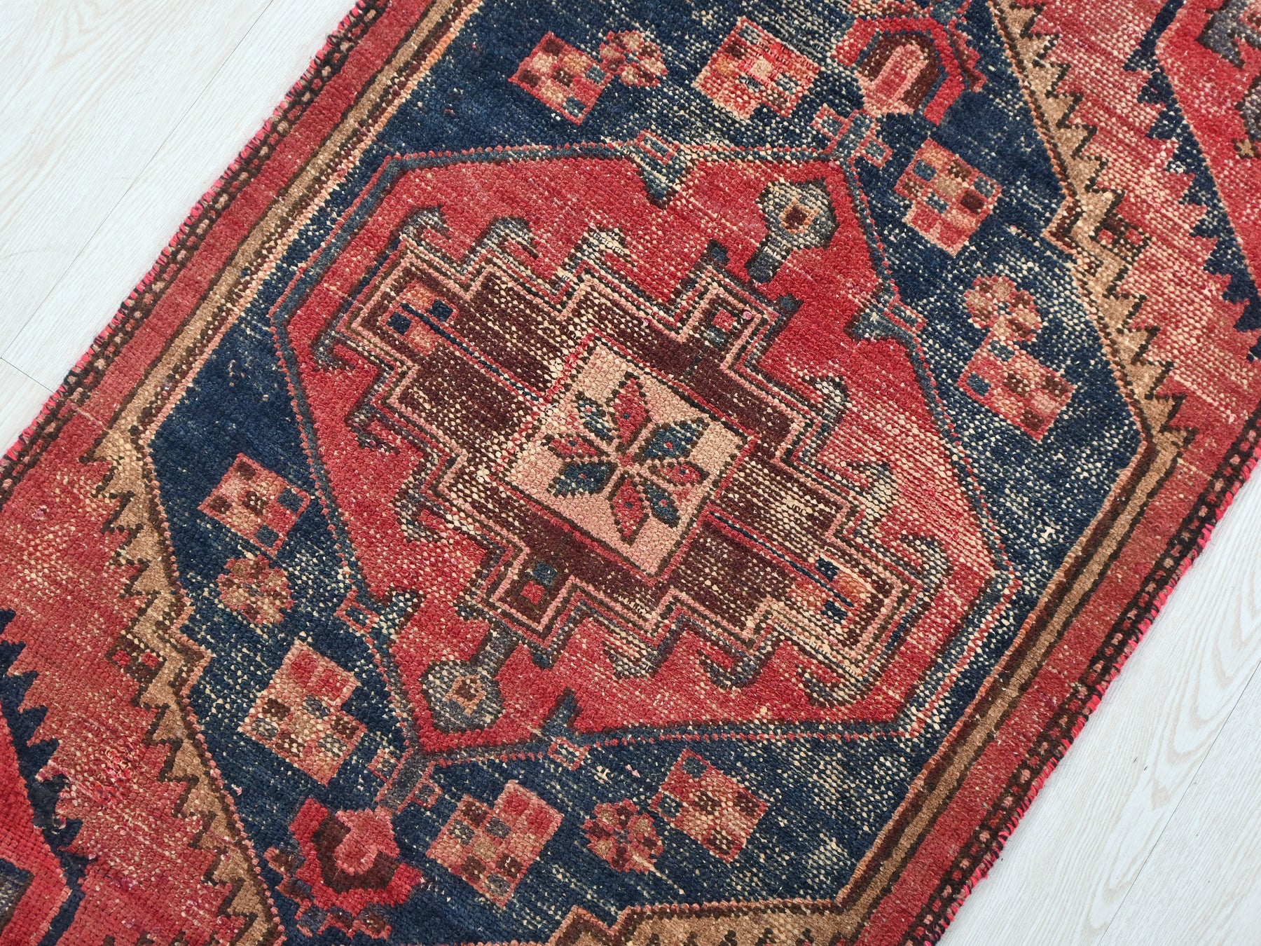 This geometric Persian runner rug balances bold navy diamonds with a washed brick-red field and cream borders. Measuring 2' 1" x 3' 11", it's made for hallways, kitchens, or narrow spaces craving vintage charm and durability.