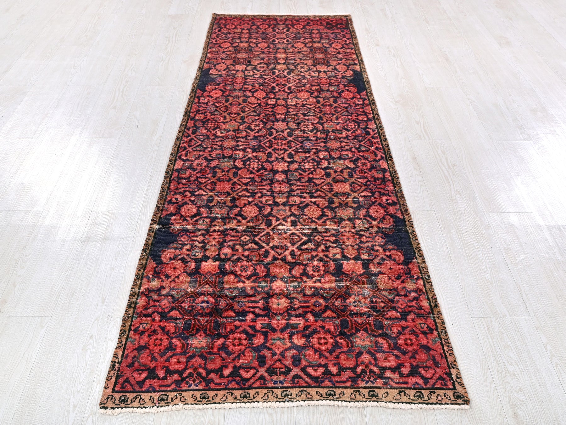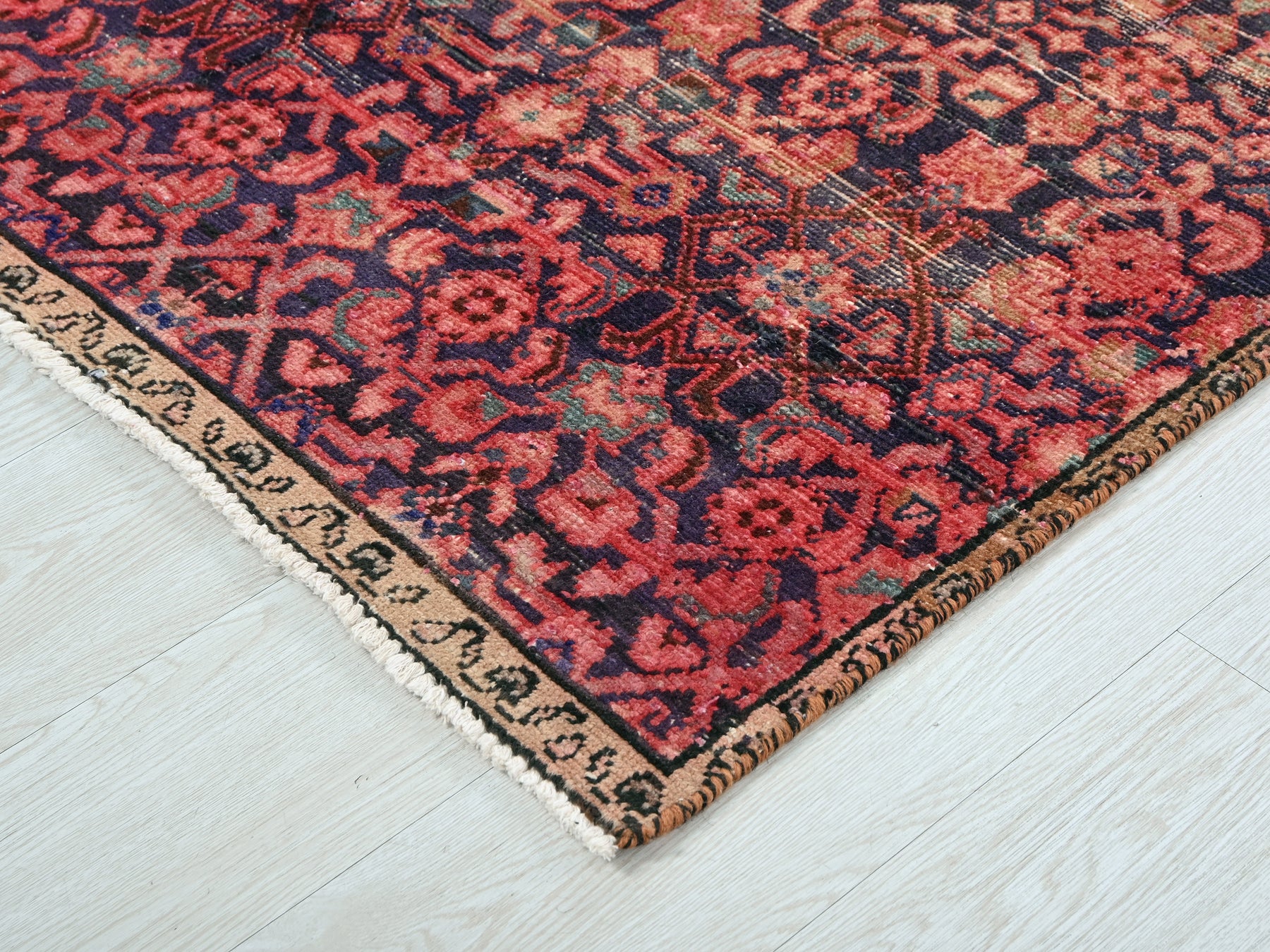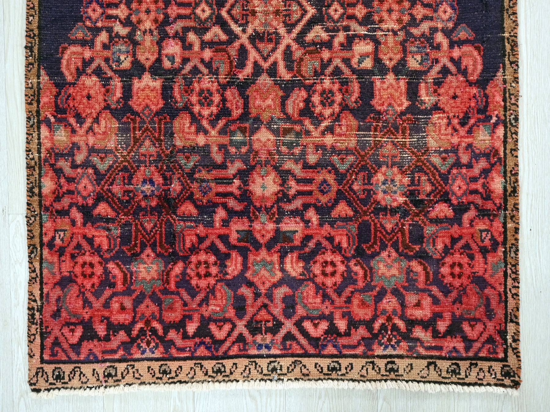 This is a hand-knotted, one-of-a-kind vintage rug. Due to the nature of this piece, there may be slight imperfections in its wear, shape, dimensions, and color. All of our rugs are professionally cleaned and repaired.