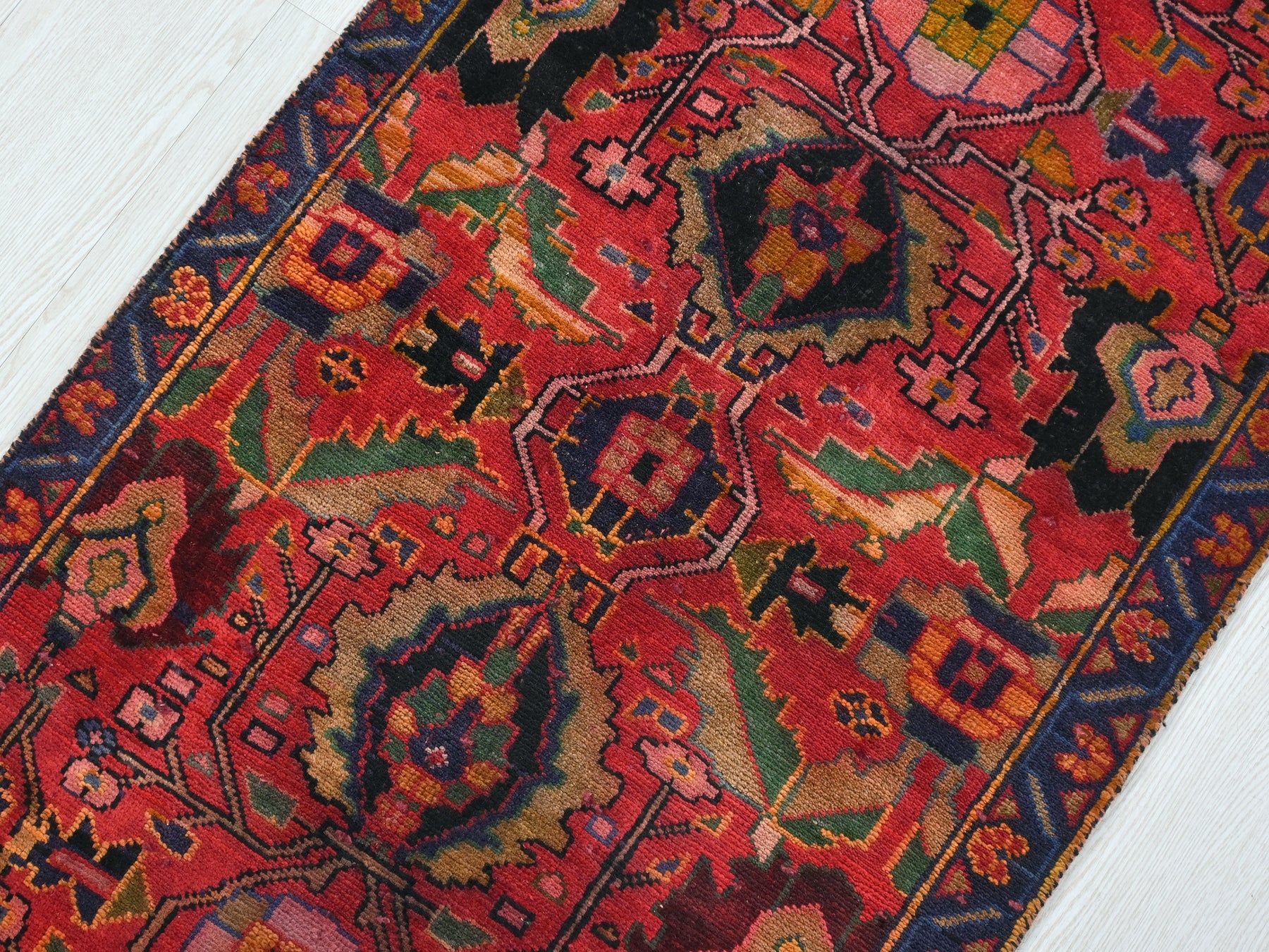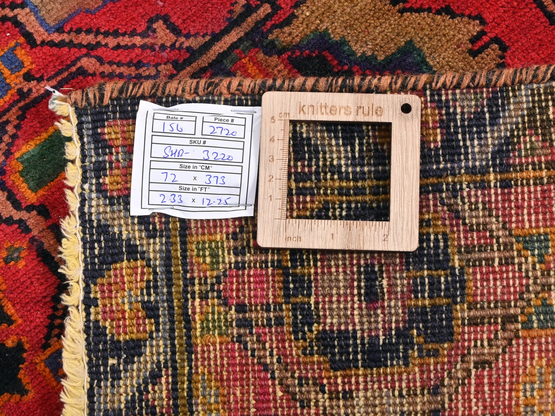 Dimensions: 2' 4" x 12' 3" Origin: Persian Material: Wool Style: Tribal Colors: crimson, brown, slate, black Recommended Room: Hallway, Kitchen