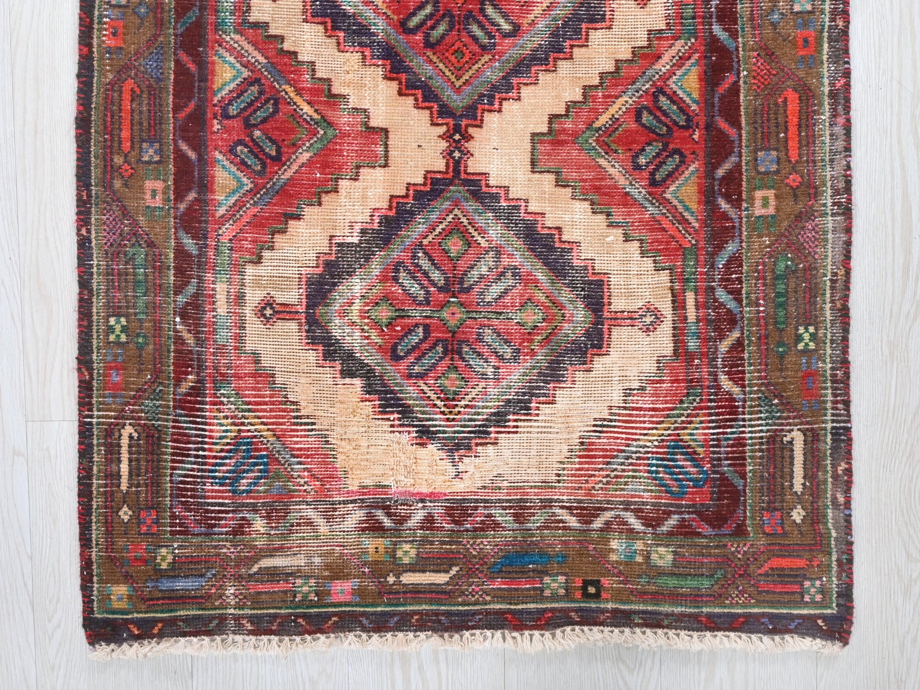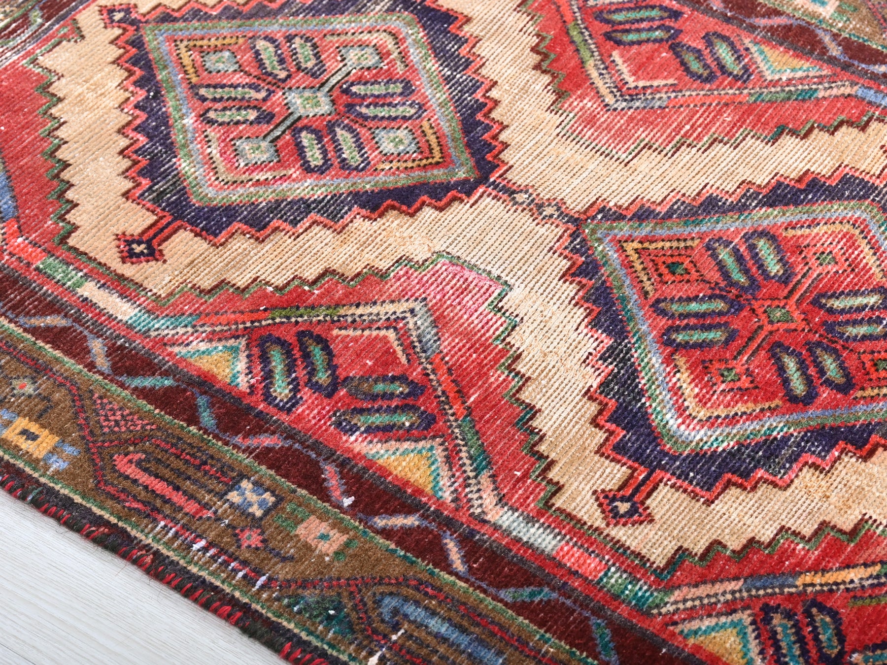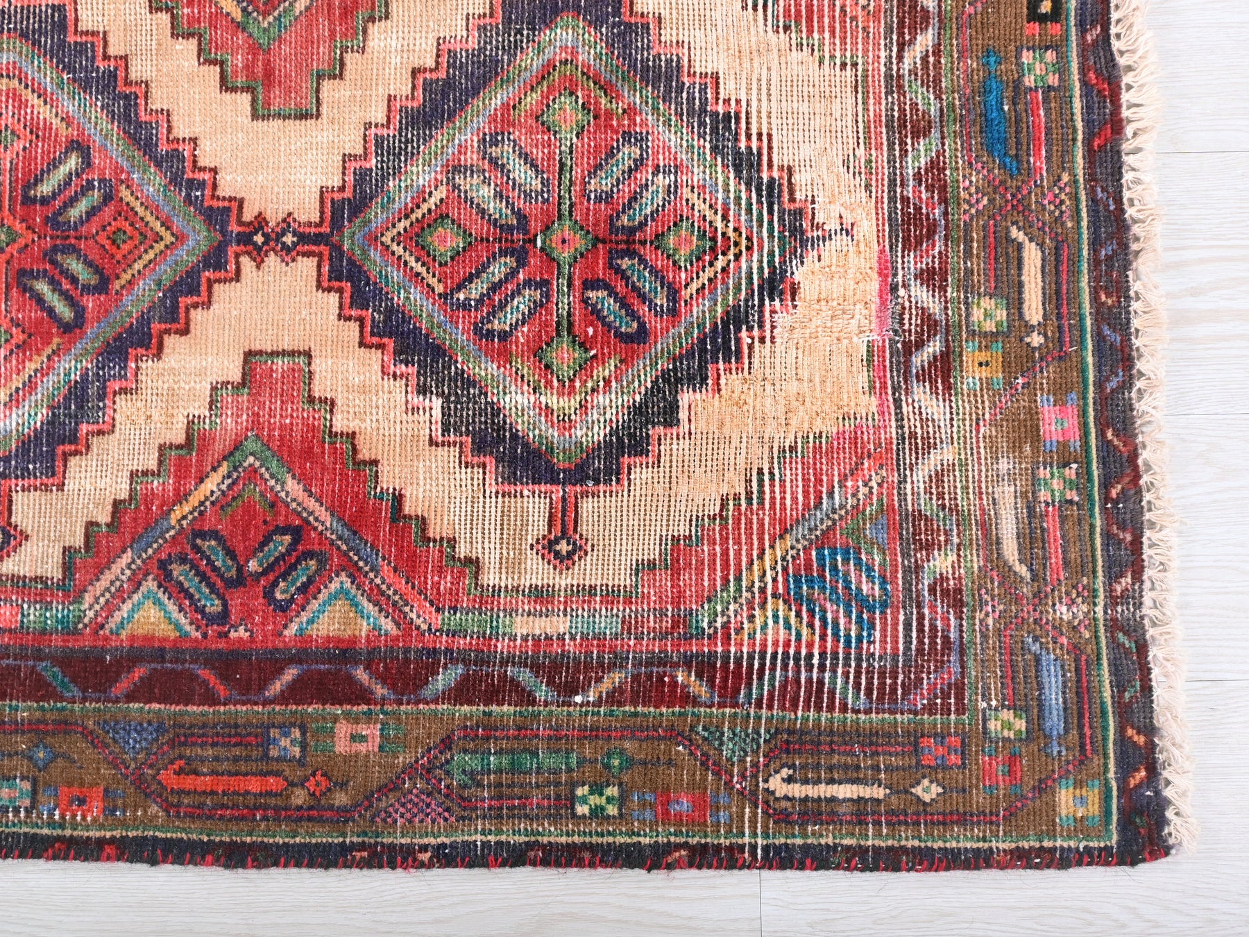 This is a hand-knotted, one-of-a-kind vintage rug. Due to the nature of this piece, there may be slight imperfections in its wear, shape, dimensions, and color. All of our rugs are professionally cleaned and repaired.