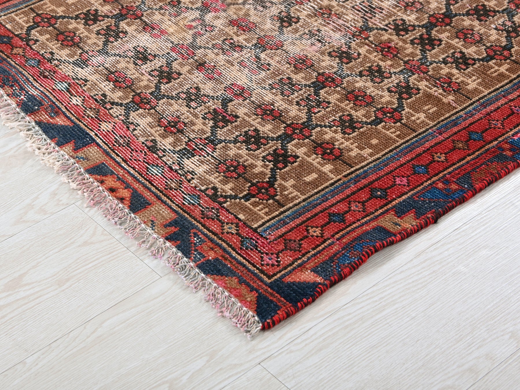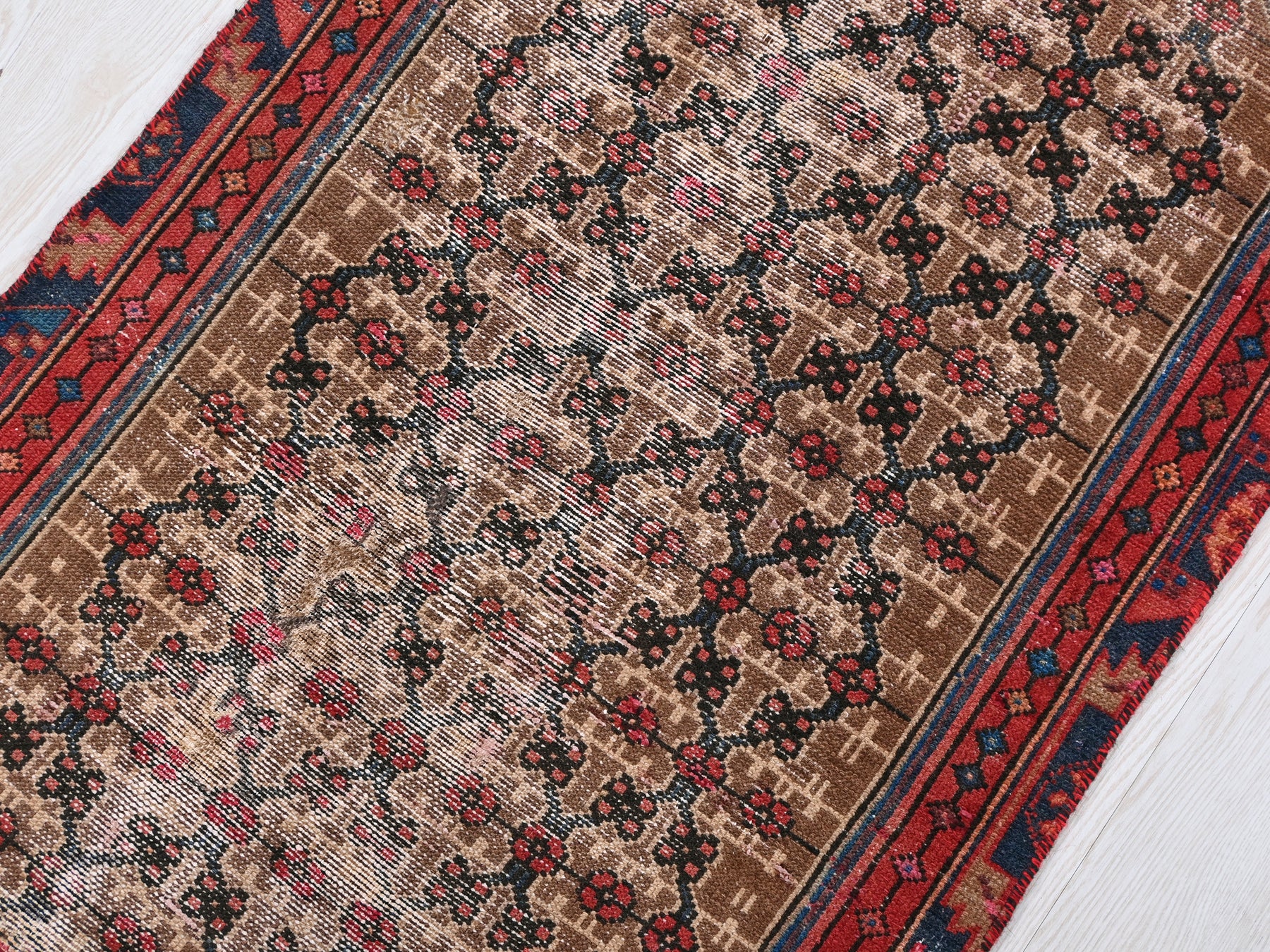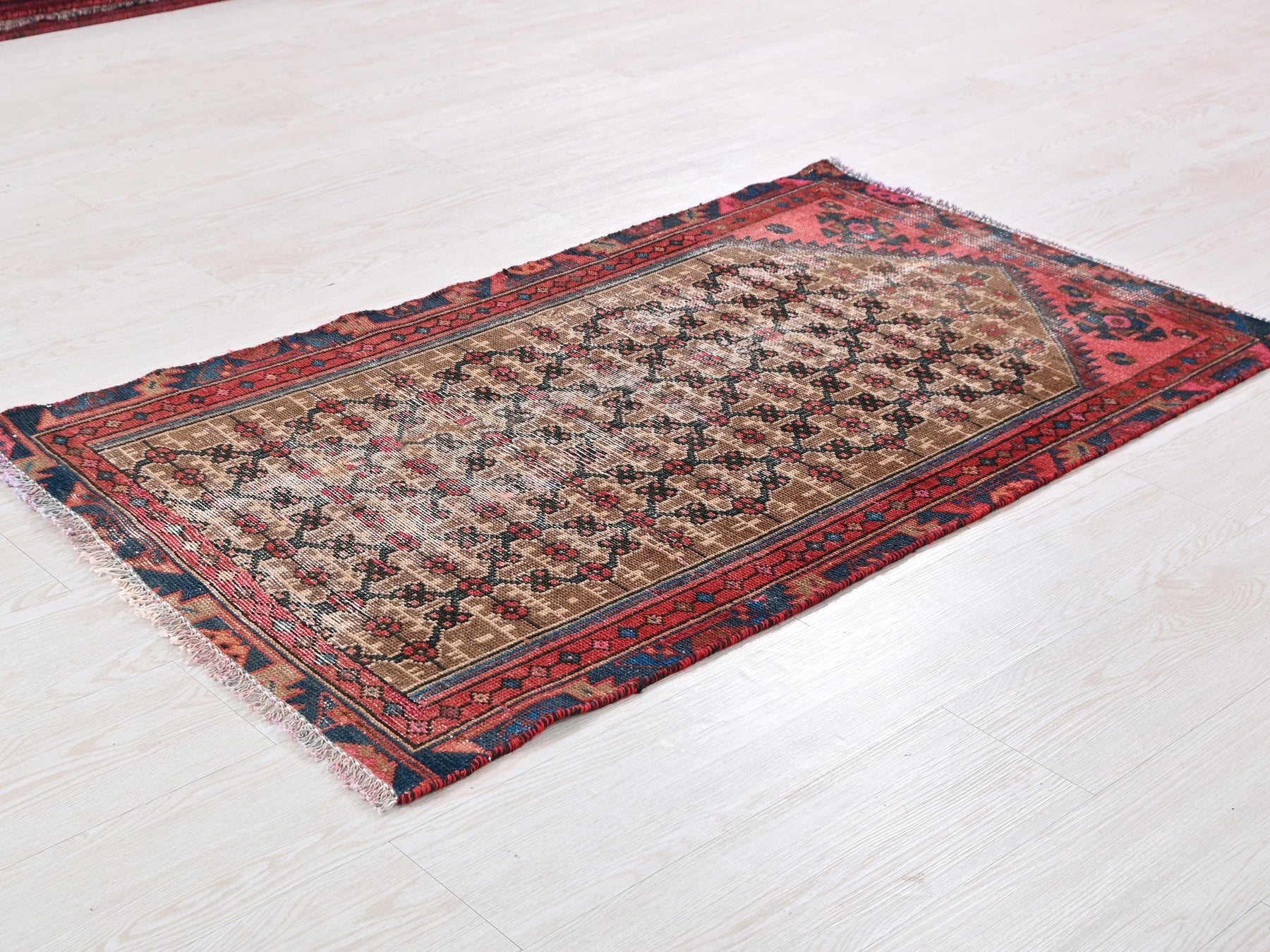 This is a hand-knotted, one-of-a-kind vintage rug. Due to the nature of this piece, there may be slight imperfections in its wear, shape, dimensions, and color. All of our rugs are professionally cleaned and repaired.