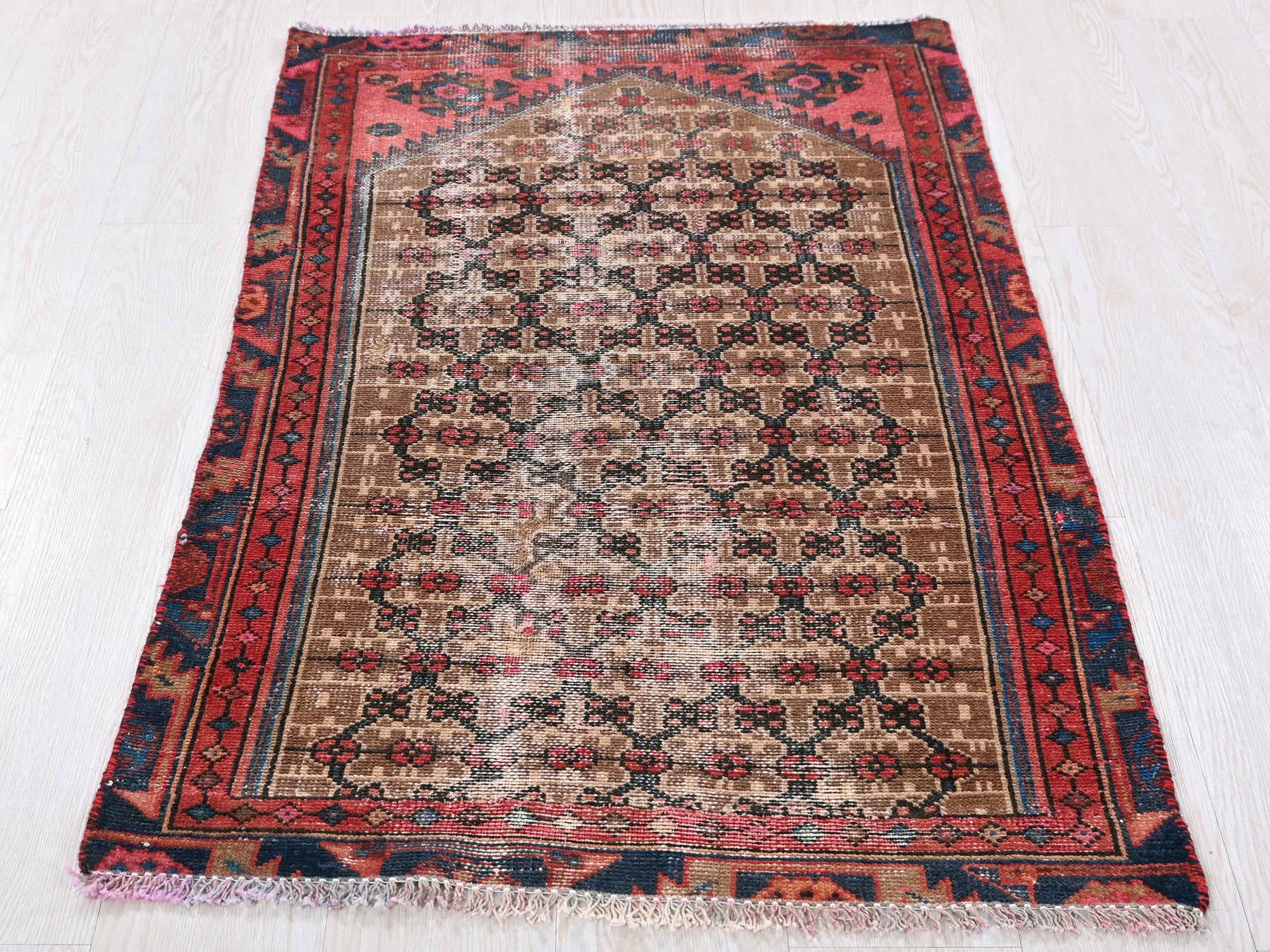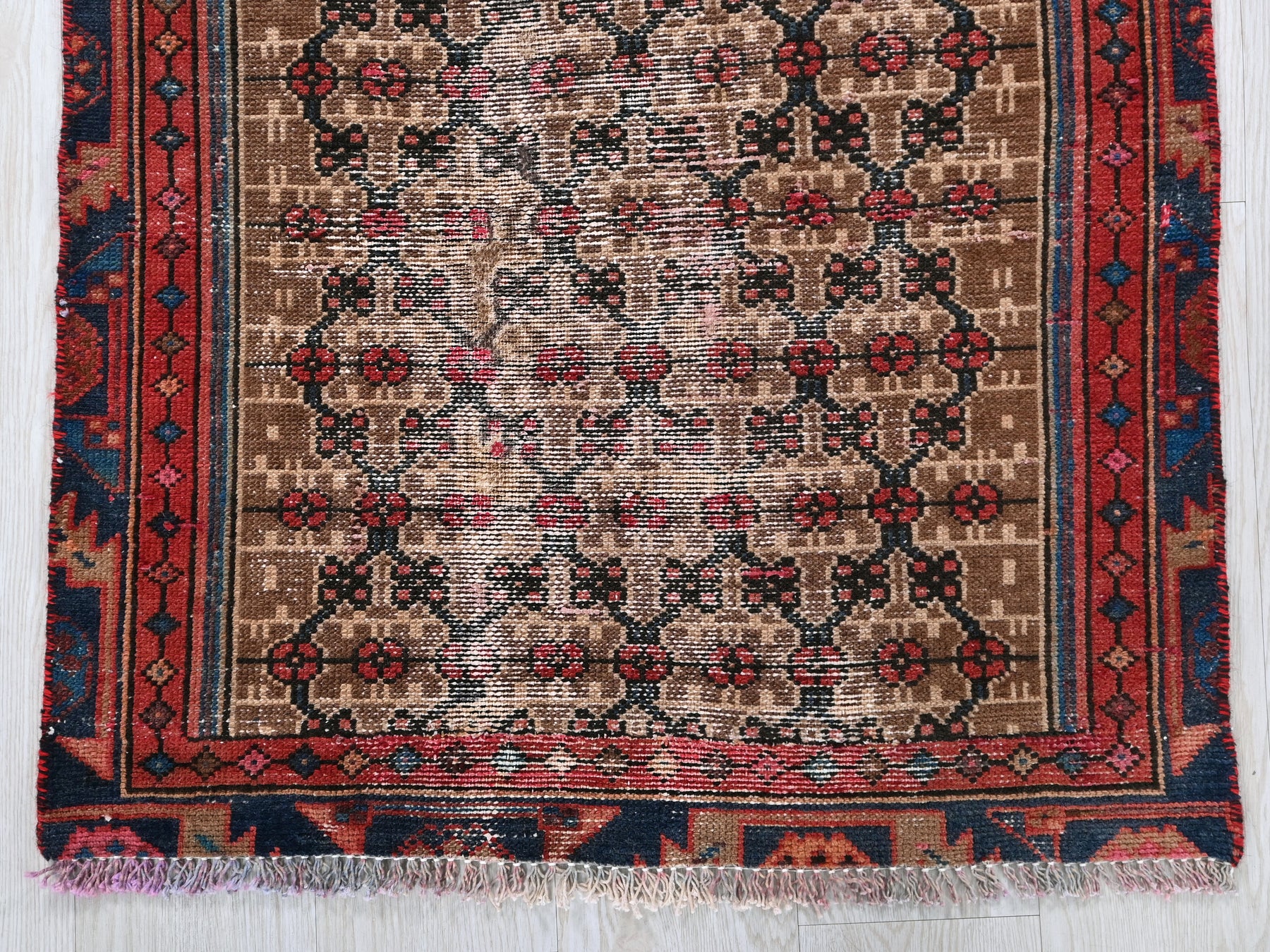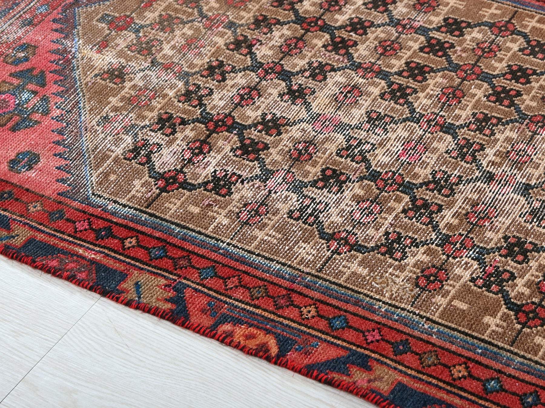 This is a hand-knotted, one-of-a-kind vintage rug. Due to the nature of this piece, there may be slight imperfections in its wear, shape, dimensions, and color. All of our rugs are professionally cleaned and repaired.