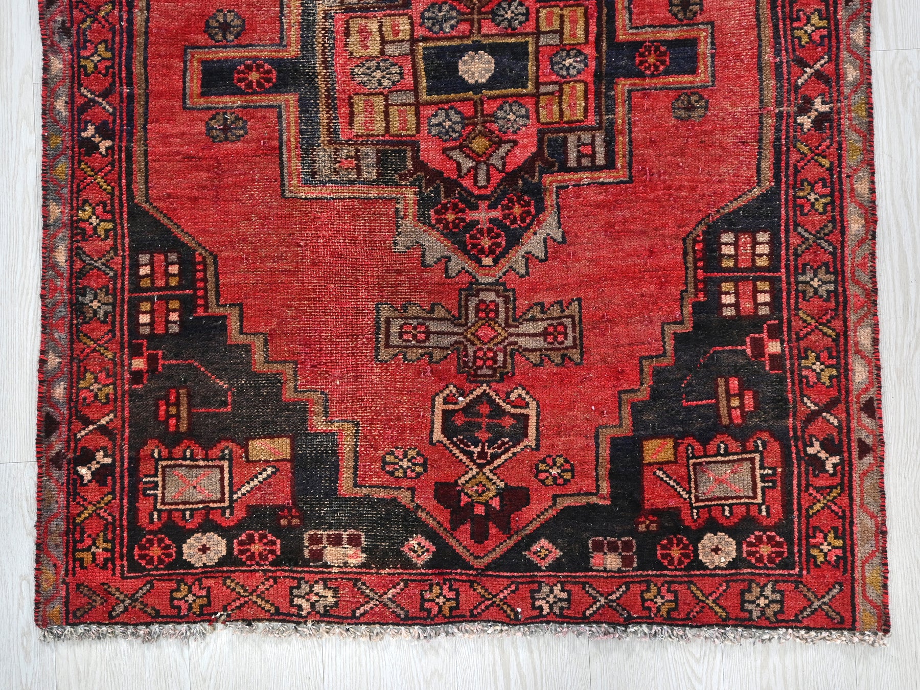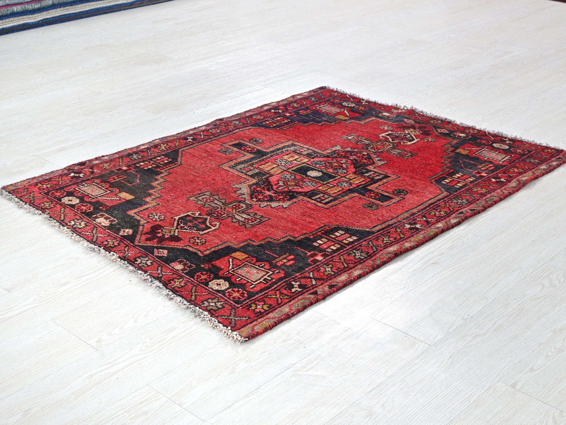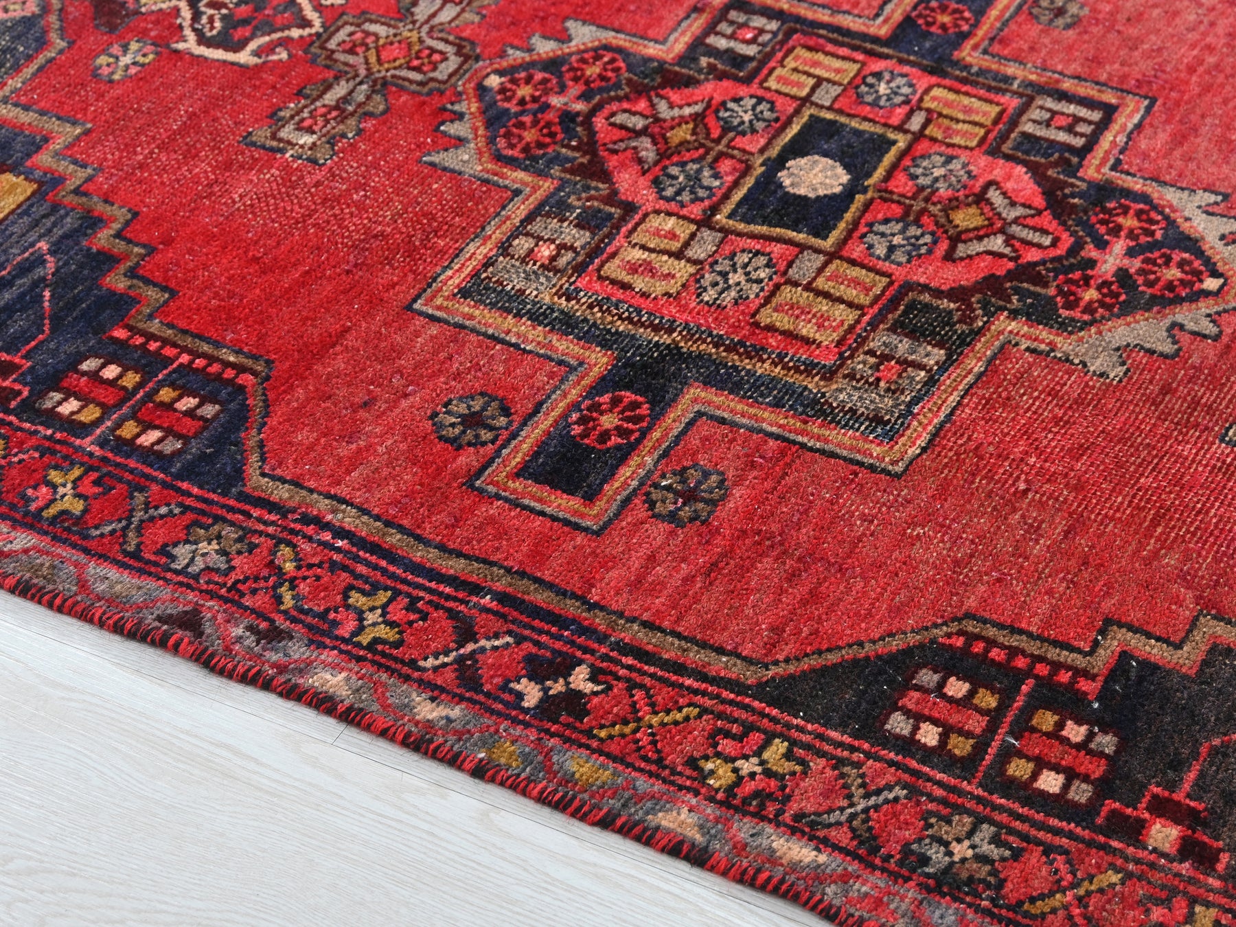 This is a hand-knotted, one-of-a-kind vintage rug. Due to the nature of this piece, there may be slight imperfections in its wear, shape, dimensions, and color. All of our rugs are professionally cleaned and repaired.