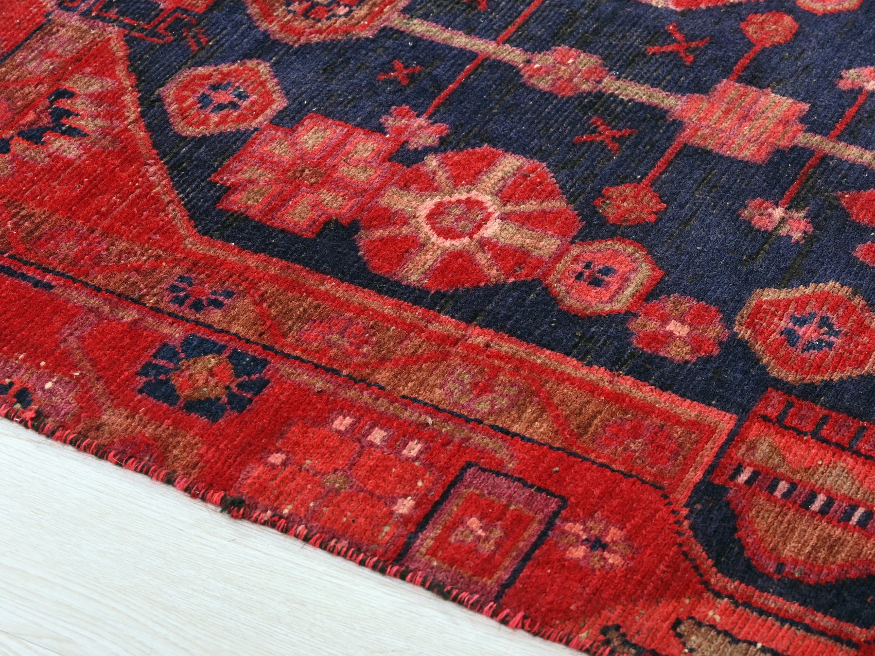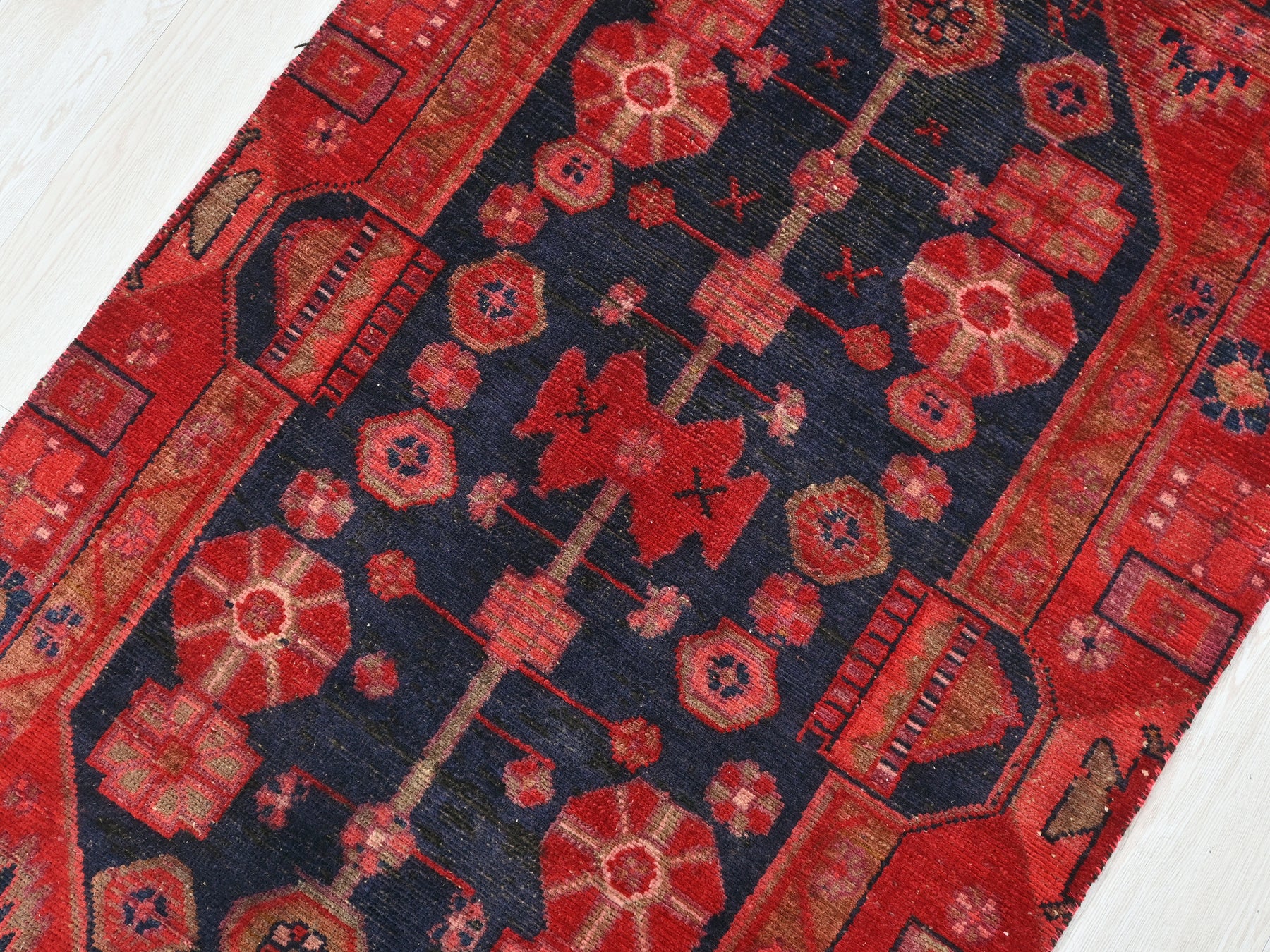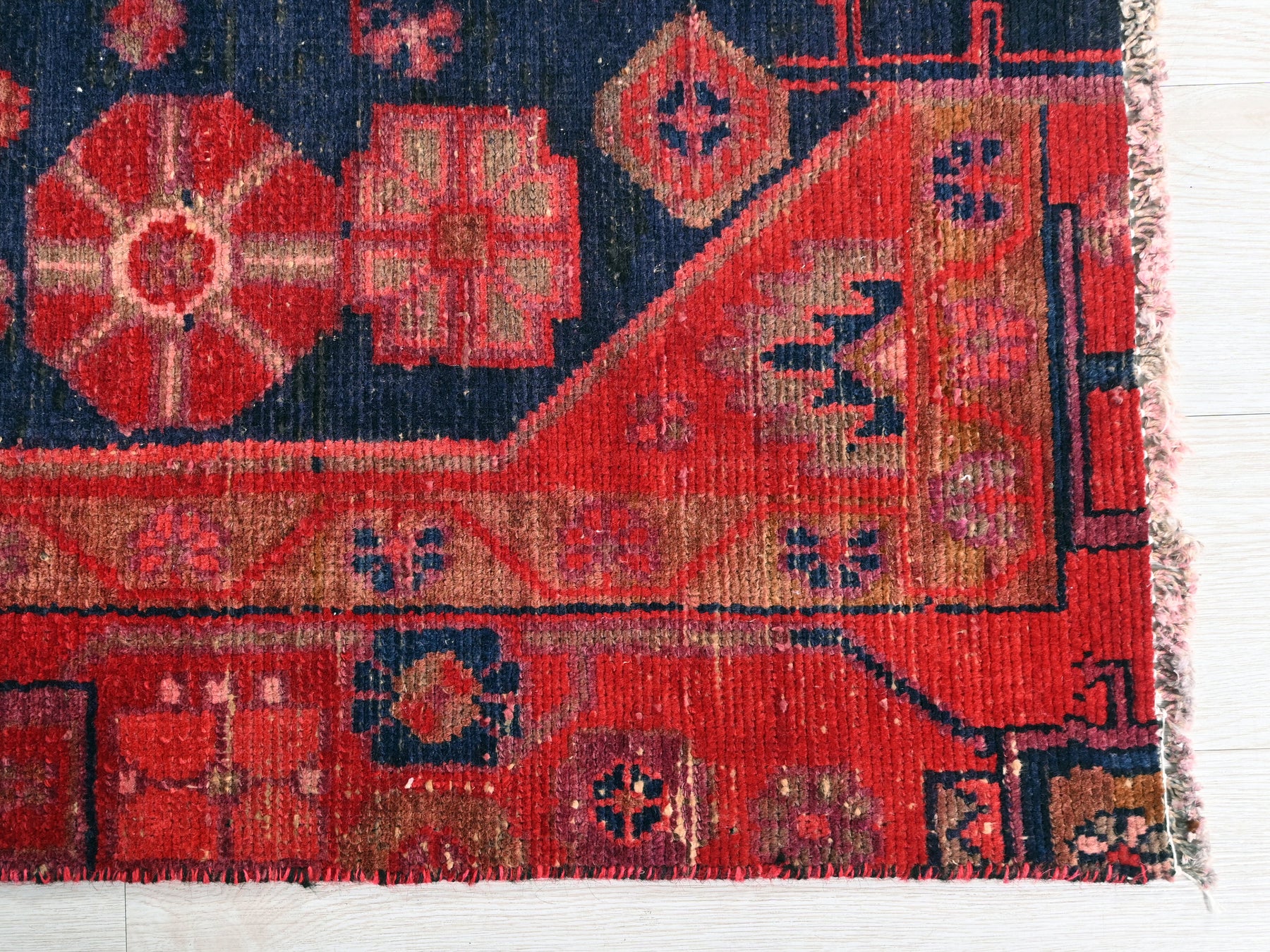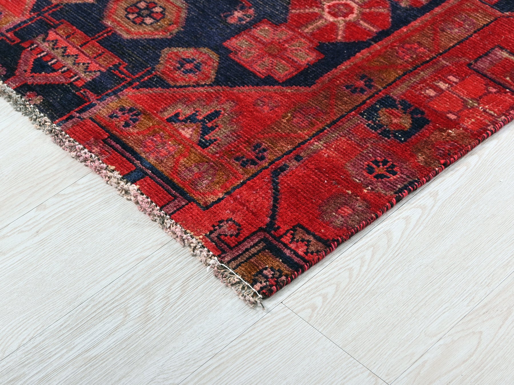 This is a hand-knotted, one-of-a-kind vintage rug. Due to the nature of this piece, there may be slight imperfections in its wear, shape, dimensions, and color. All of our rugs are professionally cleaned and repaired.