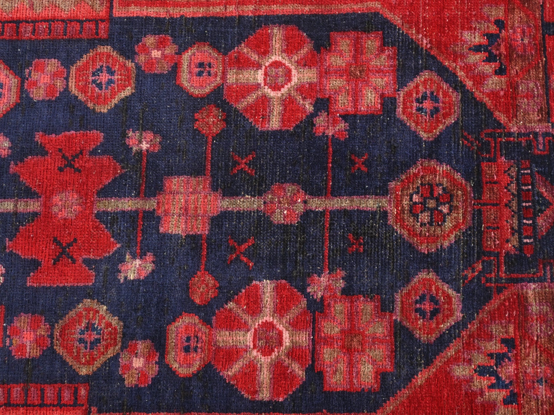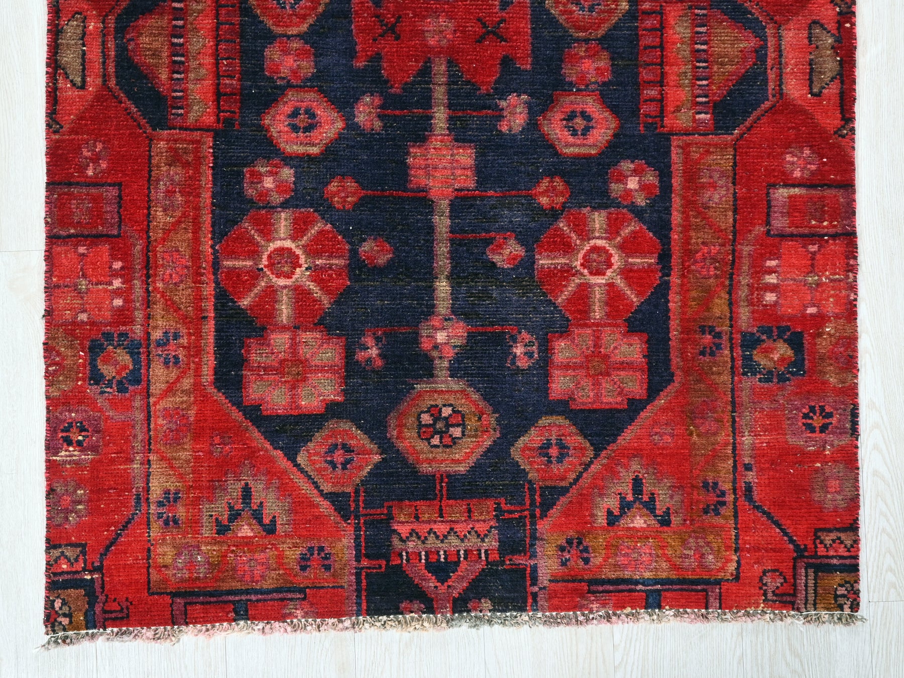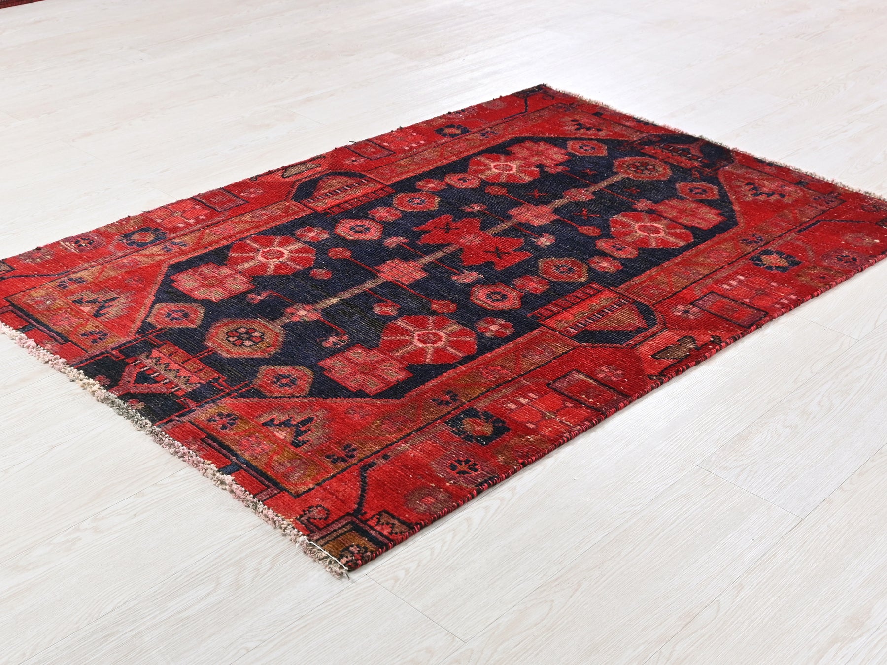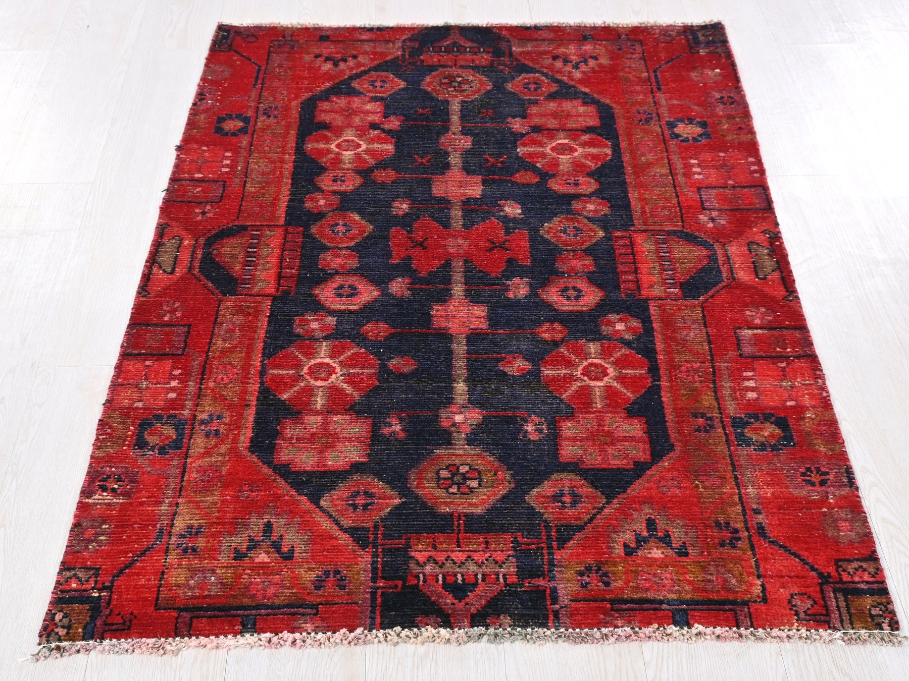 This is a hand-knotted, one-of-a-kind vintage rug. Due to the nature of this piece, there may be slight imperfections in its wear, shape, dimensions, and color. All of our rugs are professionally cleaned and repaired.