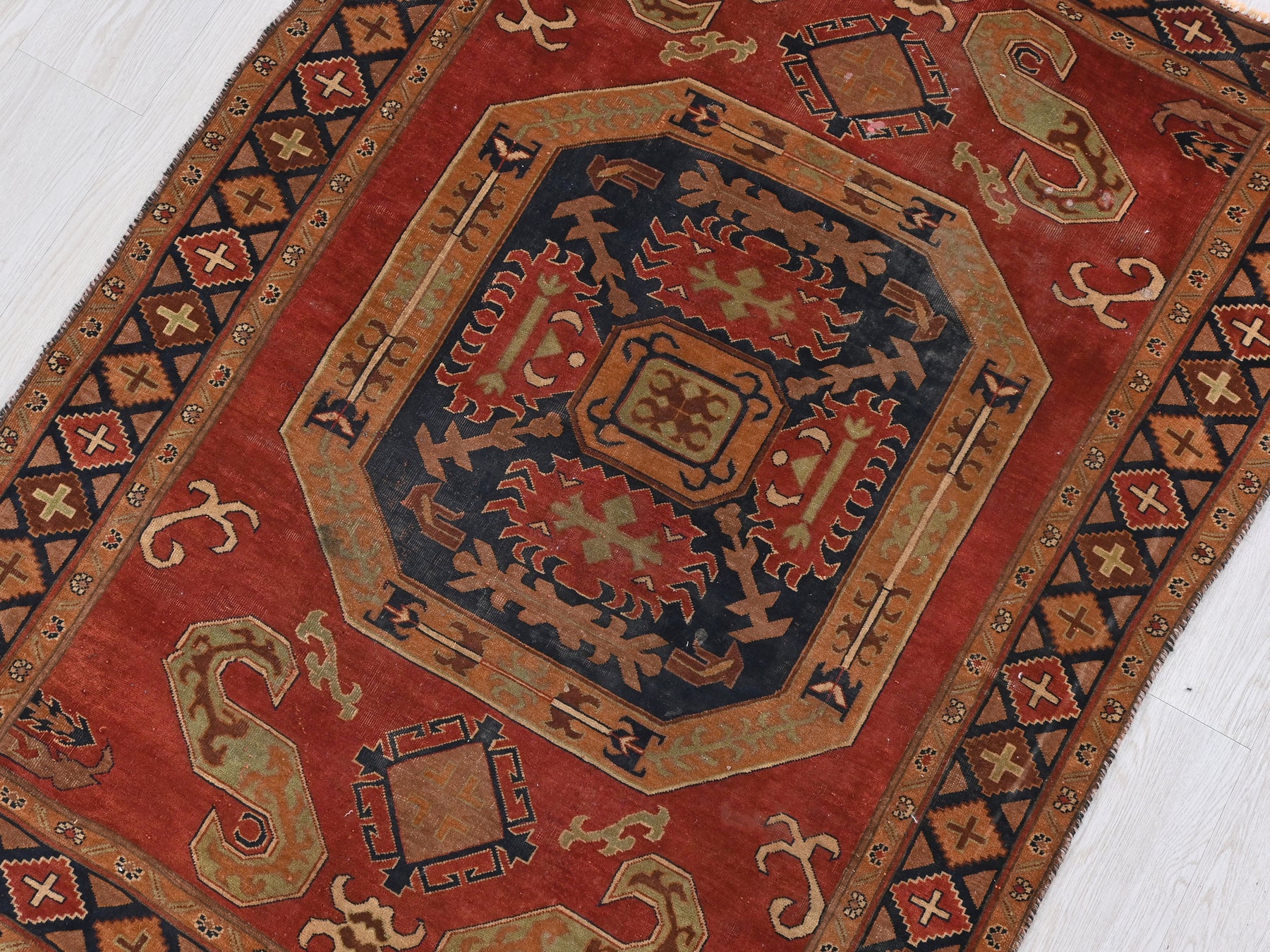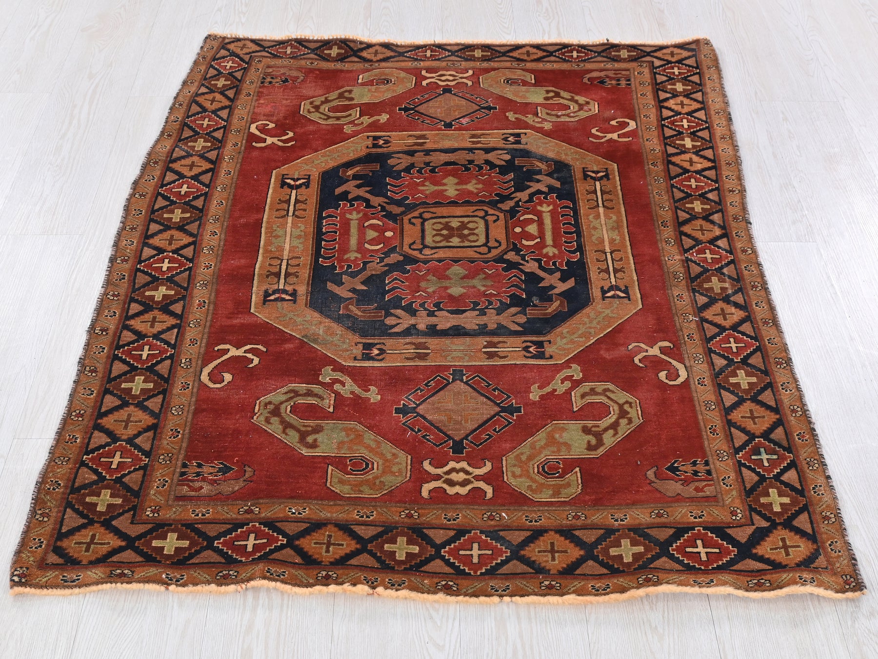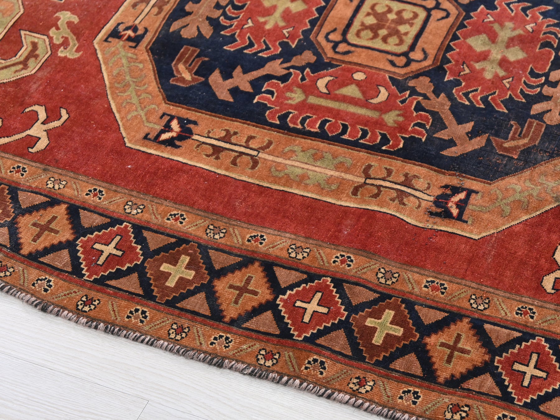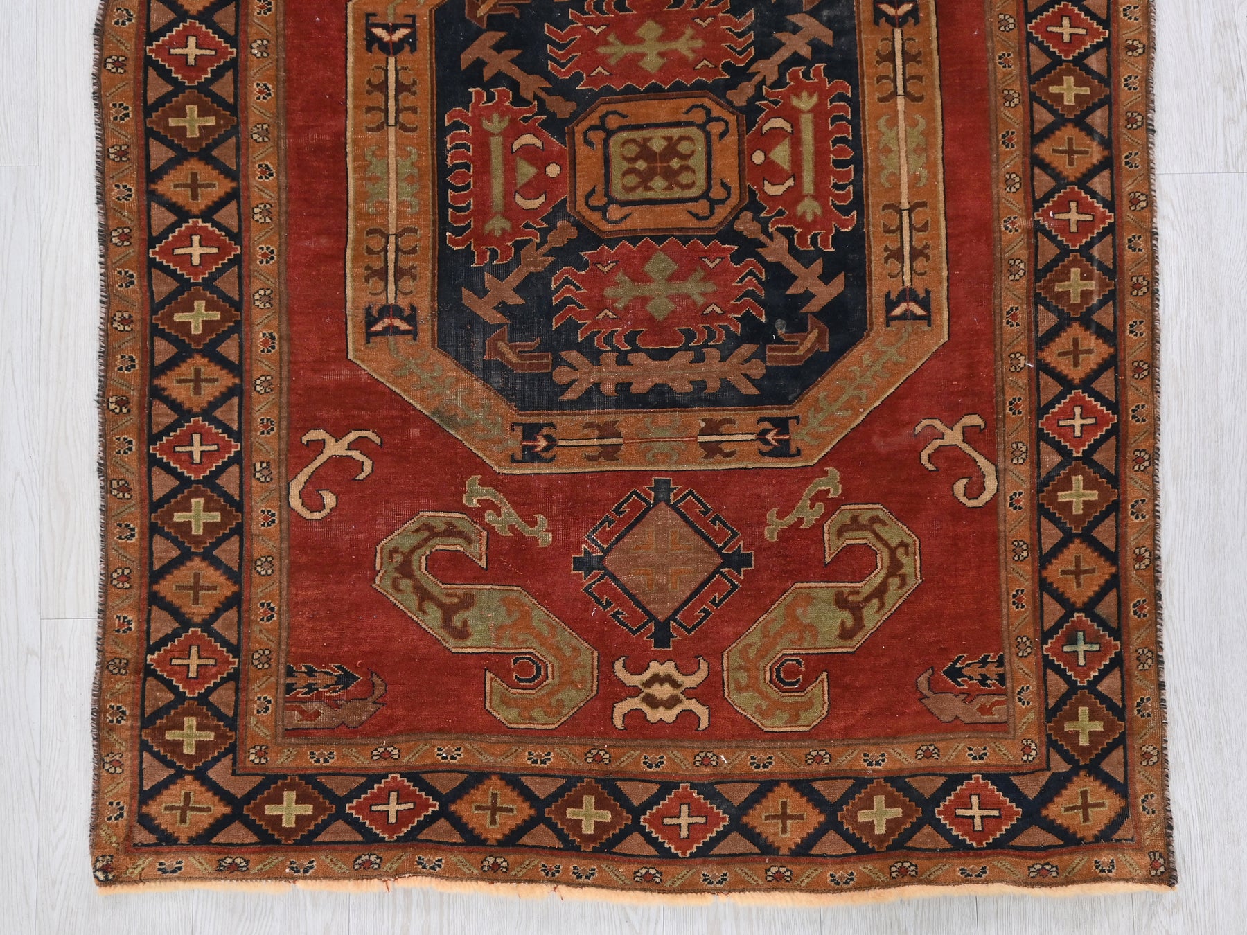 This is a hand-knotted, one-of-a-kind vintage rug. Due to the nature of this piece, there may be slight imperfections in its wear, shape, dimensions, and color. All of our rugs are professionally cleaned and repaired.